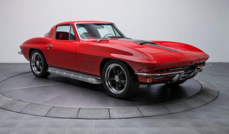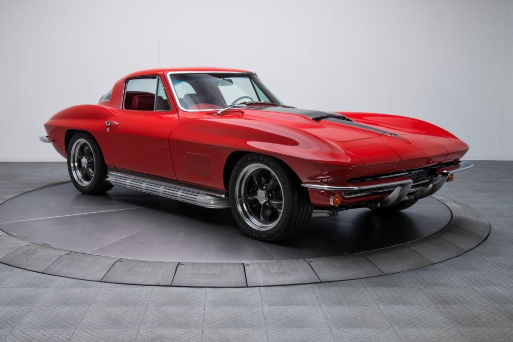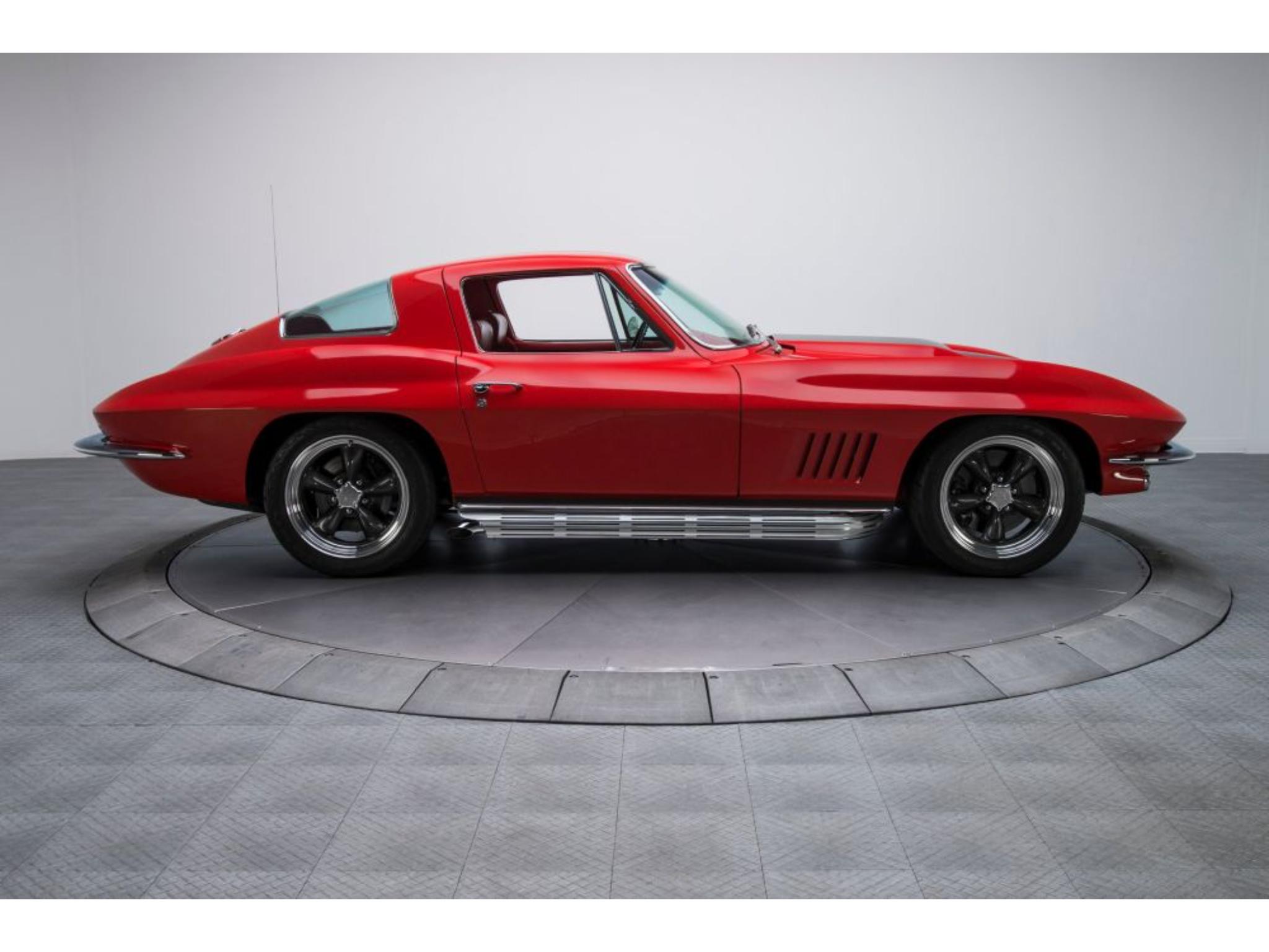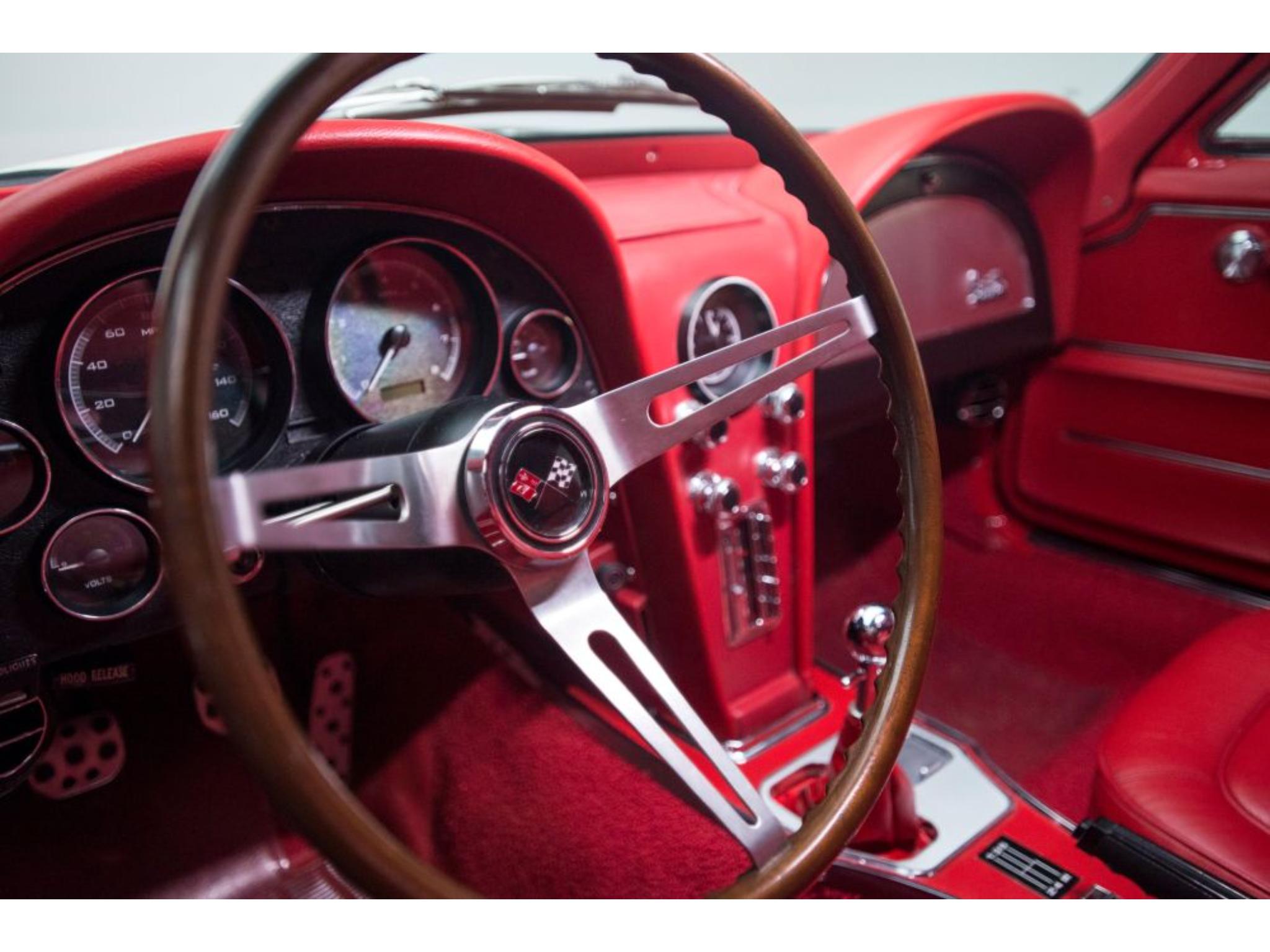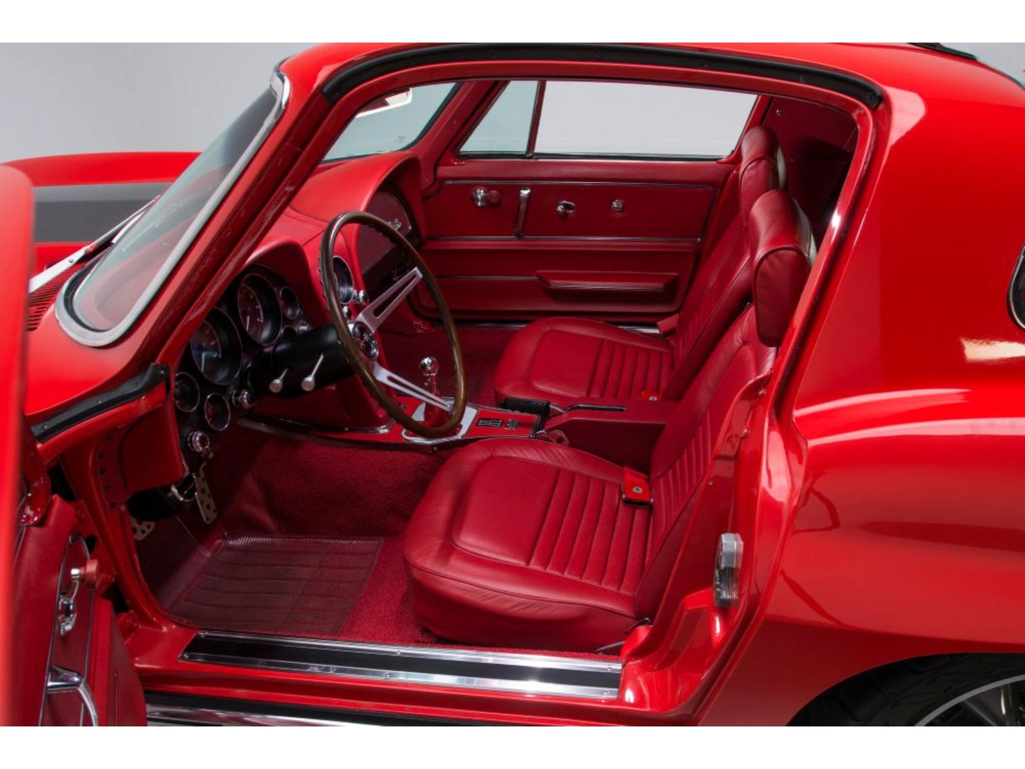 The body was refinished in red and mounted on a Street Shop chassis with C4 Corvette-style suspension components, rack-and-pinion steering, and hydroboost-assisted four-wheel disc brakes. A 6.0-liter LS2 V8 is installed along with a Tremec five-speed manual transmission and a limited-slip differential assembly. Additional build details include a stinger-style hood, side exhaust pipes, 17″ American Racing wheels, Dakota Digital gauges, and a Vintage Air climate control system.
