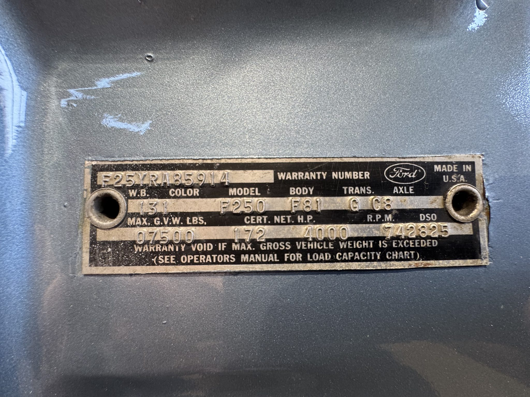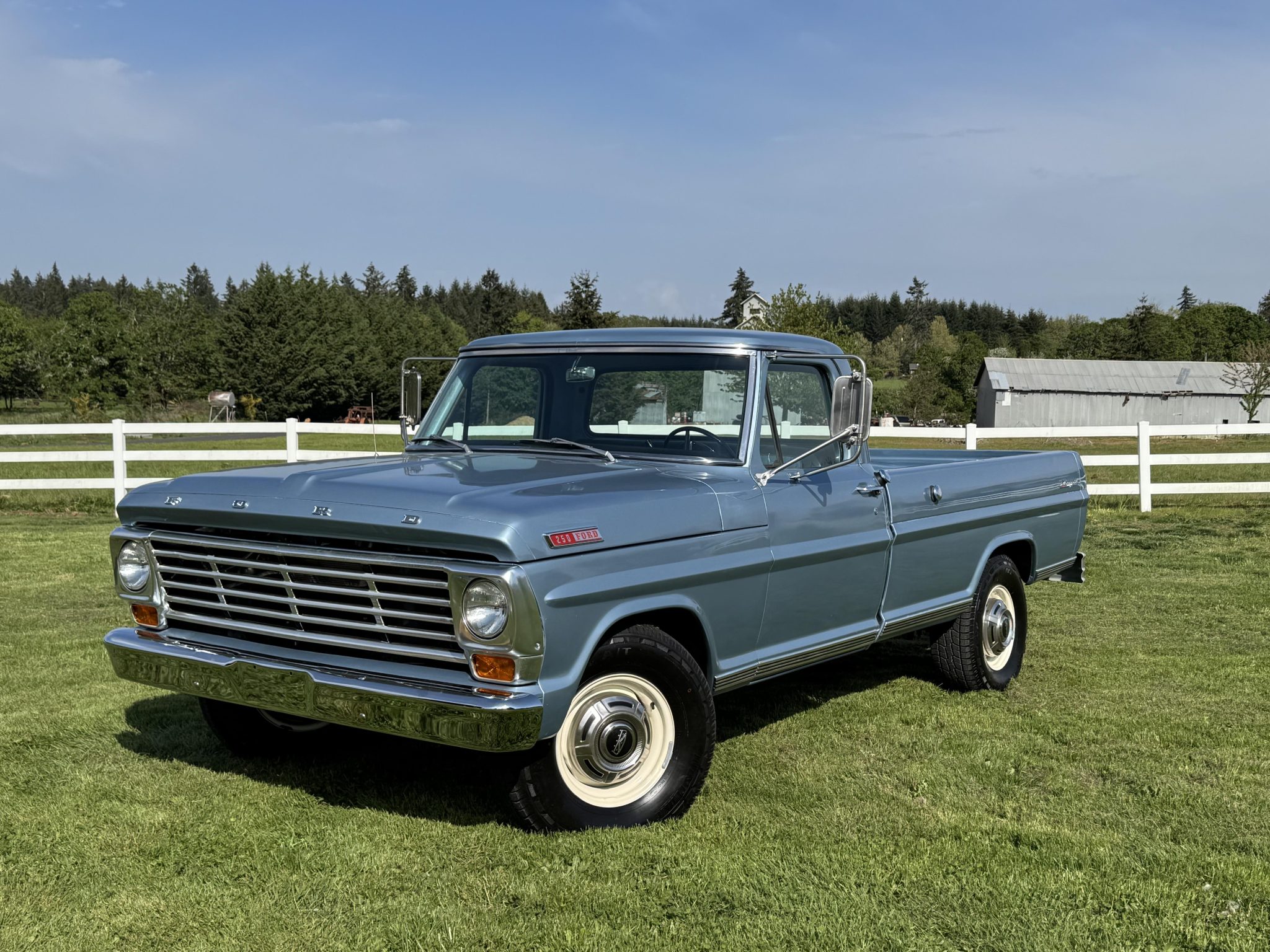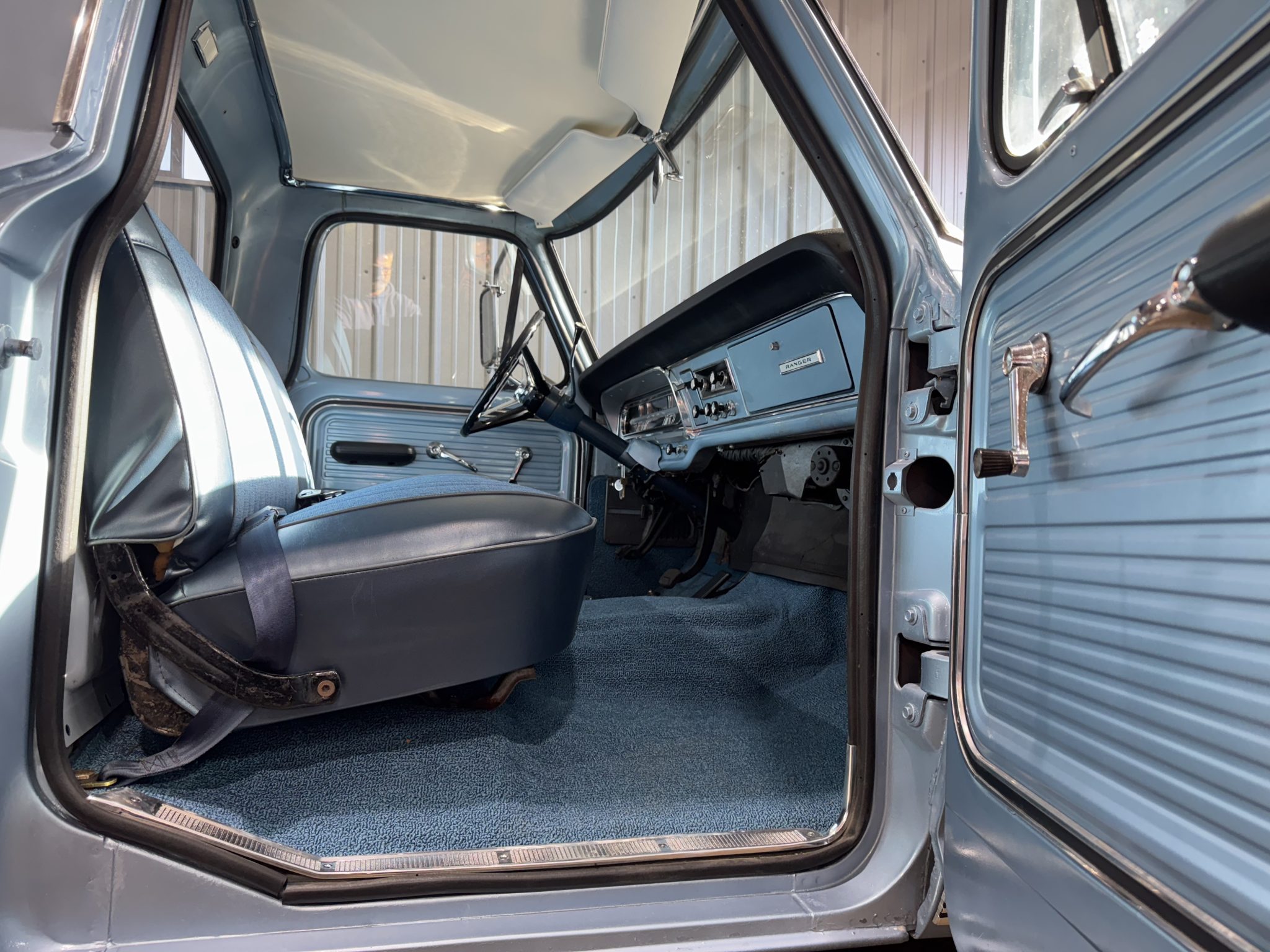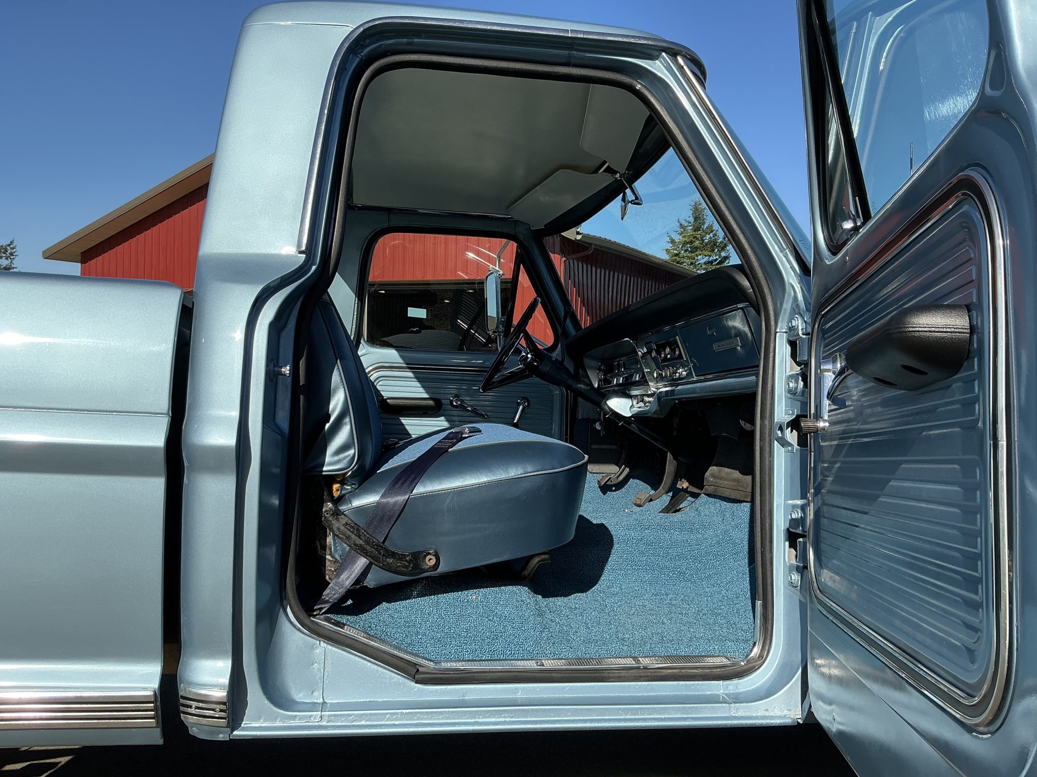This 1967 Ford F-250 Ranger pickup was fitted with a replacement 390ci V8 subsequent work is said to have involved repainting the body in Brittany Blue, rebuilding the Edelbrock carburetor, overhauling the suspension and brake systems, and replacing the windshield, carpets, dash pad, tires, in-cab fuel tank, battery cables, valve cover gaskets, drive belts, and ignition components. Shifting is through a three-speed Cruise-O-Matic automatic transmission linked to a limited-slip differential, and the truck is further equipped with 16″ steel wheels, power steering, power-assisted brakes, blue upholstery, a heater, and an AM radio.