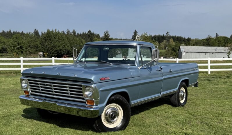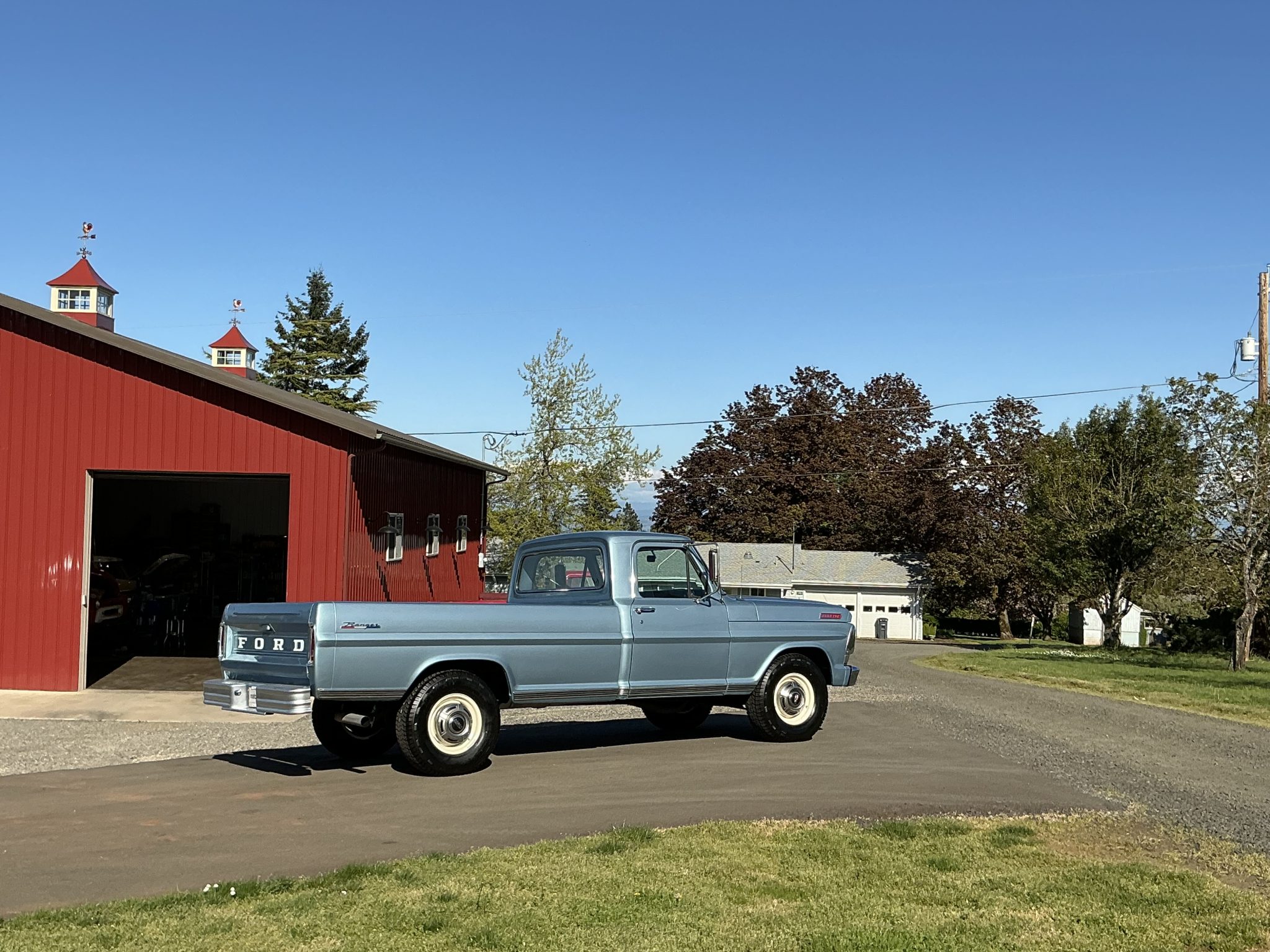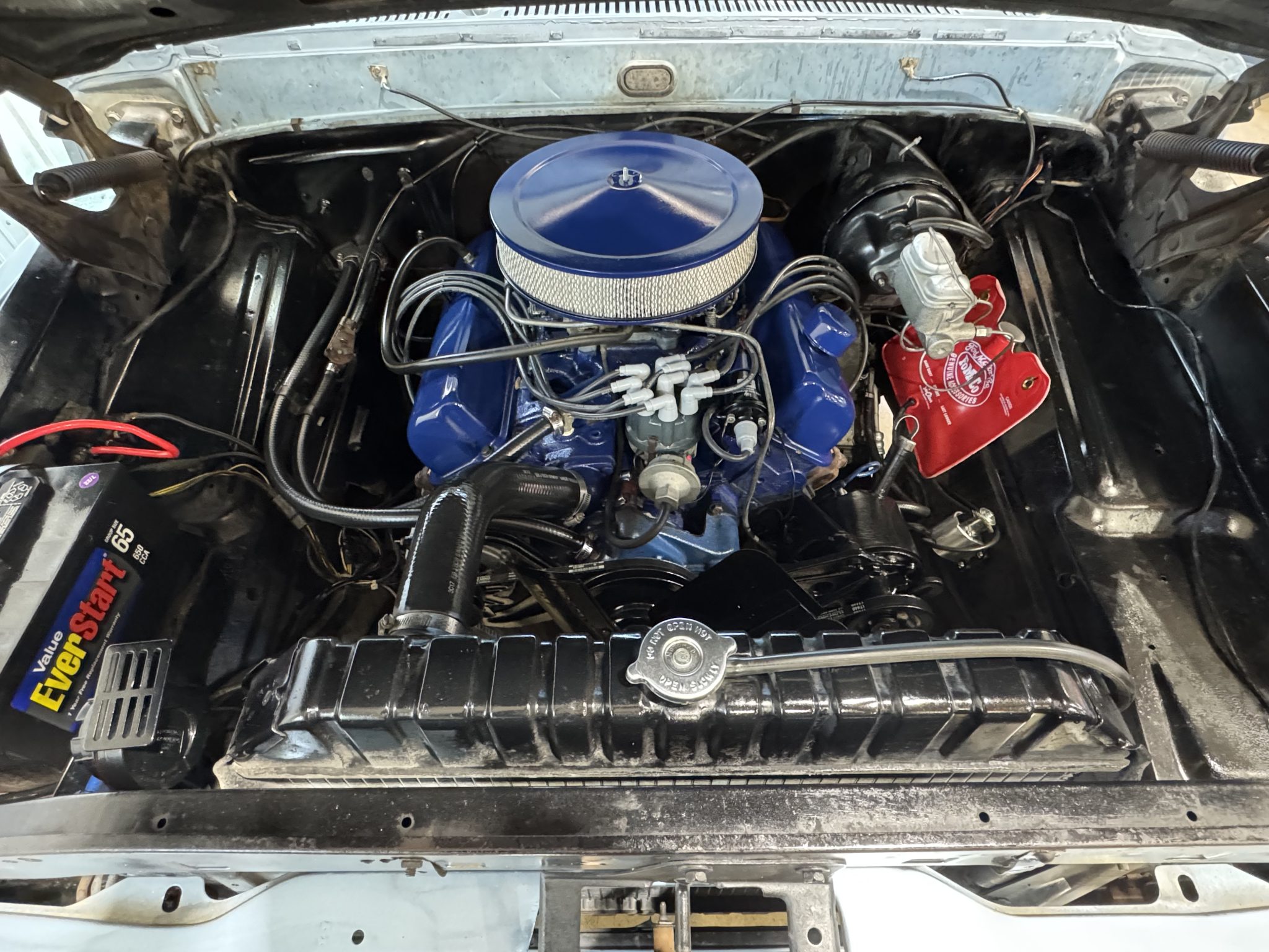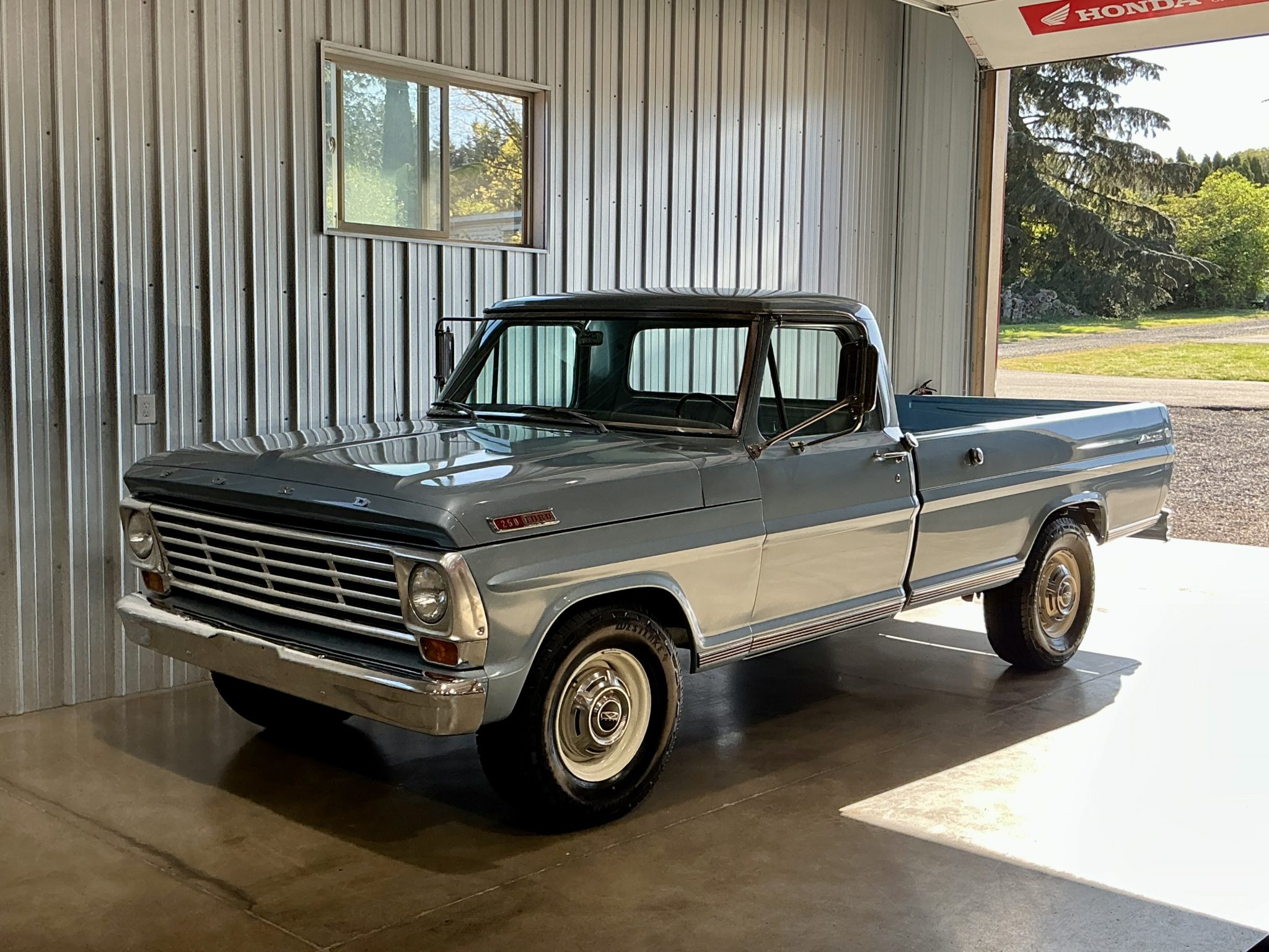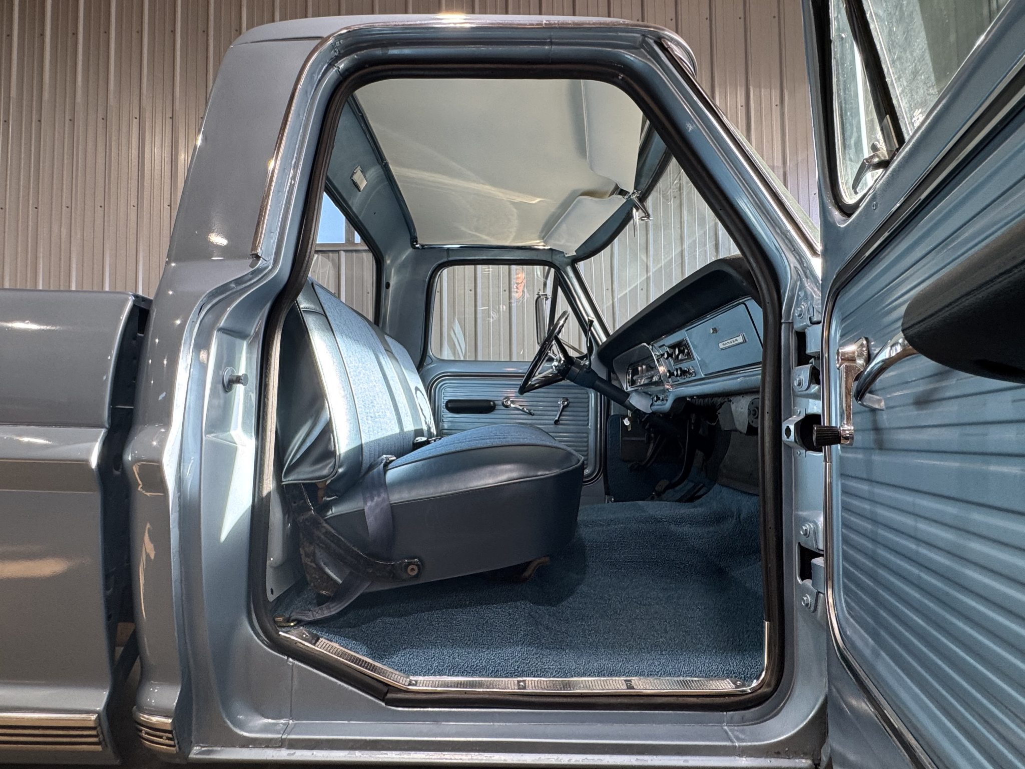 This 1967 Ford F-250 Ranger pickup was fitted with a replacement 390ci V8 subsequent work is said to have involved repainting the body in Brittany Blue, rebuilding the Edelbrock carburetor, overhauling the suspension and brake systems, and replacing the windshield, carpets, dash pad, tires, in-cab fuel tank, battery cables, valve cover gaskets, drive belts, and ignition components. Shifting is through a three-speed Cruise-O-Matic automatic transmission linked to a limited-slip differential, and the truck is further equipped with 16″ steel wheels, power steering, power-assisted brakes, blue upholstery, a heater, and an AM radio.