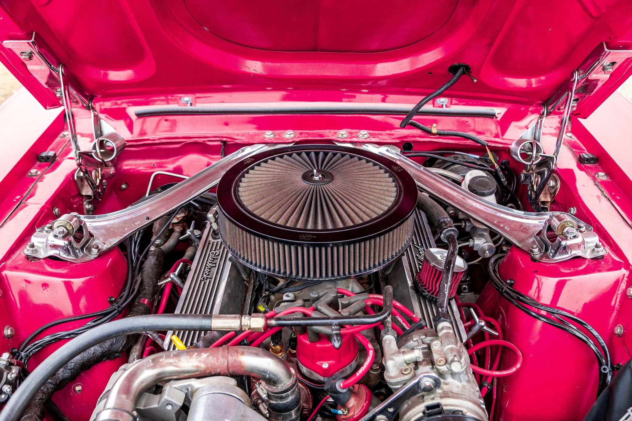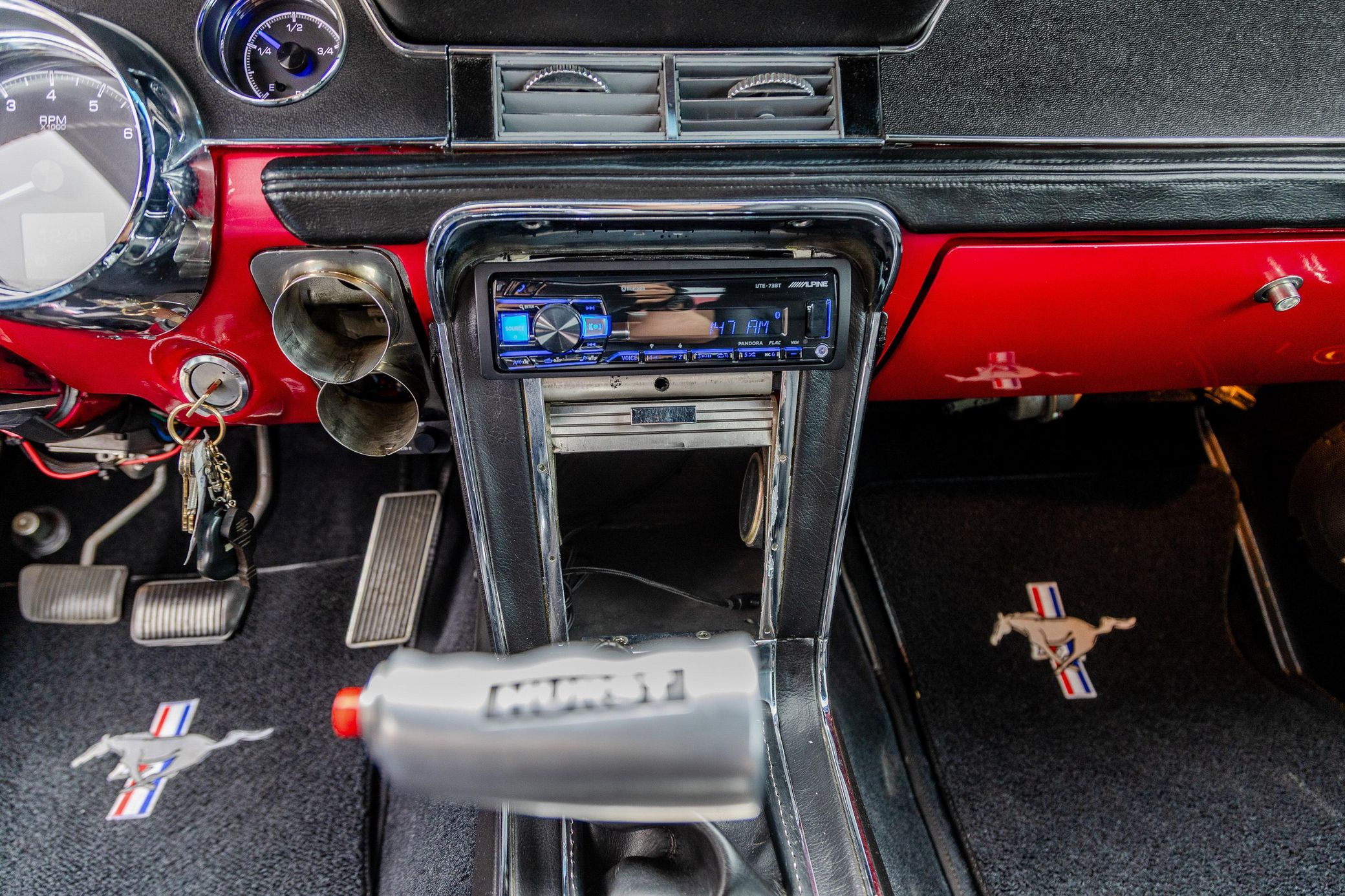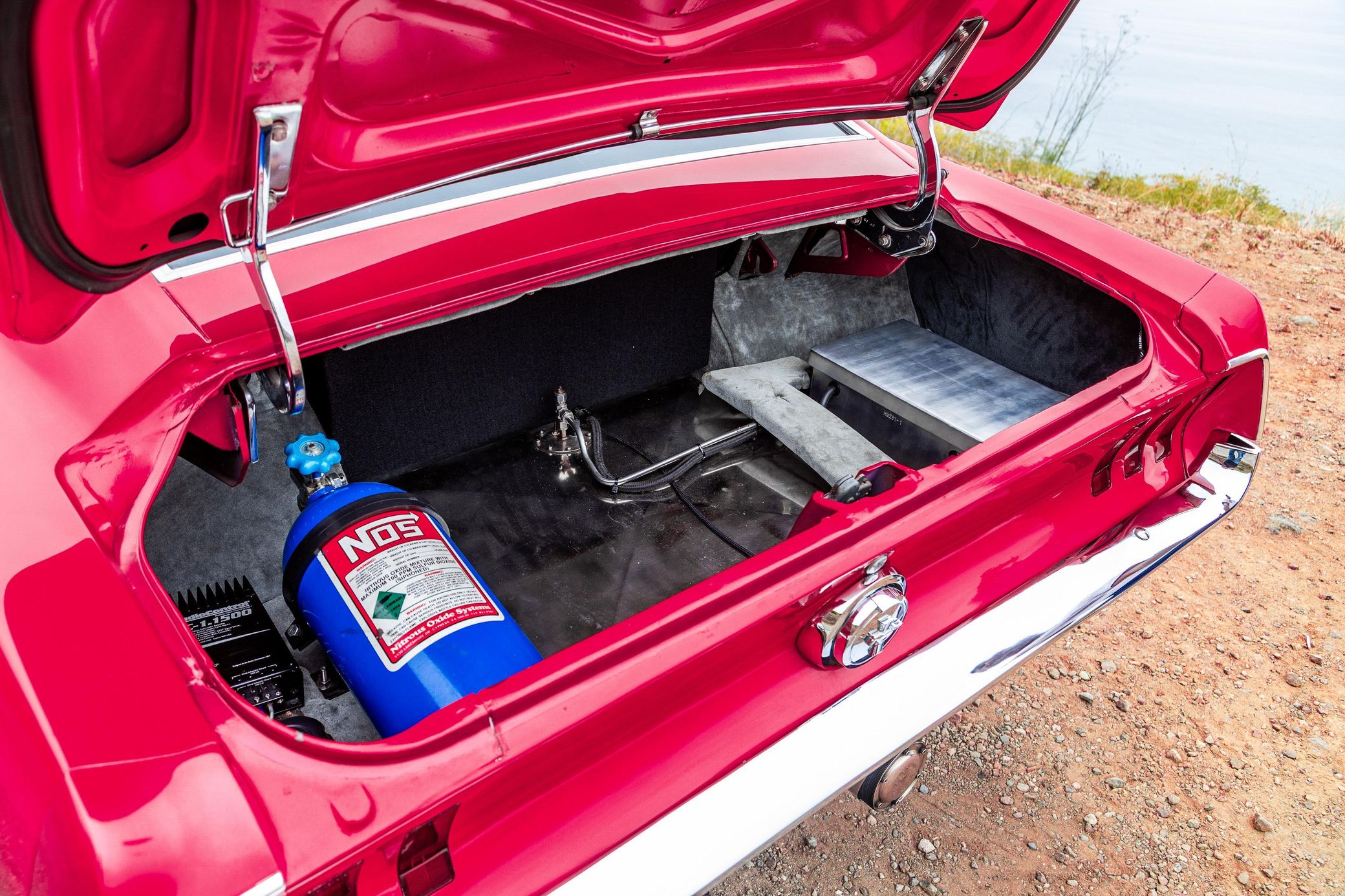 This particular Mustang has been restored with several modern upgrades that take its performance to the next level, including a FiTech fuel injection system, a NOS injection system, full-length exhaust headers, a narrowed 9-inch rear end, and Wilwood disc brakes. It's also equipped with a Tremec 5-speed manual transmission for maximum fun behind the wheel – and it's finished in an eye-catching shade of Magenta Pearl, which looks great with the chrome exterior trim and 17-inch wheels.