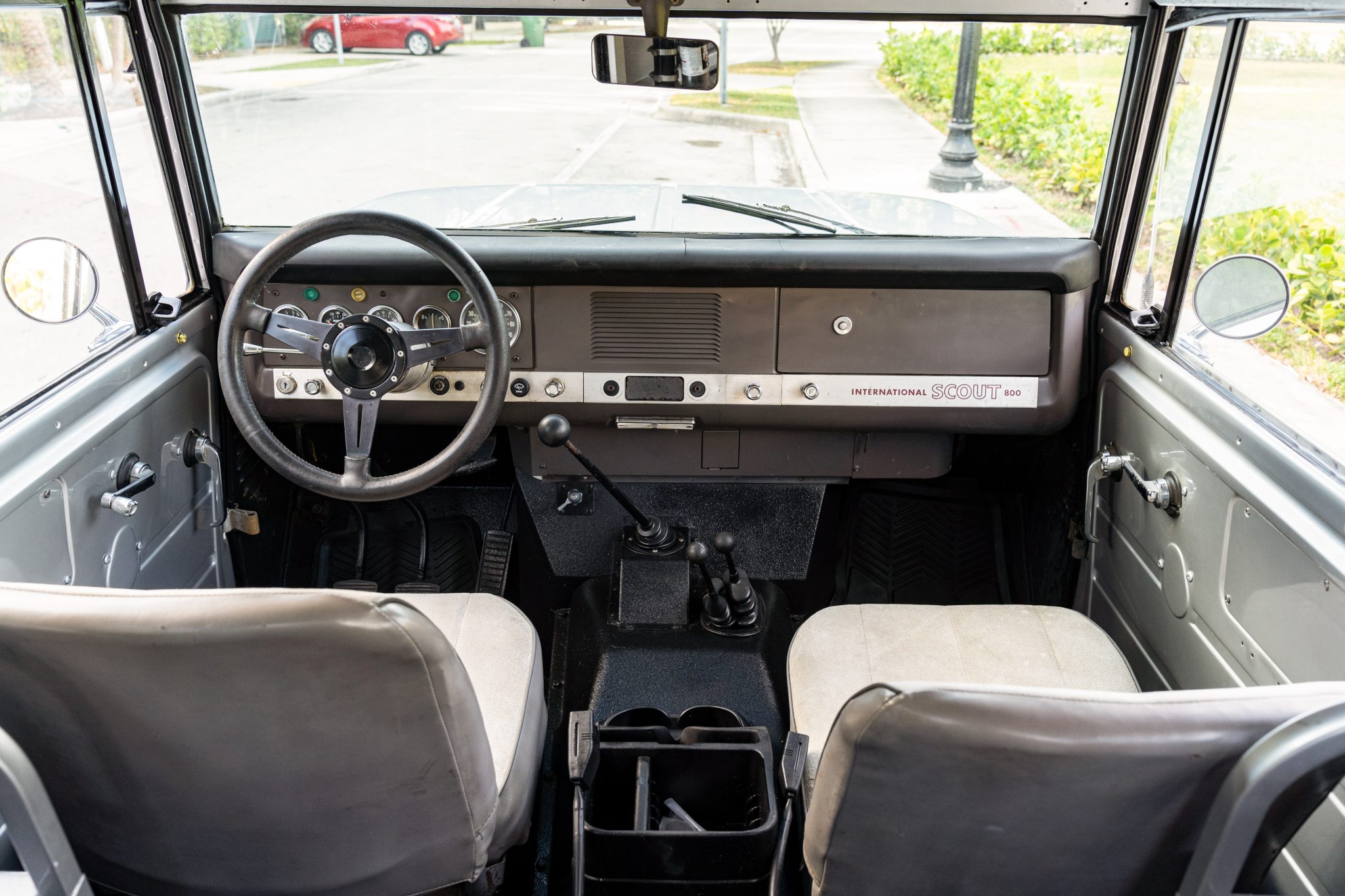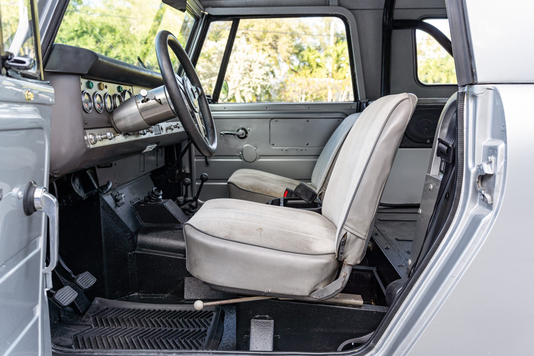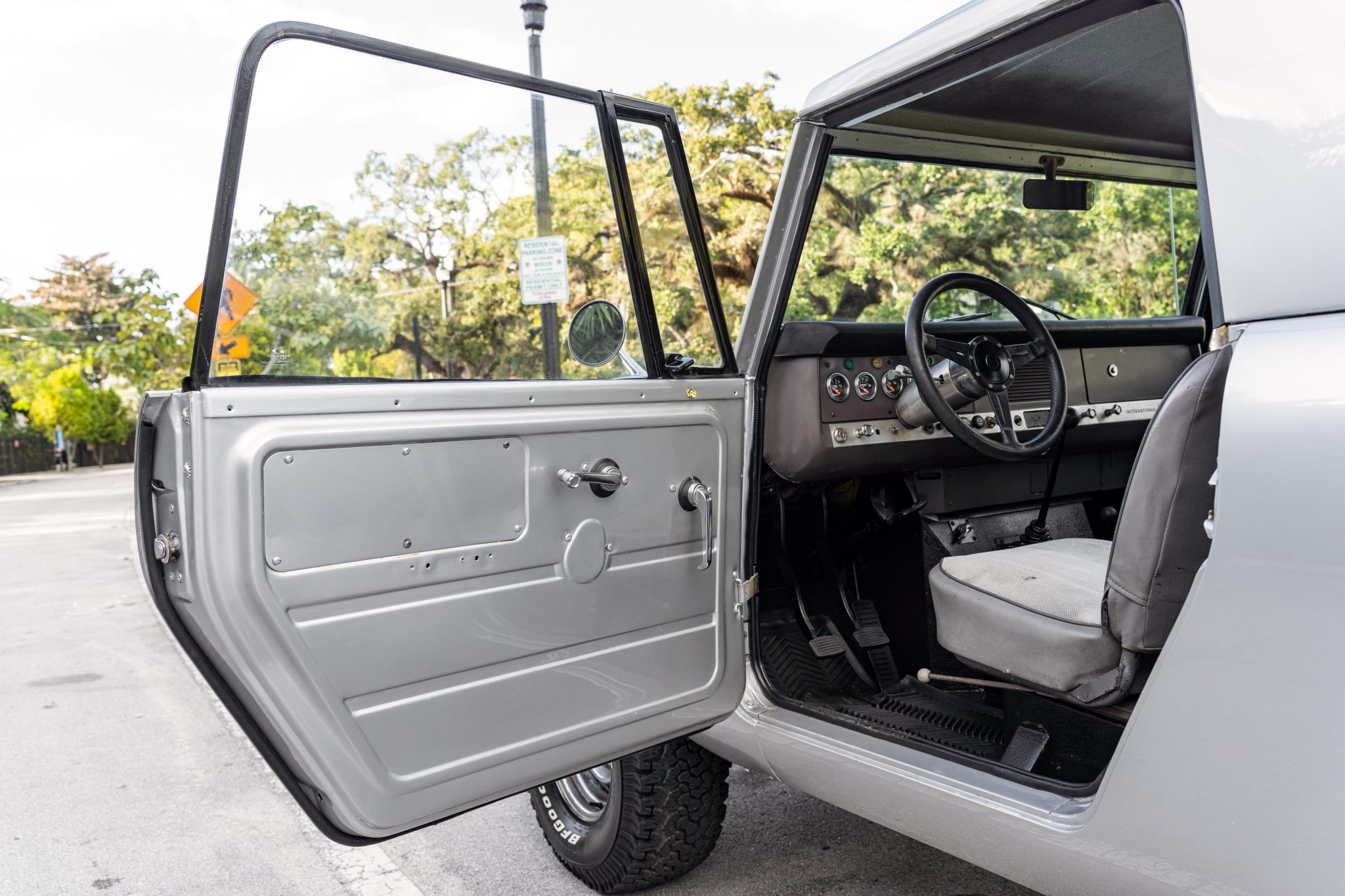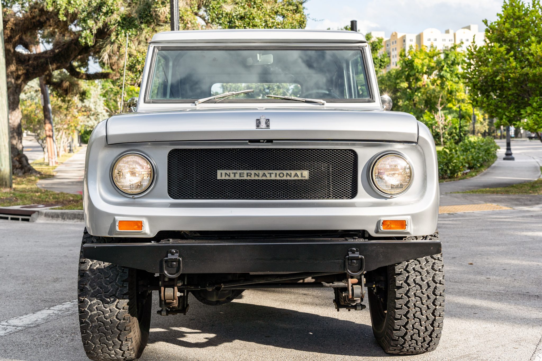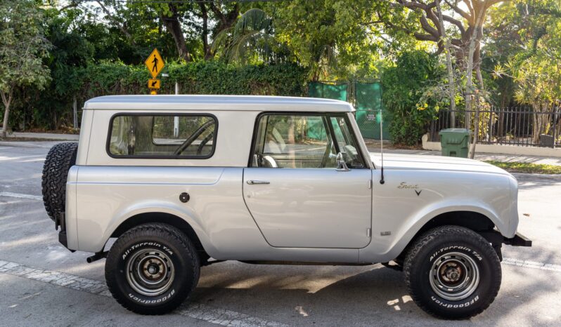 This 1967 International Harvester Scout 800 4×4 has been refinished in silver over gray cloth and vinyl and is powered by a 266ci V8 linked to a four-speed manual transmission and a twin-stick dual-range transfer case. Features include an Edelbrock carburetor, a removable Traveltop, a lifted suspension, Bilstein shock absorbers, power steering, chrome 15″ steel wheels, aftermarket bumpers, a roll bar, an Alpine Bluetooth stereo, and a JL Audio amplifier, subwoofer, and speakers.