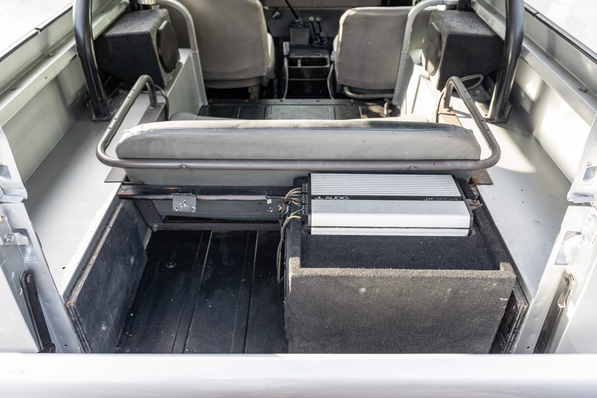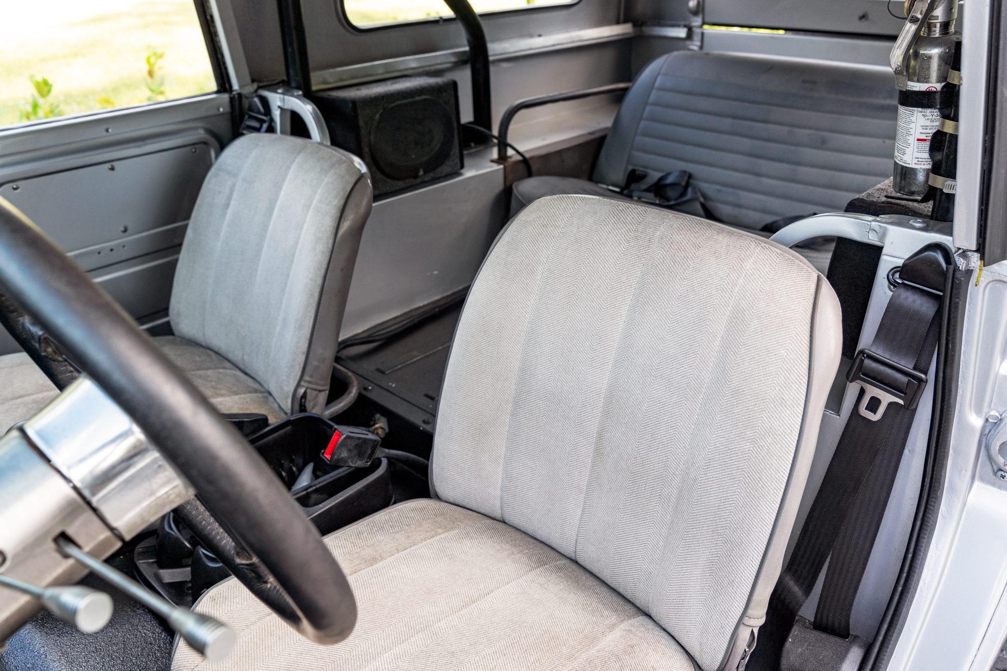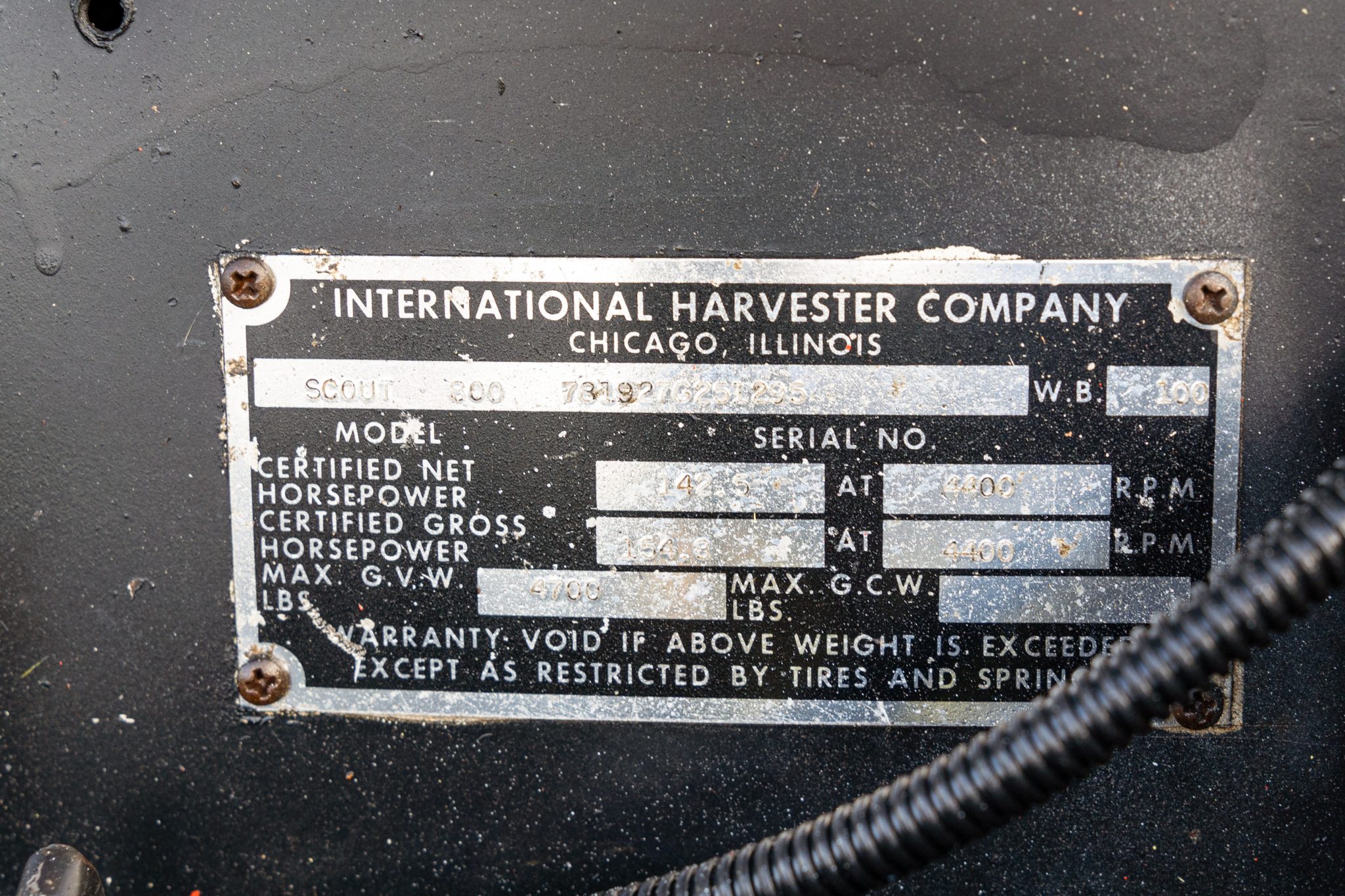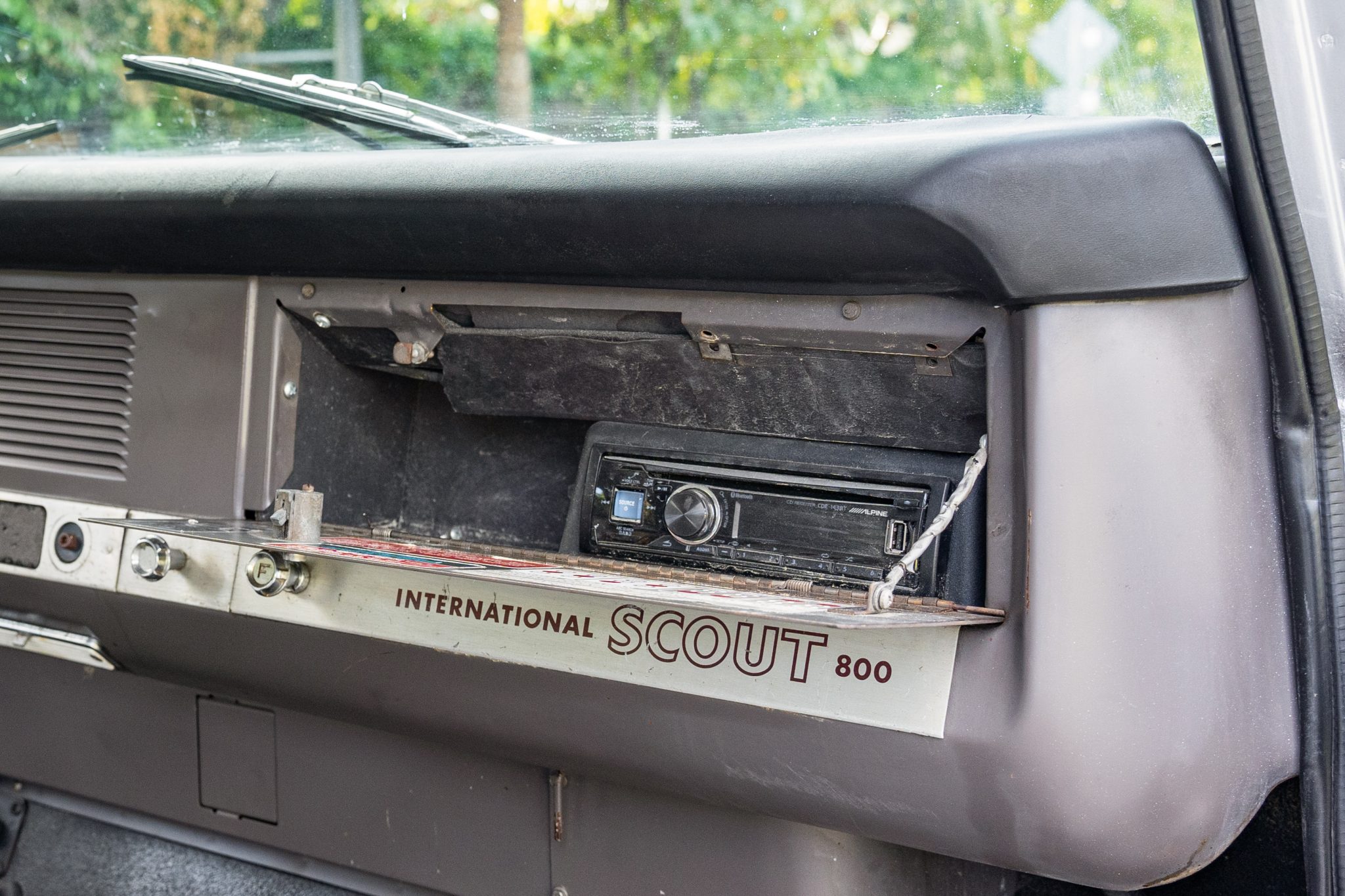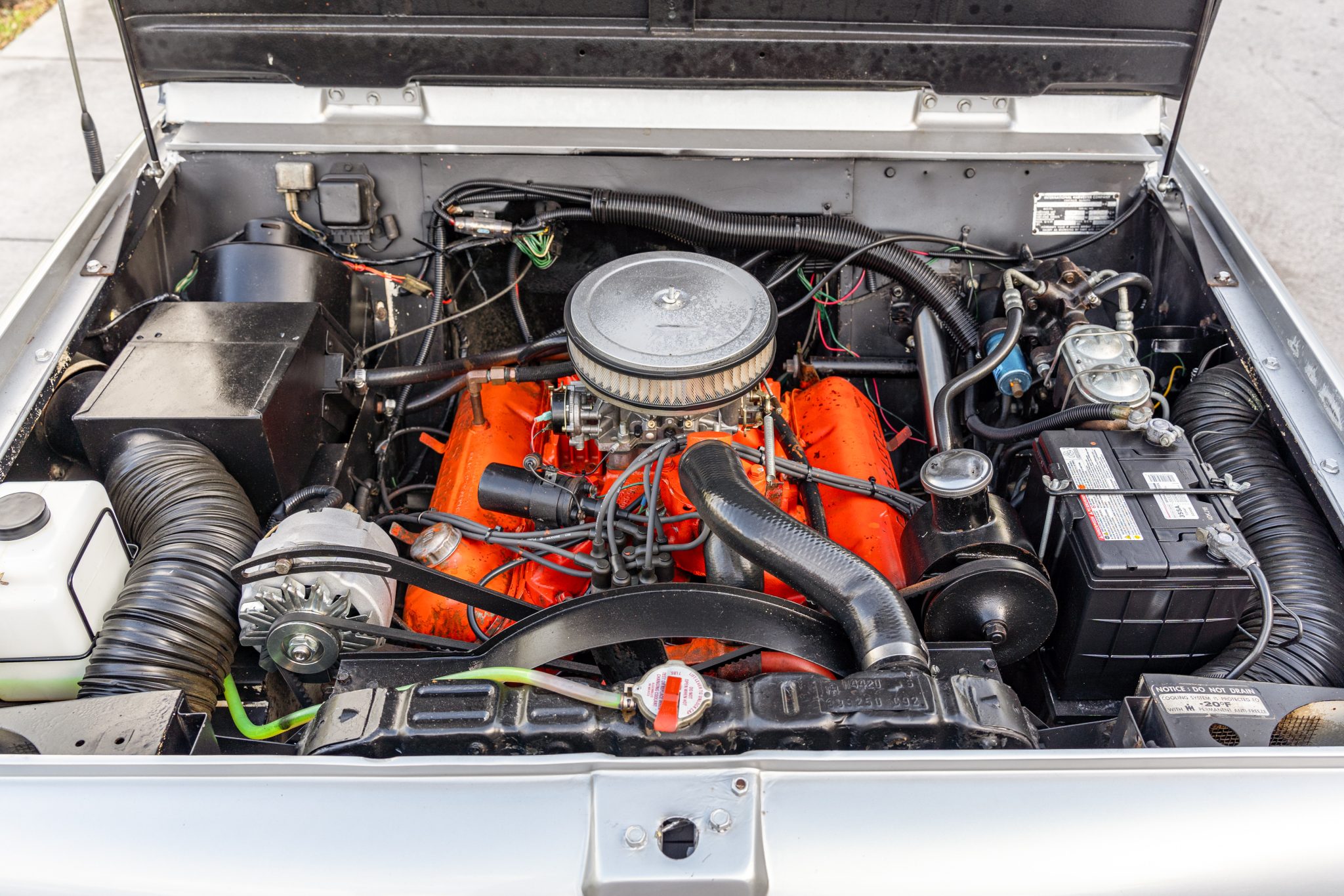 This 1967 International Harvester Scout 800 4×4 has been refinished in silver over gray cloth and vinyl and is powered by a 266ci V8 linked to a four-speed manual transmission and a twin-stick dual-range transfer case. Features include an Edelbrock carburetor, a removable Traveltop, a lifted suspension, Bilstein shock absorbers, power steering, chrome 15″ steel wheels, aftermarket bumpers, a roll bar, an Alpine Bluetooth stereo, and a JL Audio amplifier, subwoofer, and speakers.