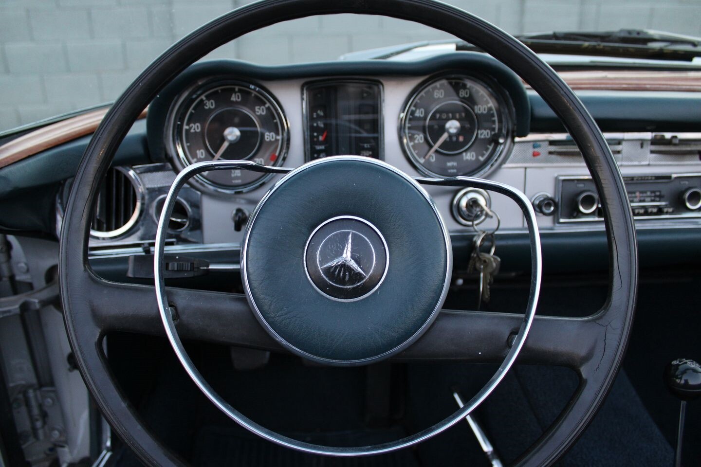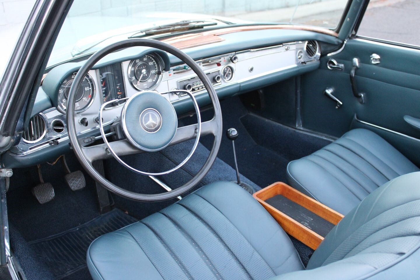 Slip into the driver's seat, and you'll find yourself enveloped in a sumptuous blue interior that has stood the test of time. The exact material may be unknown, but the quality and comfort are unmistakable. The cabin of the 230SL is a sanctuary of tranquility, where every journey becomes a serene escape from the outside world. The interior is not just a space—it's a statement, a nod to a bygone era of motoring where every detail mattered.