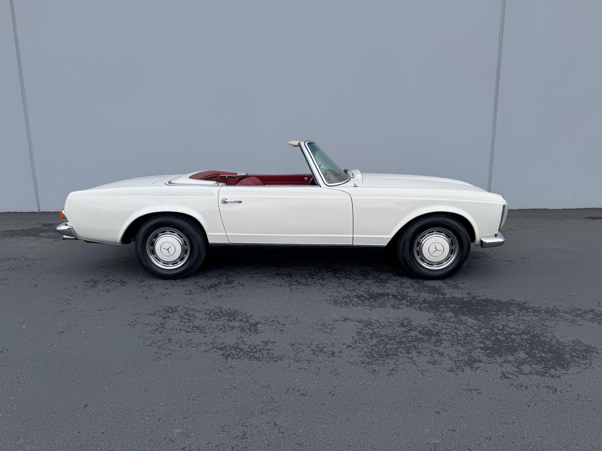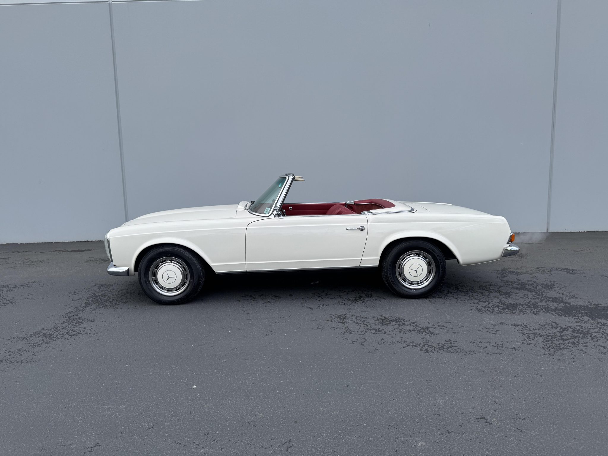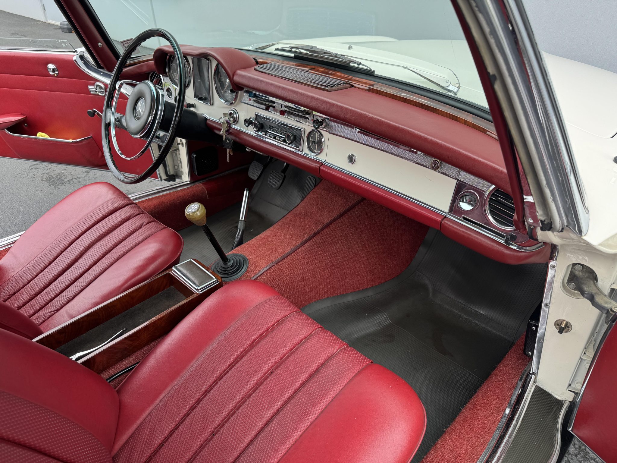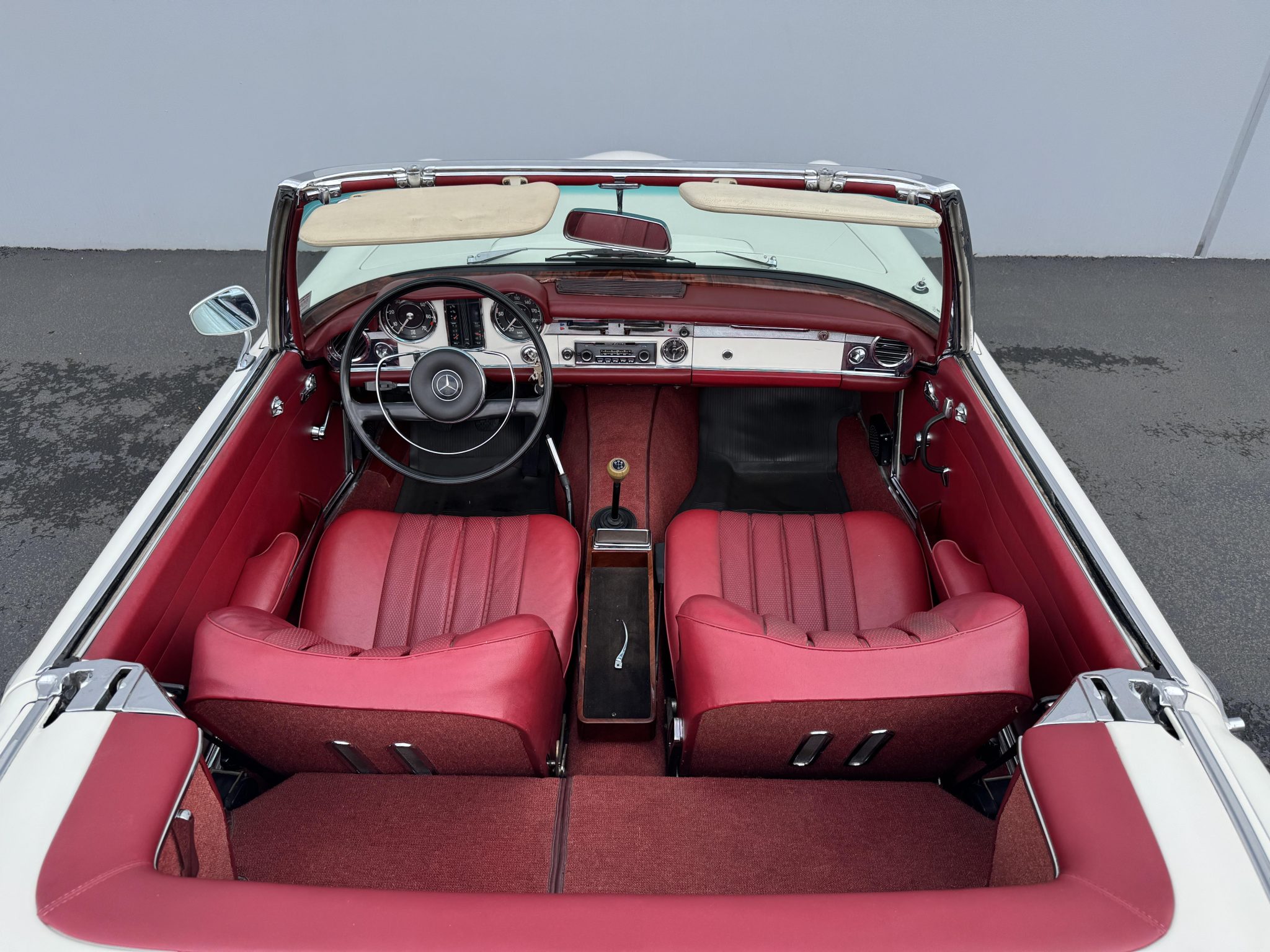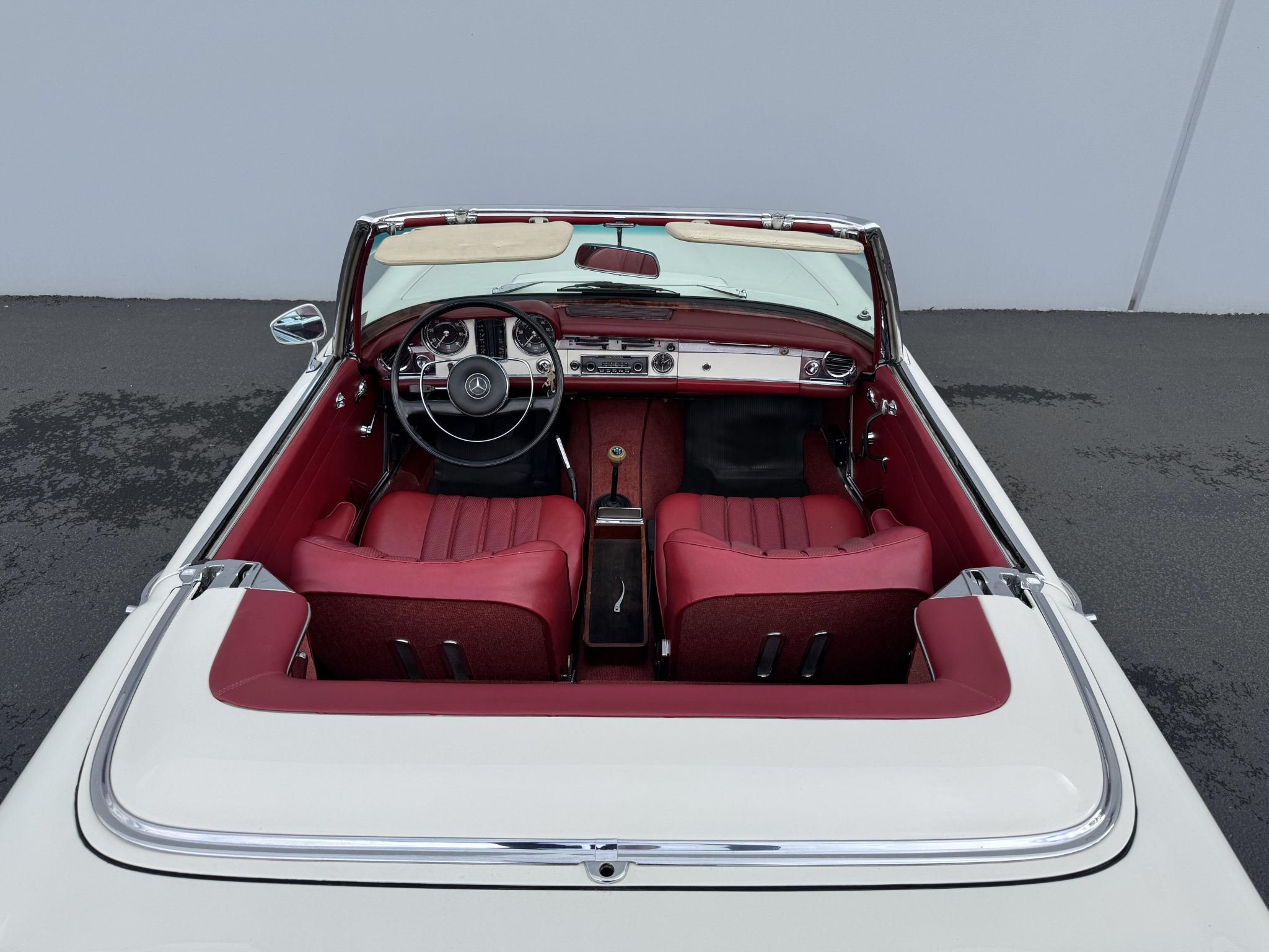 It is powered by a 2.5-liter inline-six paired with a four-speed manual transmission and is finished in white over red upholstery. Equipment includes a black convertible top, a removable hardtop, 14″ steel wheels with painted covers, a Becker Europa radio, and a heater.