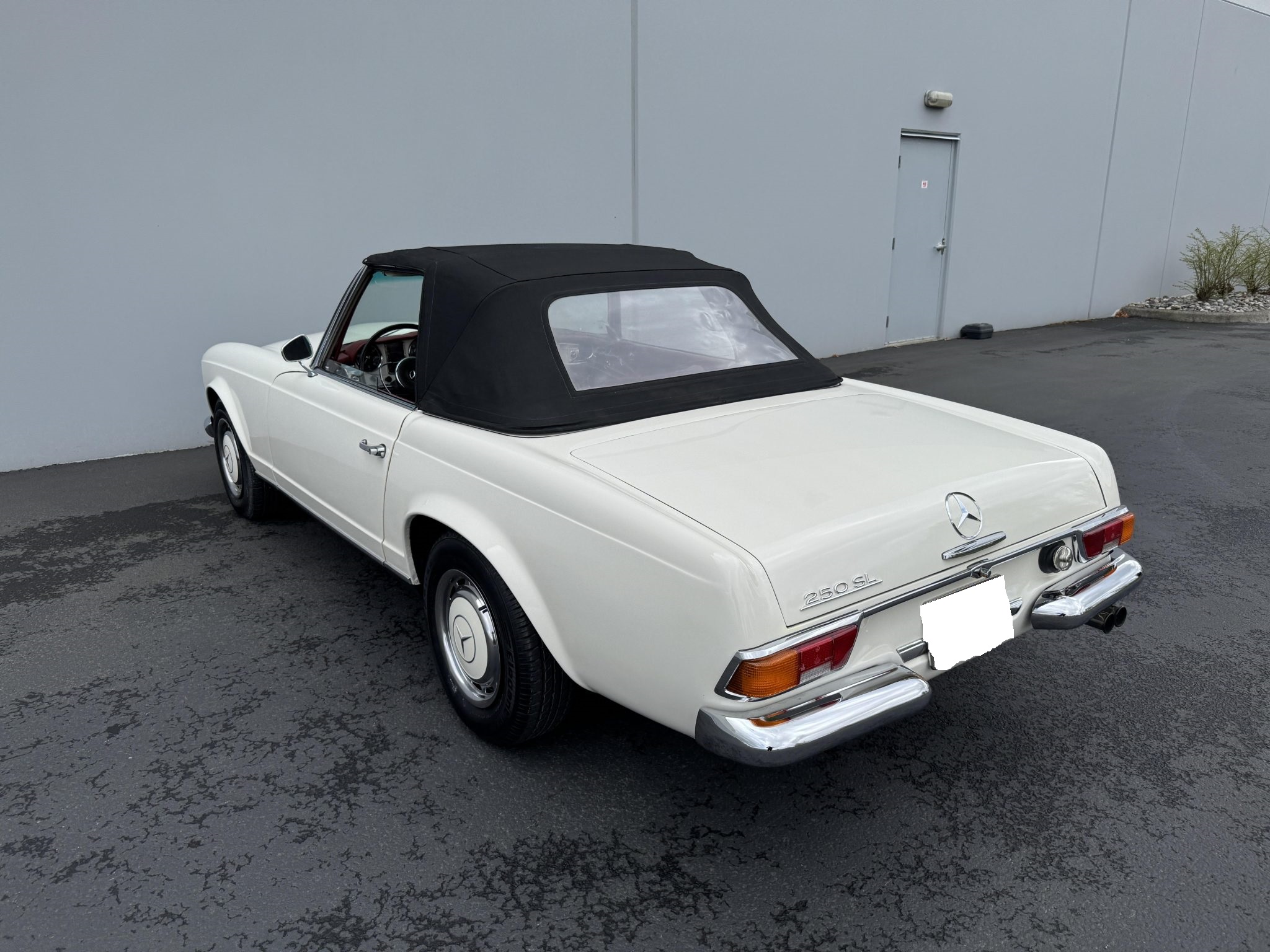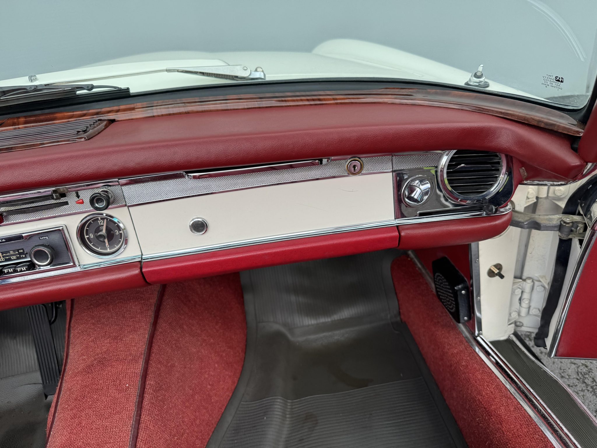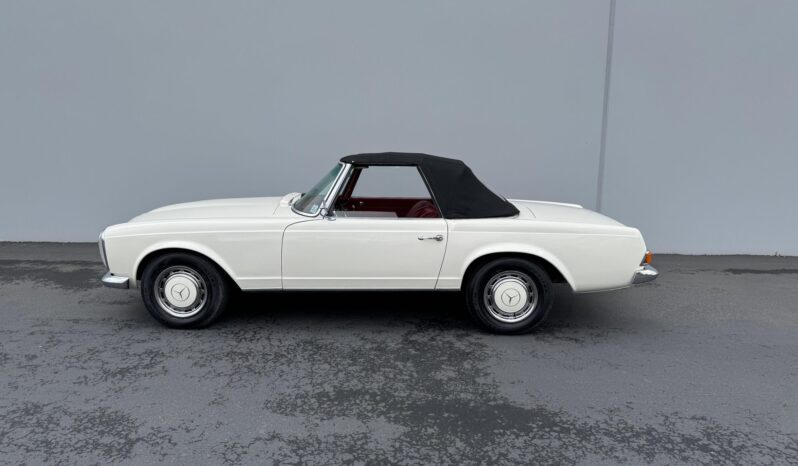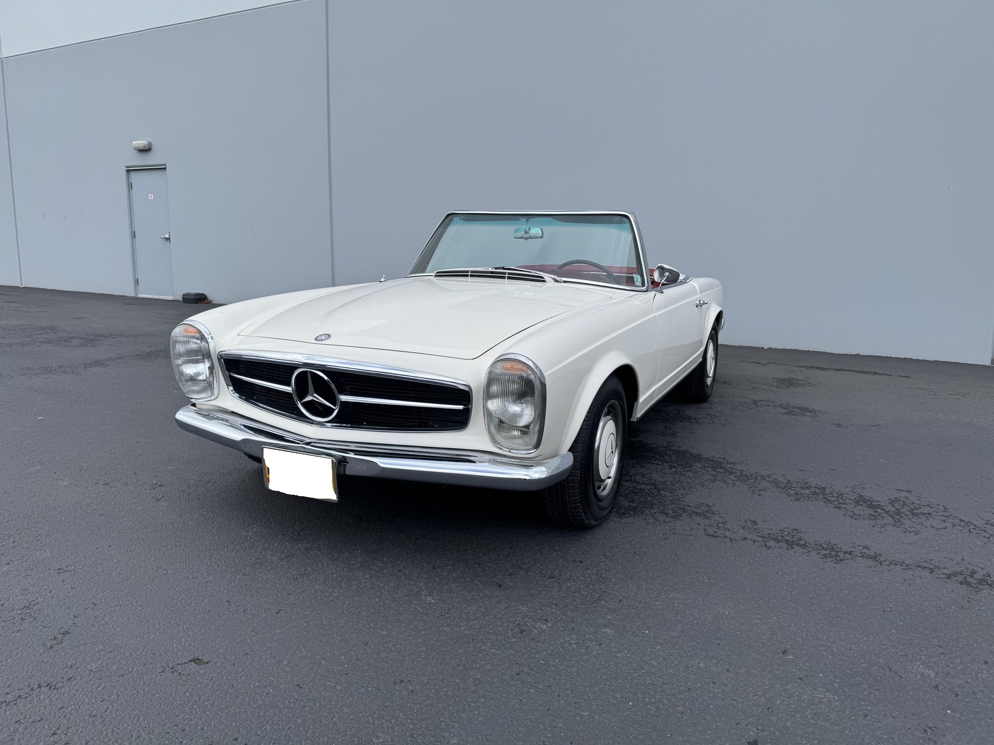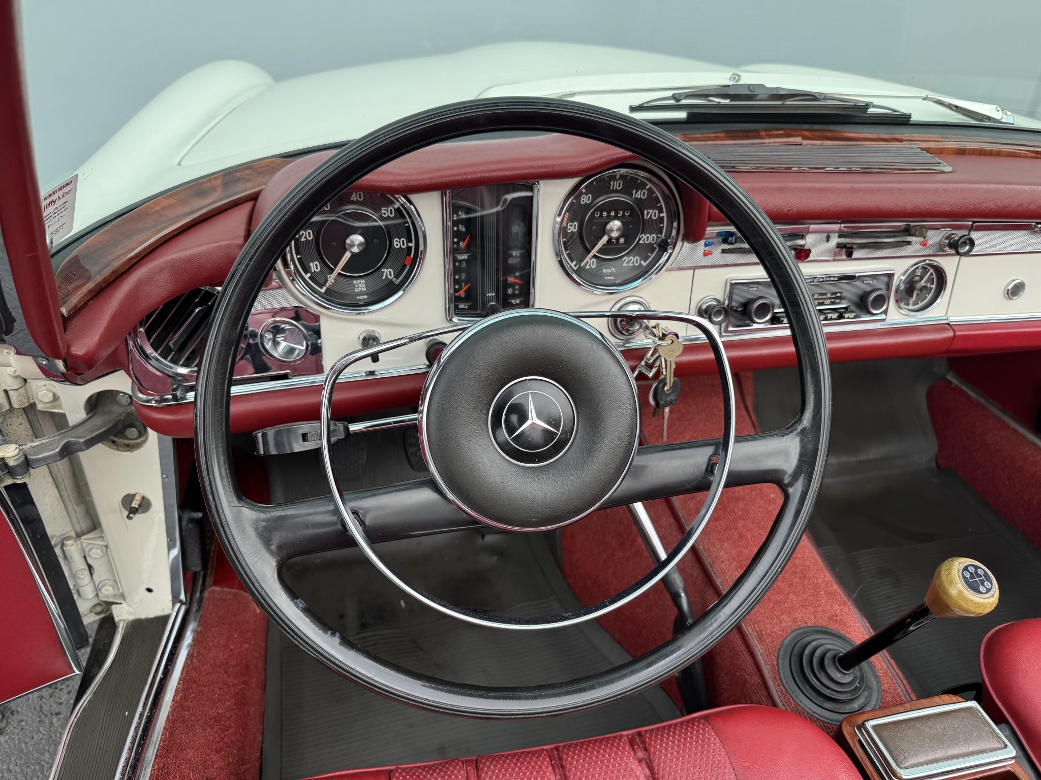 It is powered by a 2.5-liter inline-six paired with a four-speed manual transmission and is finished in white over red upholstery. Equipment includes a black convertible top, a removable hardtop, 14″ steel wheels with painted covers, a Becker Europa radio, and a heater.