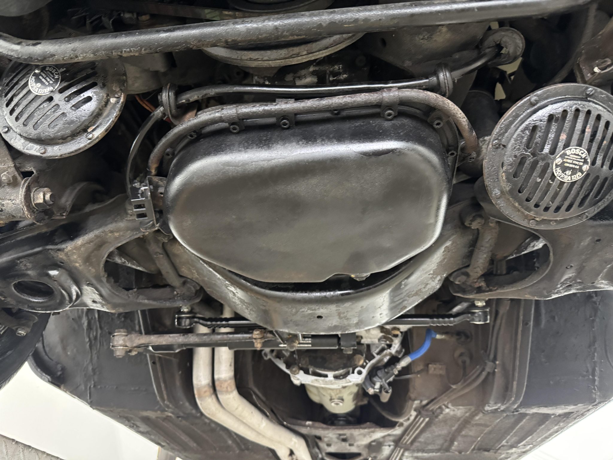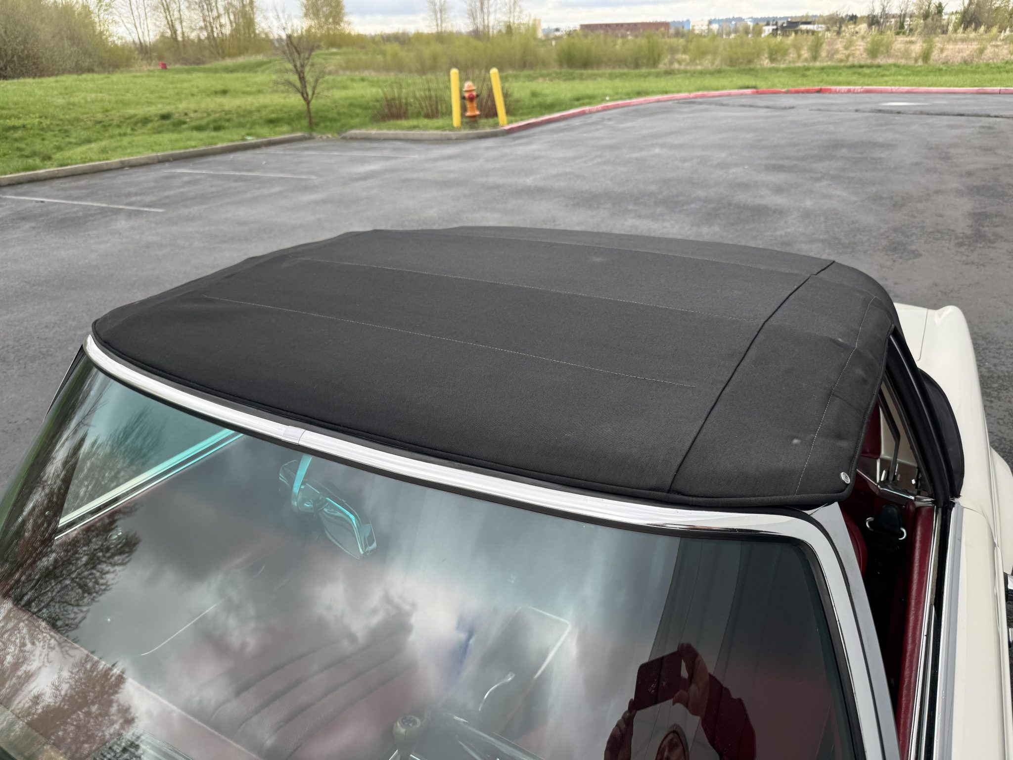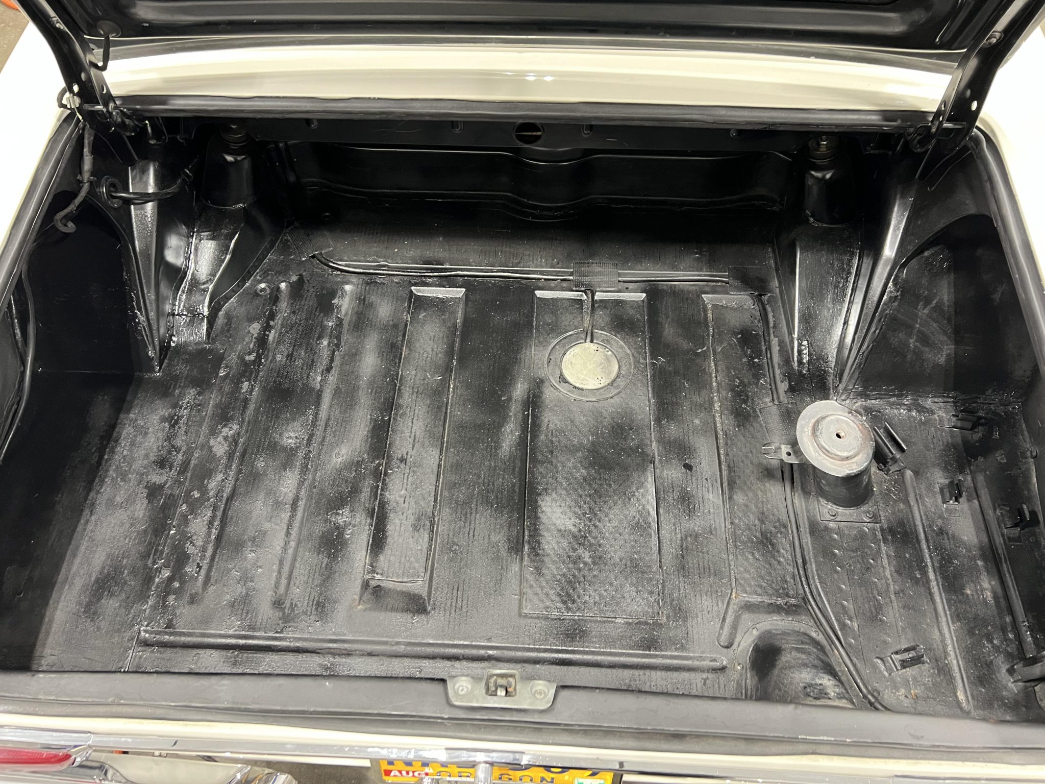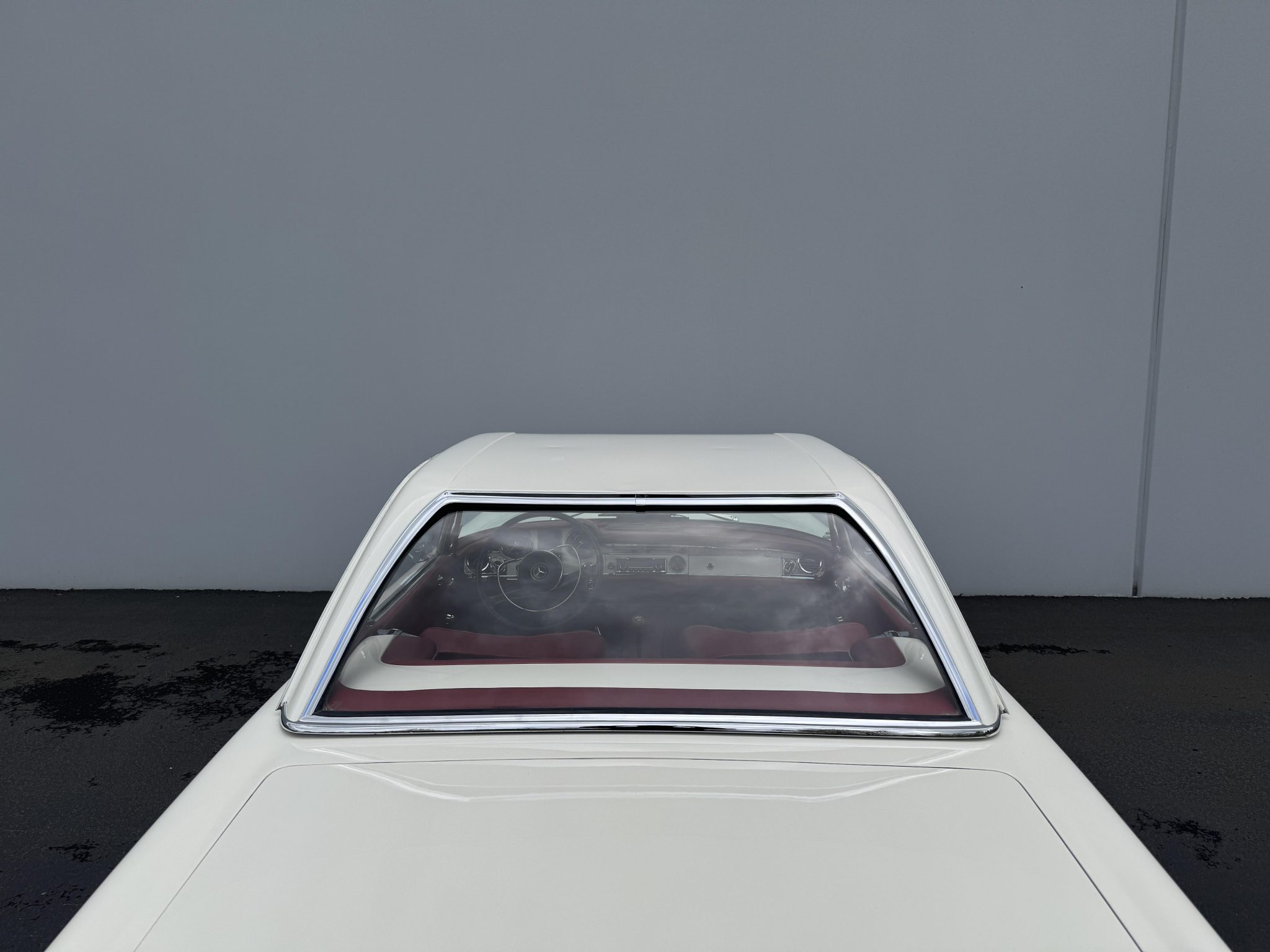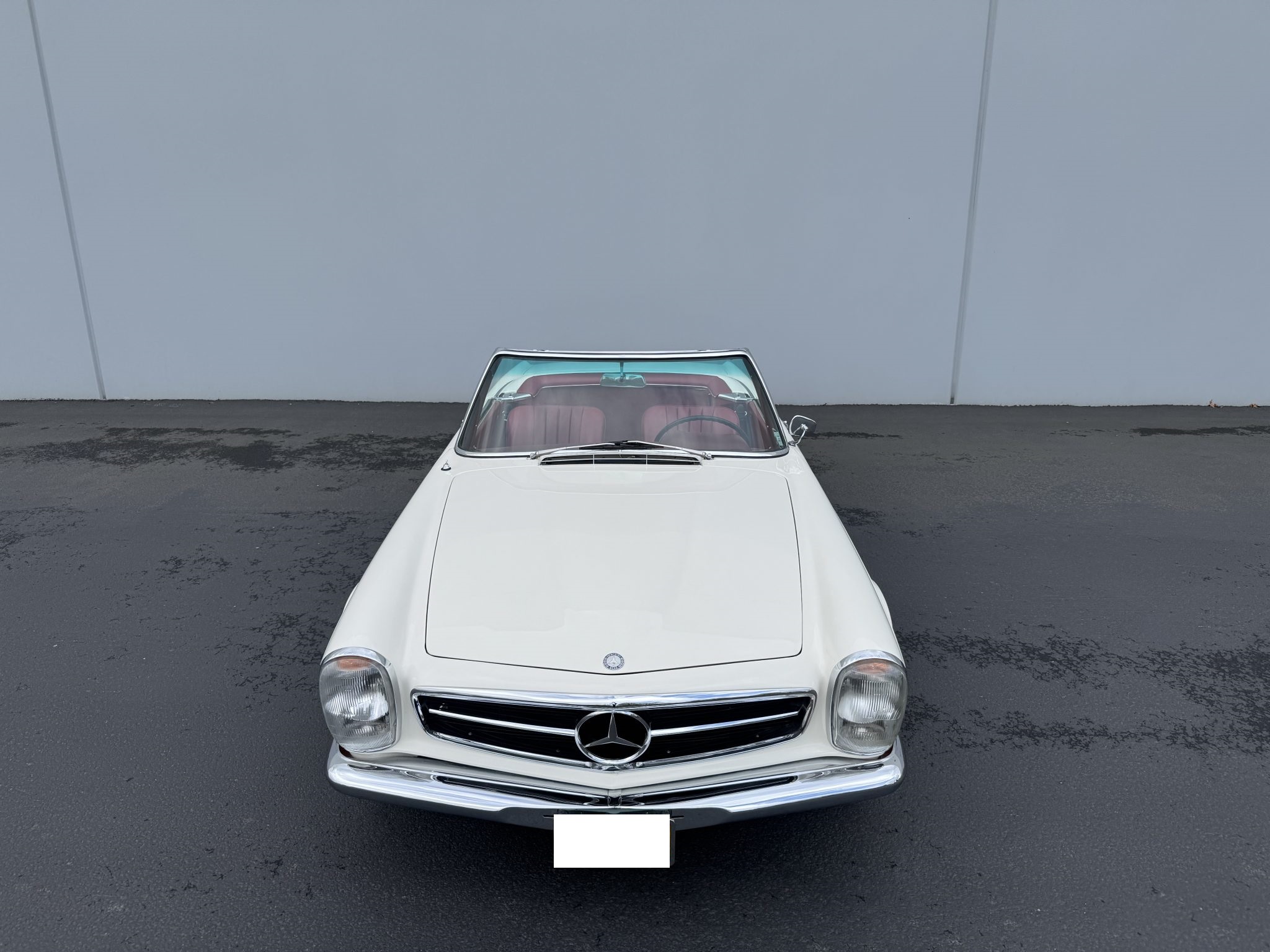 It is powered by a 2.5-liter inline-six paired with a four-speed manual transmission and is finished in white over red upholstery. Equipment includes a black convertible top, a removable hardtop, 14″ steel wheels with painted covers, a Becker Europa radio, and a heater.