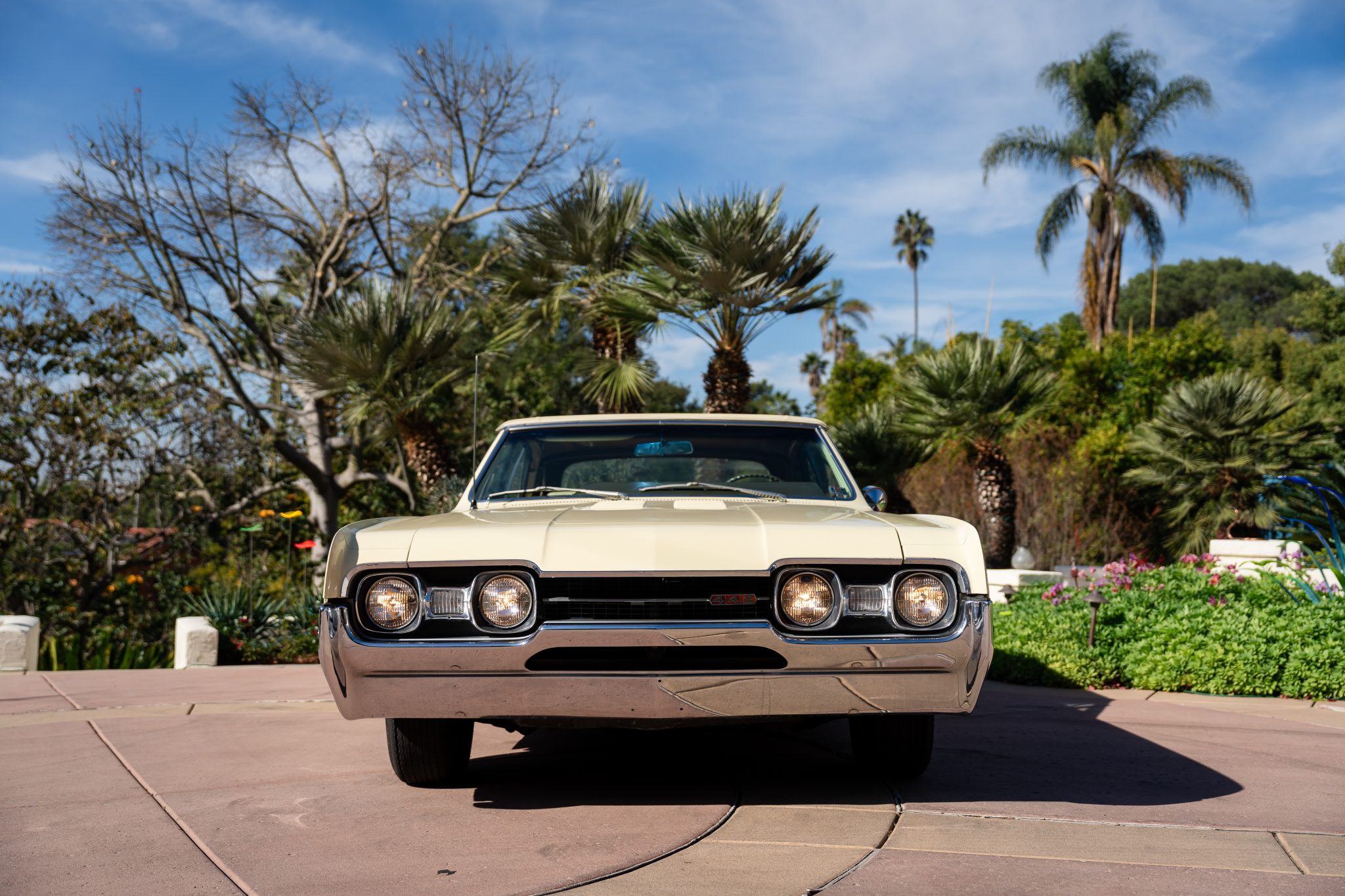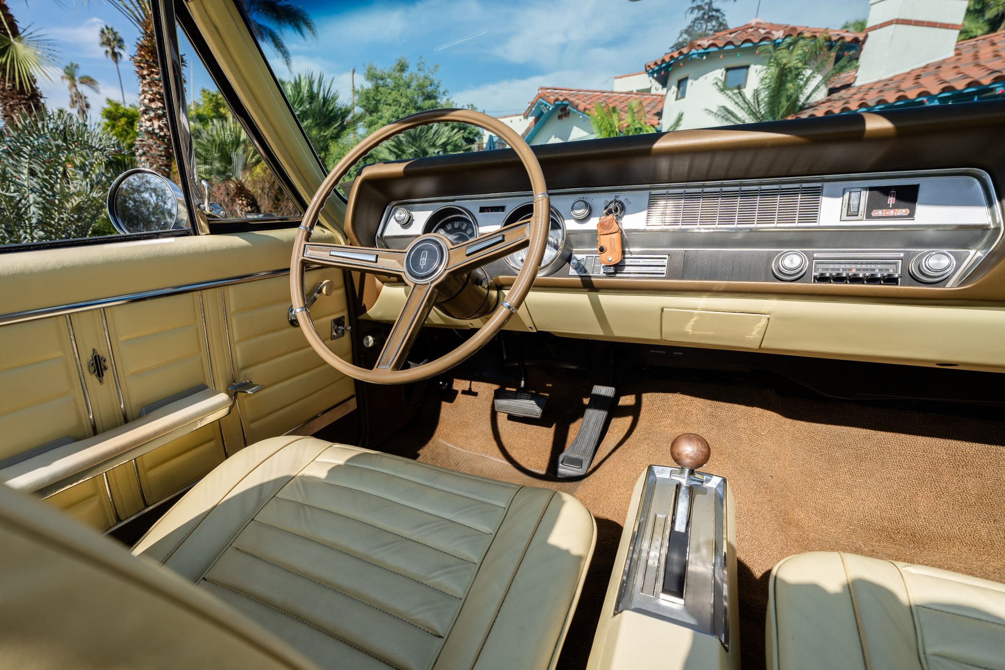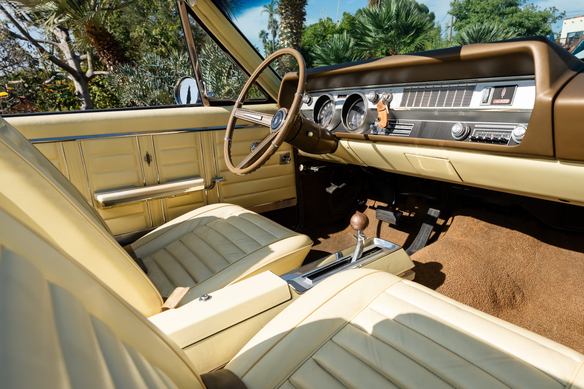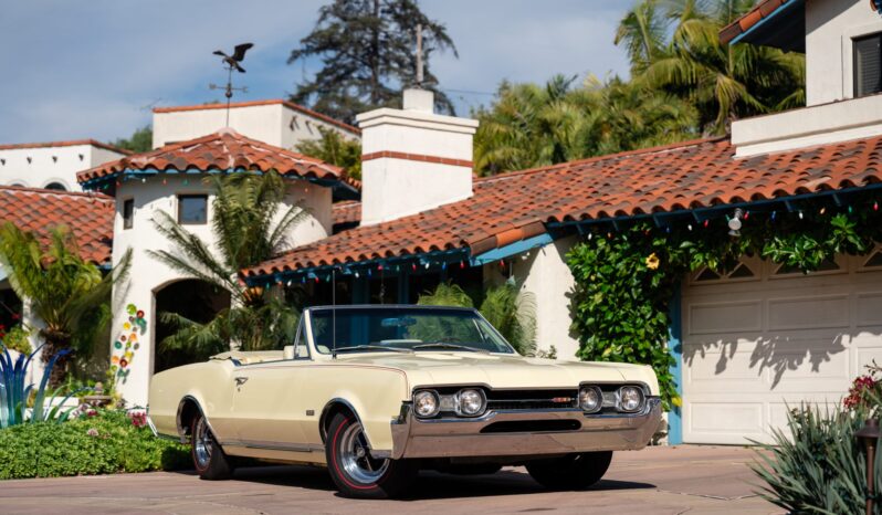 This 1967 Oldsmobile Cutlass Supreme 442 convertible is one of 3,080 made for the model year The car is powered by a 400ci V8 linked to a three-speed Turbo Hydra-Matic automatic transmission and is finished in yellow over yellow with a power-operated yellow convertible soft top. Additional equipment includes an Anti-Spin rear axle, 14″ Super Stock wheels, power-assisted brakes, power steering, front bucket seats, a power-adjustable driver’s seat, and a pushbutton AM radio.