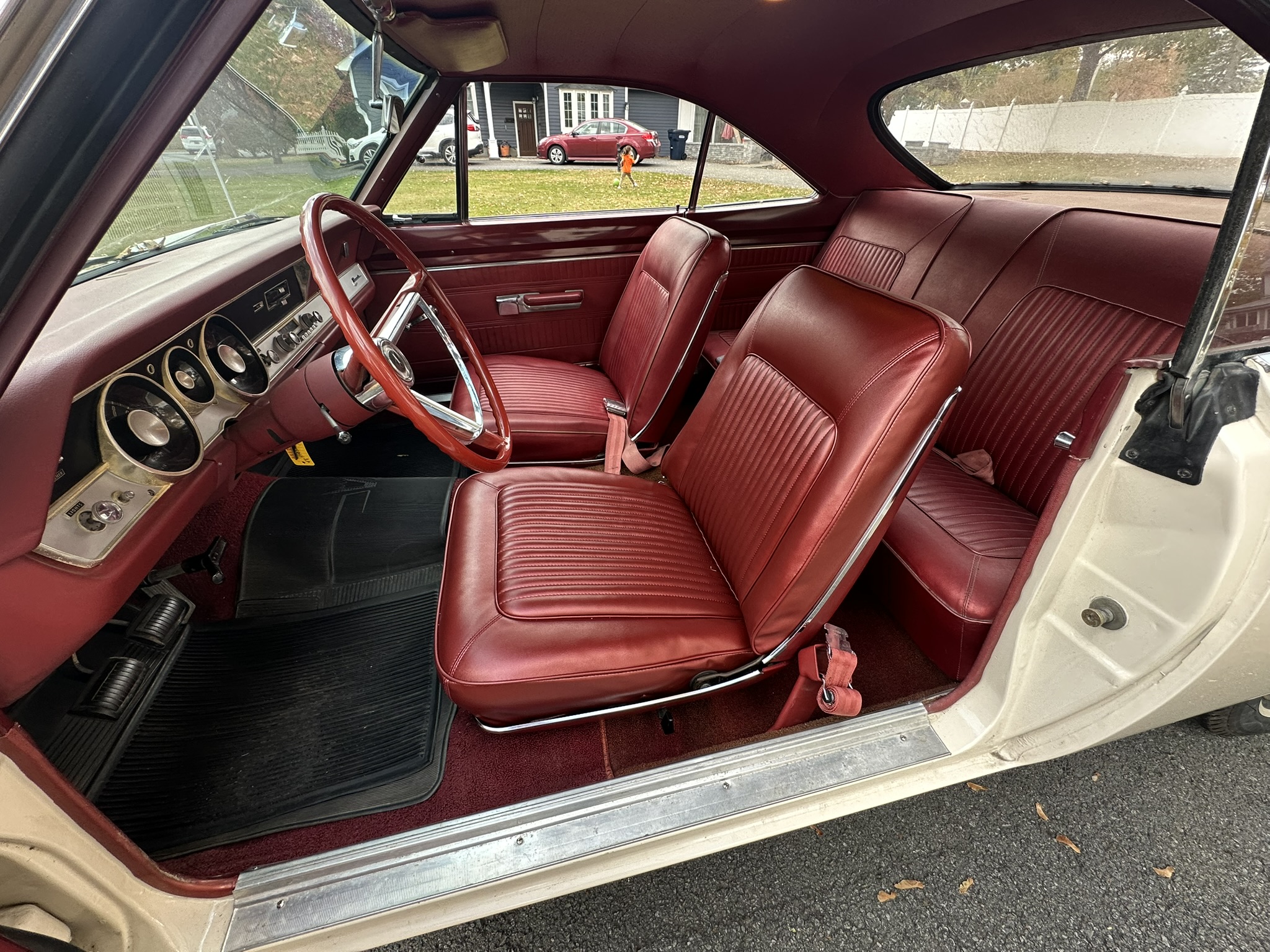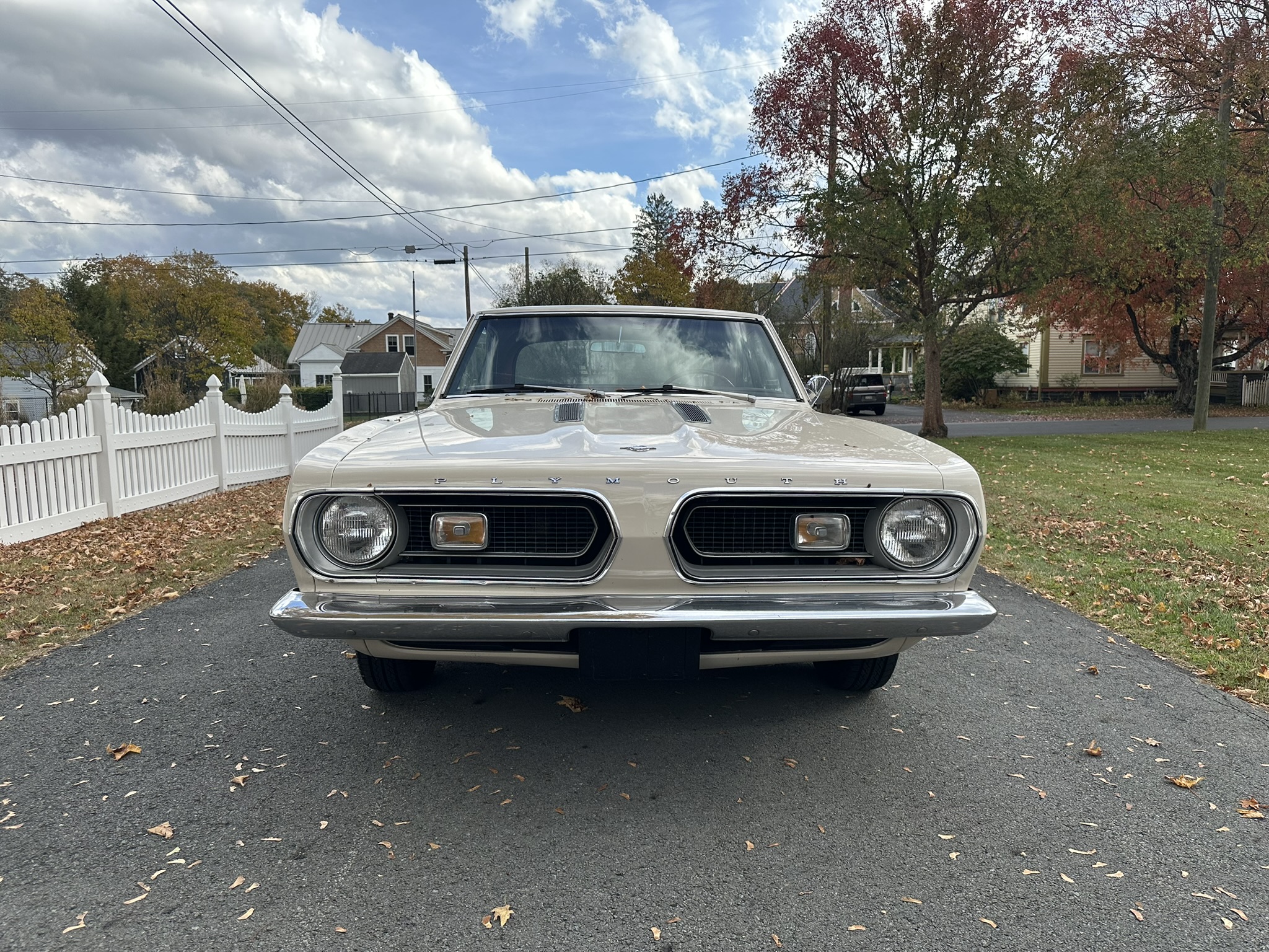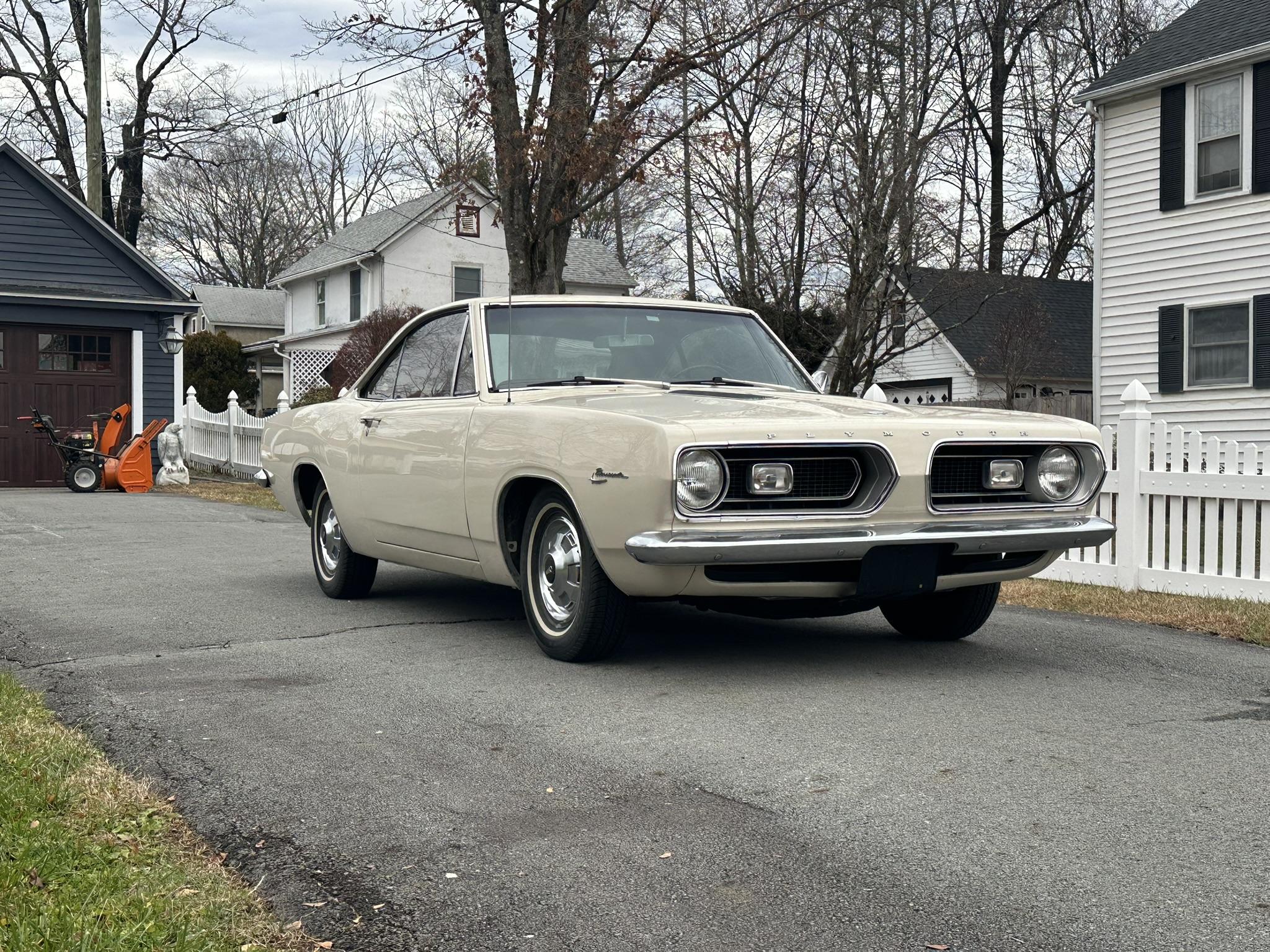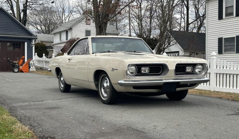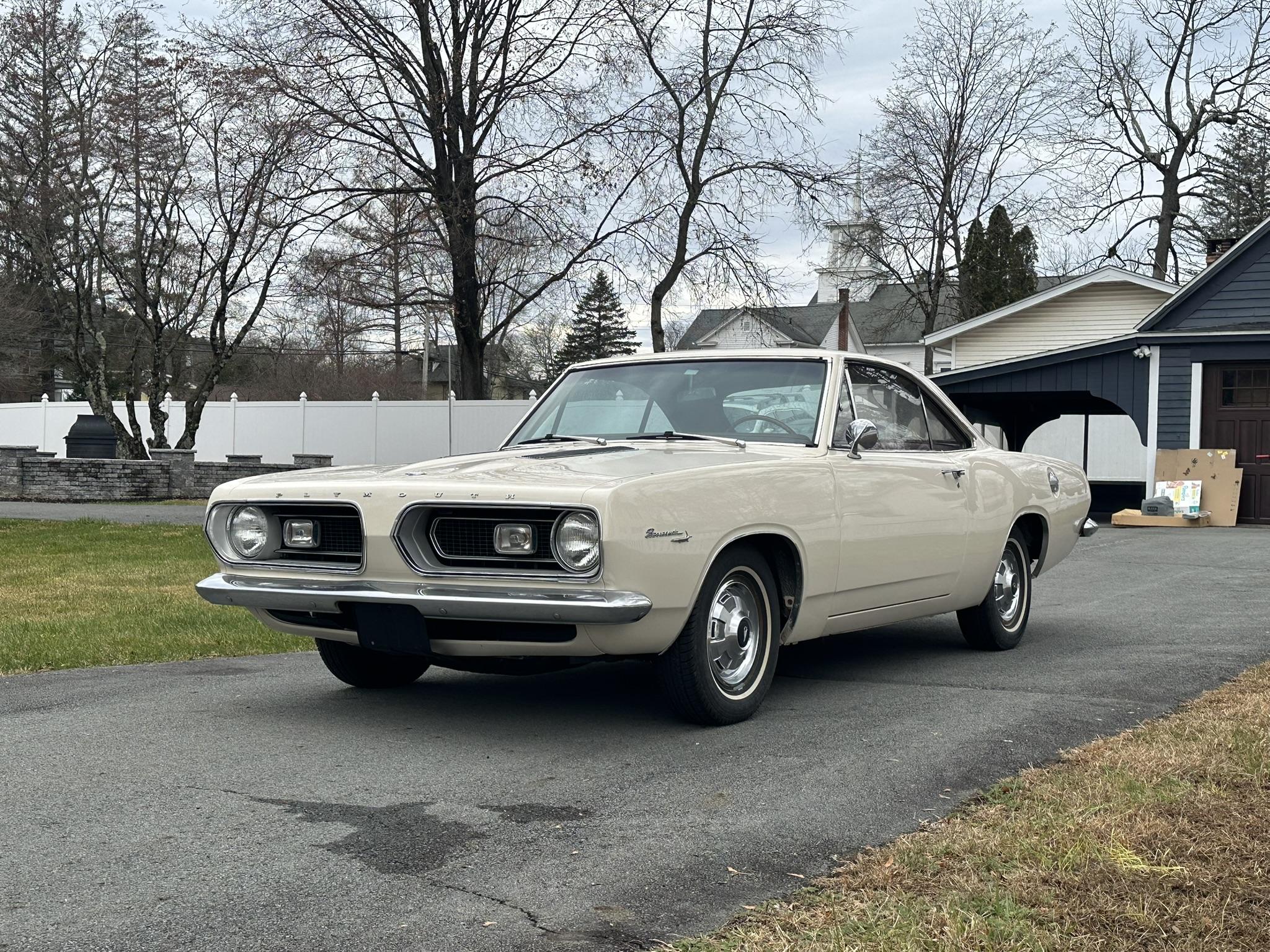 This 1967 Plymouth Barracuda hardtop coupe is powered by a 225ci inline-six mated to a three-speed manual transmission. The car is finished in beige over red vinyl upholstery, and equipment includes wheel covers, front bucket seats, lap belts, an AM radio, and a heater.