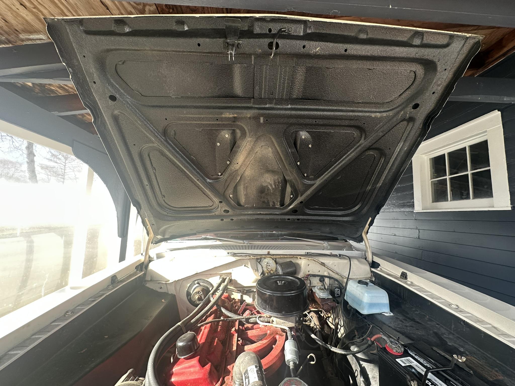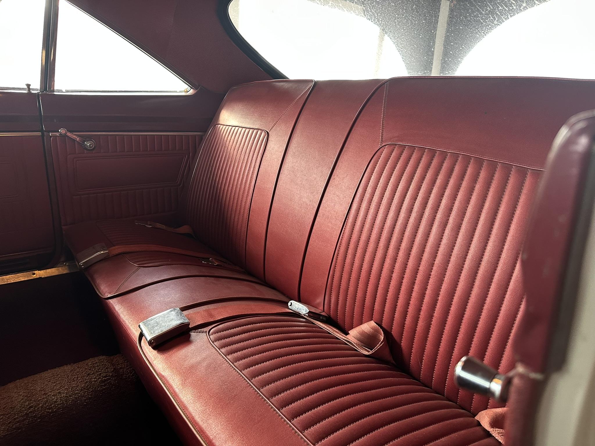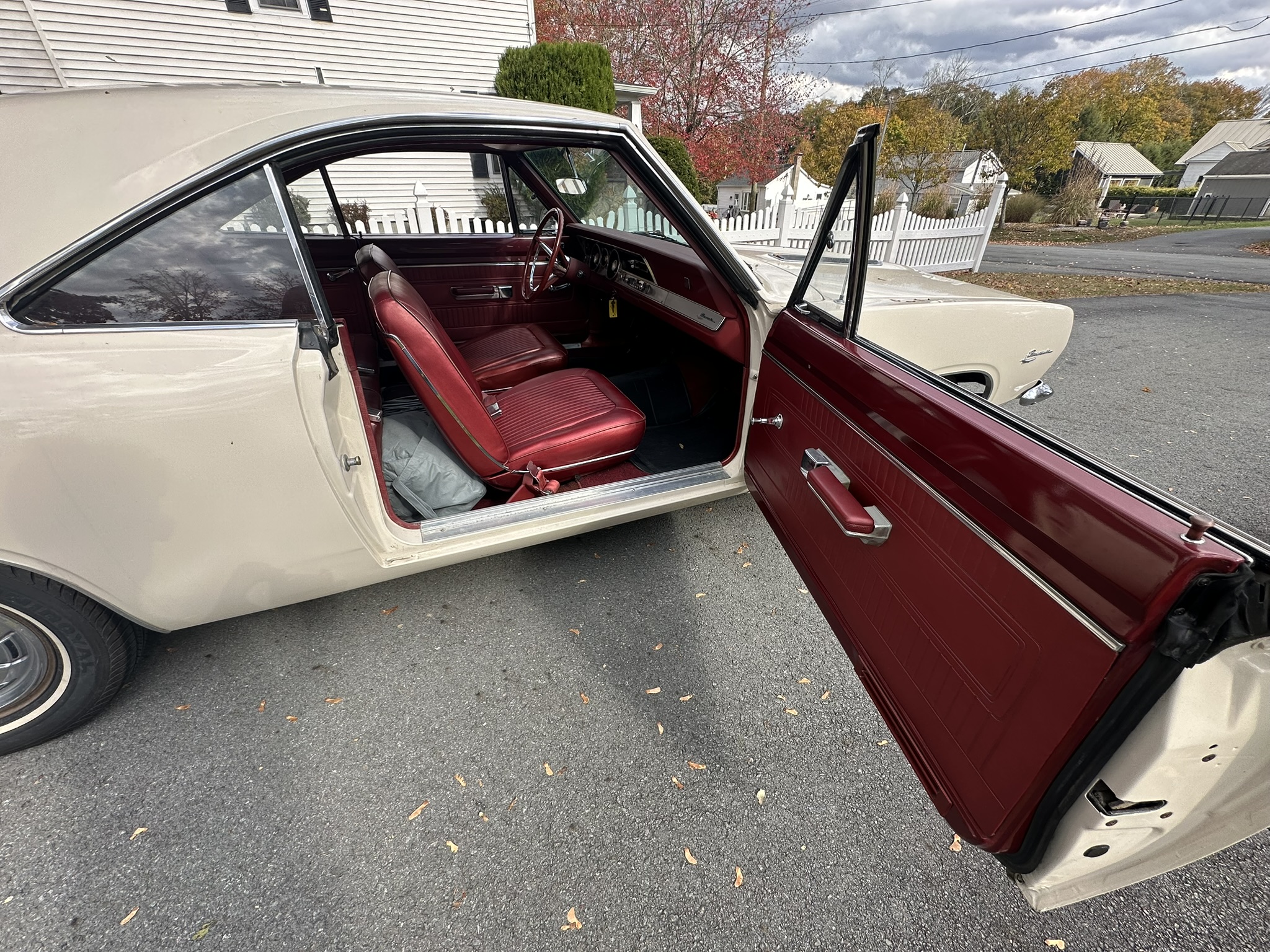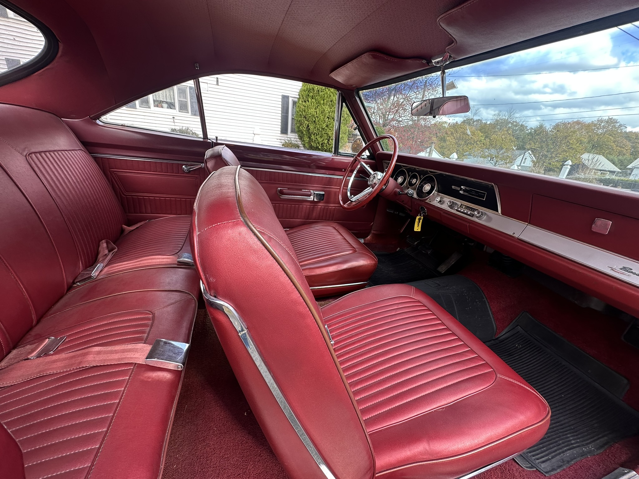 This 1967 Plymouth Barracuda hardtop coupe is powered by a 225ci inline-six mated to a three-speed manual transmission. The car is finished in beige over red vinyl upholstery, and equipment includes wheel covers, front bucket seats, lap belts, an AM radio, and a heater.