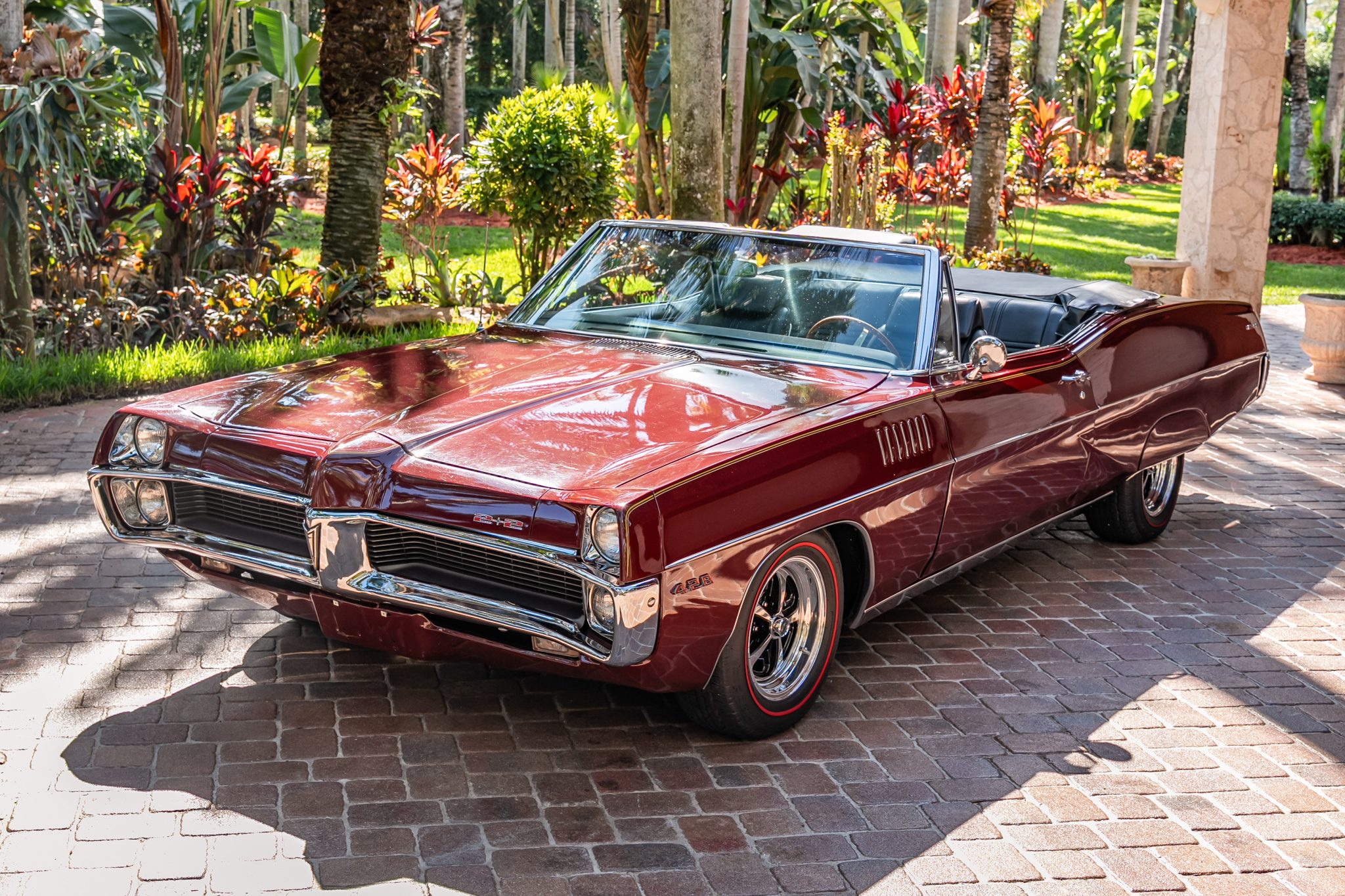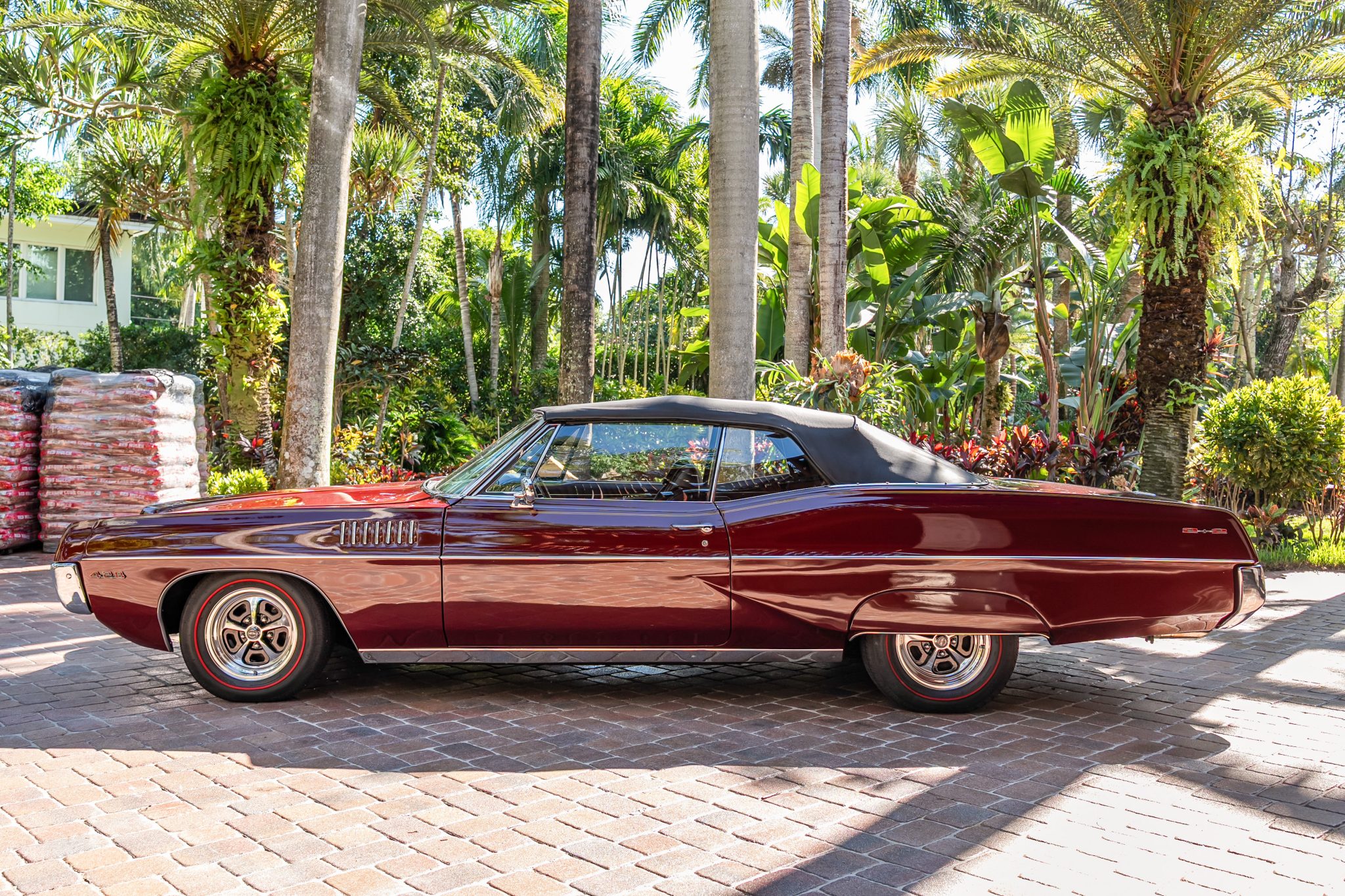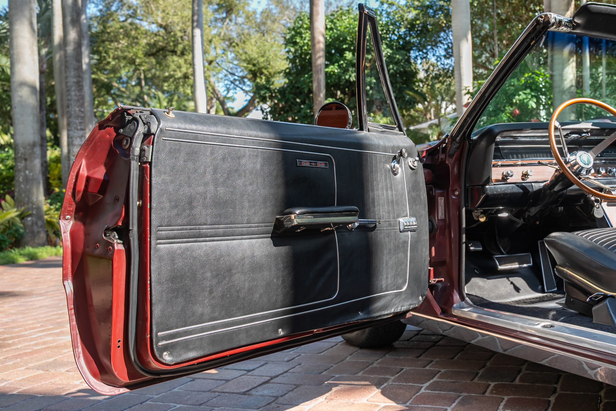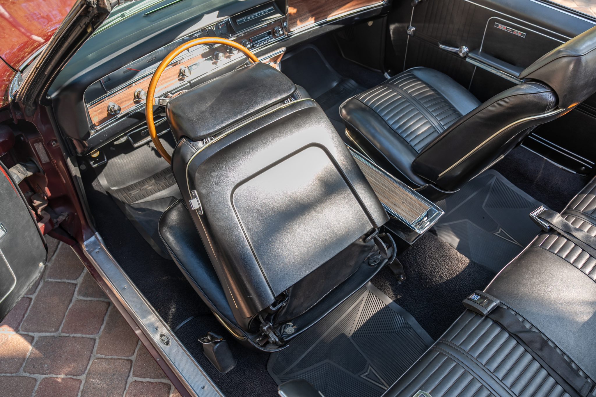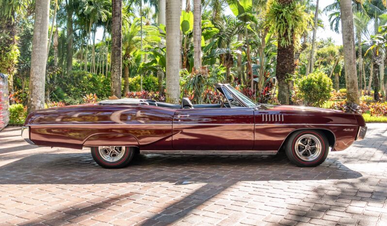 This 1967 Pontiac Catalina is stated to be one of approximately 17 Catalina 2+2 convertibles produced with a 428ci High Output V8 for the model year The car is finished in burgundy over black vinyl, and additional equipment includes a three-speed Turbo Hydra-Matic automatic transmission, a black convertible top, 15″ American Racing wheels, a dual exhaust system, power windows, and an AM/FM radio with a reverberator.