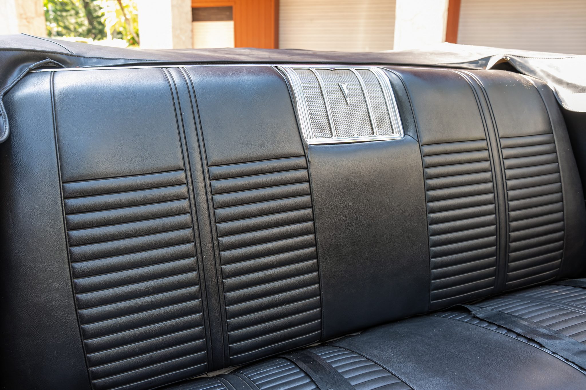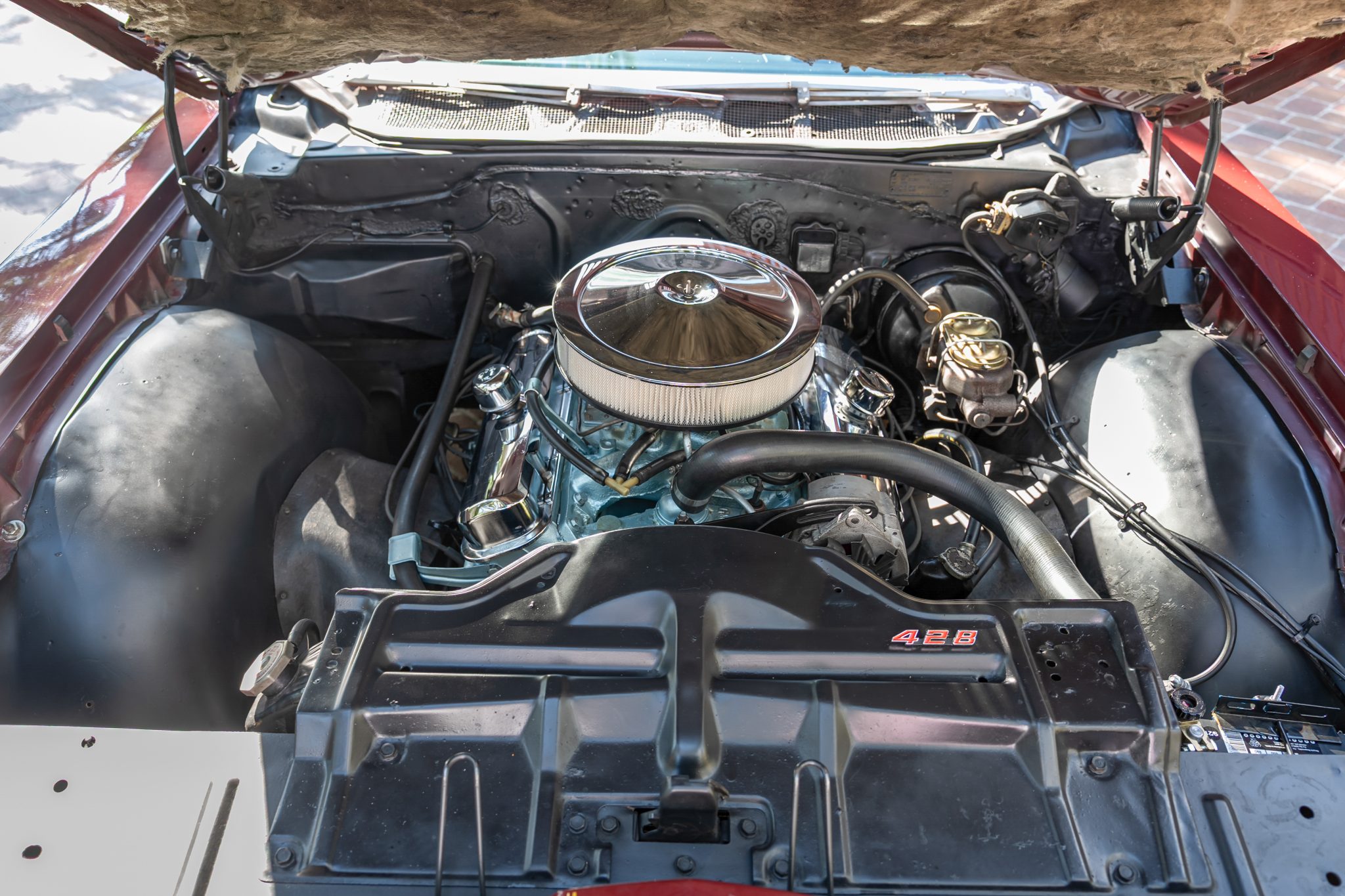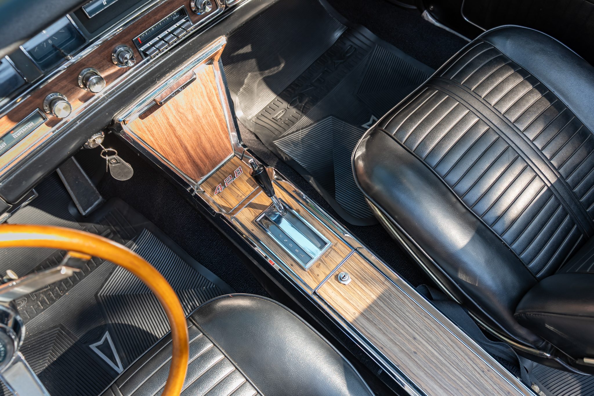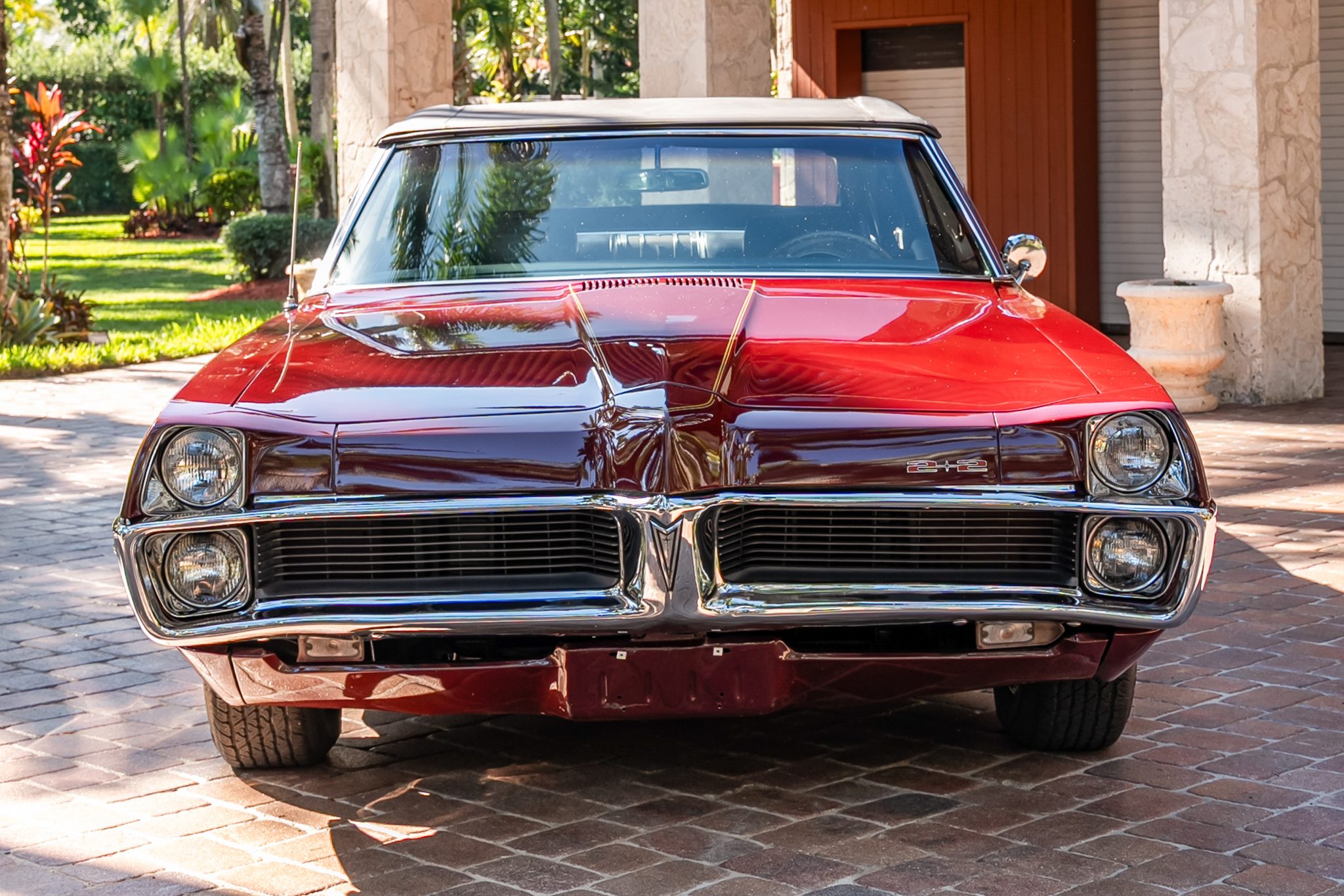 This 1967 Pontiac Catalina is stated to be one of approximately 17 Catalina 2+2 convertibles produced with a 428ci High Output V8 for the model year The car is finished in burgundy over black vinyl, and additional equipment includes a three-speed Turbo Hydra-Matic automatic transmission, a black convertible top, 15″ American Racing wheels, a dual exhaust system, power windows, and an AM/FM radio with a reverberator.