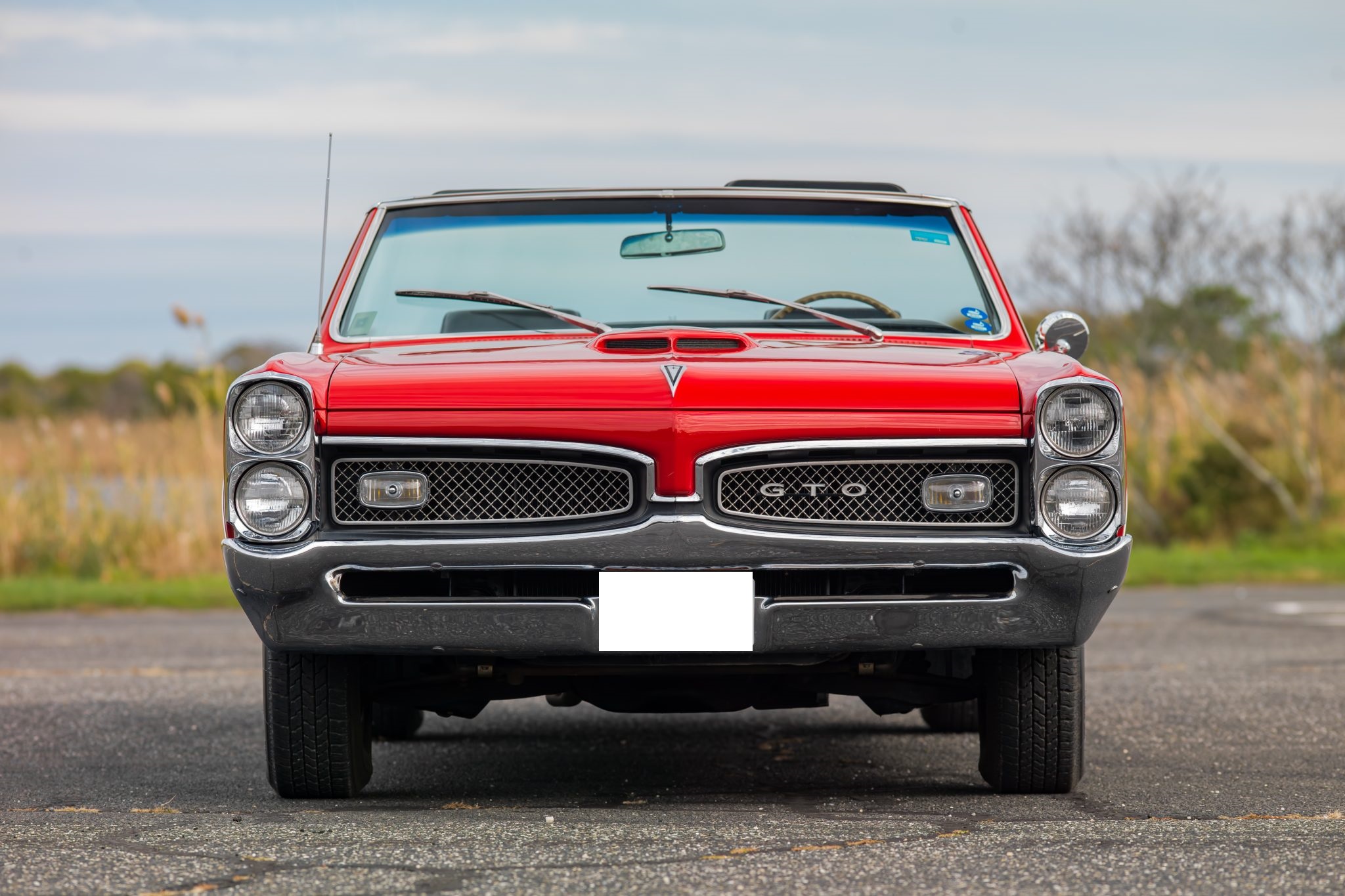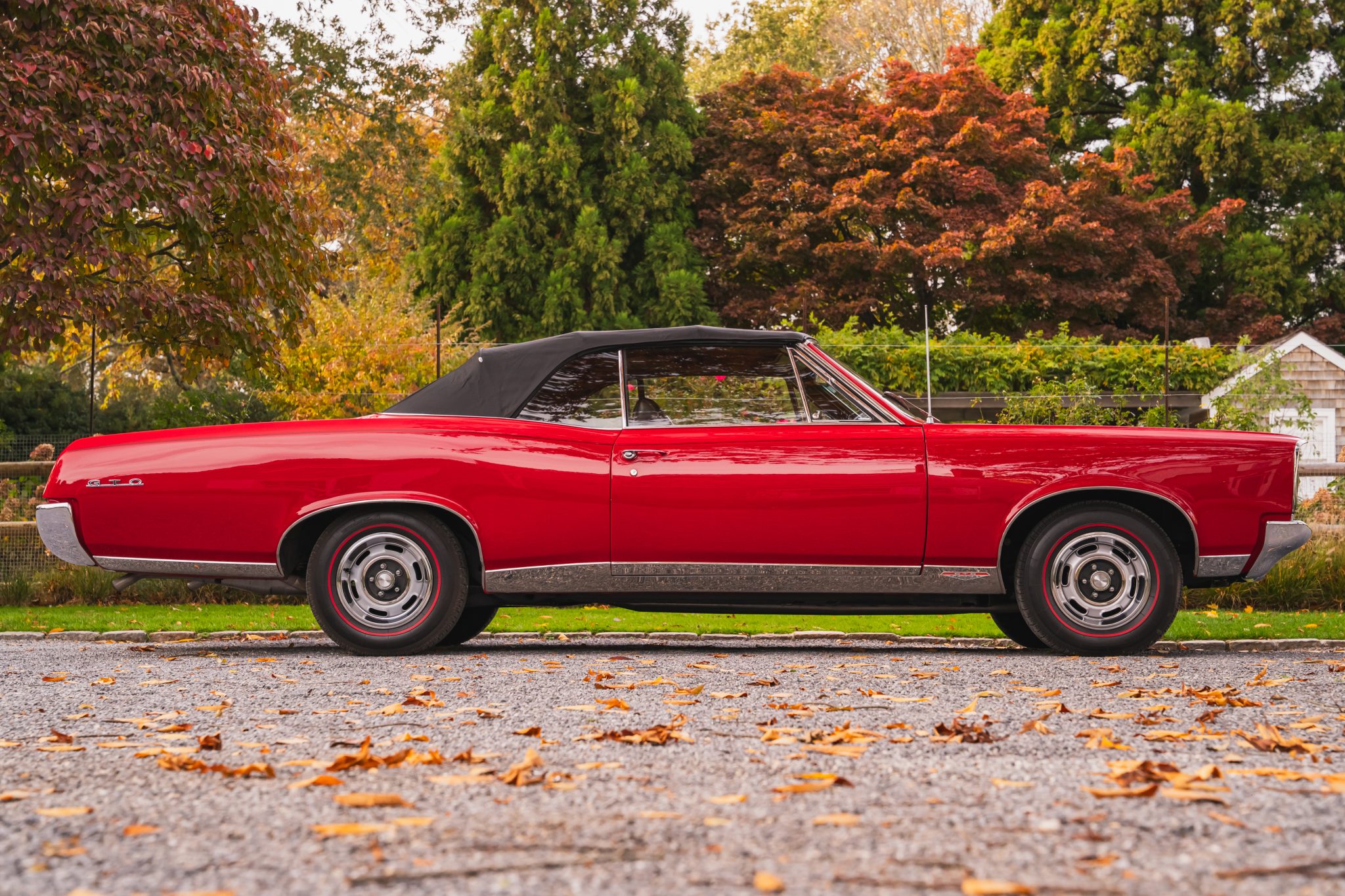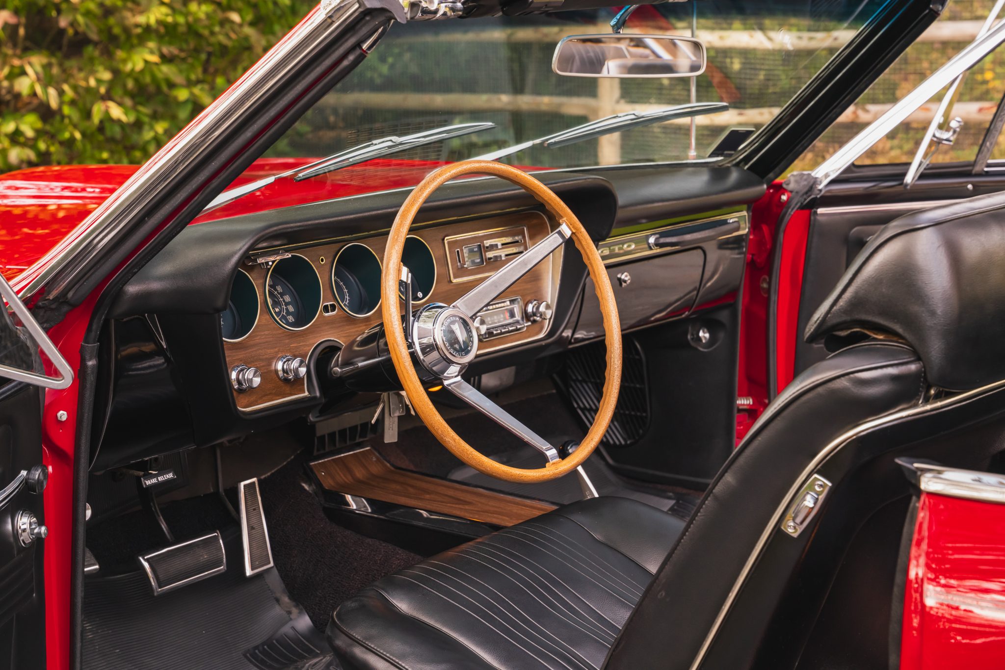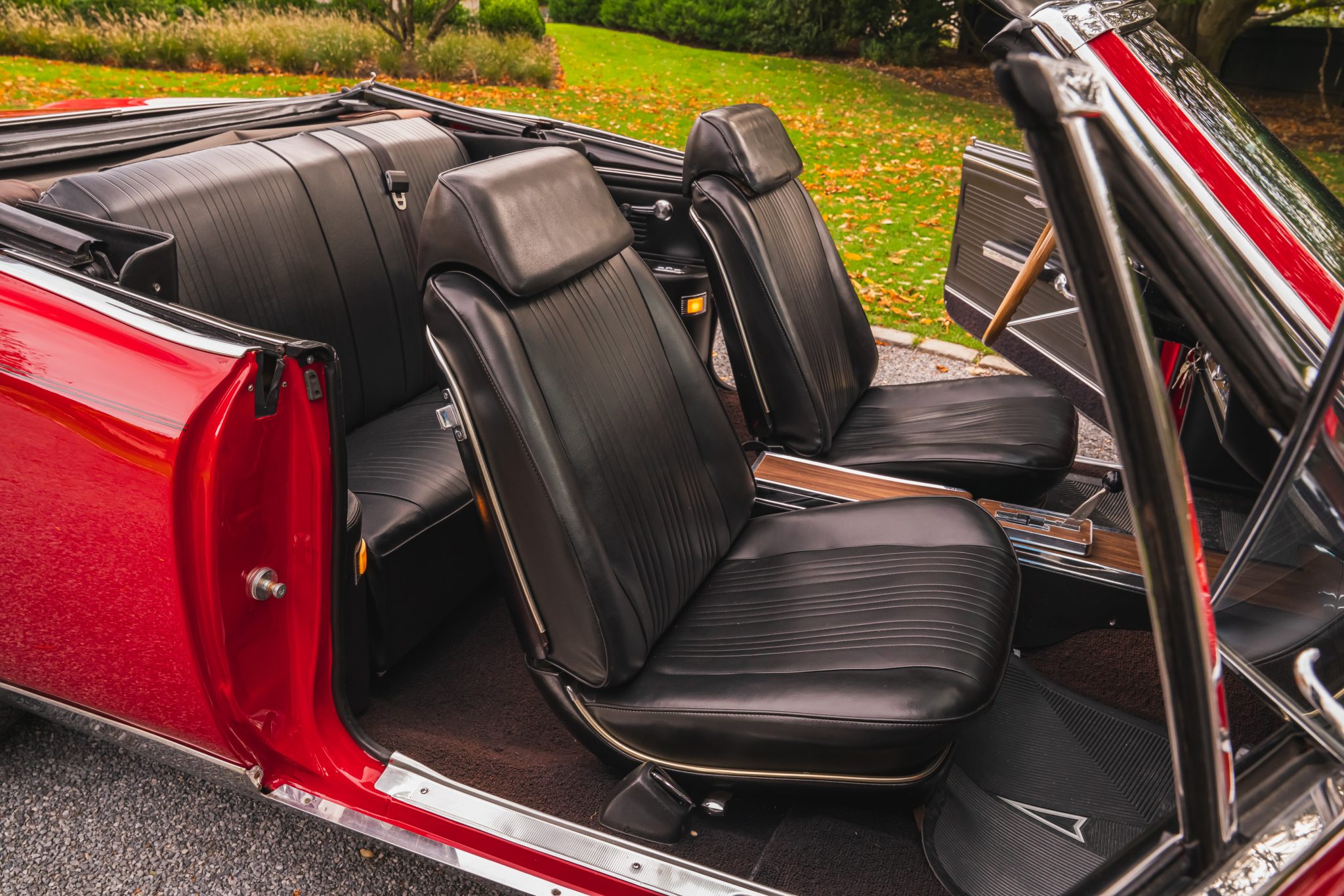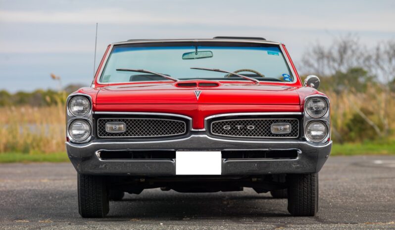 This 1967 Pontiac GTO convertible it is powered by a 400ci V8 paired with a three-speed automatic transmission. The car is finished in red with a black convertible top and boot cover, and equipment includes power-assisted steering and drum brakes along with painted 14″ Rally I wheels, Coker red-stripe tires, a Hurst shifter, a dual exhaust system, black vinyl front bucket seats, and a push-button AM/FM radio.