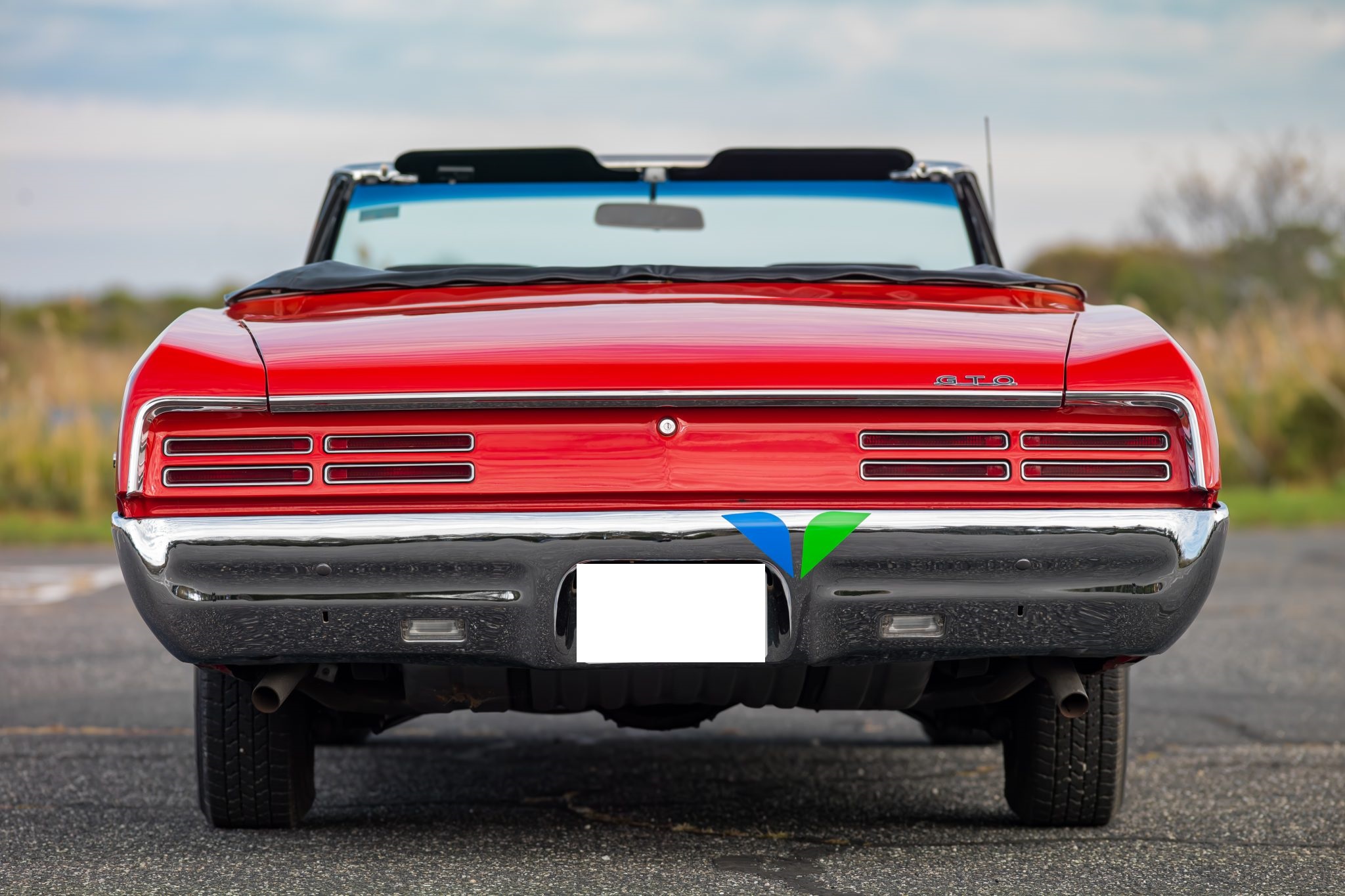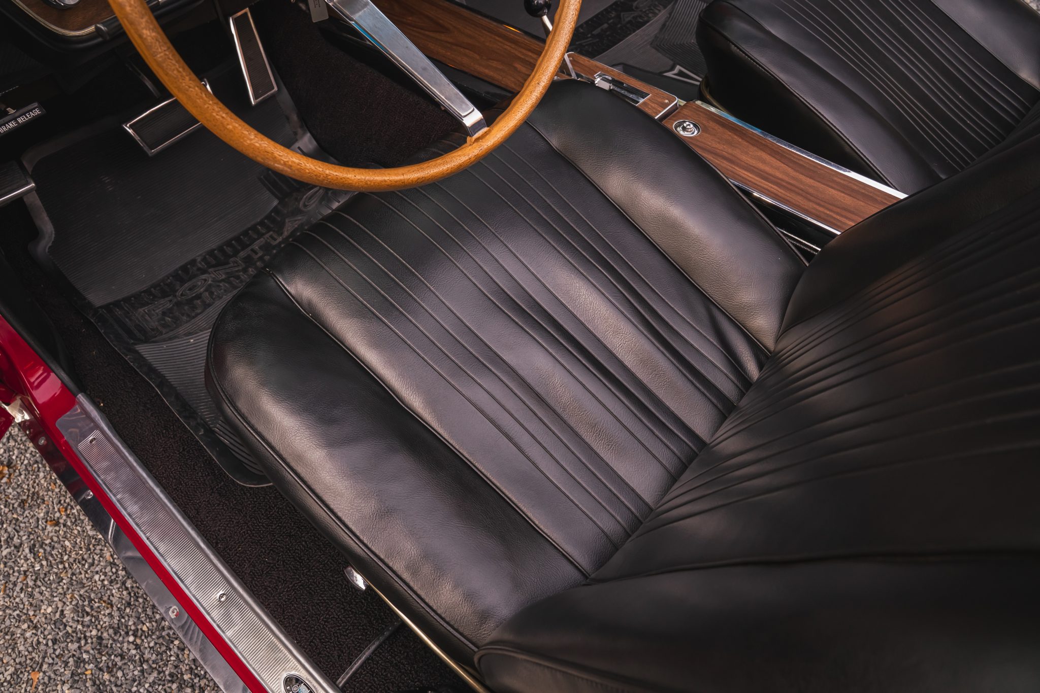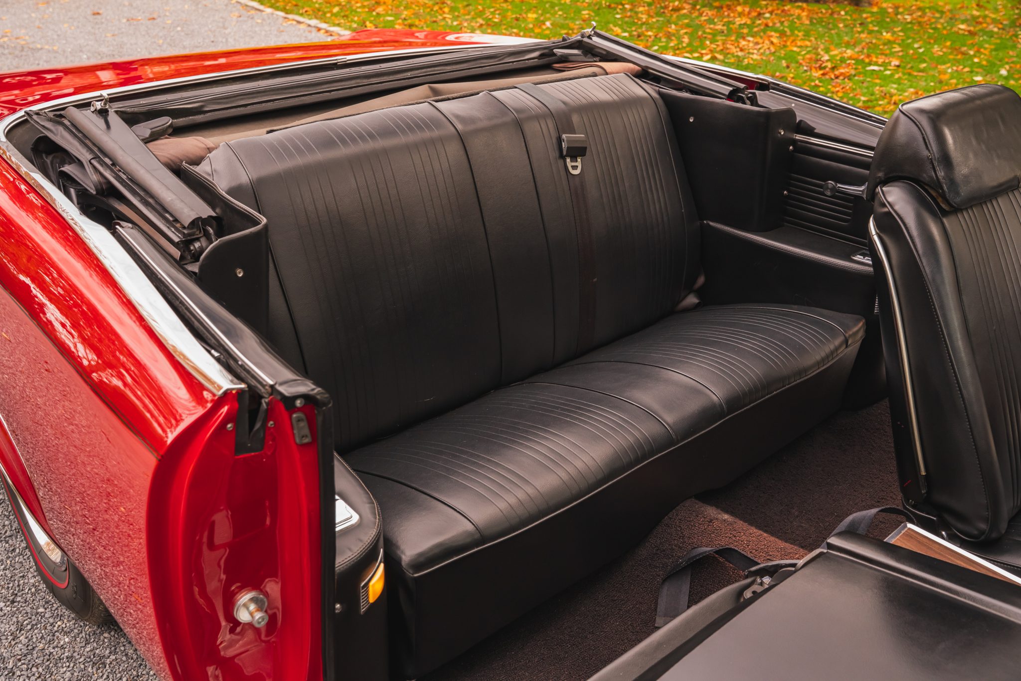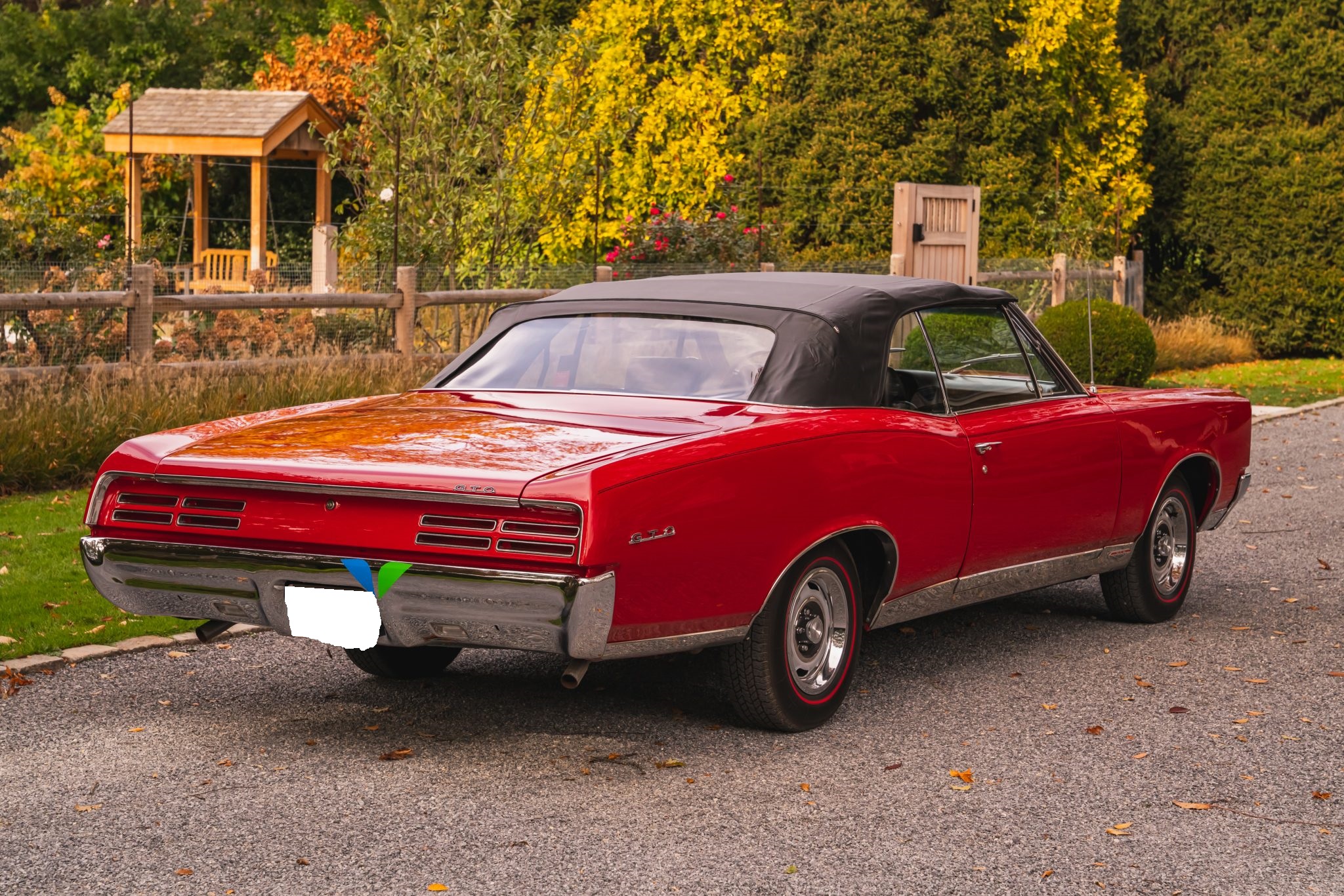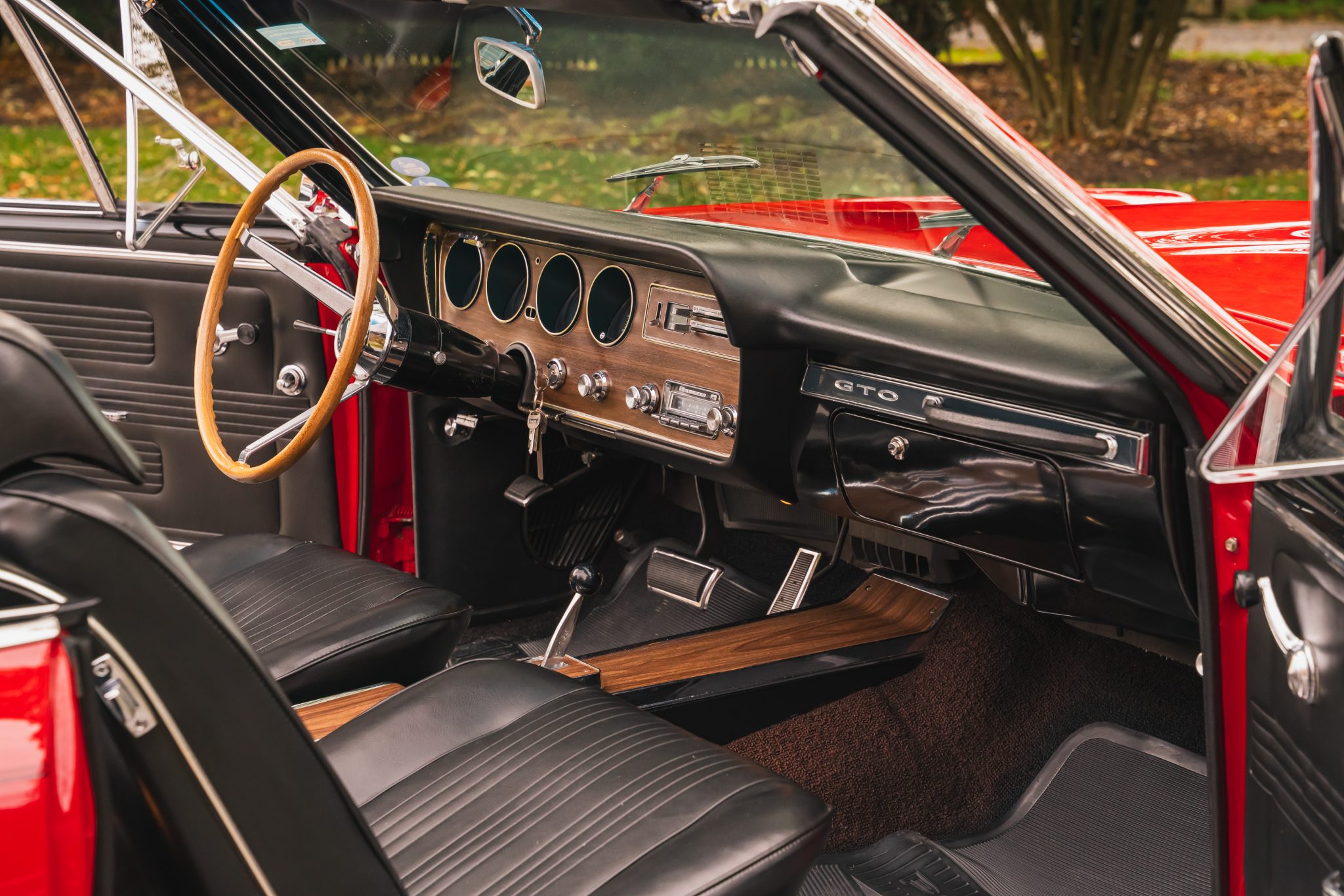 This 1967 Pontiac GTO convertible it is powered by a 400ci V8 paired with a three-speed automatic transmission. The car is finished in red with a black convertible top and boot cover, and equipment includes power-assisted steering and drum brakes along with painted 14″ Rally I wheels, Coker red-stripe tires, a Hurst shifter, a dual exhaust system, black vinyl front bucket seats, and a push-button AM/FM radio.