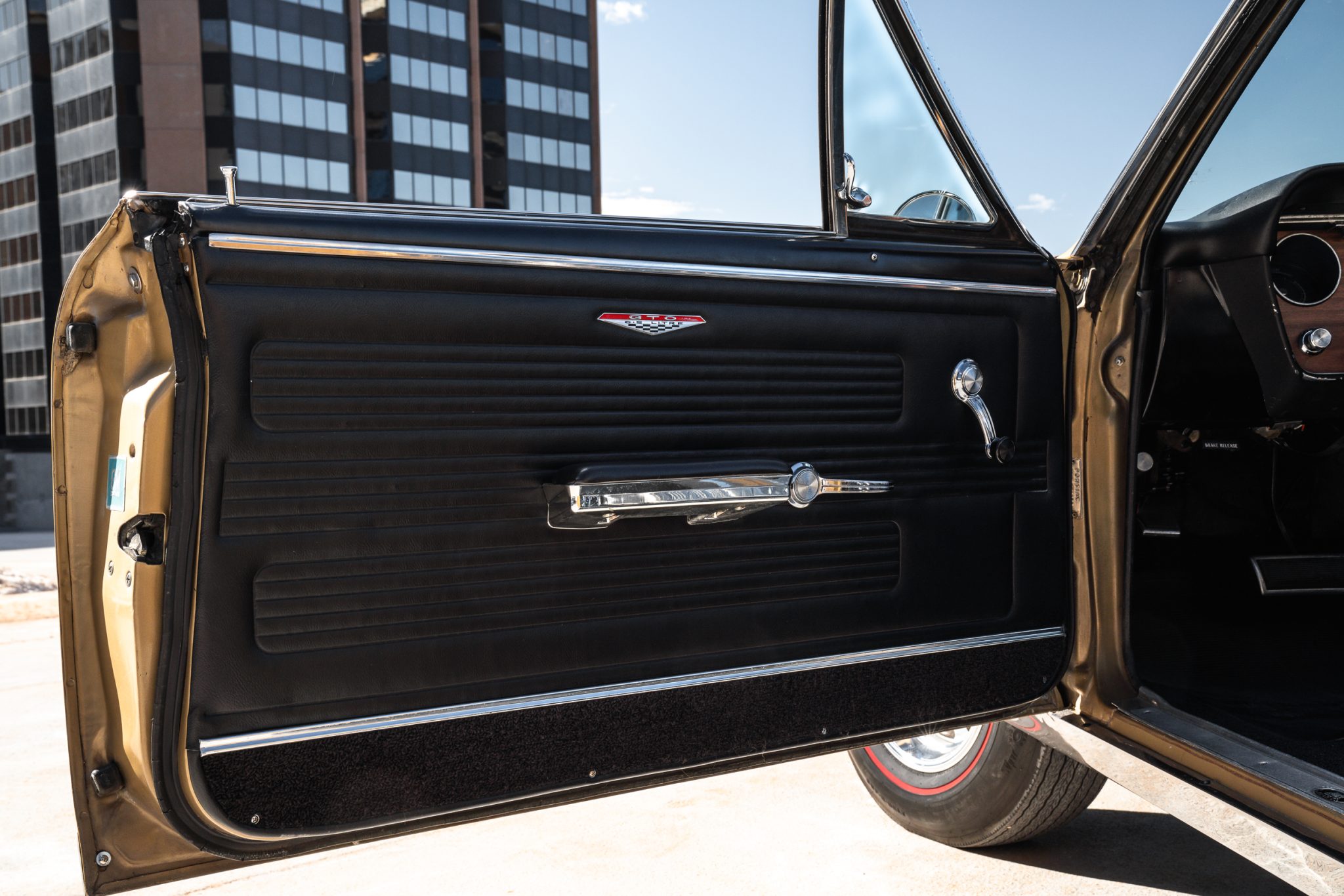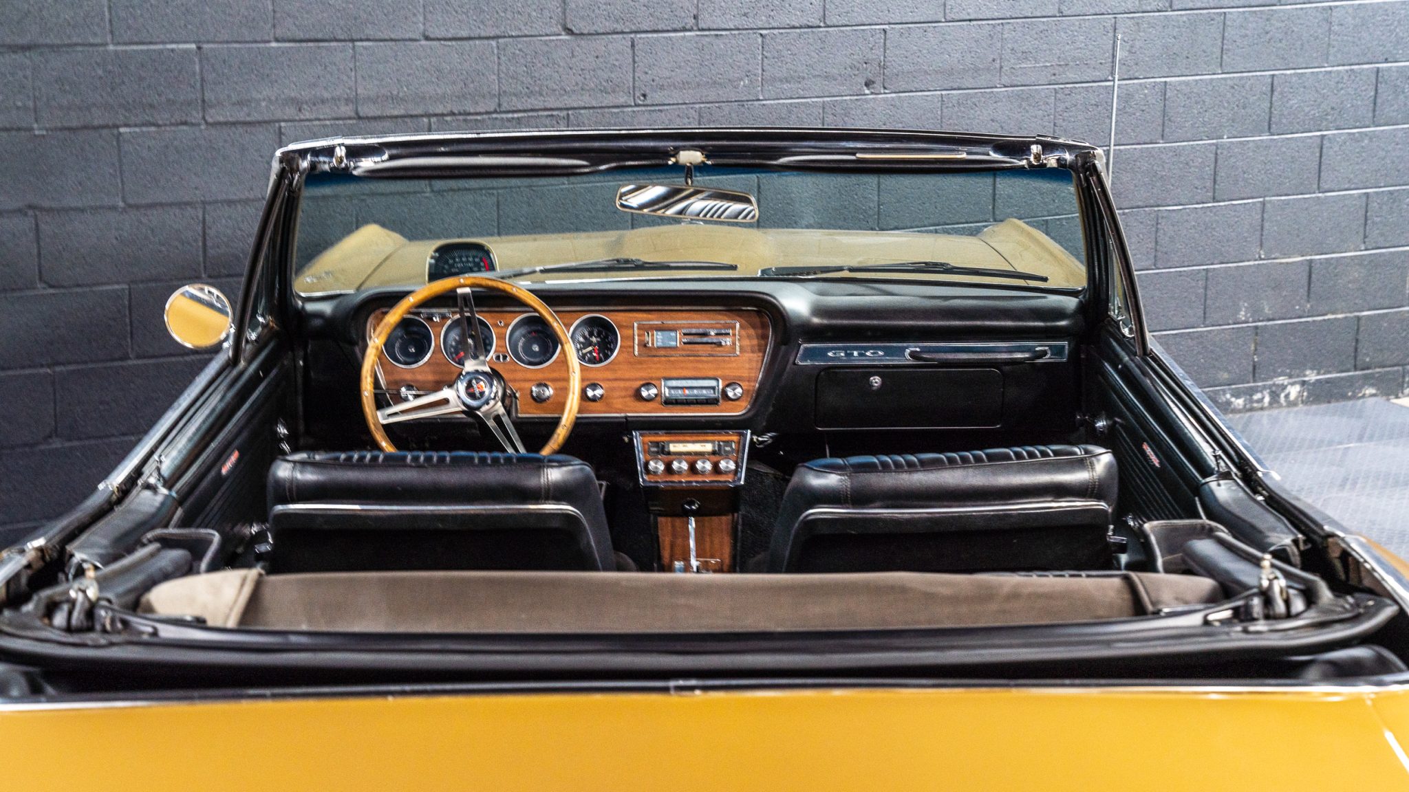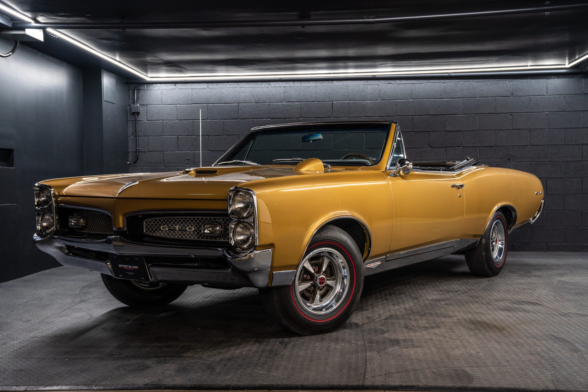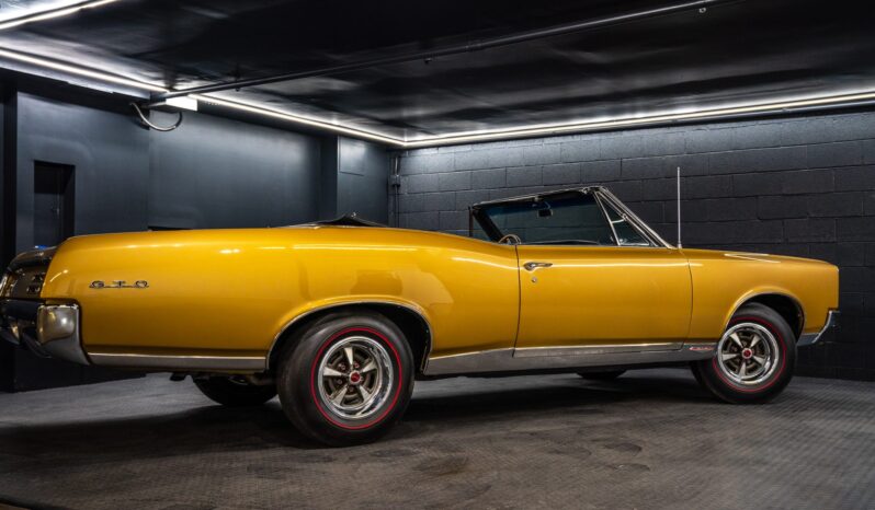 This 1967 Pontiac GTO convertible is powered by a 400ci V8 paired with a three-speed automatic transmission and is finished in gold over black vinyl. Equipment includes Holley Sniper fuel injection, an aluminum radiator, a black soft top, power-assisted front disc brakes, power steering, 14″ Rally II wheels with chrome trim rings, and a Hurst shifter.