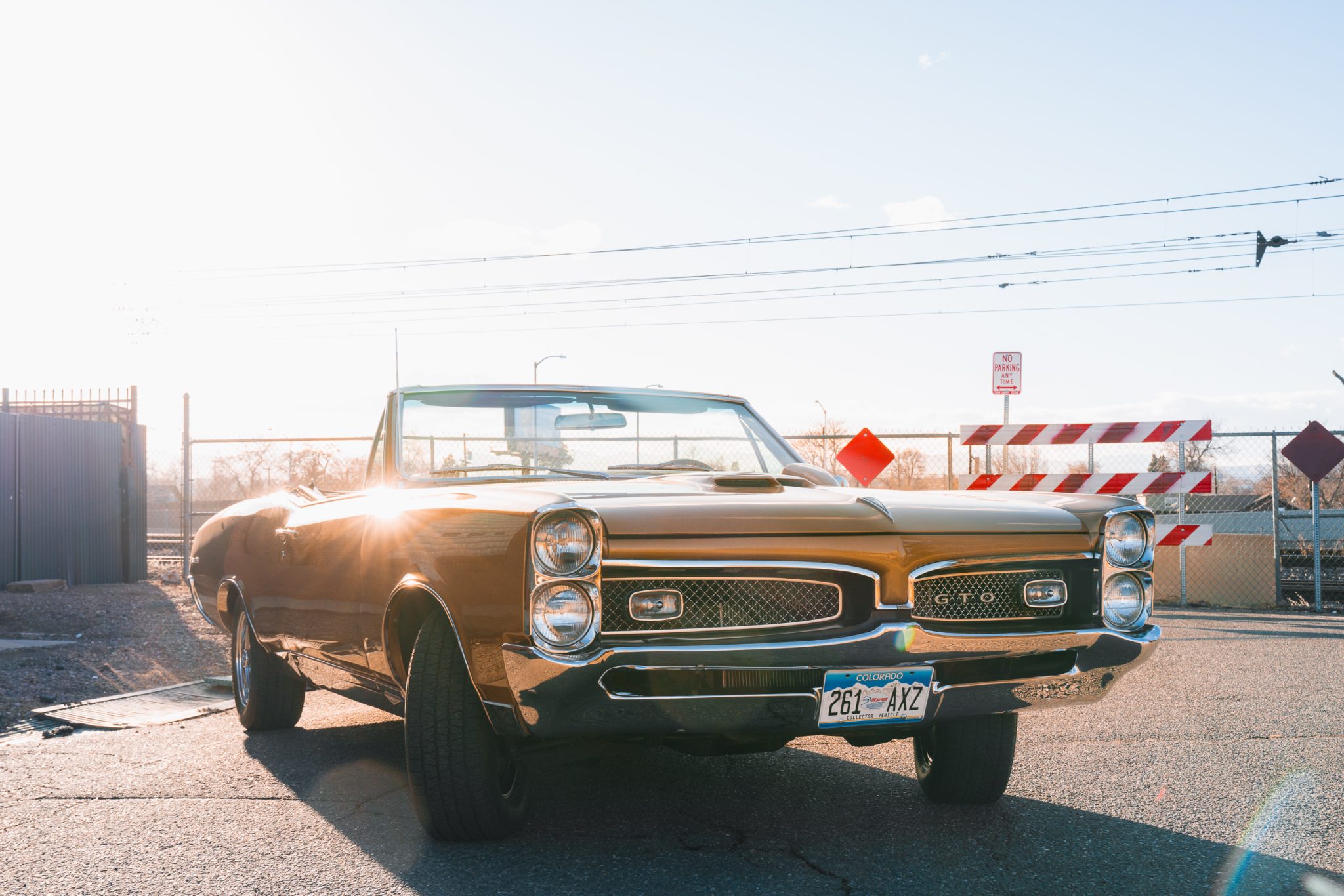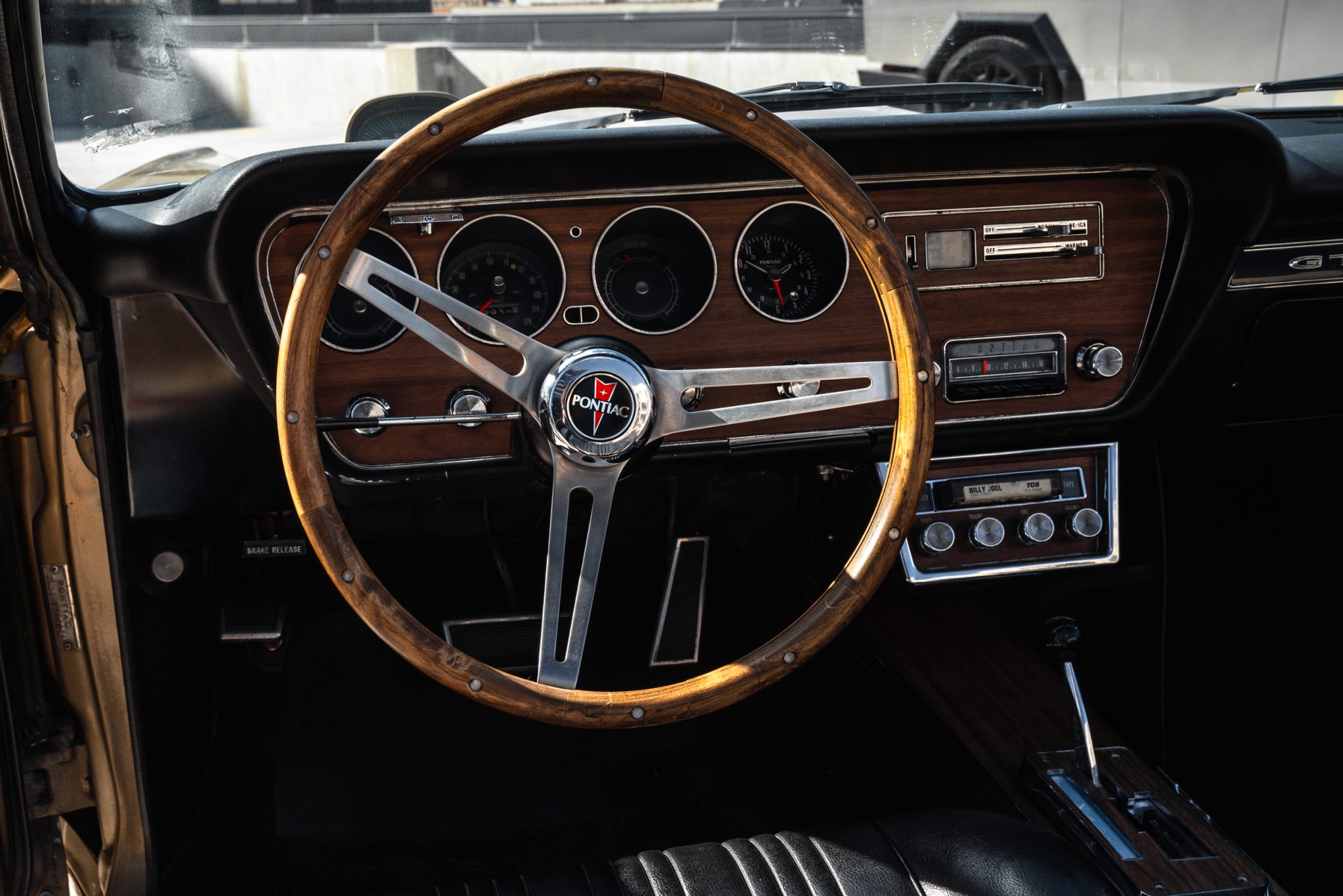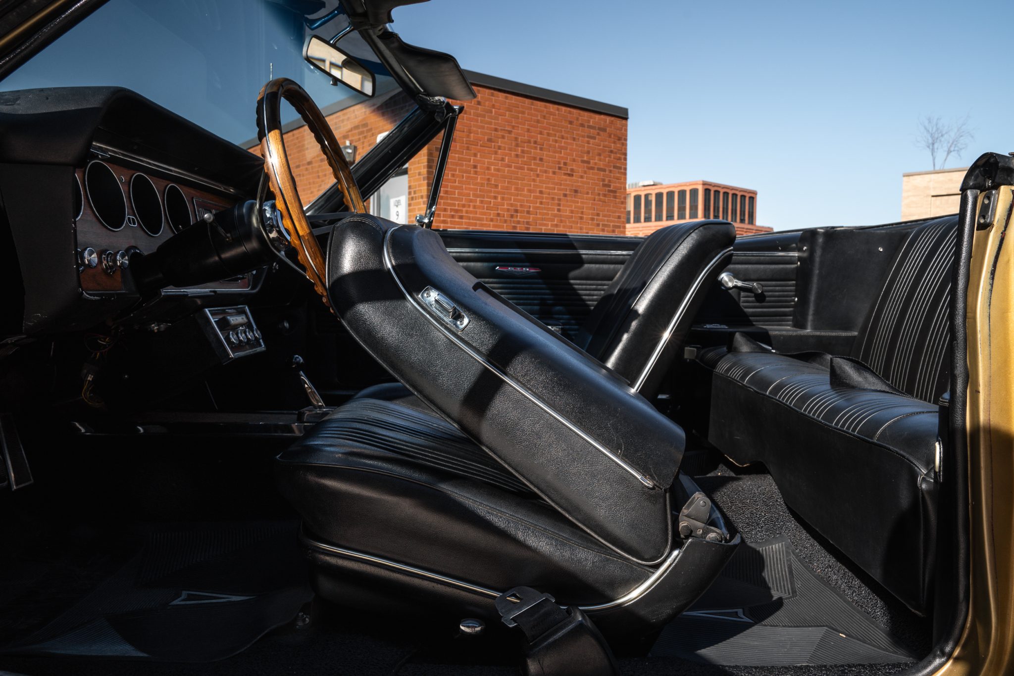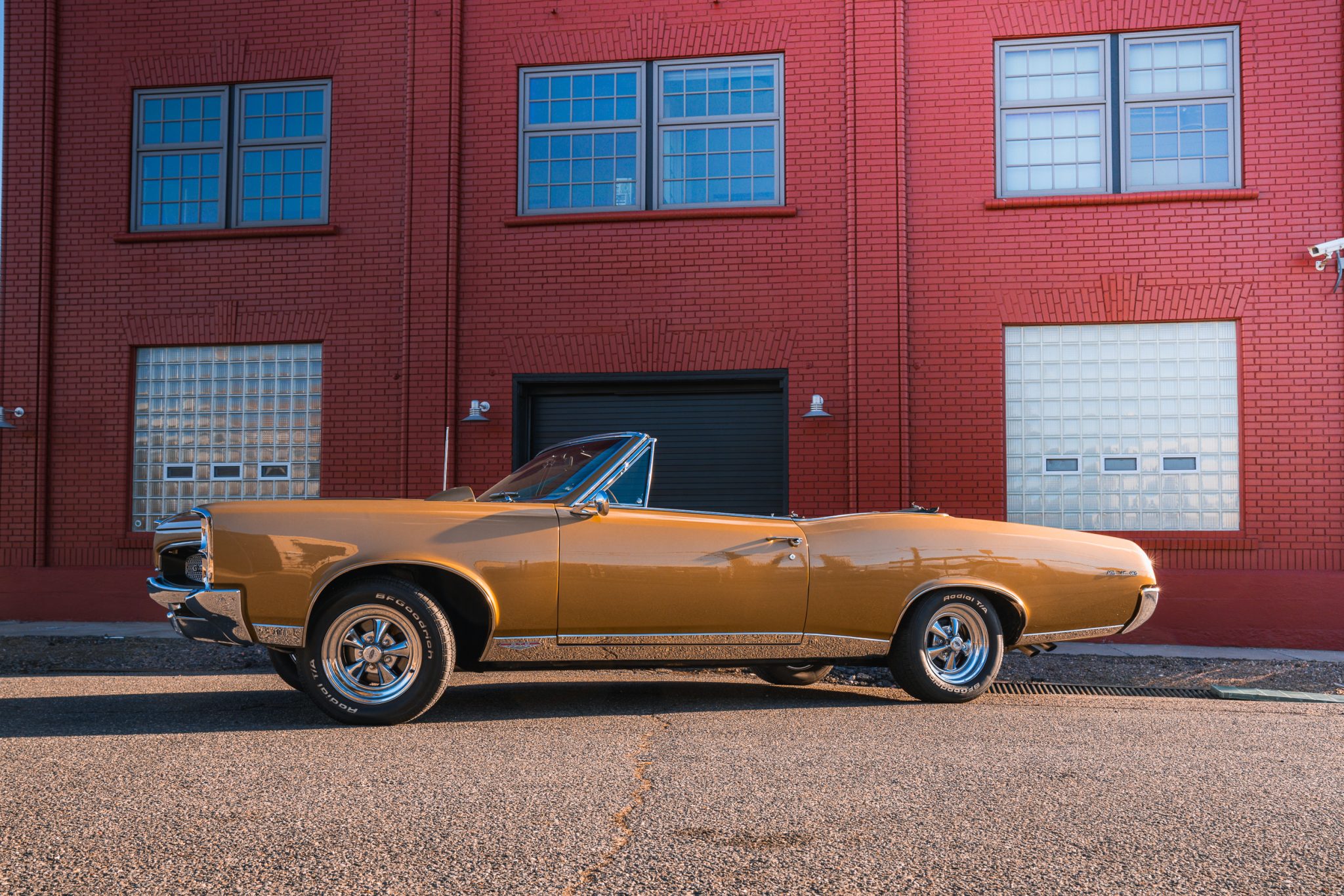 This 1967 Pontiac GTO convertible is powered by a 400ci V8 paired with a three-speed automatic transmission and is finished in gold over black vinyl. Equipment includes Holley Sniper fuel injection, an aluminum radiator, a black soft top, power-assisted front disc brakes, power steering, 14″ Rally II wheels with chrome trim rings, and a Hurst shifter.