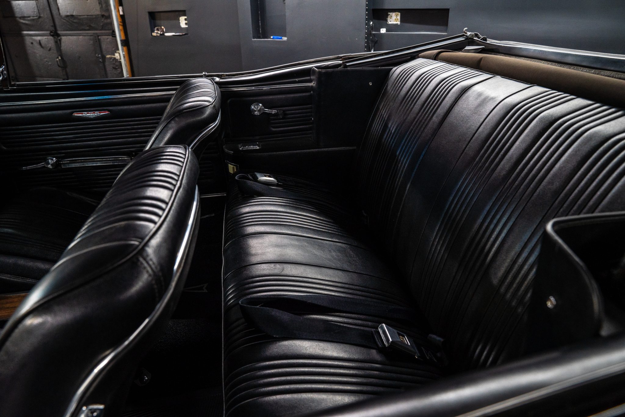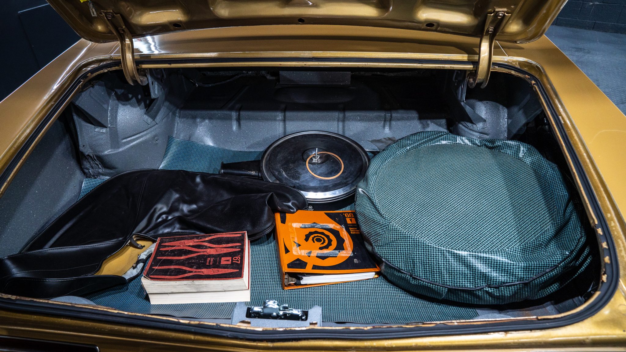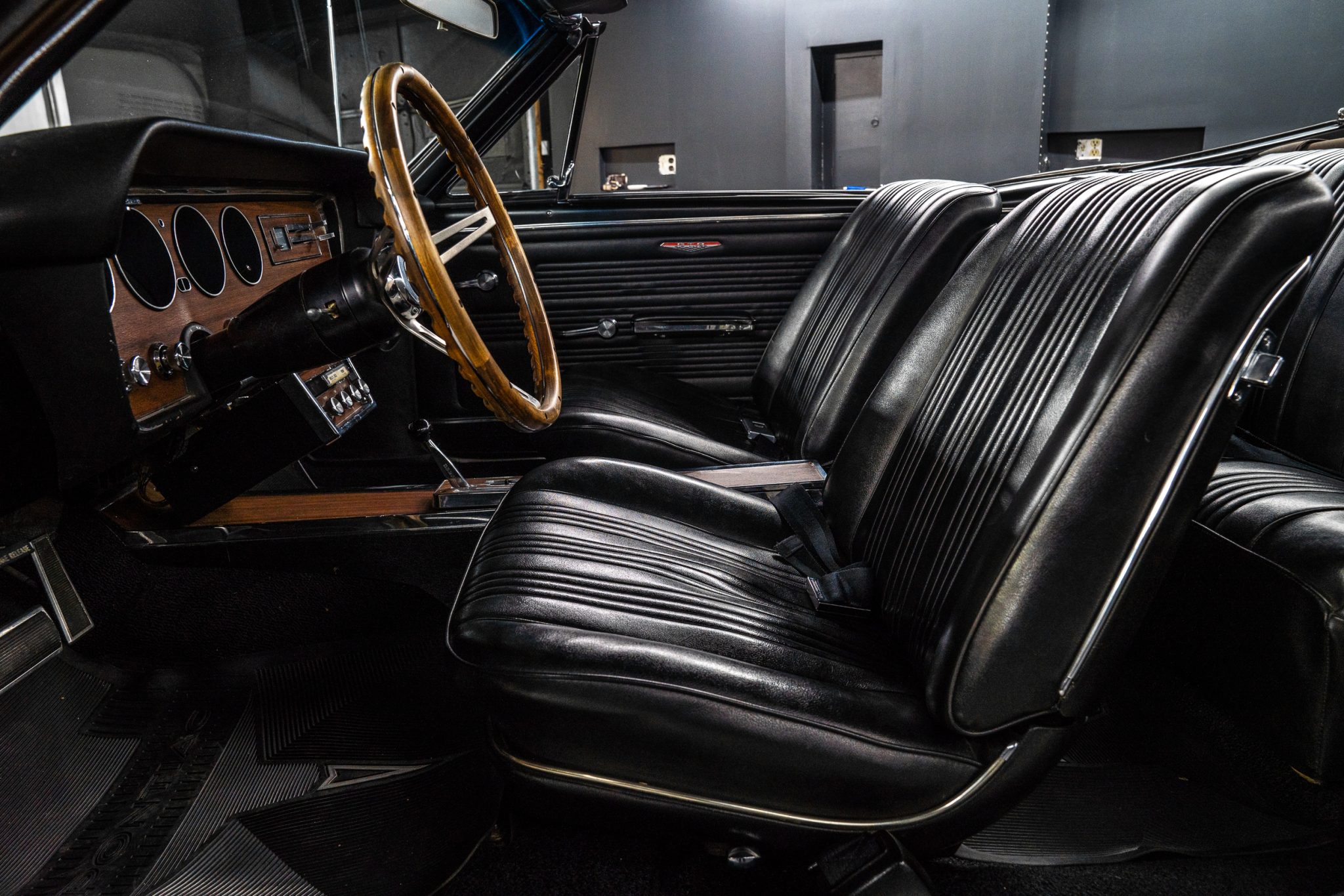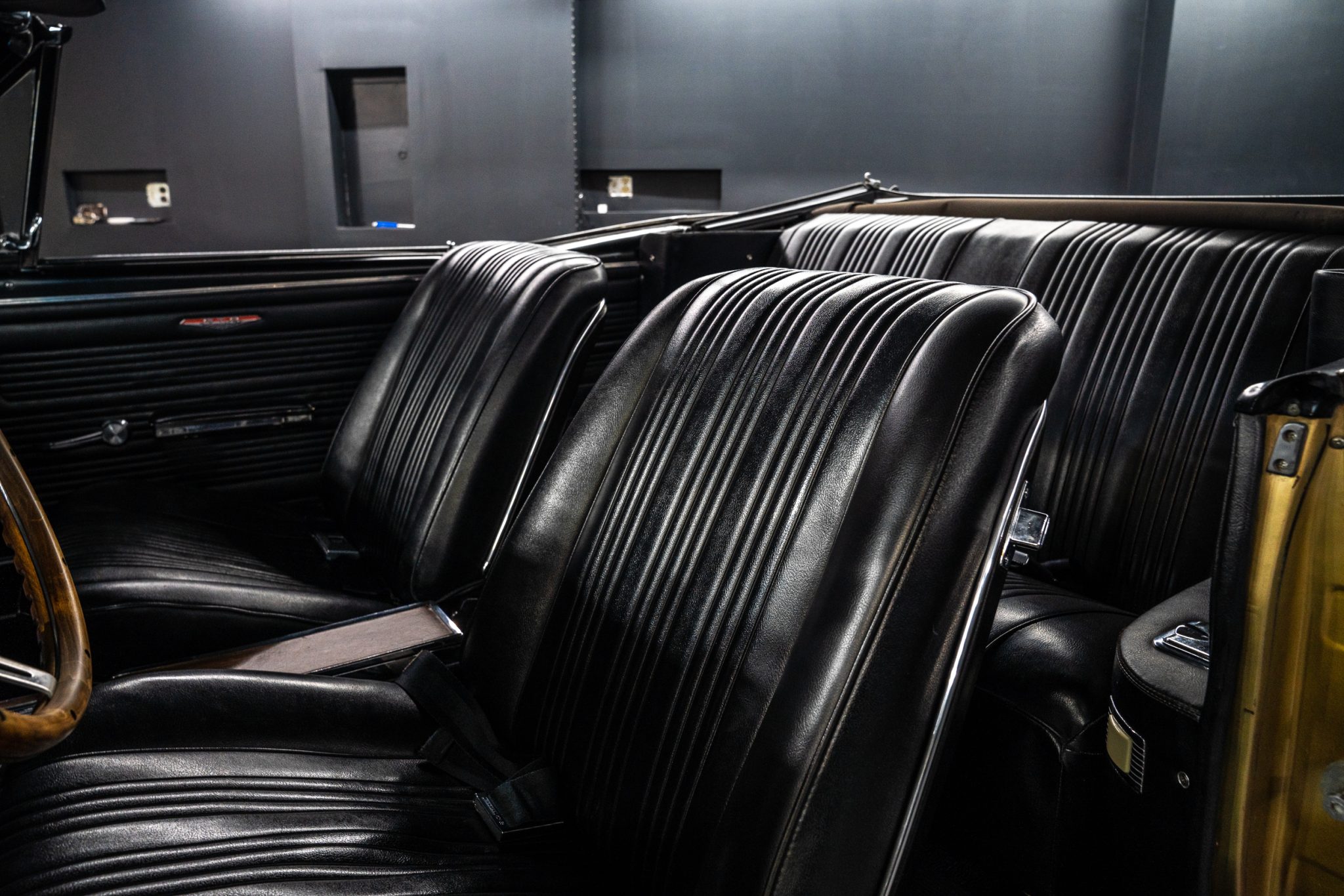 This 1967 Pontiac GTO convertible is powered by a 400ci V8 paired with a three-speed automatic transmission and is finished in gold over black vinyl. Equipment includes Holley Sniper fuel injection, an aluminum radiator, a black soft top, power-assisted front disc brakes, power steering, 14″ Rally II wheels with chrome trim rings, and a Hurst shifter.