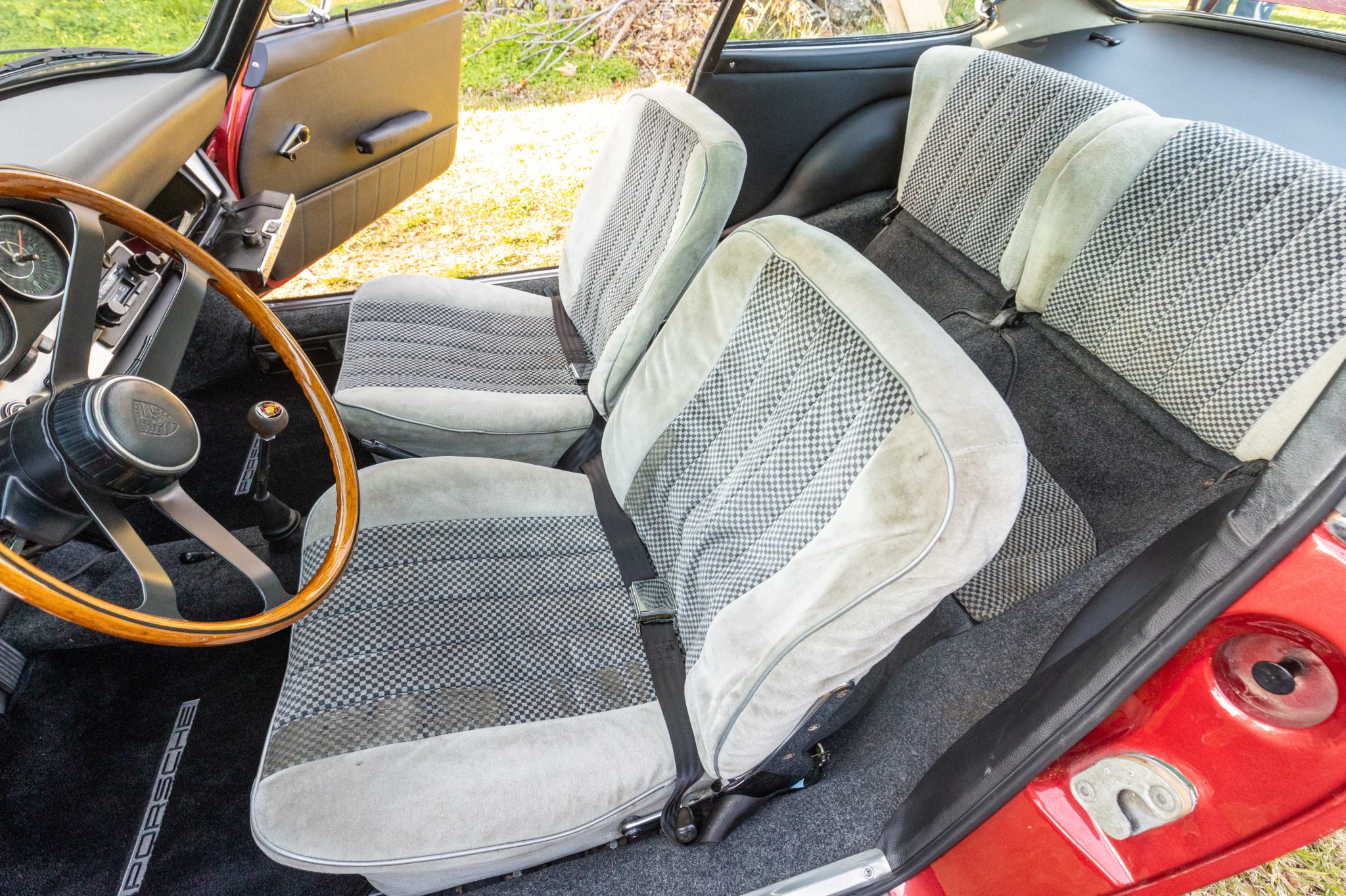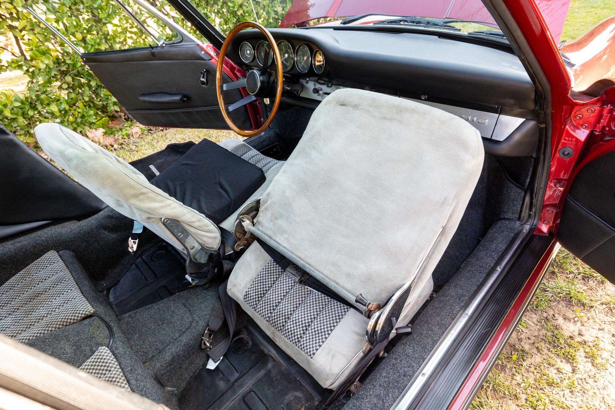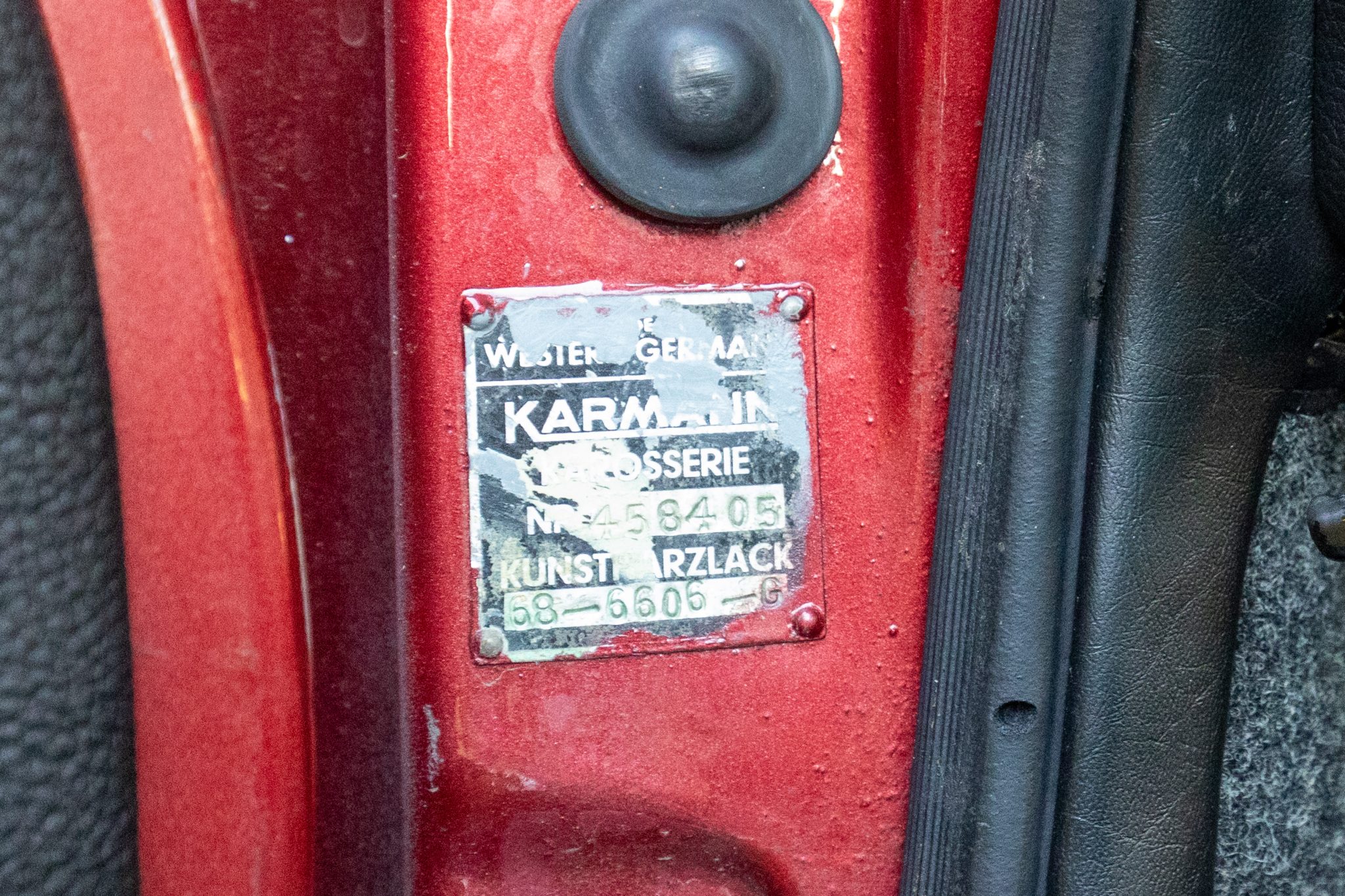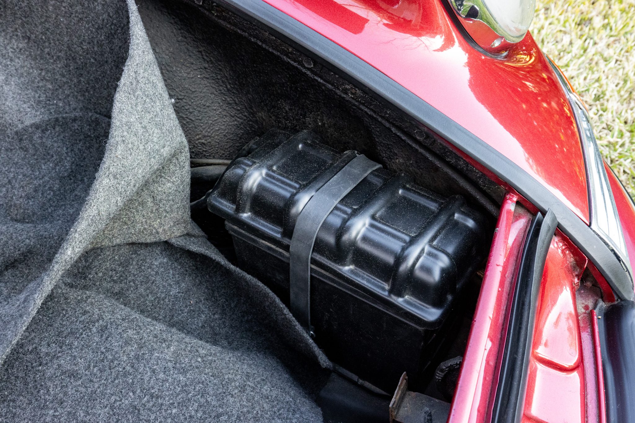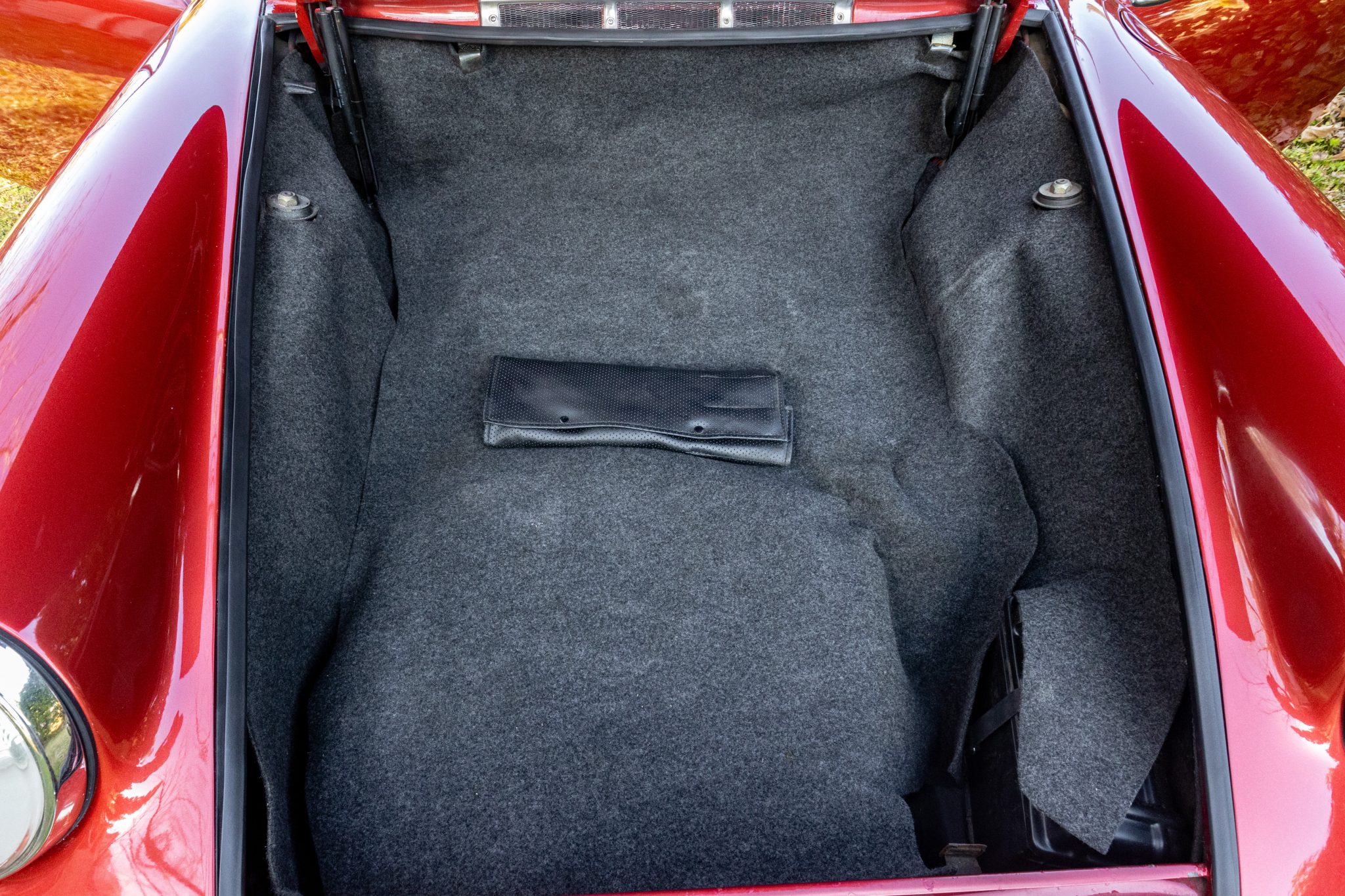 Between 2009 and 2017 the car was refurbished, which included repainting the body metallic red, refreshing the interior, overhauling the brakes, and mounting Continental tires on the chrome 15″ wheels. In 2025 the seller had the engine rebuilt with 1.8-liter pistons and cylinders, overhauled heads, and replacement carburetors.