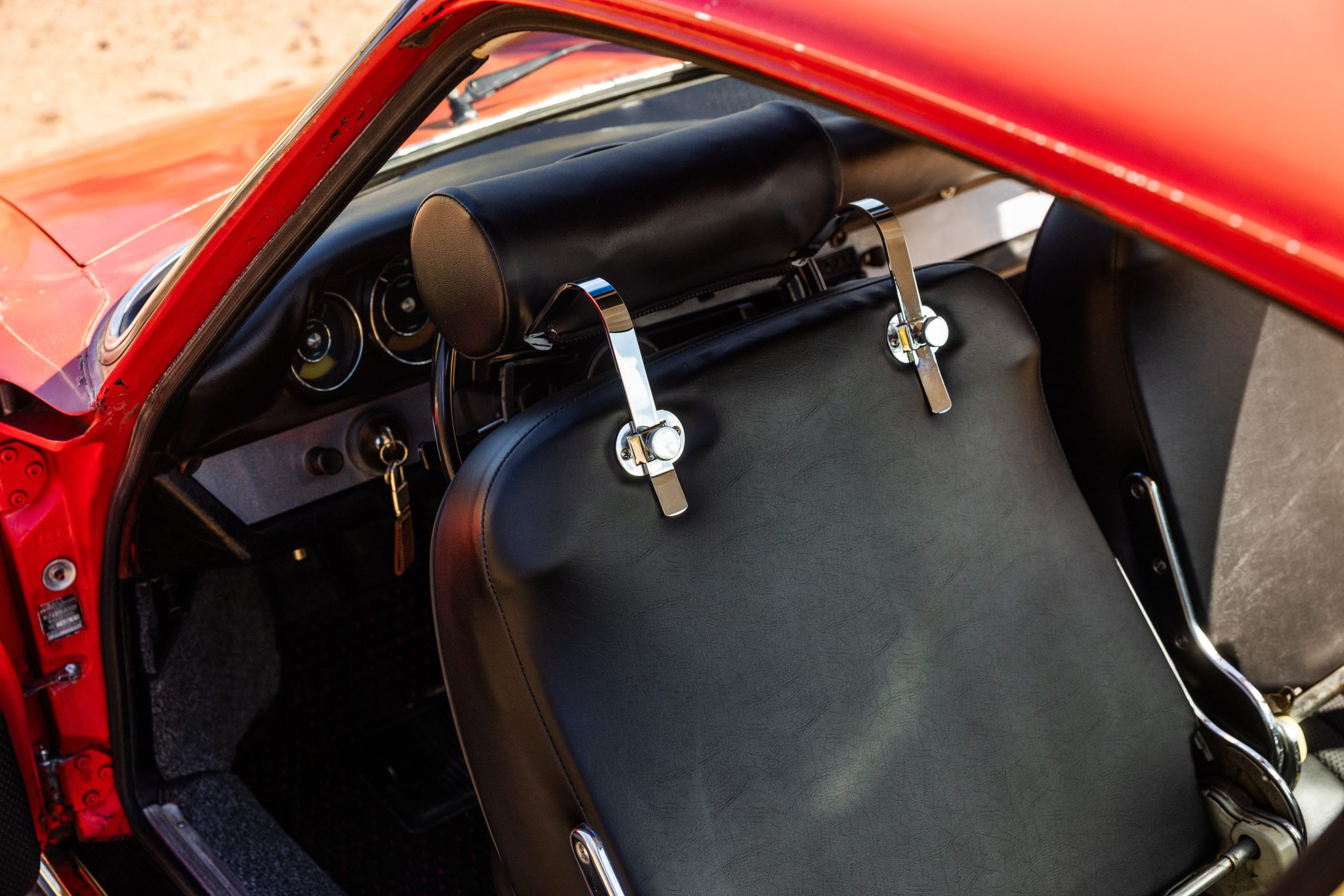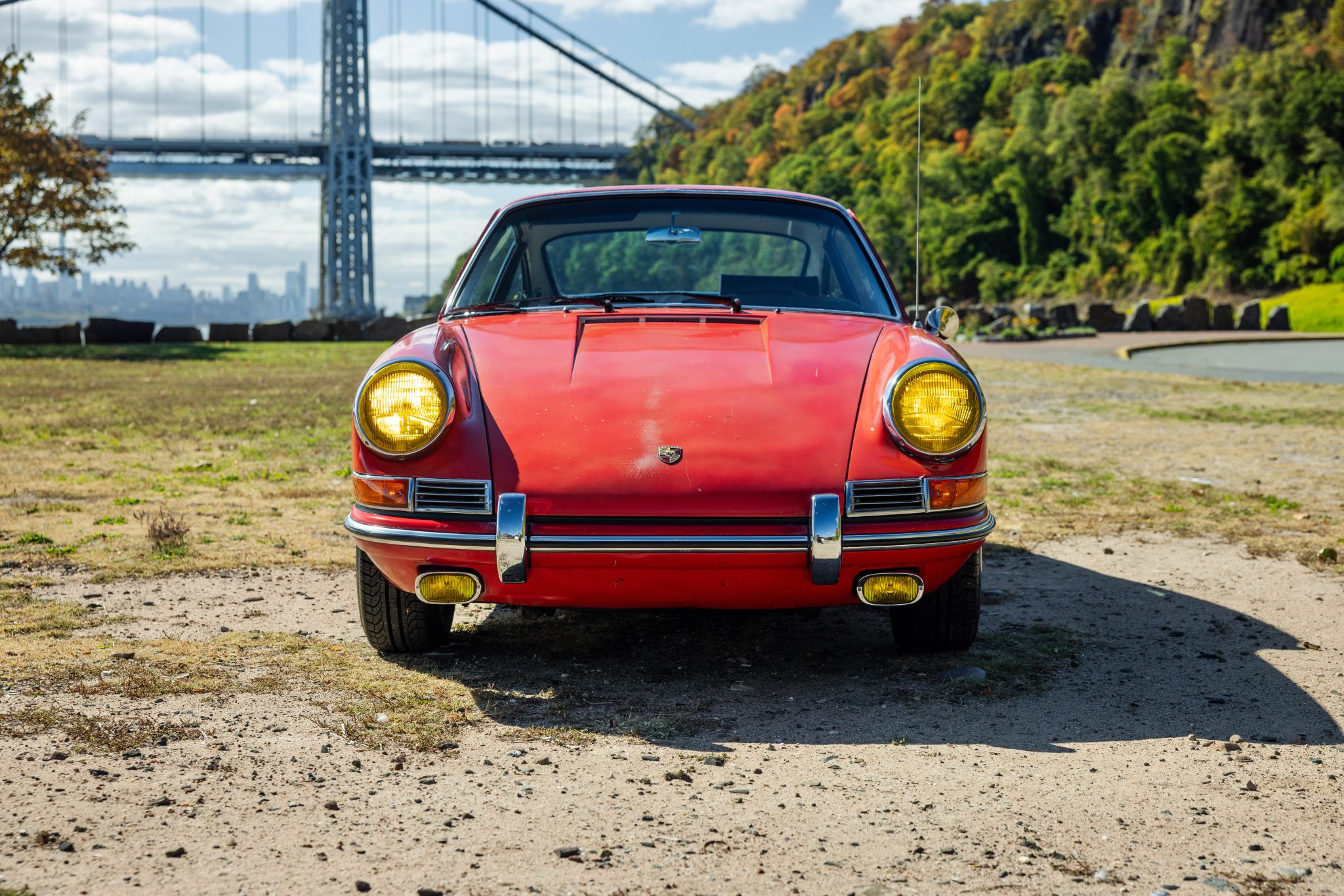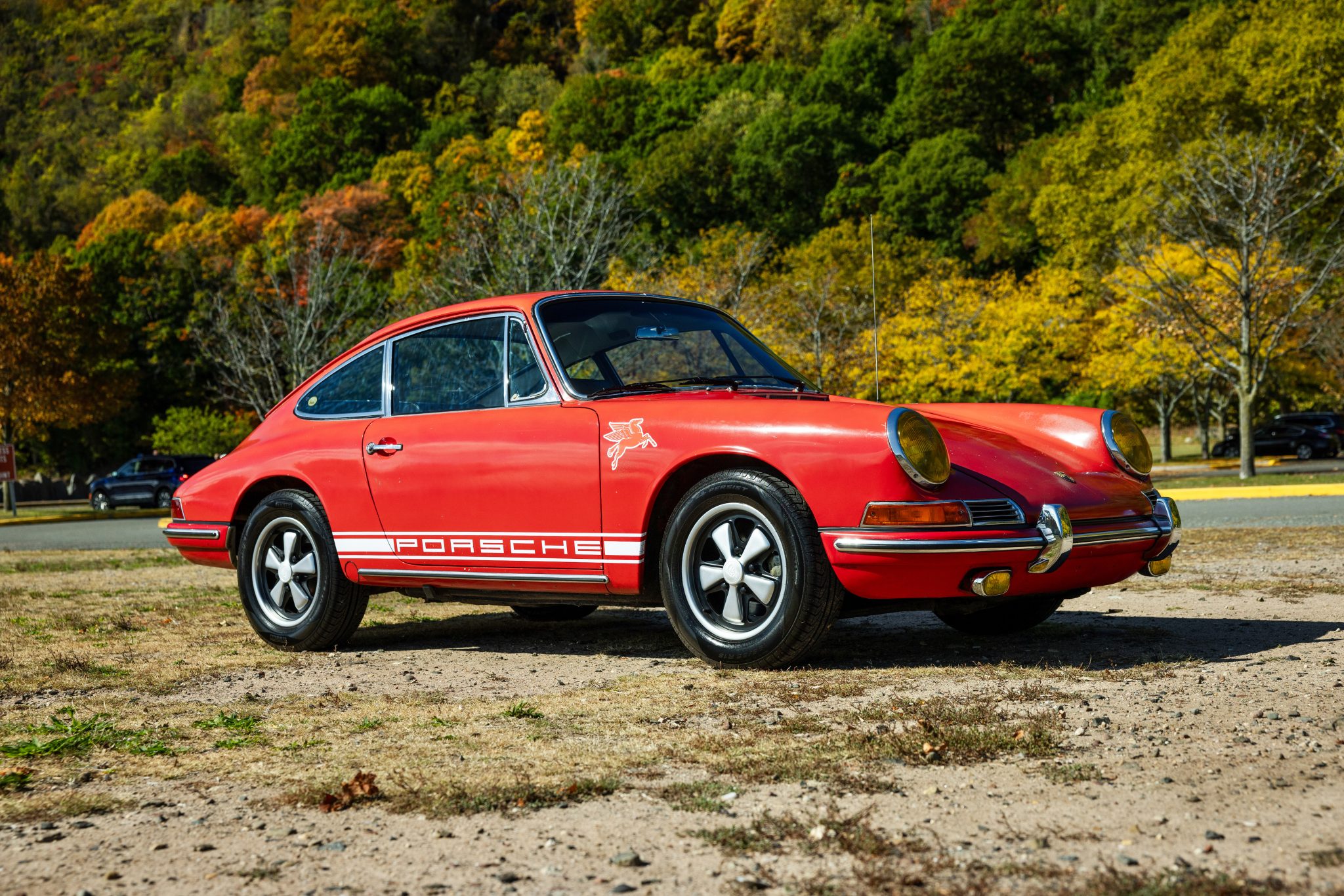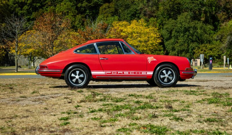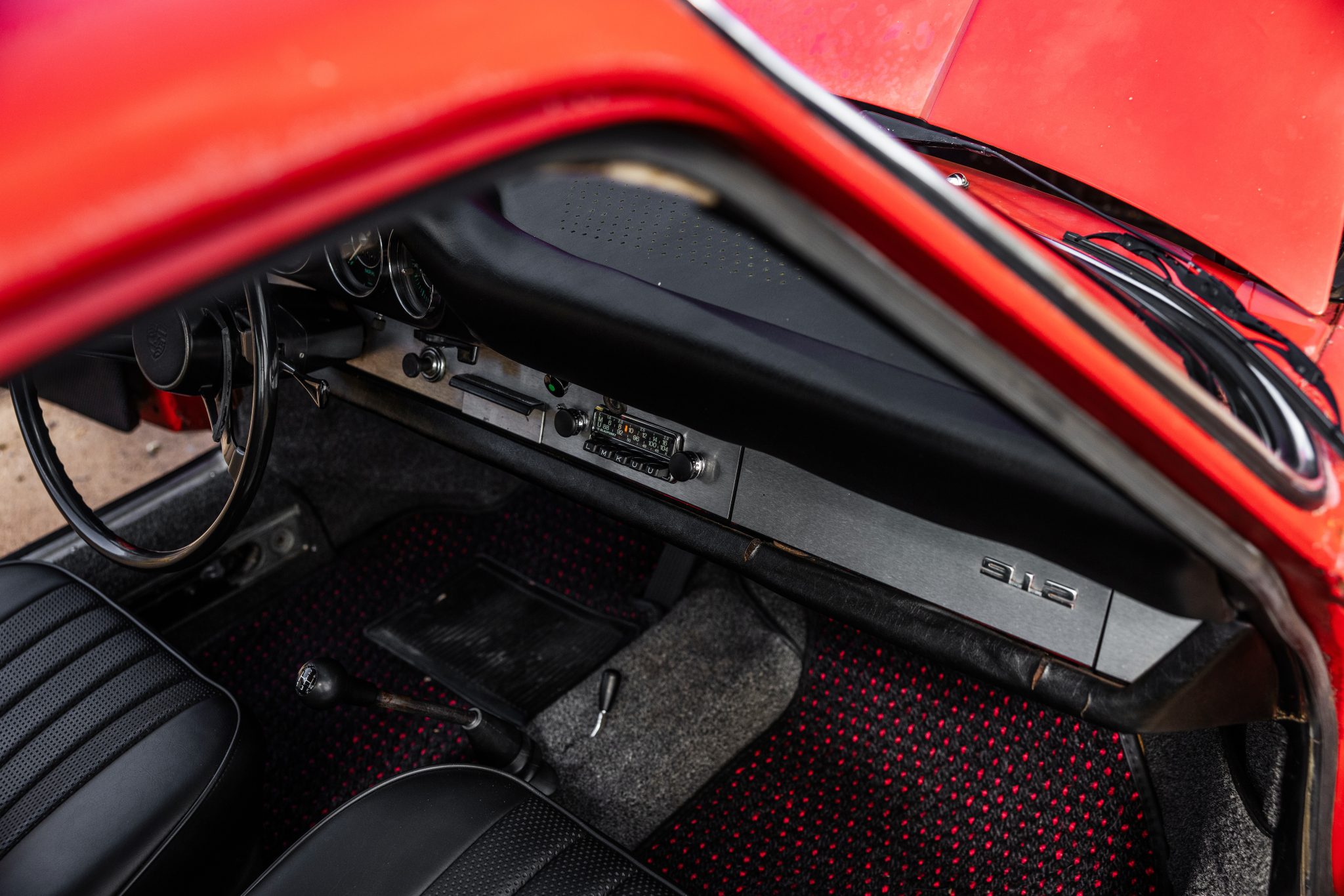 This 1967 Porsche 912 coupe is powered by a 1.6-liter flat-four paired with a five-speed manual transaxle and is finished in Polo Red over black leatherette. Equipment includes 15″ Fuchs-style wheels, four-wheel disc brakes, fog lights, and an AM/FM radio