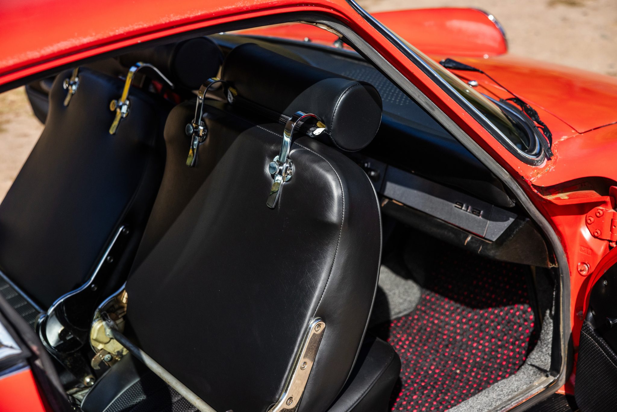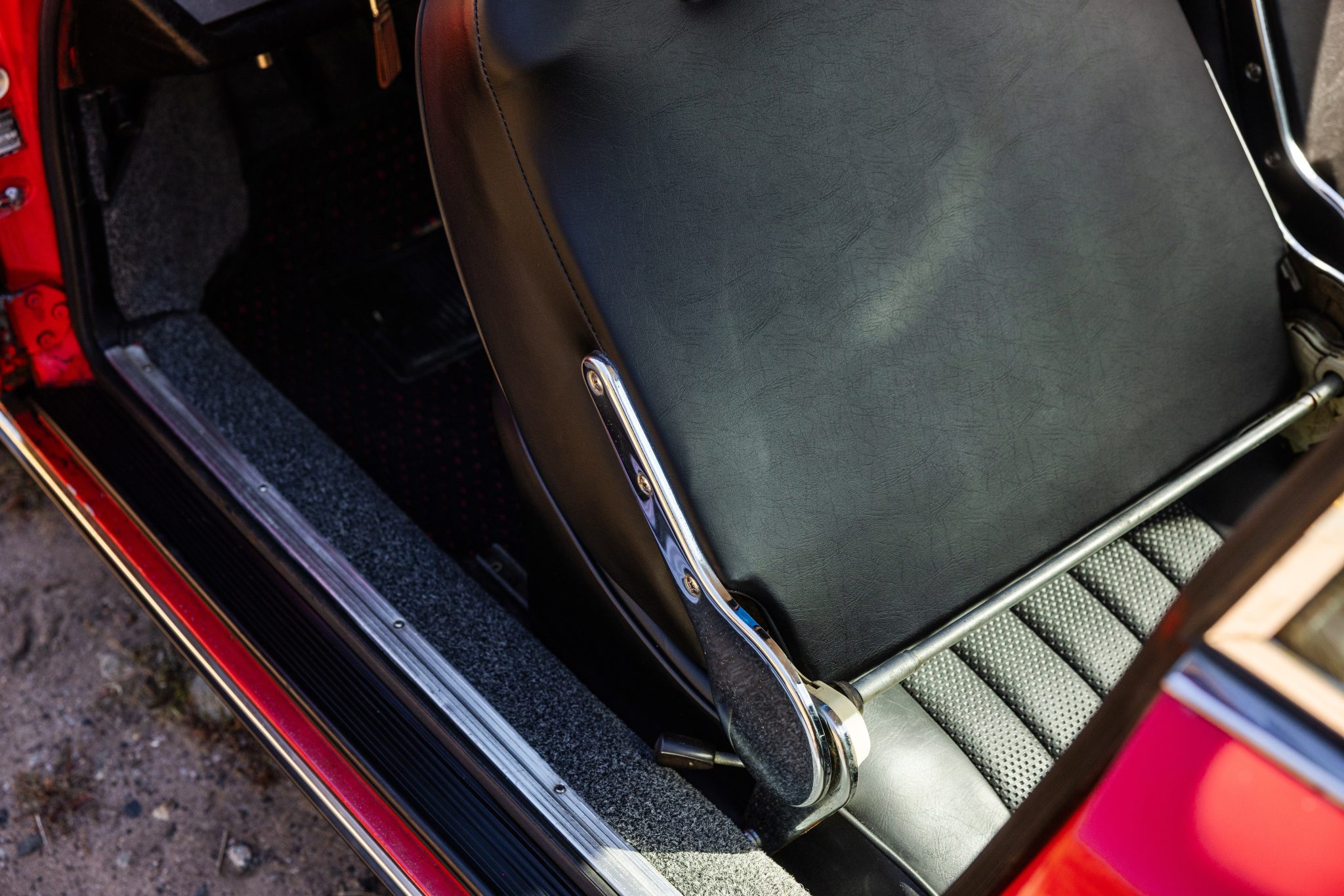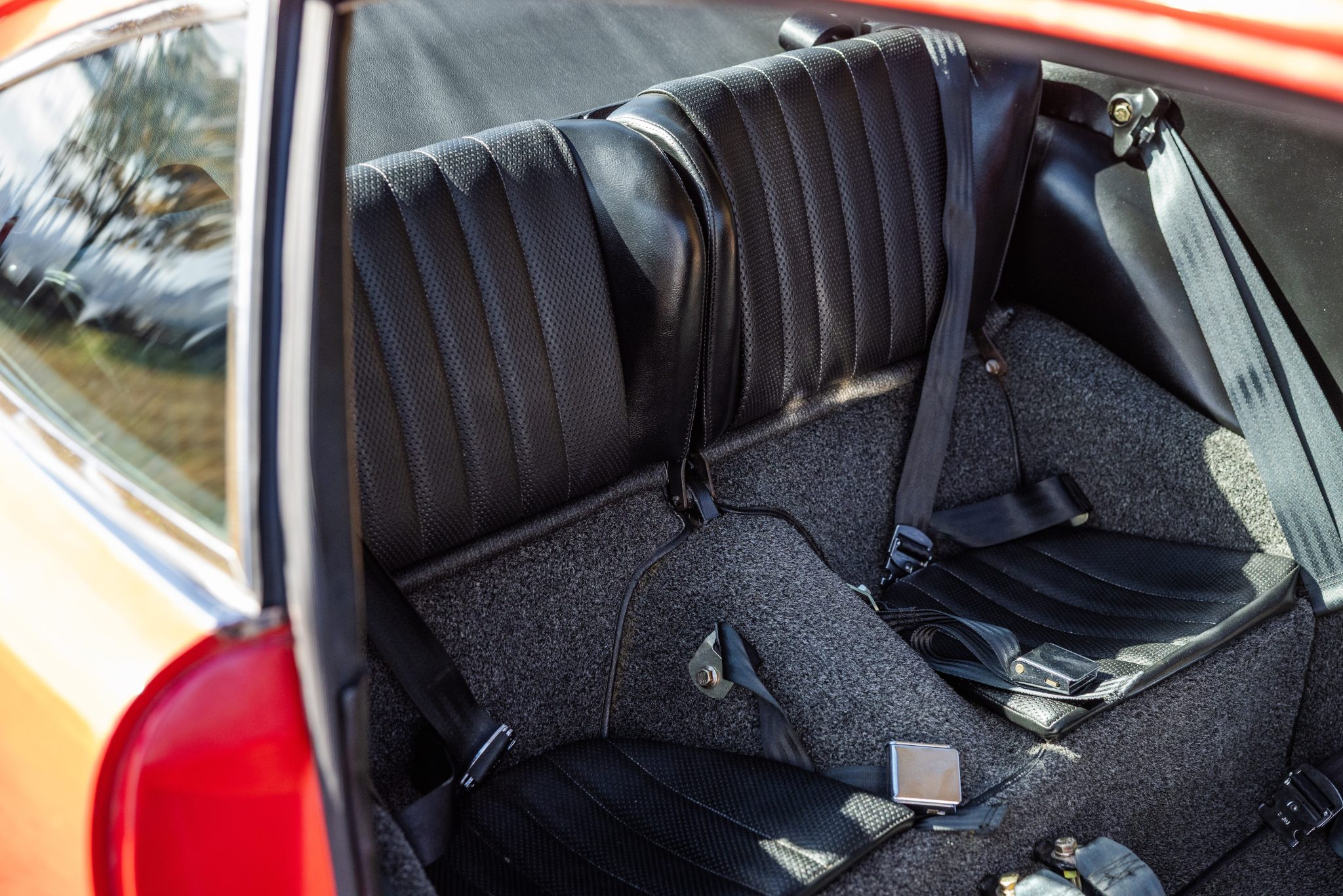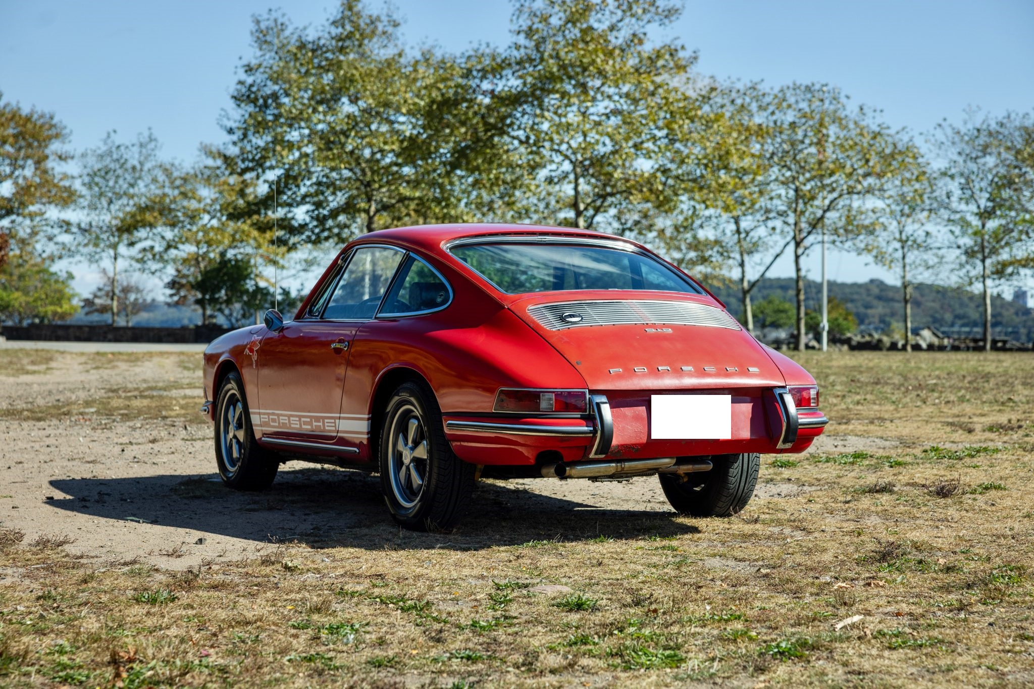 This 1967 Porsche 912 coupe is powered by a 1.6-liter flat-four paired with a five-speed manual transaxle and is finished in Polo Red over black leatherette. Equipment includes 15″ Fuchs-style wheels, four-wheel disc brakes, fog lights, and an AM/FM radio