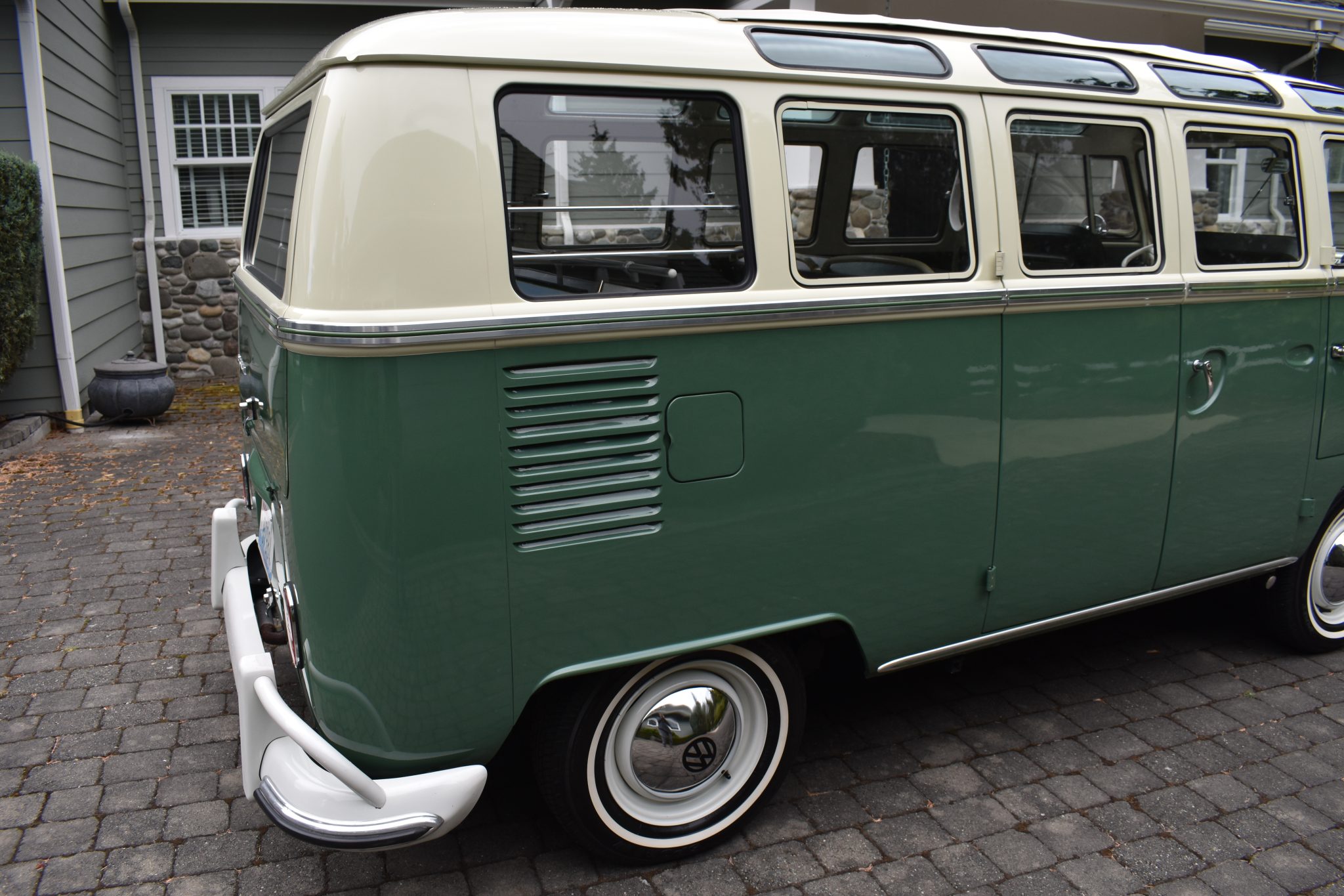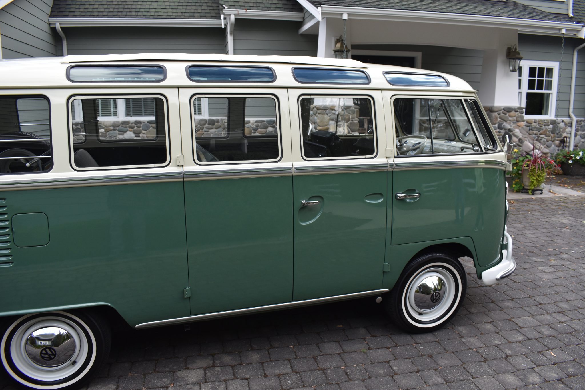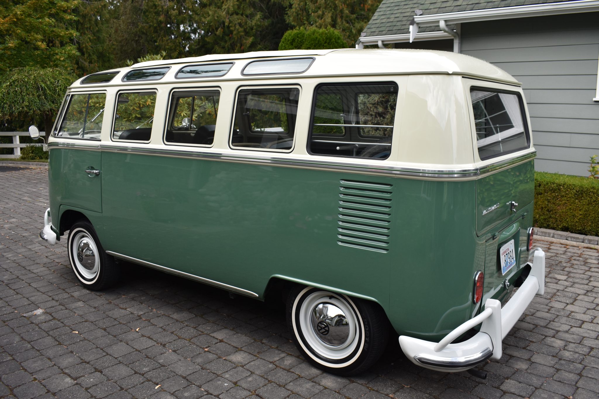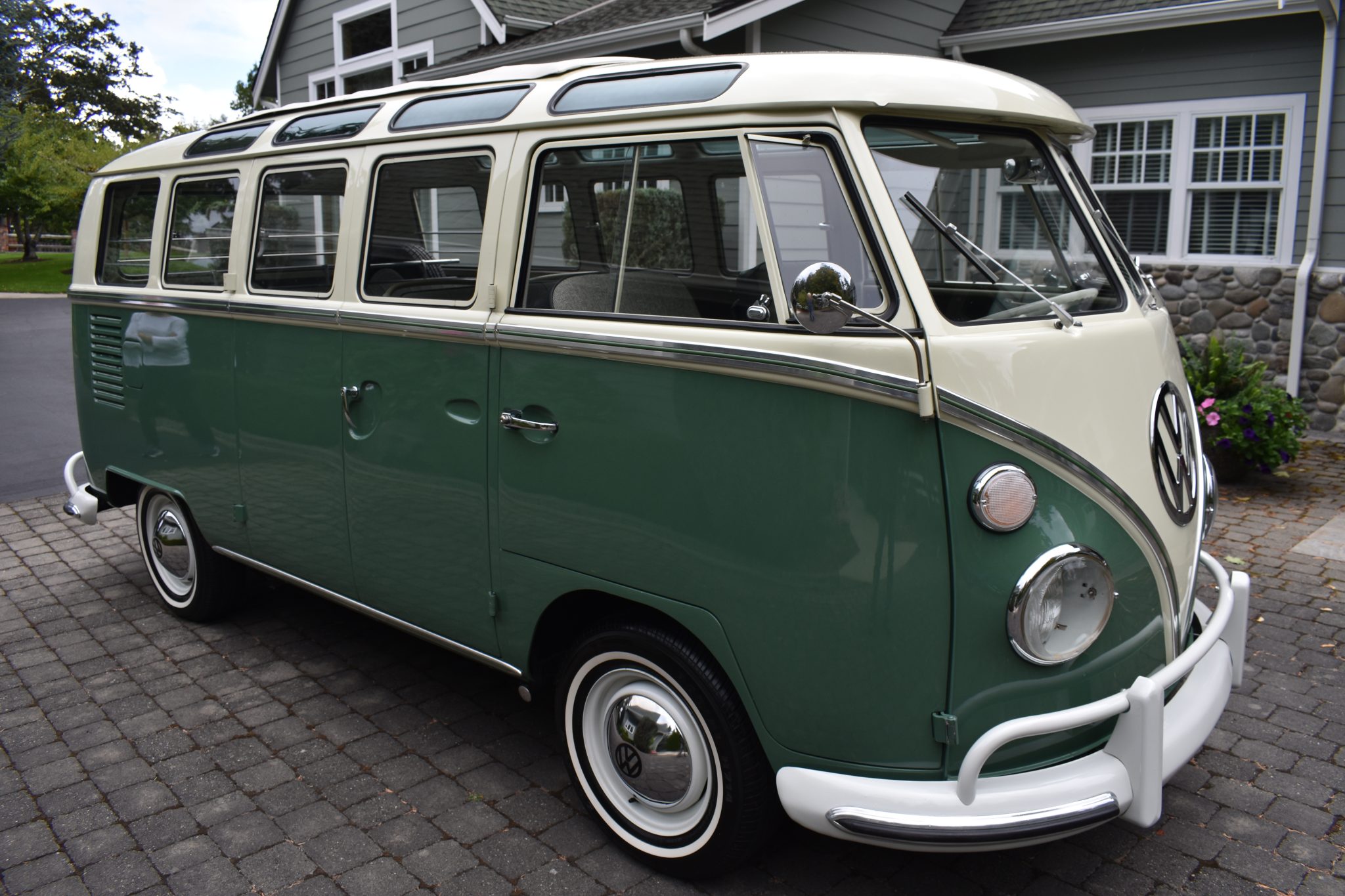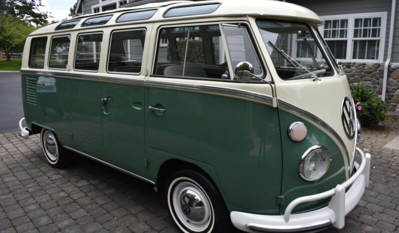 This 1967 Volkswagen Type 2 Deluxe was restored Finished in Velvet Green and Pearl White over Platinum vinyl, the van is powered by a 1.5-liter flat-four mated to a four-speed manual transaxle. Features include a single downdraft carburetor, a speed governor, drum brakes, 14″ steel wheels, white-finished bumpers, a retractable cloth sunroof, pop-out side windows, a cabin heater, front lap belts, sliding front windows, and jail bars. This Type 2 shows 93k miles
