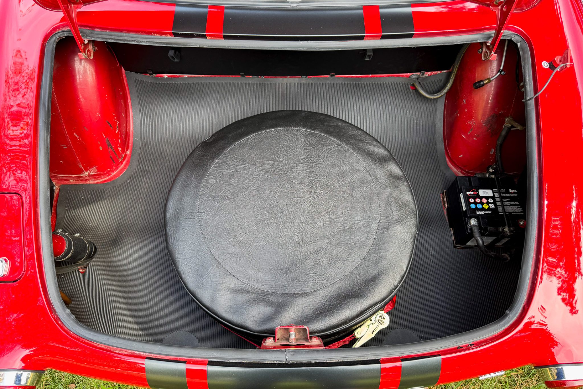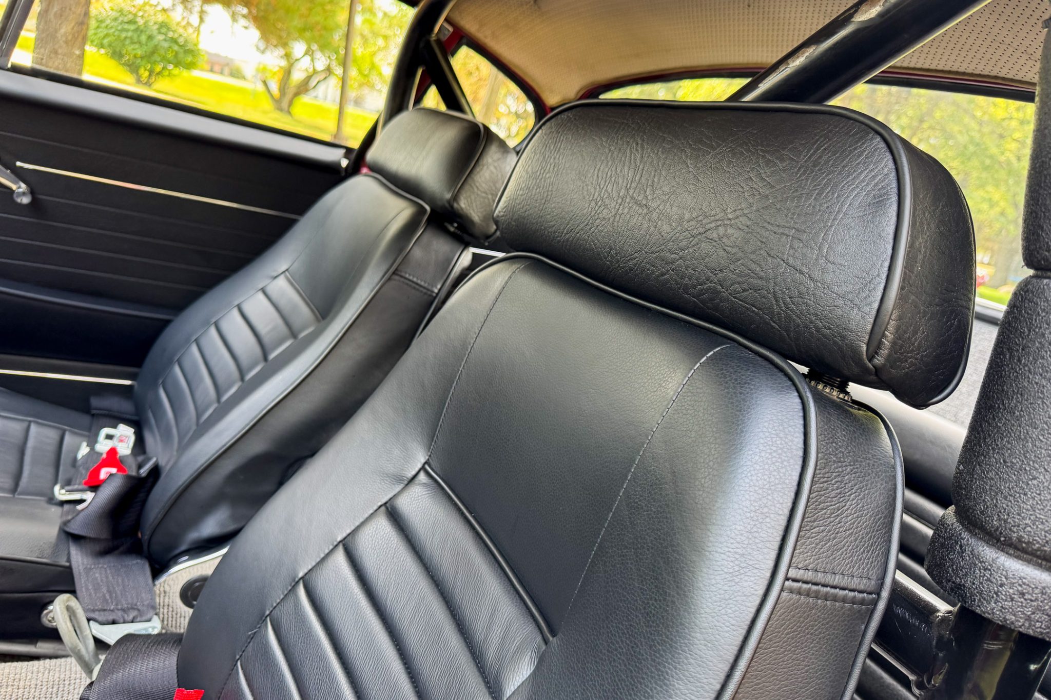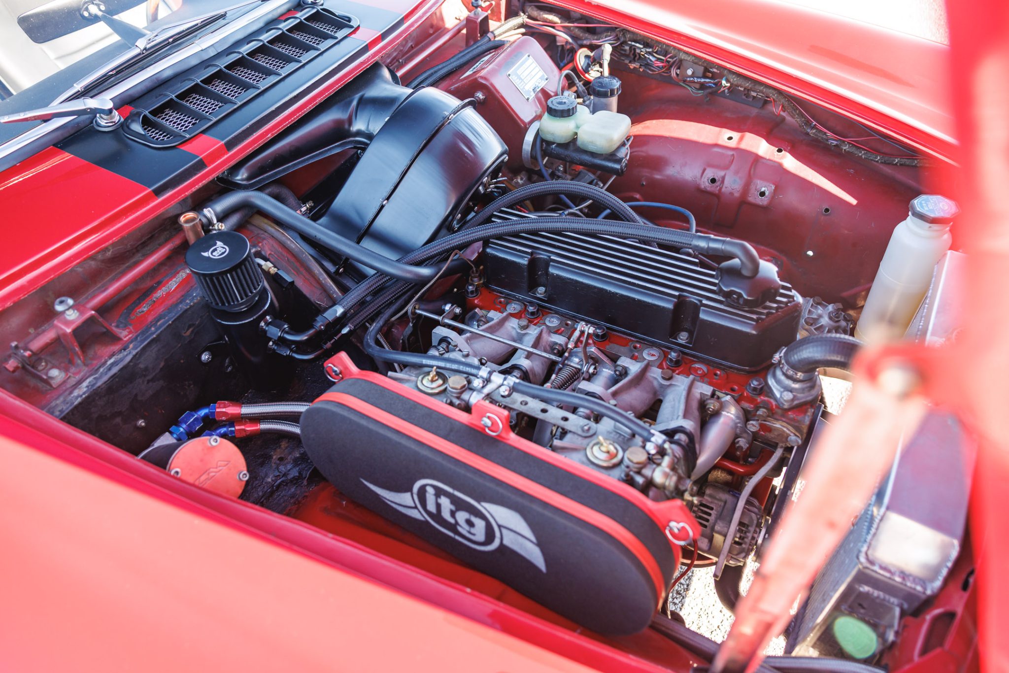 A rebuilt and stroked B20 inline-four was installed in 2006 and utilizes a later-style cylinder head, a BHP Development camshaft and pistons, Weber 45 DCOE carburetors, and MSD ignition. It is further equipped with a Ford five-speed manual transmission, four-wheel disc brakes, a performance suspension setup, 15” alloy wheels, a roll bar, and a limited-slip differential. The body is finished in red with black vinyl stripes, 1800E-specification Recaro front seats, a replacement fire suppression bottle, and electric power steering