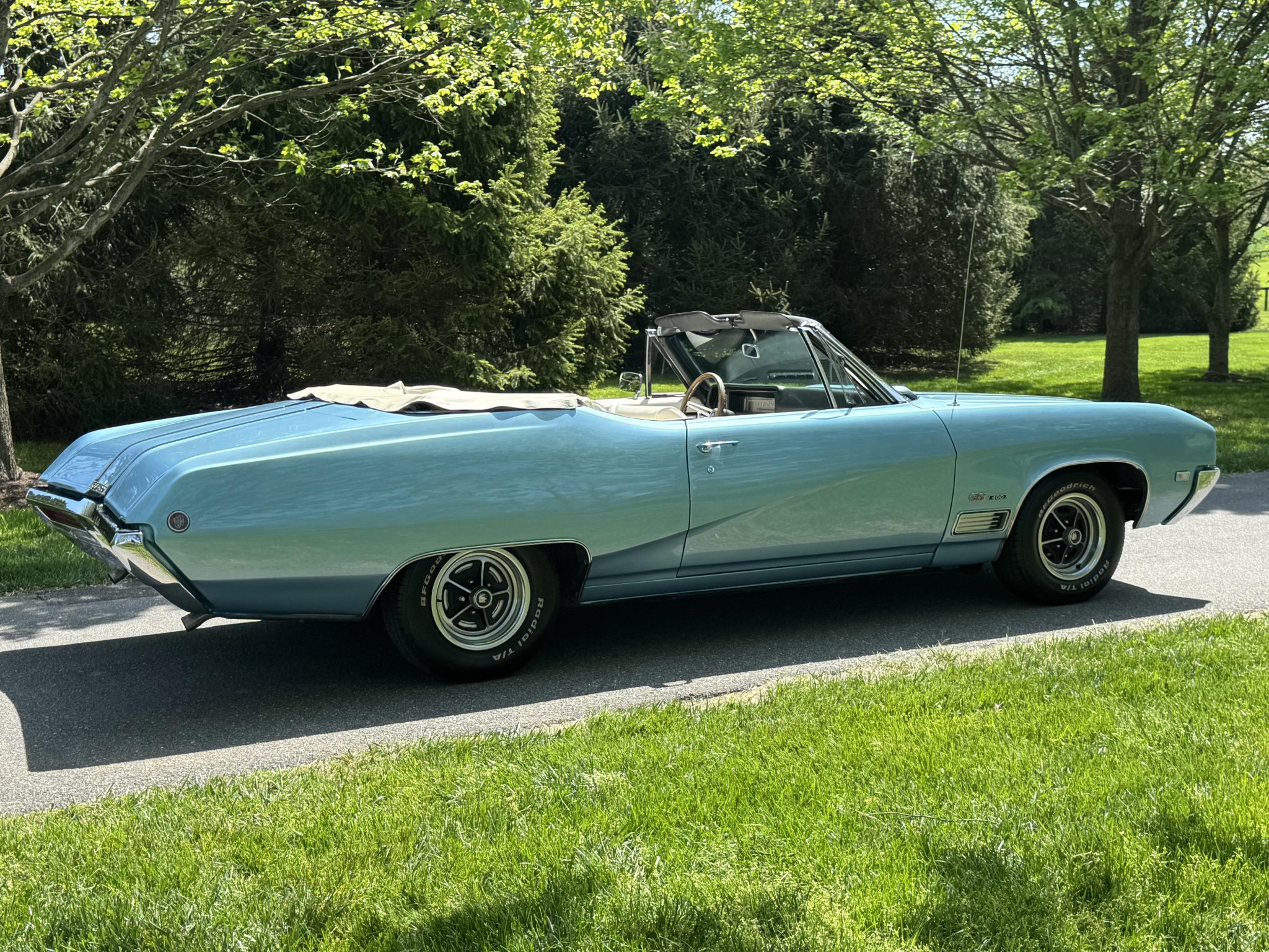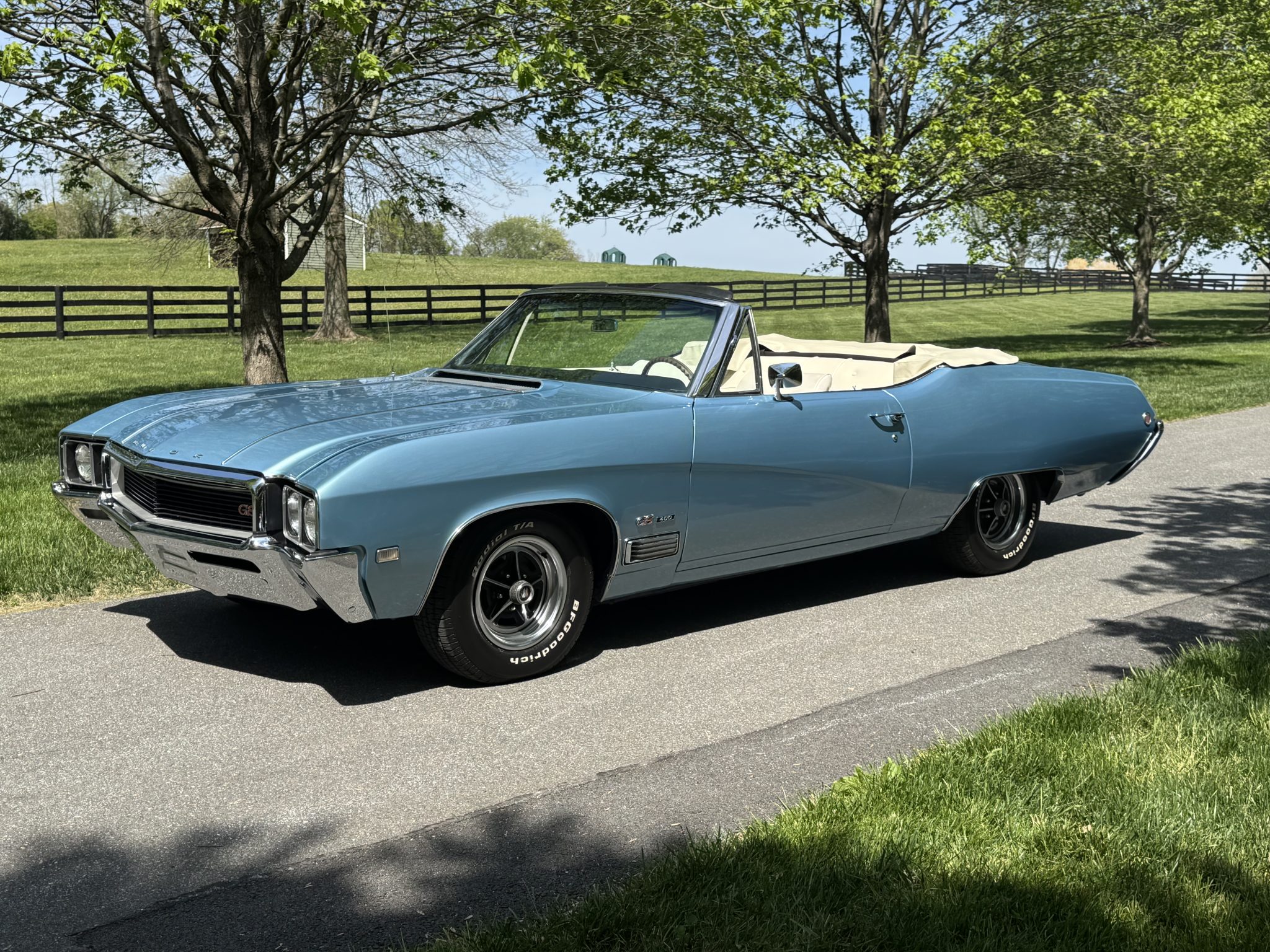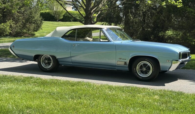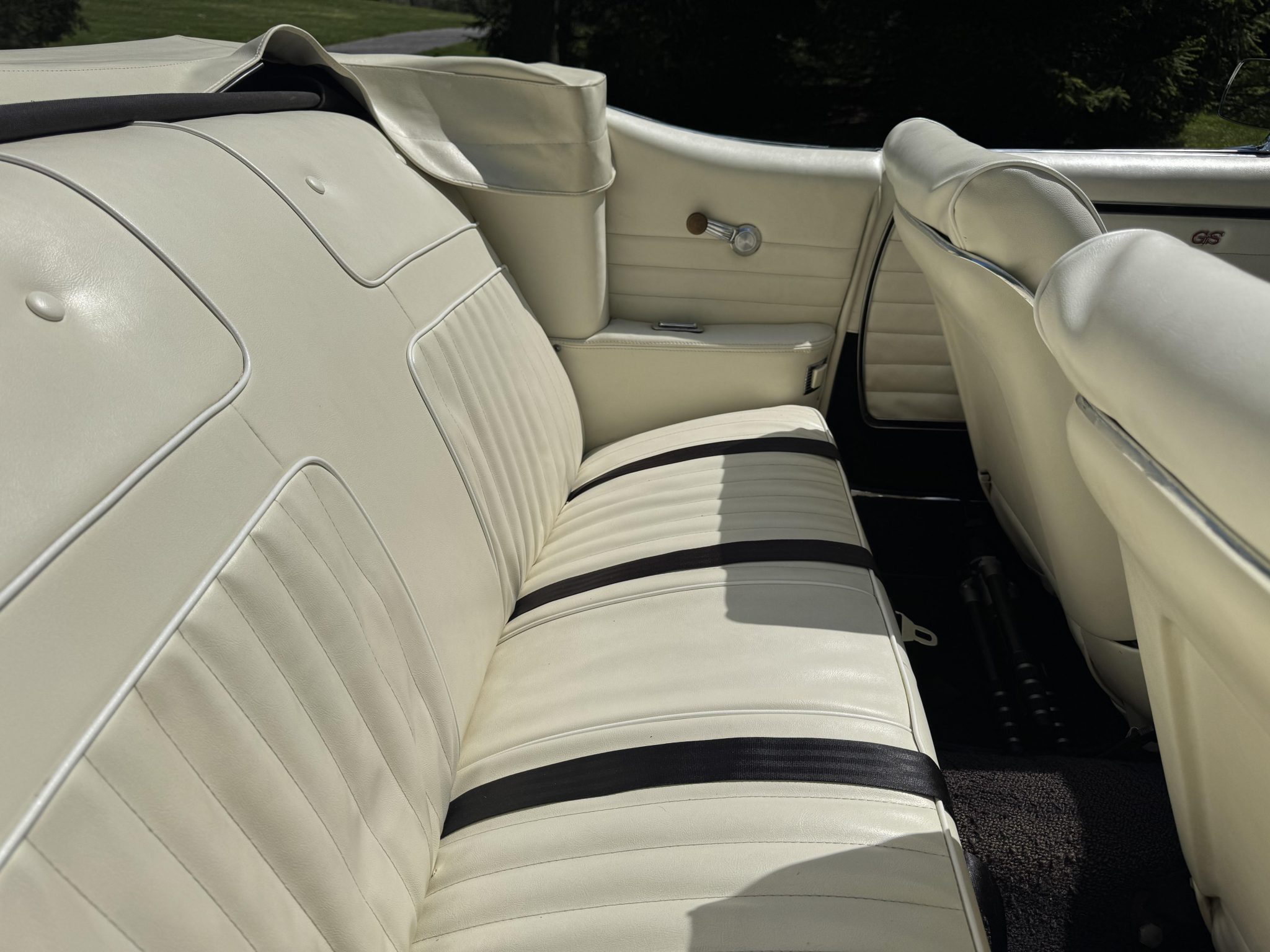 Power is provided by a 400ci V8 paired with a four-speed manual transmission, and the car is equipped with a power-operated white soft top, a four-barrel carburetor, power-assisted front disc brakes, 14″ Rallye wheels, and power-assisted front disc brakes. The interior features front bucket seats upholstered in white vinyl and accompanied by a center console, a Custom Autosound cassette stereo, and an aftermarket steering wheel.