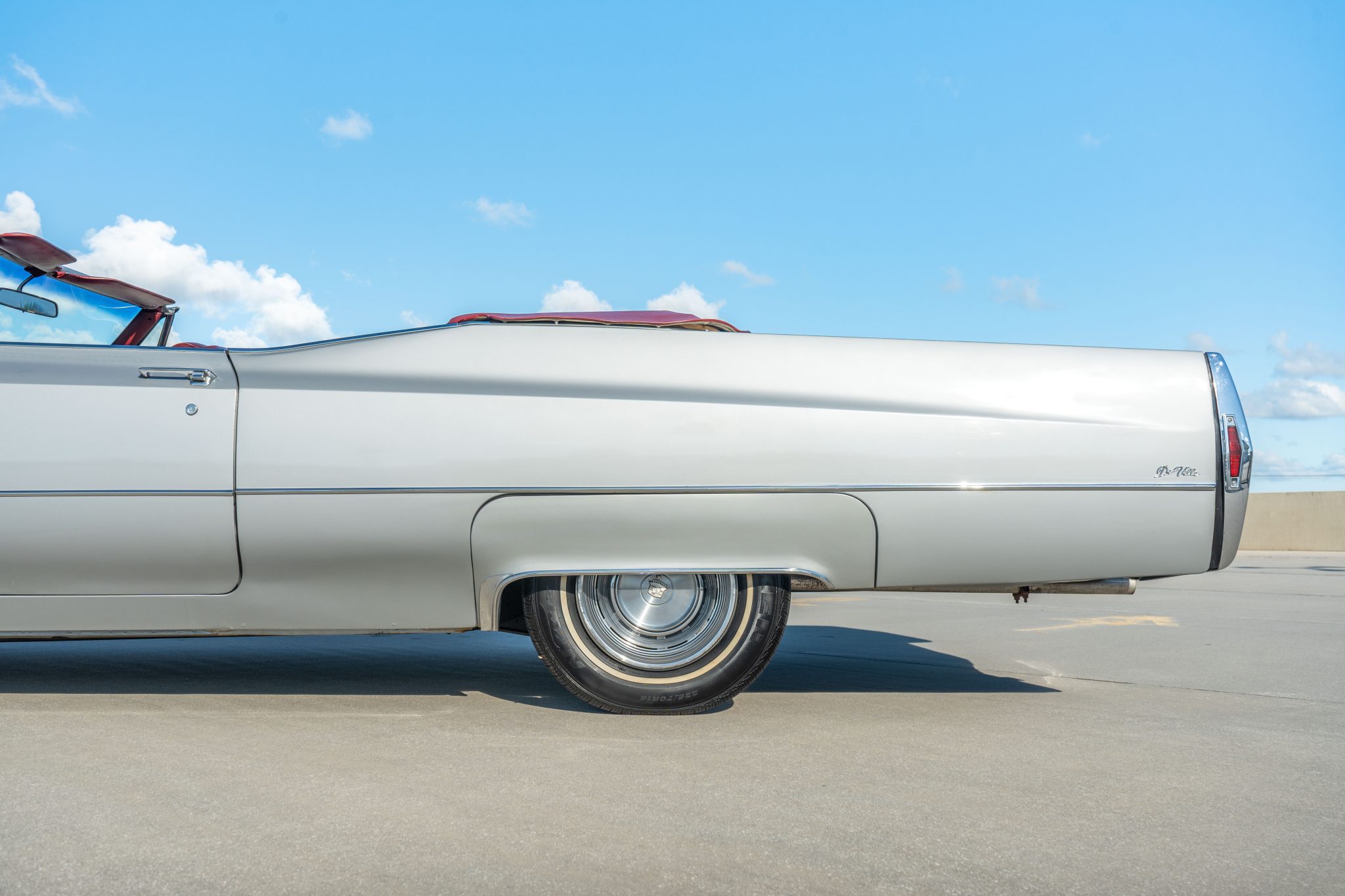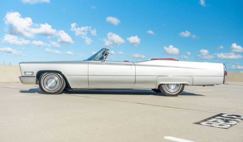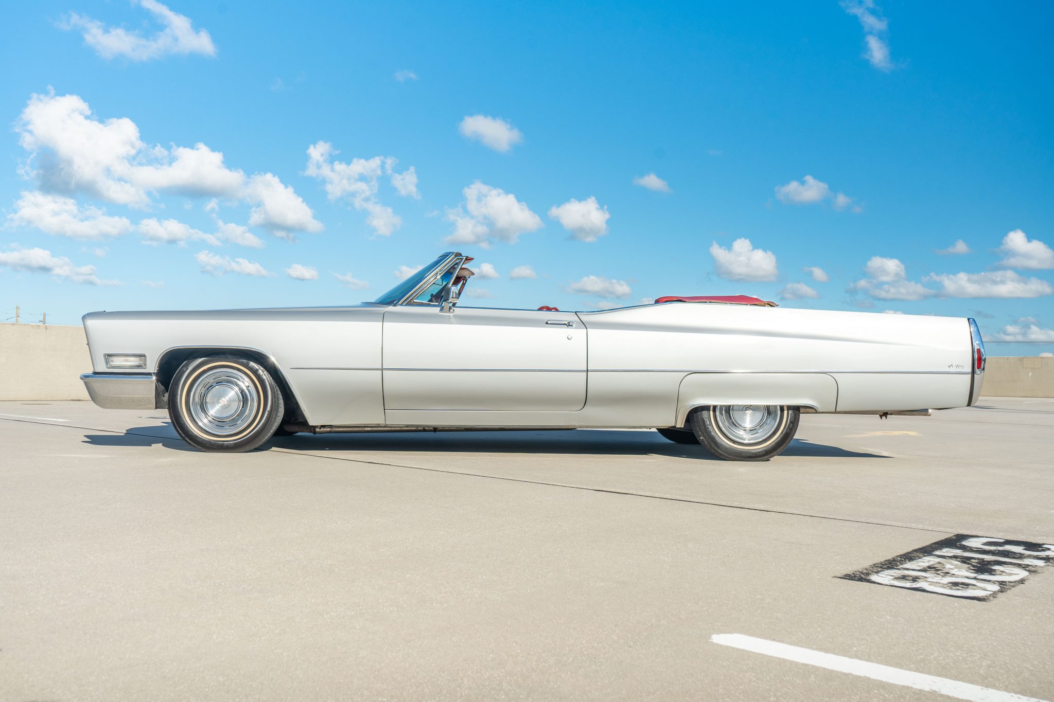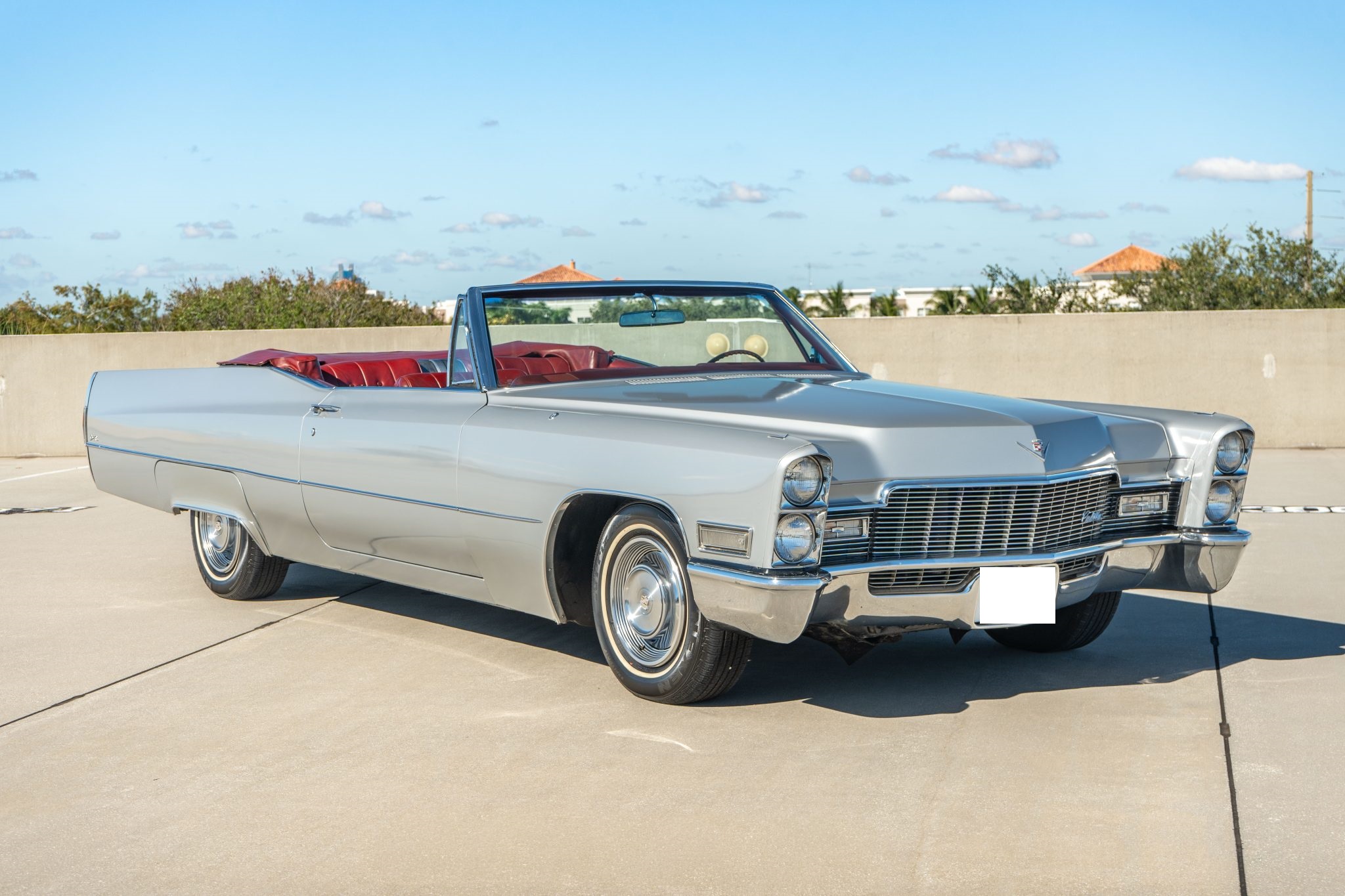 This 1968 Cadillac DeVille convertible has been repainted in Regal Silver over red leather upholstery and is powered by a 472ci V8 mated to a three-speed automatic transmission. Equipment includes a power-operated black soft top, cornering lights, fender skirts, wheel covers, power steering, power-assisted drum brakes, an AM/FM stereo, automatic climate control, a power-adjustable front seat, and power windows.