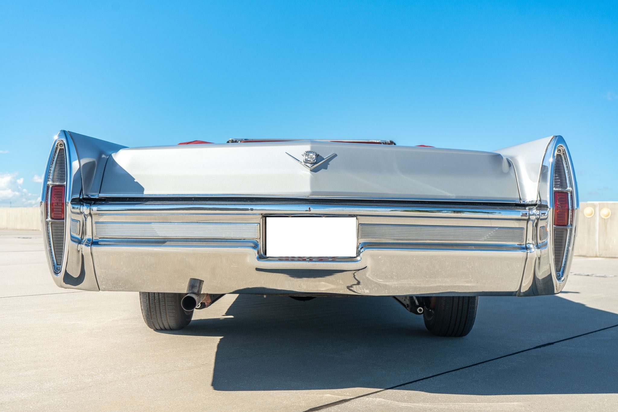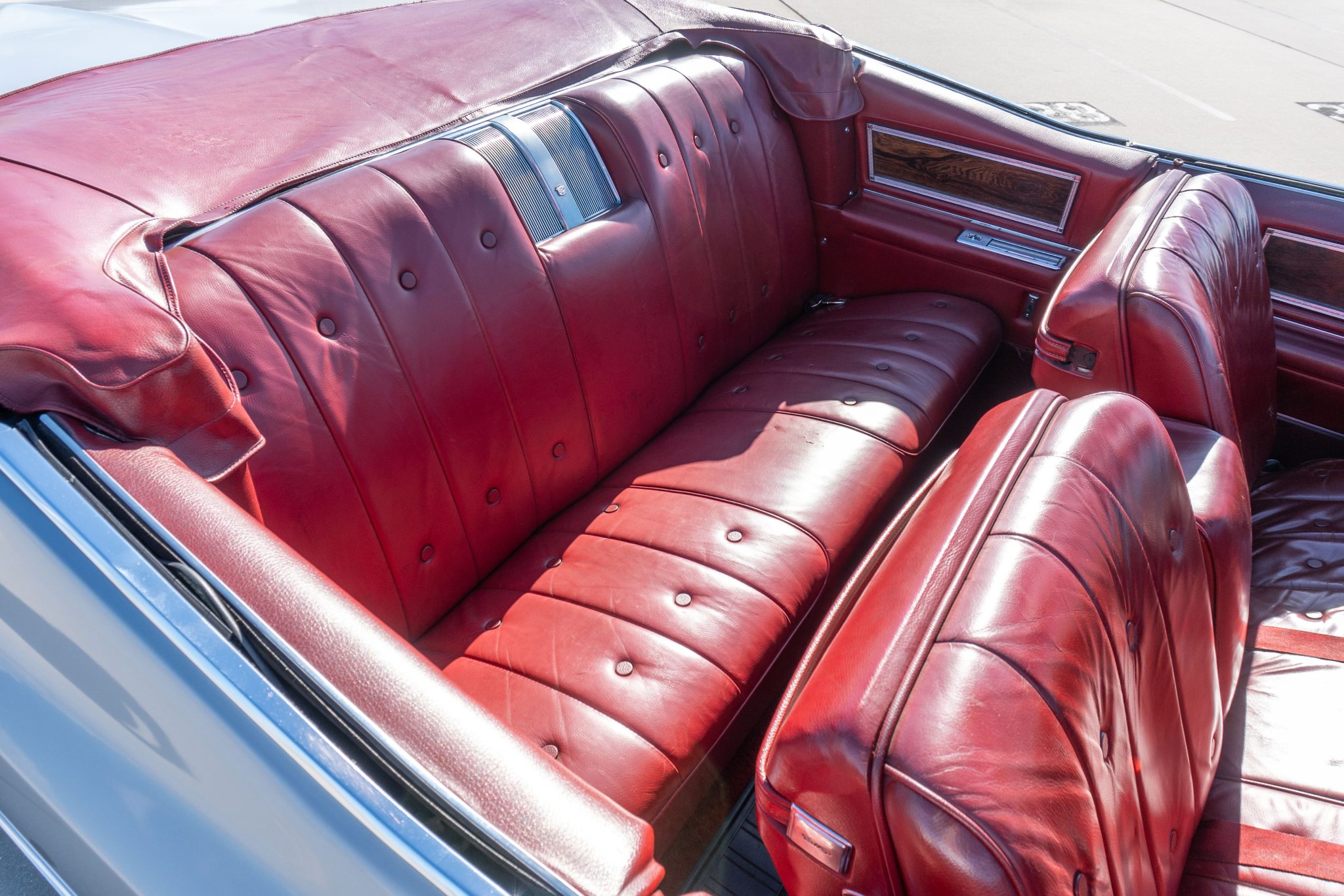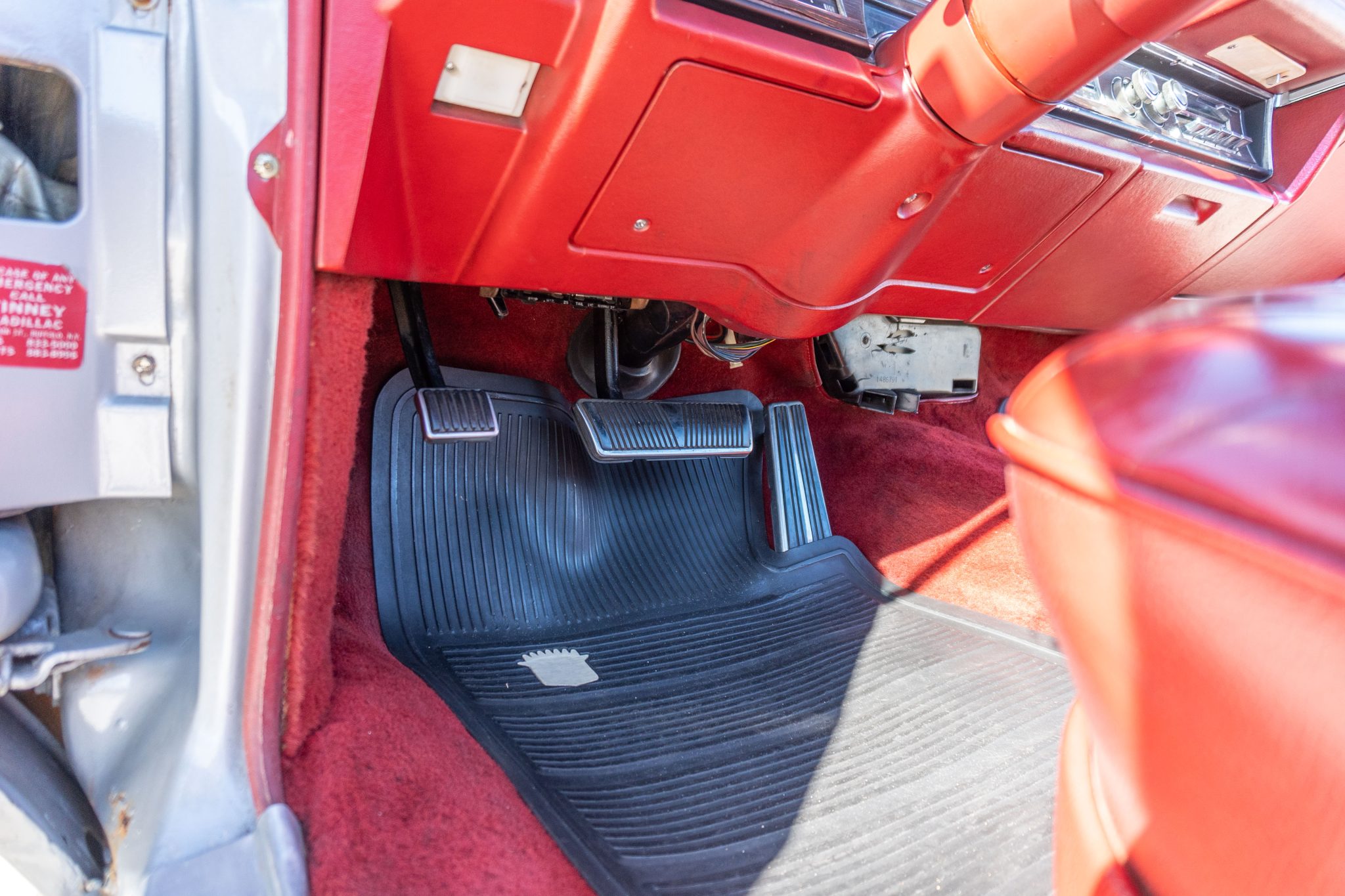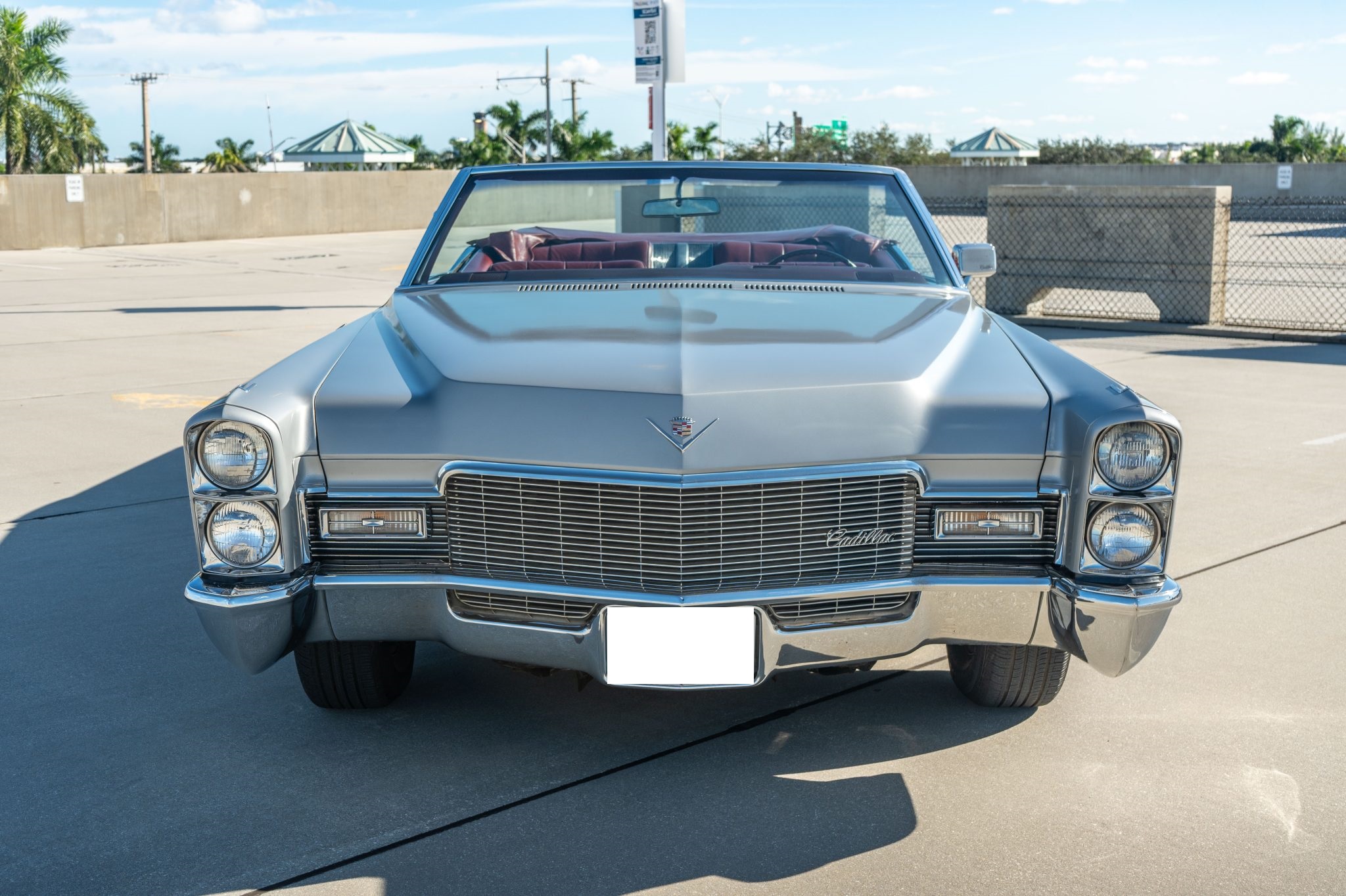 This 1968 Cadillac DeVille convertible has been repainted in Regal Silver over red leather upholstery and is powered by a 472ci V8 mated to a three-speed automatic transmission. Equipment includes a power-operated black soft top, cornering lights, fender skirts, wheel covers, power steering, power-assisted drum brakes, an AM/FM stereo, automatic climate control, a power-adjustable front seat, and power windows.
