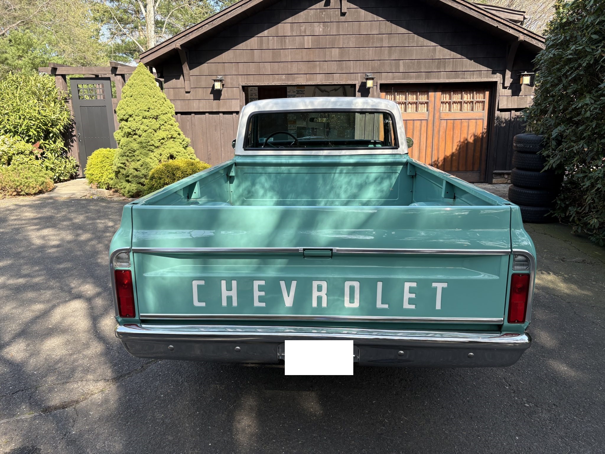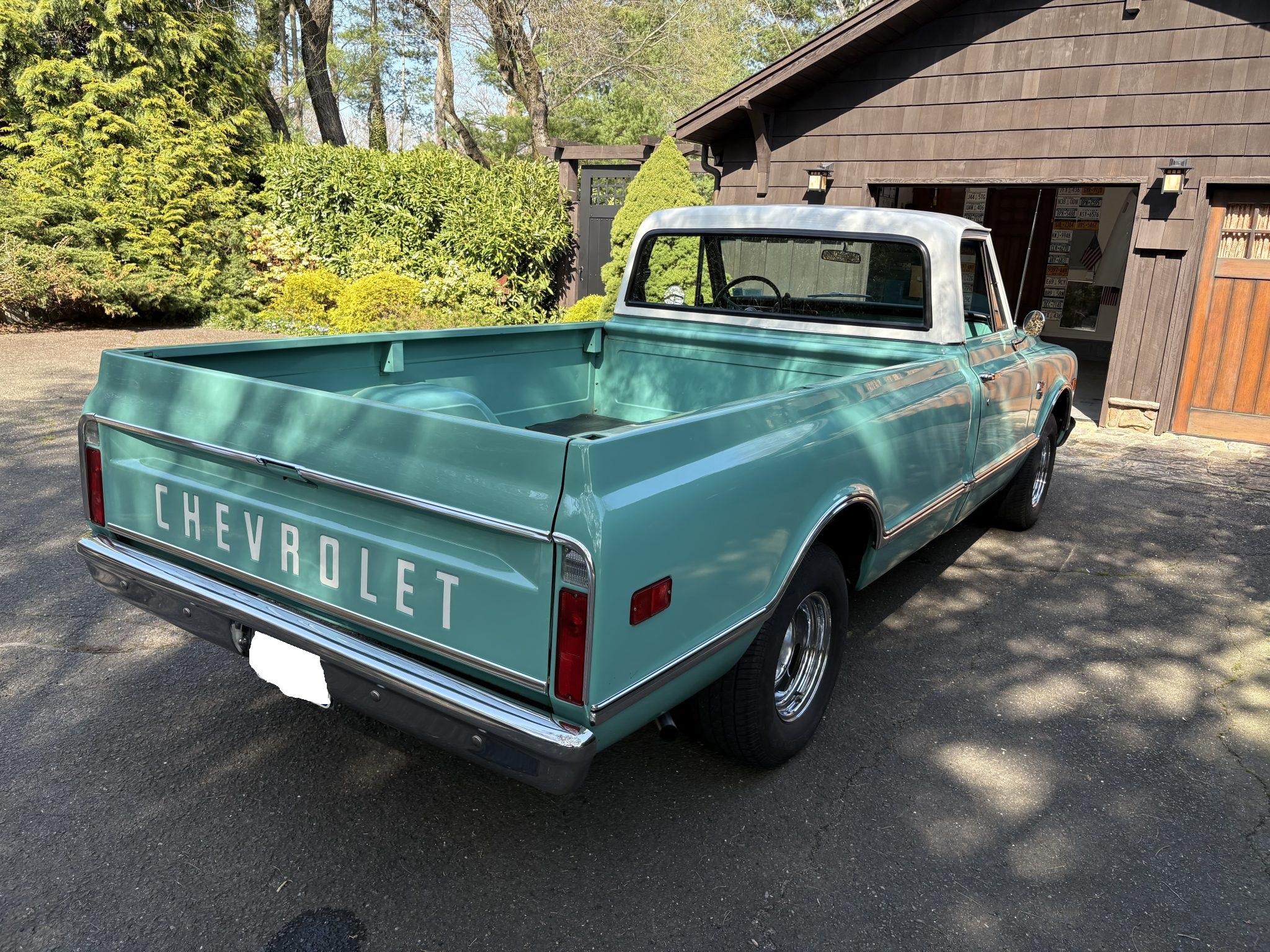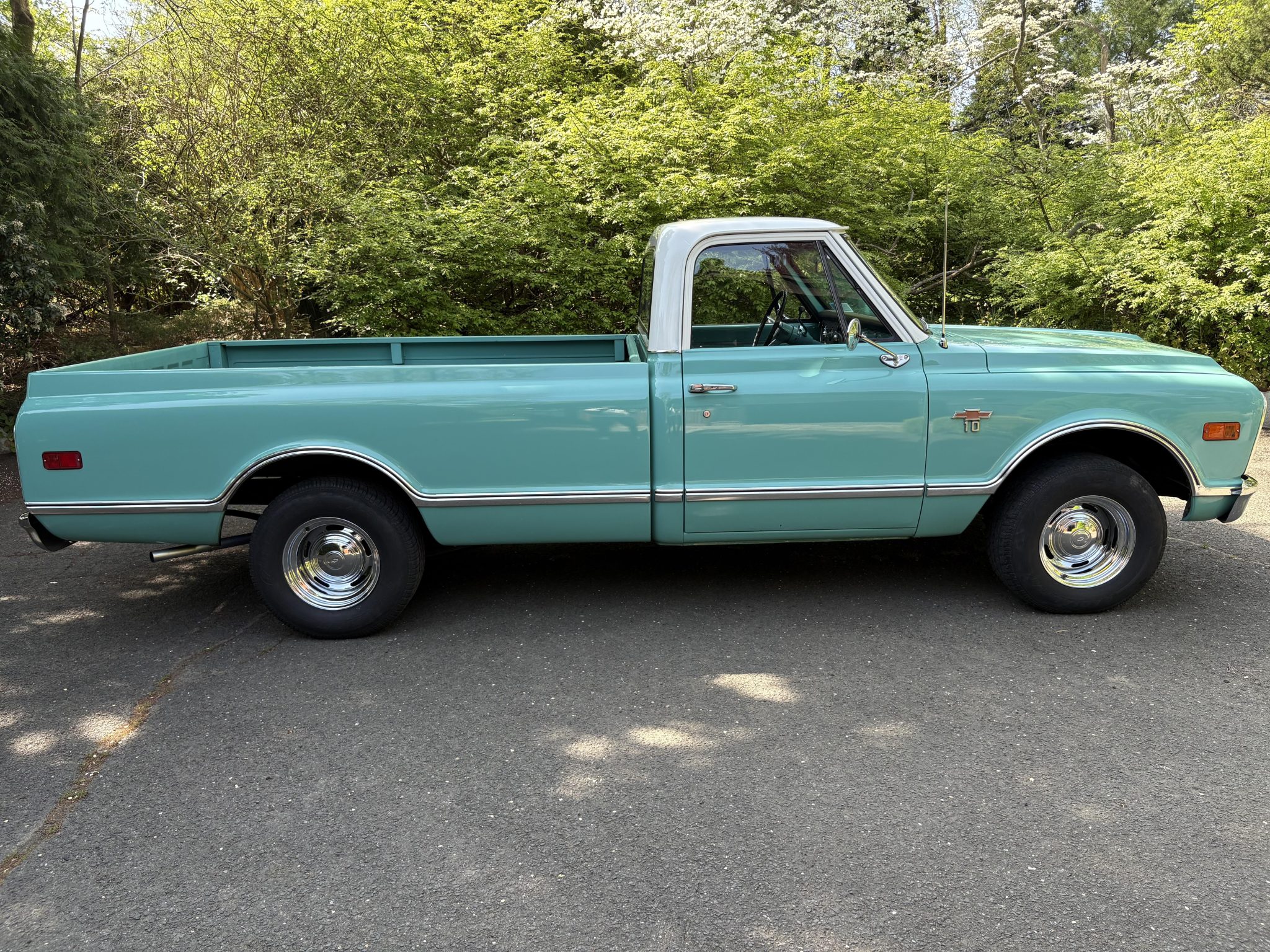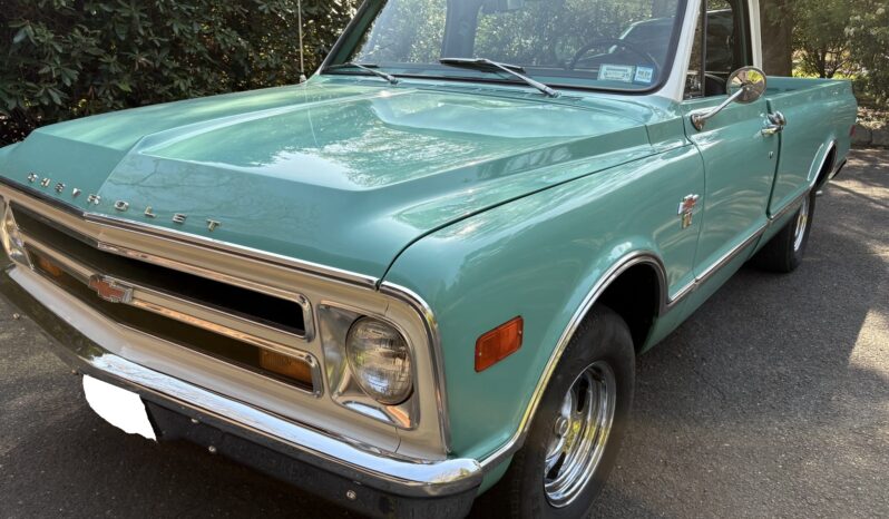 This 1968 Chevrolet C10 pickup is a long-bed 4×2 that was refurbished from 2009 through 2011 Powered by a 396ci V8 paired with a three-speed automatic, it is finished in turquoise with a white roof over black upholstery, and it has power steering, a cassette stereo, a dual exhaust system, and 15″ chrome wheels.