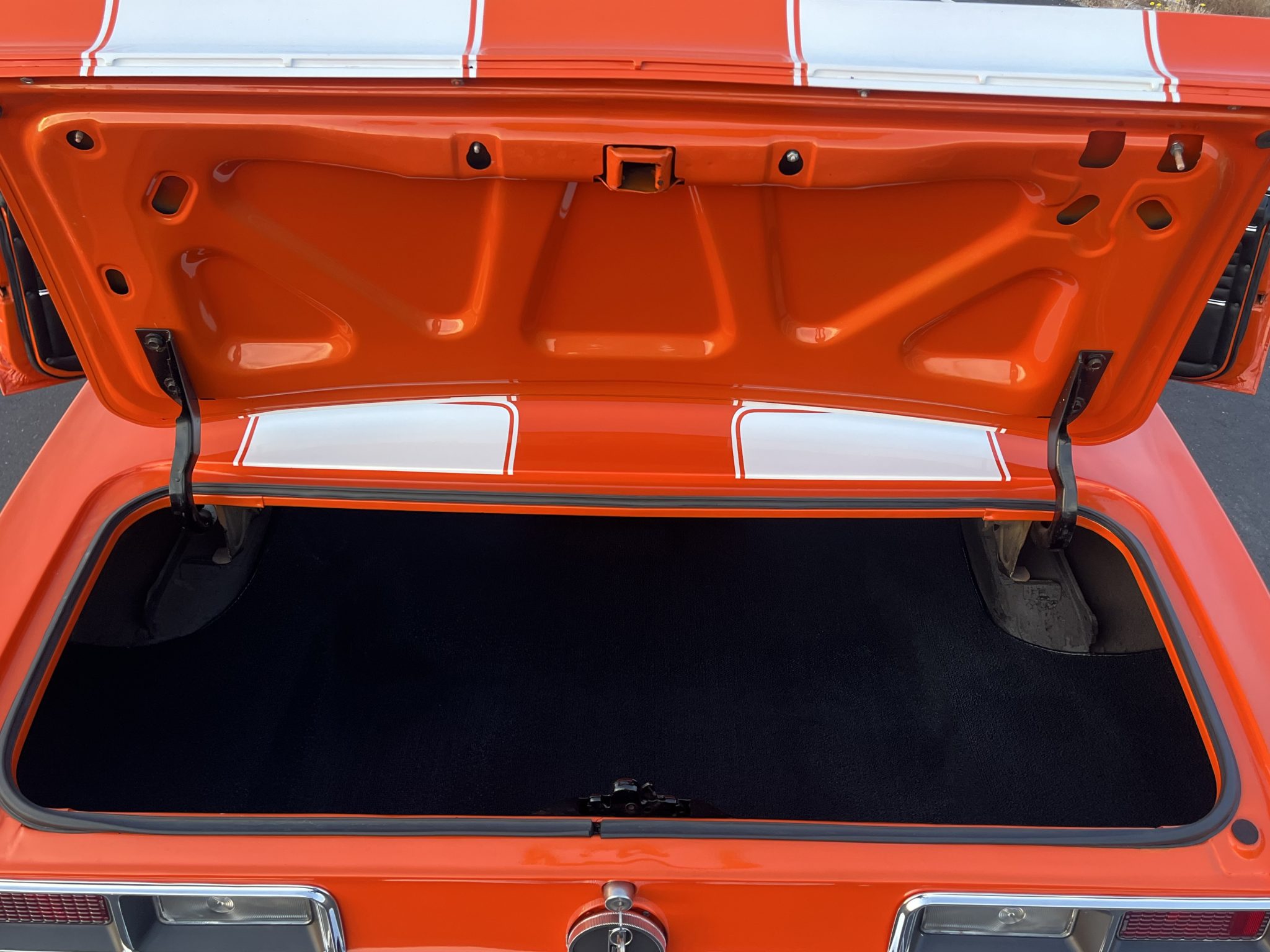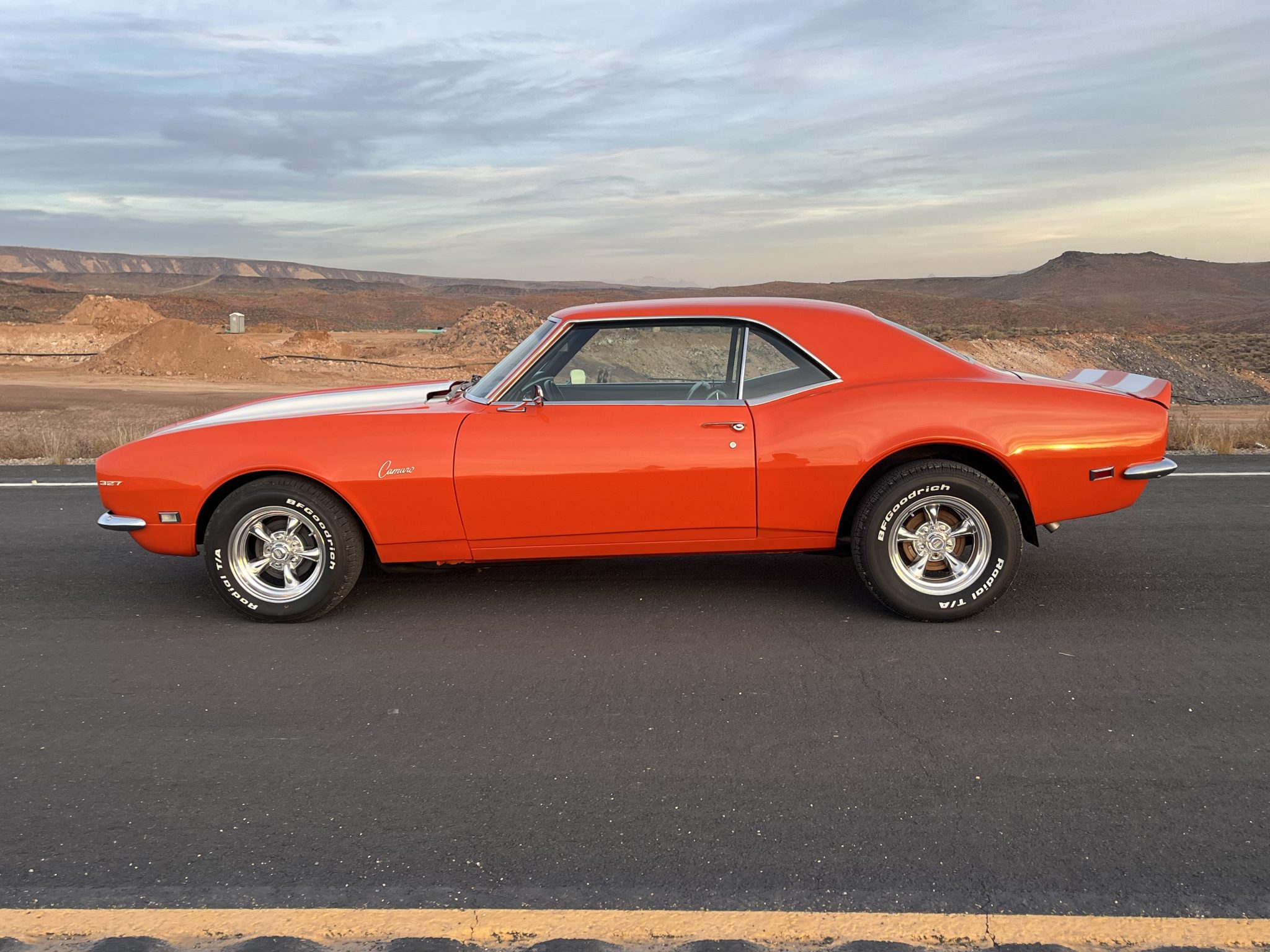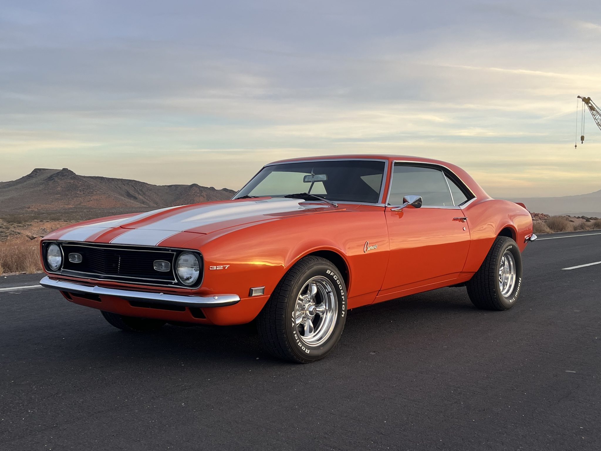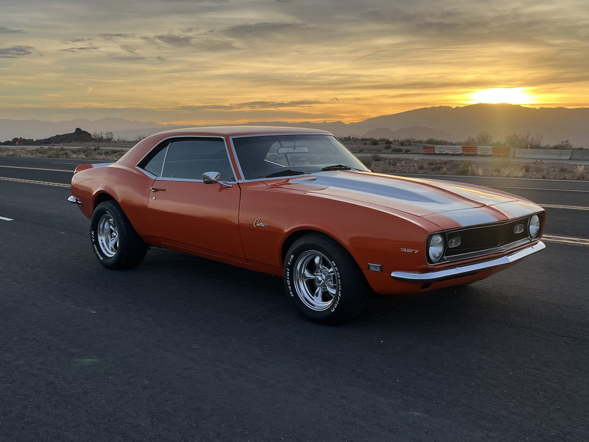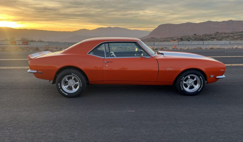 This 1968 Chevrolet Camaro coupe is refinished in orange with white stripes over black vinyl upholstery. Power is provided by a replacement 327ci V8 equipped with dual four-barrel carburetors and headers, and it is linked with a three-speed Turbo Hydramatic automatic transmission and a Positraction differential. Equipment includes a rear spoiler, a cowl induction hood, 15″ American Racing wheels, an aftermarket stereo, and air conditioning.