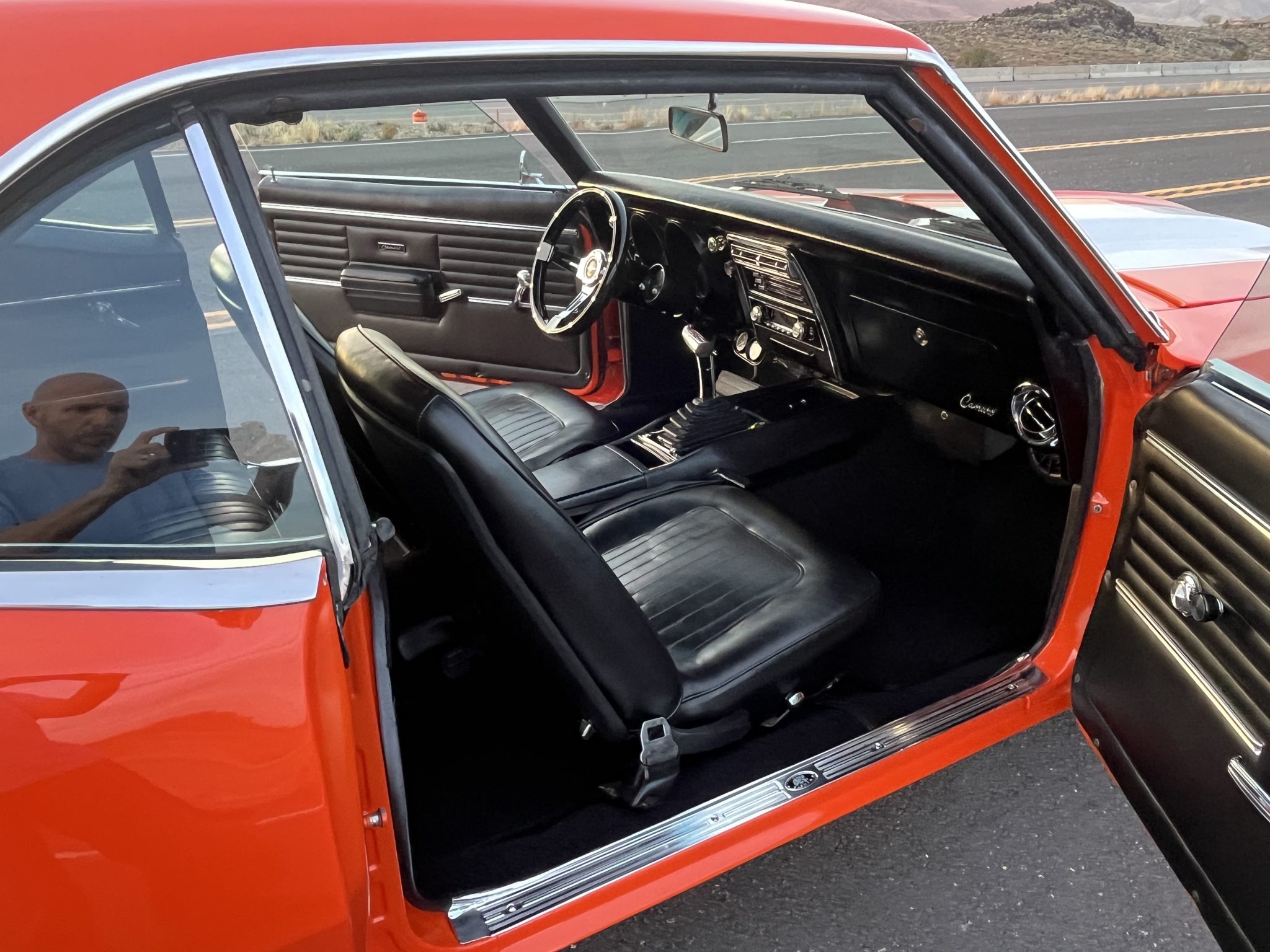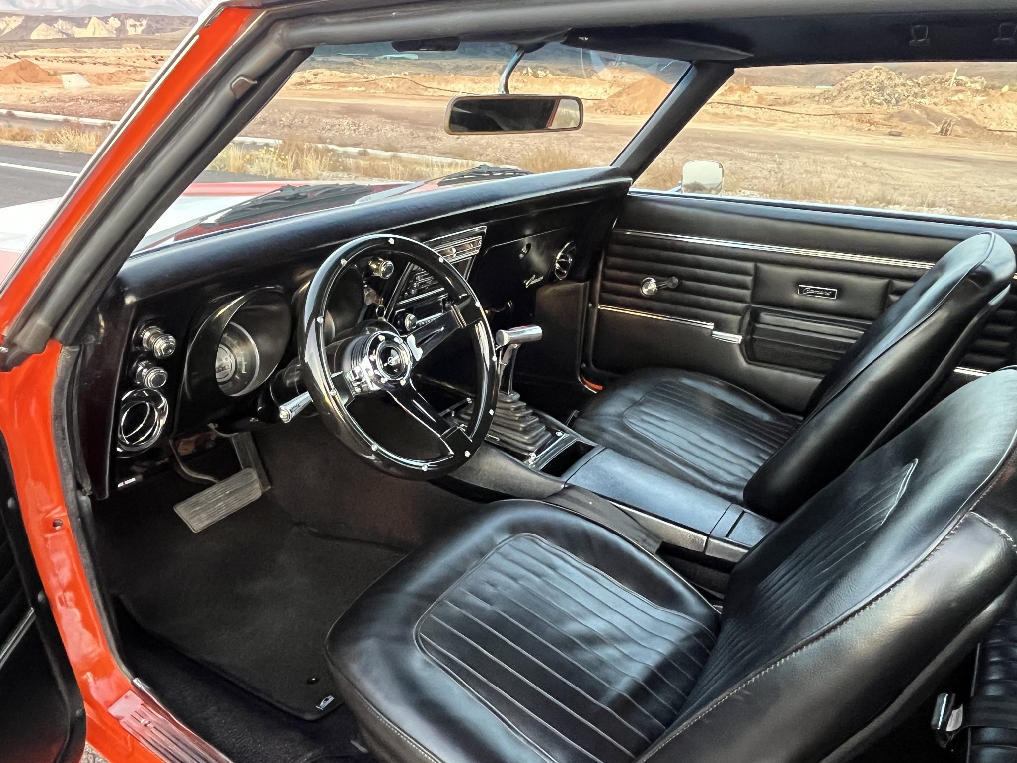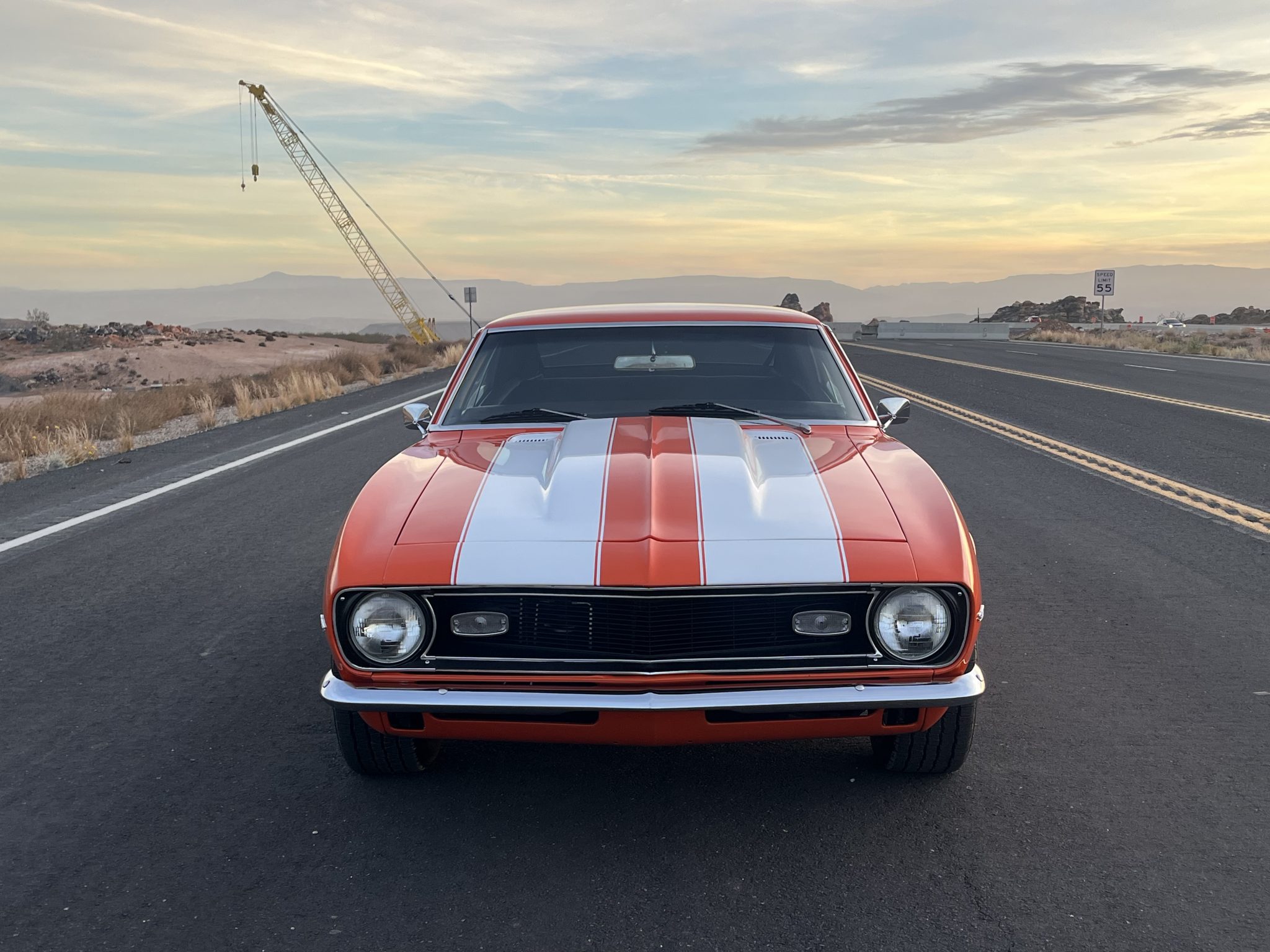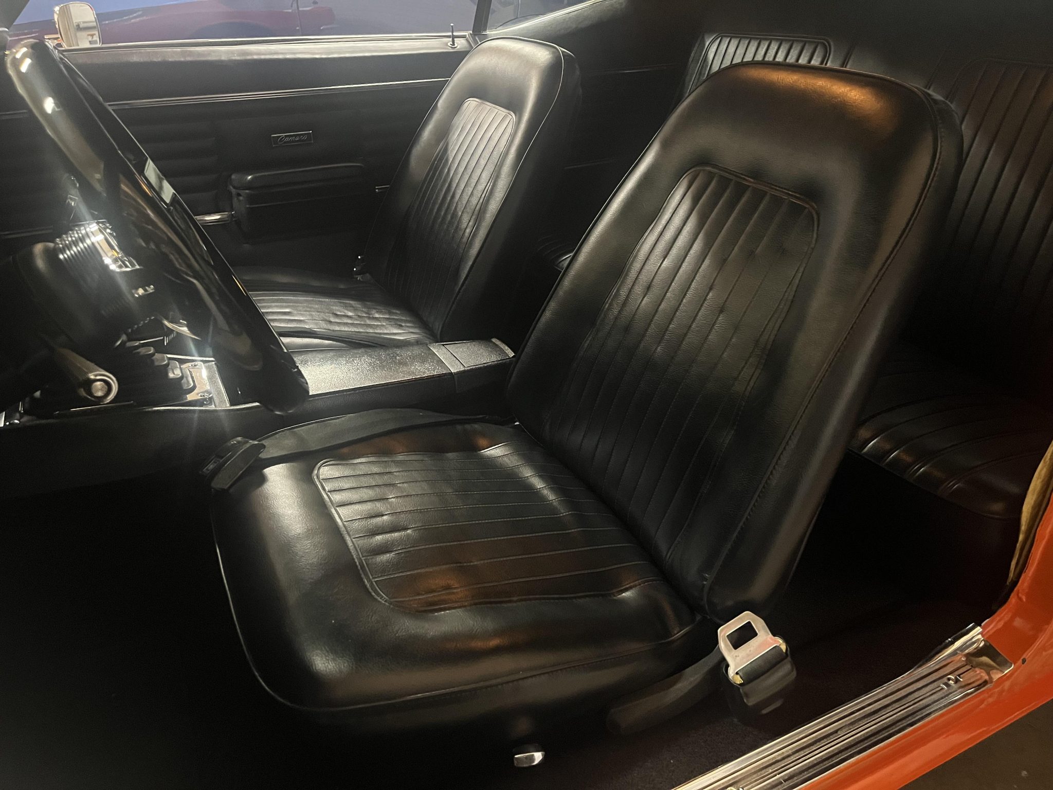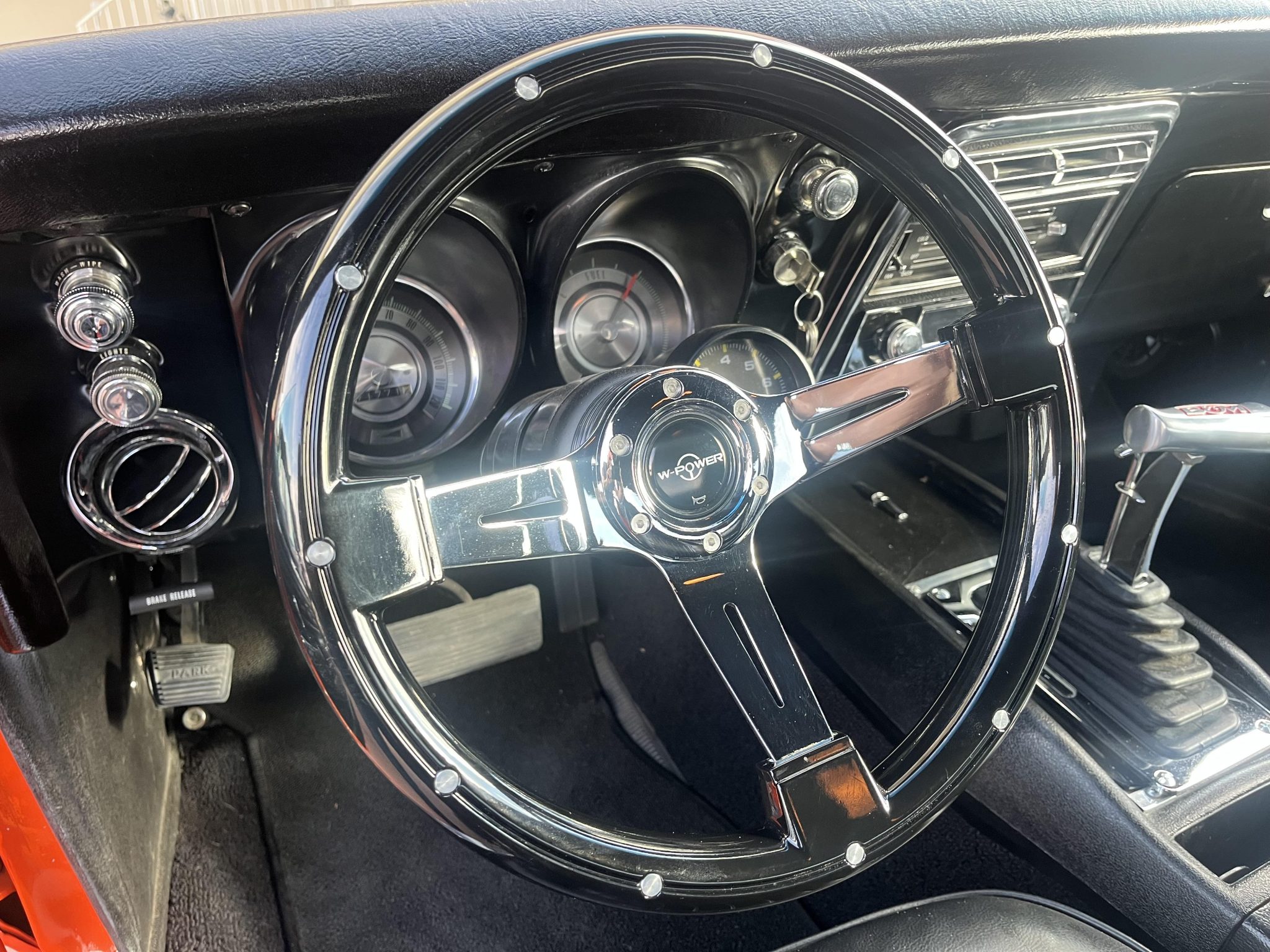 This 1968 Chevrolet Camaro coupe is refinished in orange with white stripes over black vinyl upholstery. Power is provided by a replacement 327ci V8 equipped with dual four-barrel carburetors and headers, and it is linked with a three-speed Turbo Hydramatic automatic transmission and a Positraction differential. Equipment includes a rear spoiler, a cowl induction hood, 15″ American Racing wheels, an aftermarket stereo, and air conditioning.