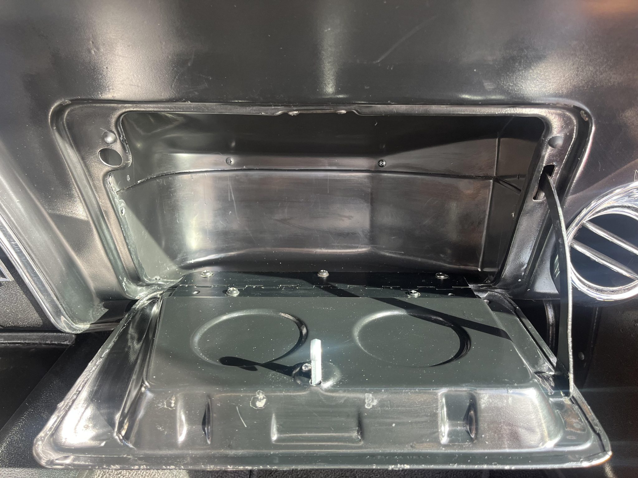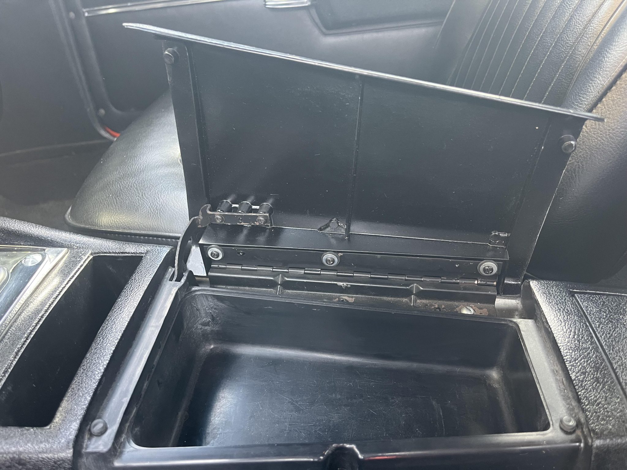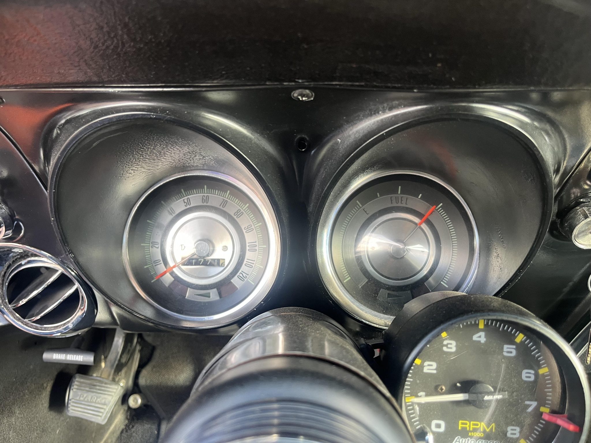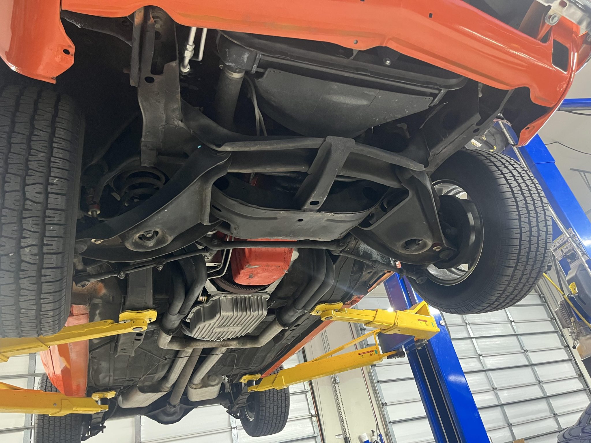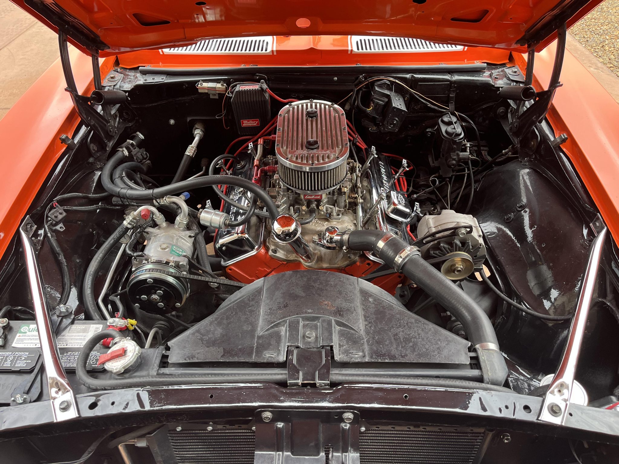 This 1968 Chevrolet Camaro coupe is refinished in orange with white stripes over black vinyl upholstery. Power is provided by a replacement 327ci V8 equipped with dual four-barrel carburetors and headers, and it is linked with a three-speed Turbo Hydramatic automatic transmission and a Positraction differential. Equipment includes a rear spoiler, a cowl induction hood, 15″ American Racing wheels, an aftermarket stereo, and air conditioning.