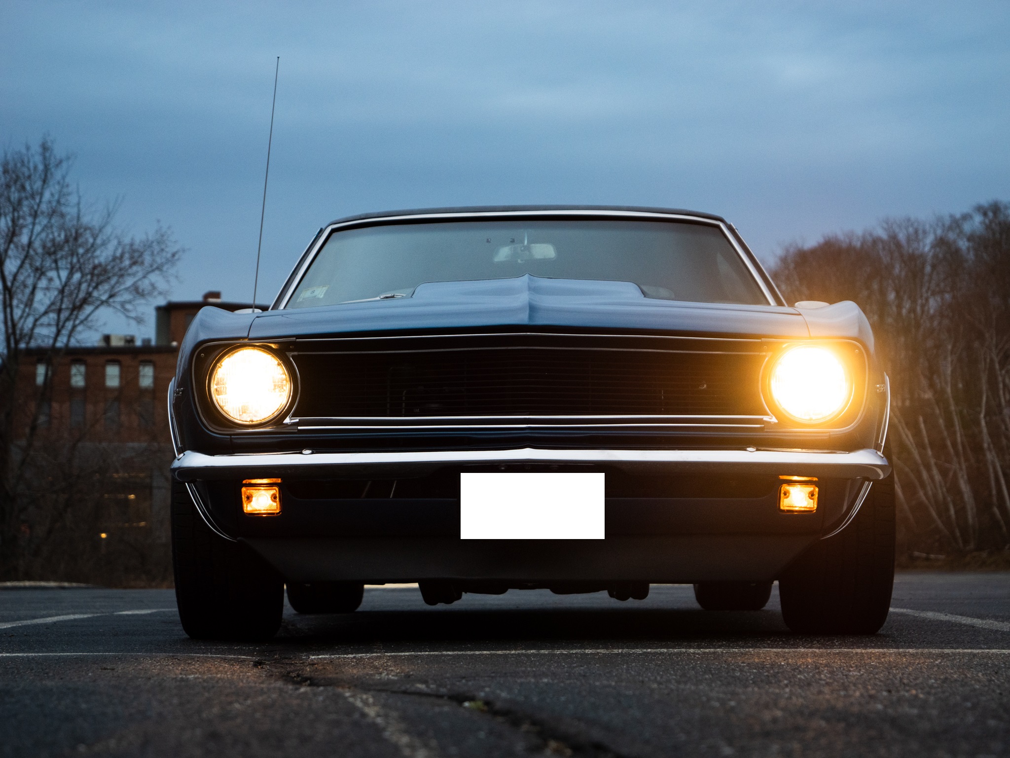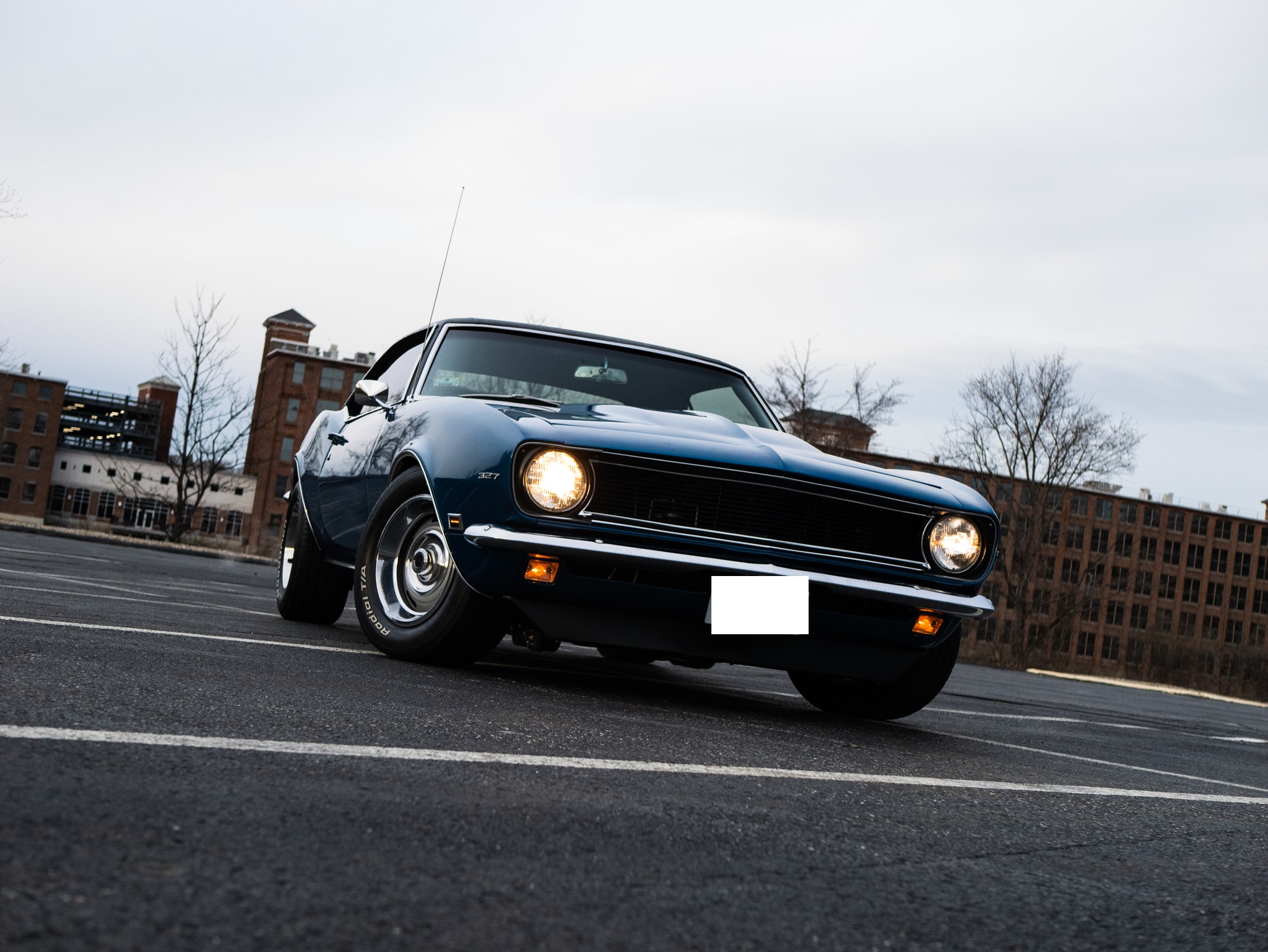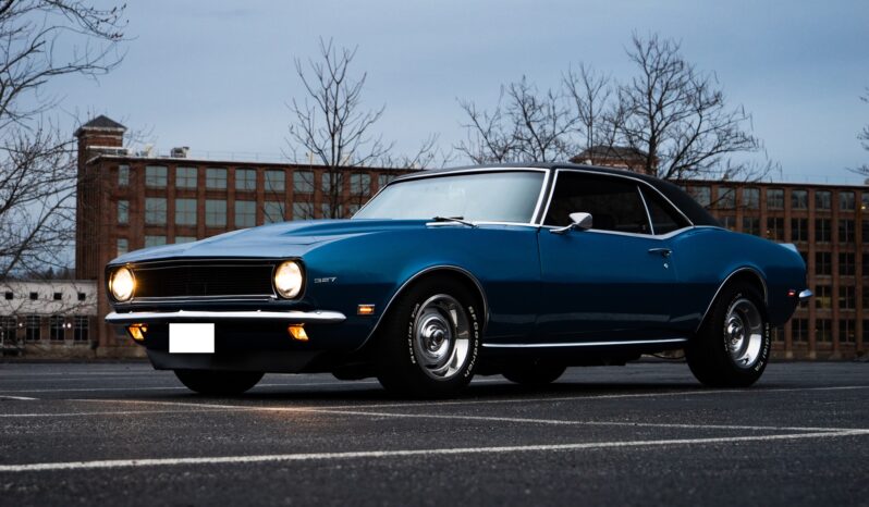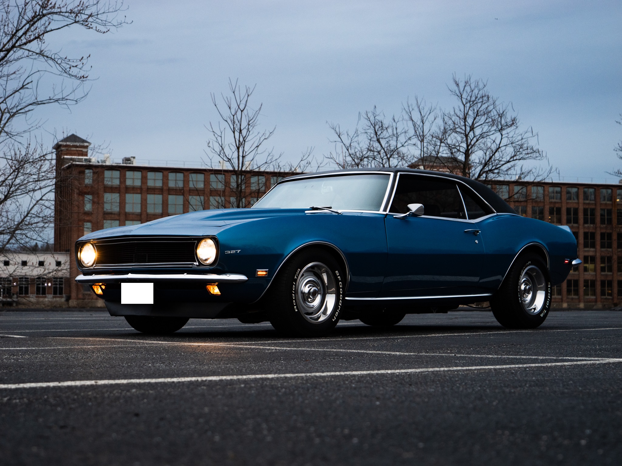 A 383ci stroker V8 crate engine was installed along with a built 200-4R and a 3.73:1 Positraction differential, and the body was refinished in blue with a black vinyl roof cover. Global West tubular front control arms and adjustable coilovers were installed along with composite rear leaf springs with adjustable shocks, and the car is equipped with power steering and power-assisted front disc brakes. Inside, the front bucket seats and rear bench have been re-trimmed in black vinyl, and Vintage Air climate control is installed along with a center console, a reverse camera, and an Alpine CD stereo unit.