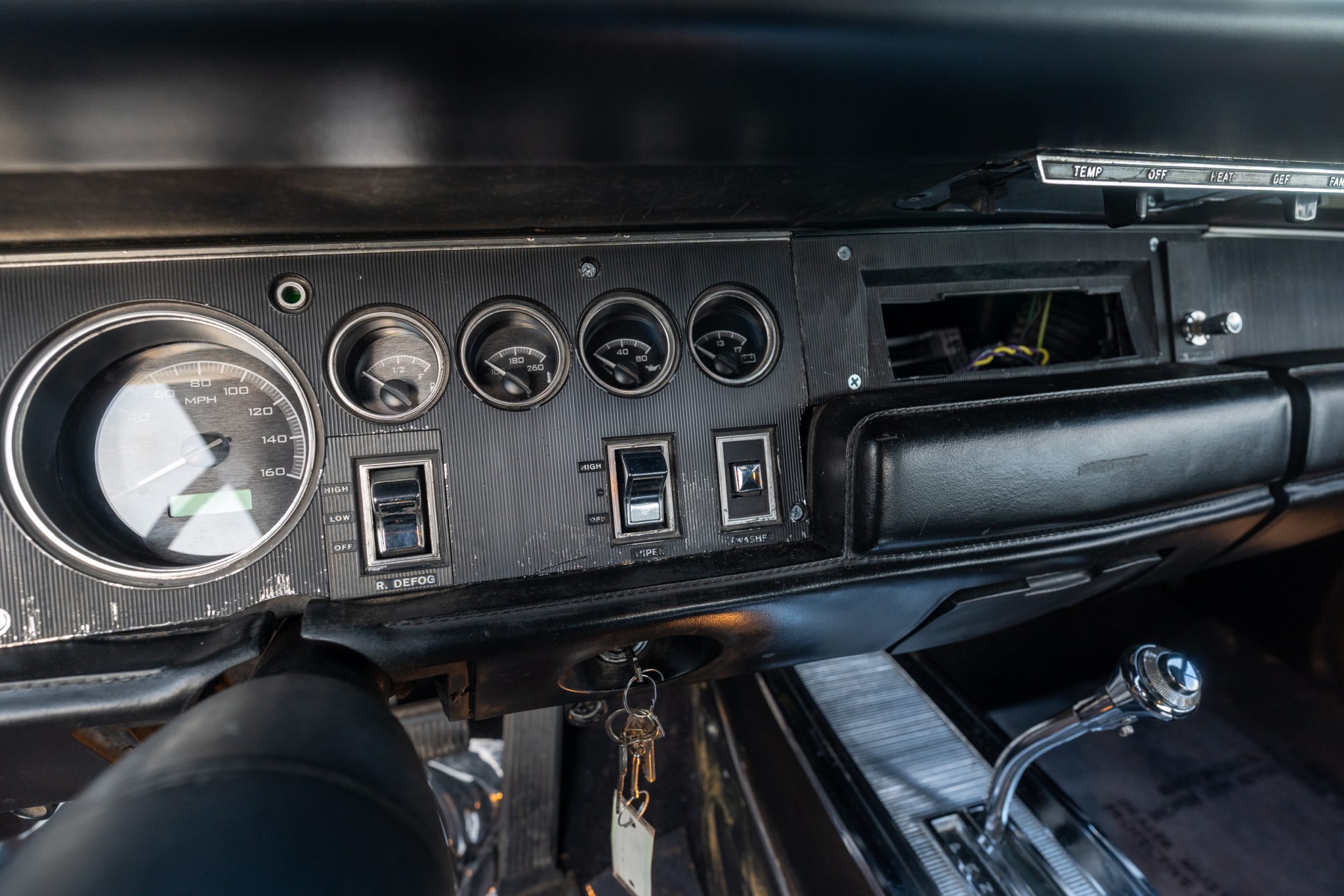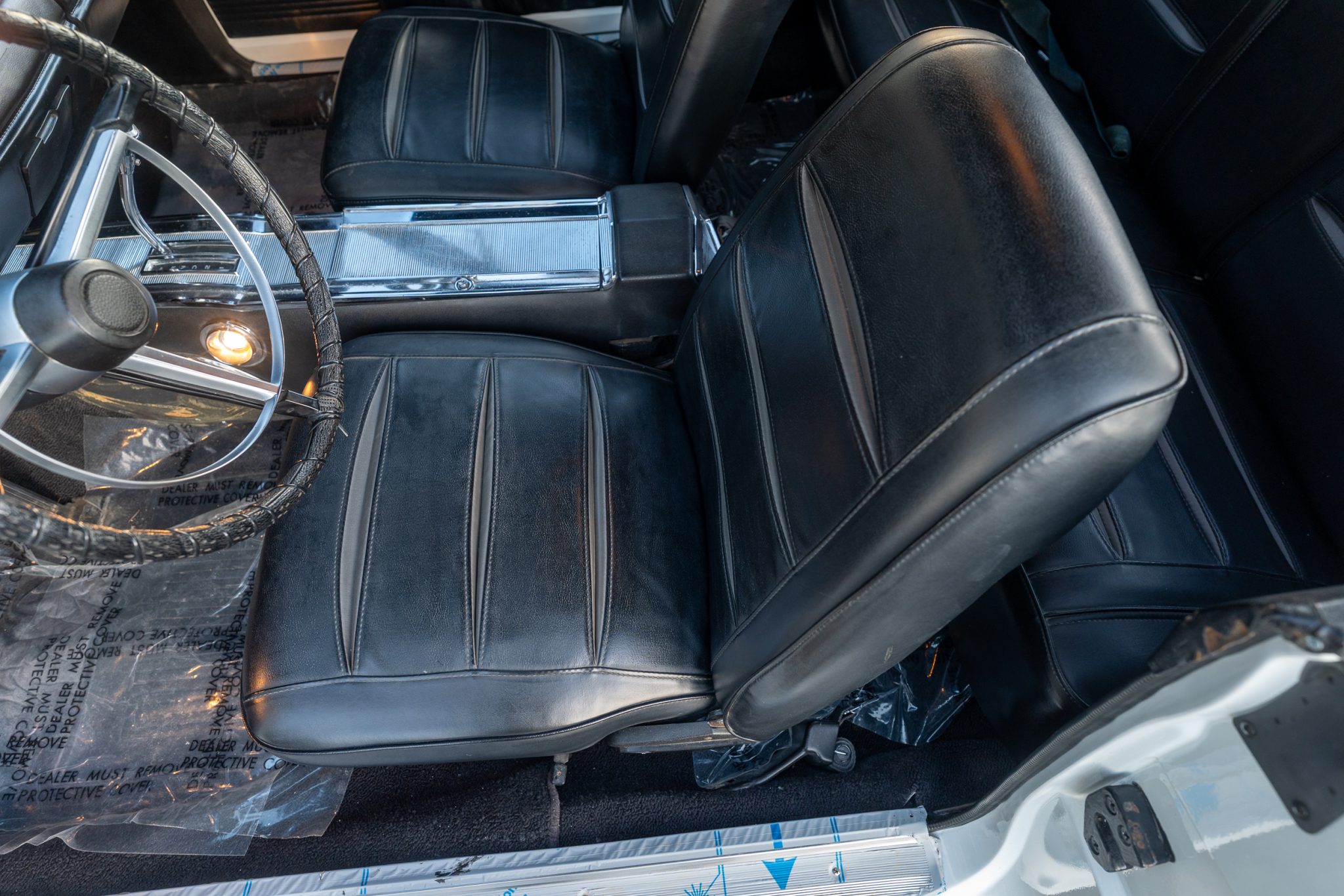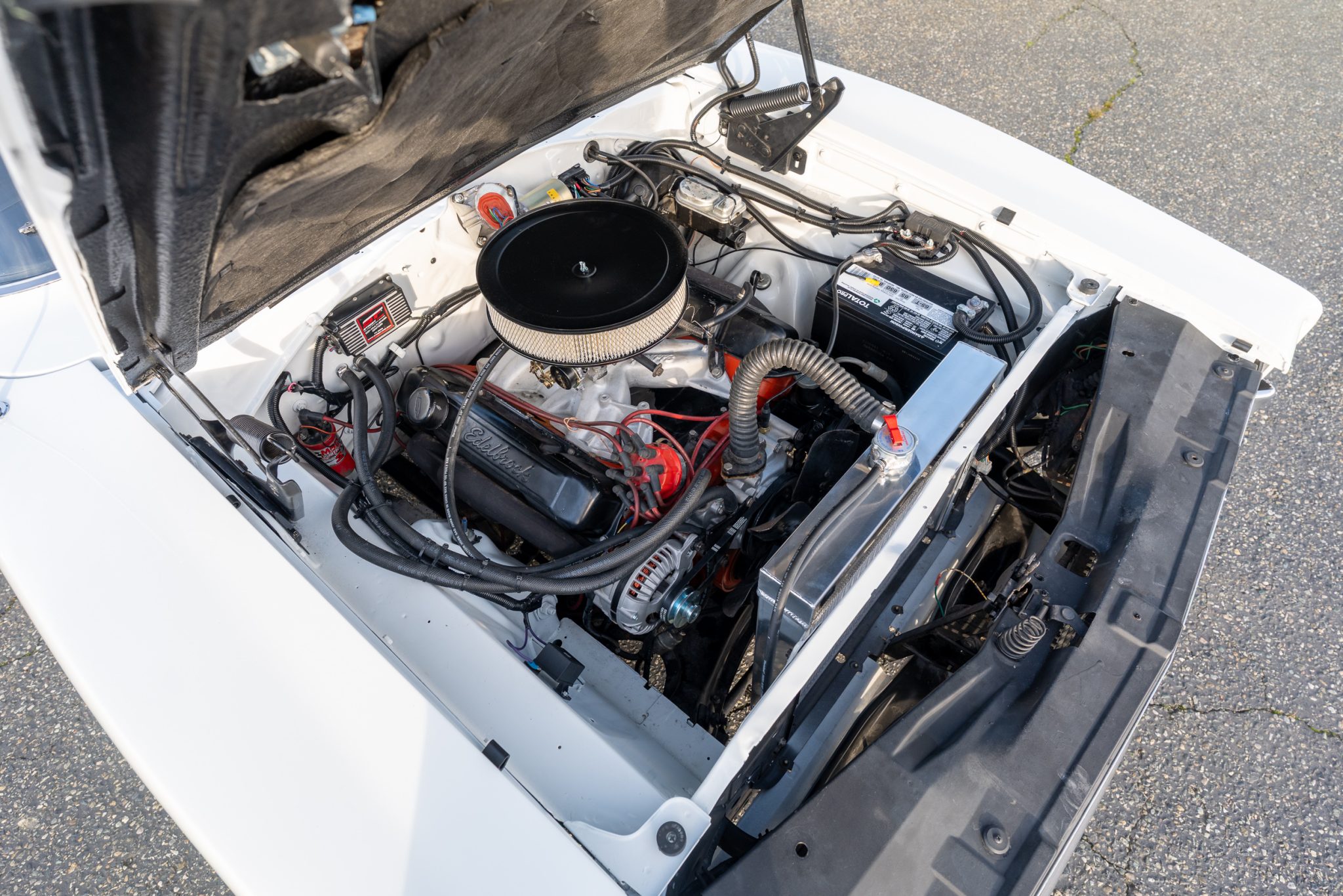 A subsequent refurbishment was conducted between 2022 and 2025 with work that involved repainting the car in white, replacing the black vinyl roof, retrimming the black vinyl seats, and rebuilding the 440ci V8. The engine is complemented by an Edelbrock intake manifold, an Edelbrock carburetor, an aftermarket camshaft, an aluminum radiator, and a Flowmaster exhaust system. Other equipment includes a Sure Grip differential, American Racing 15″ Magnum 500–style wheels, front disc brakes, power steering, and a center console.