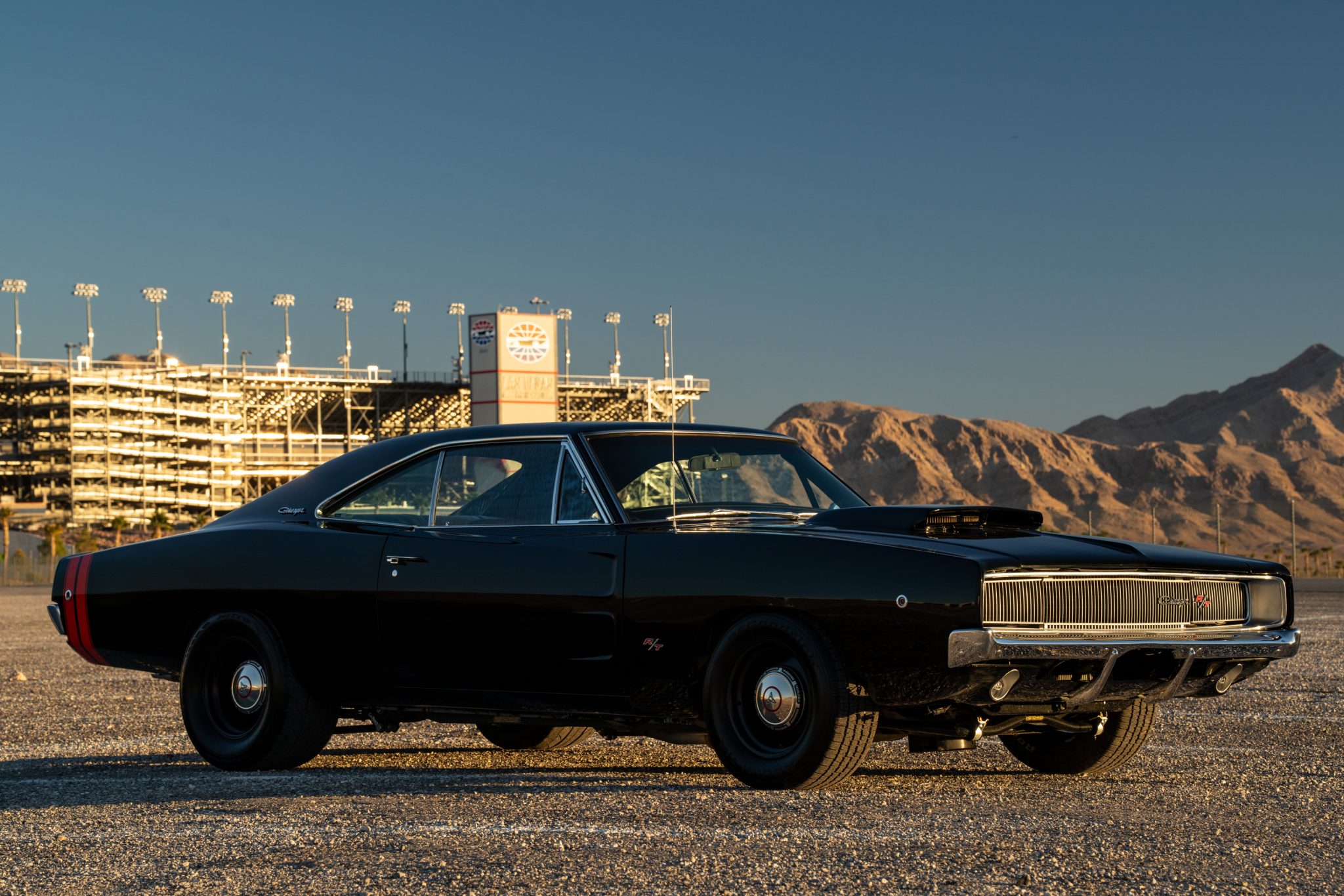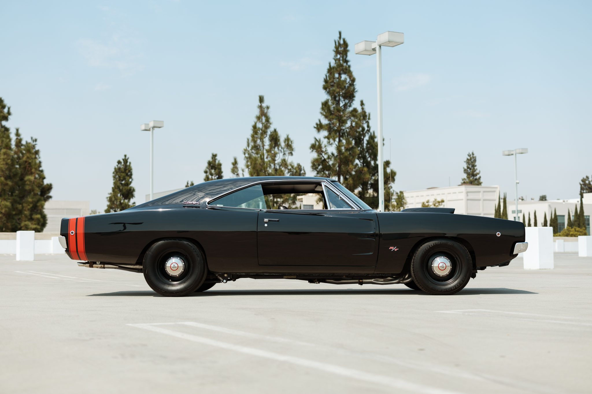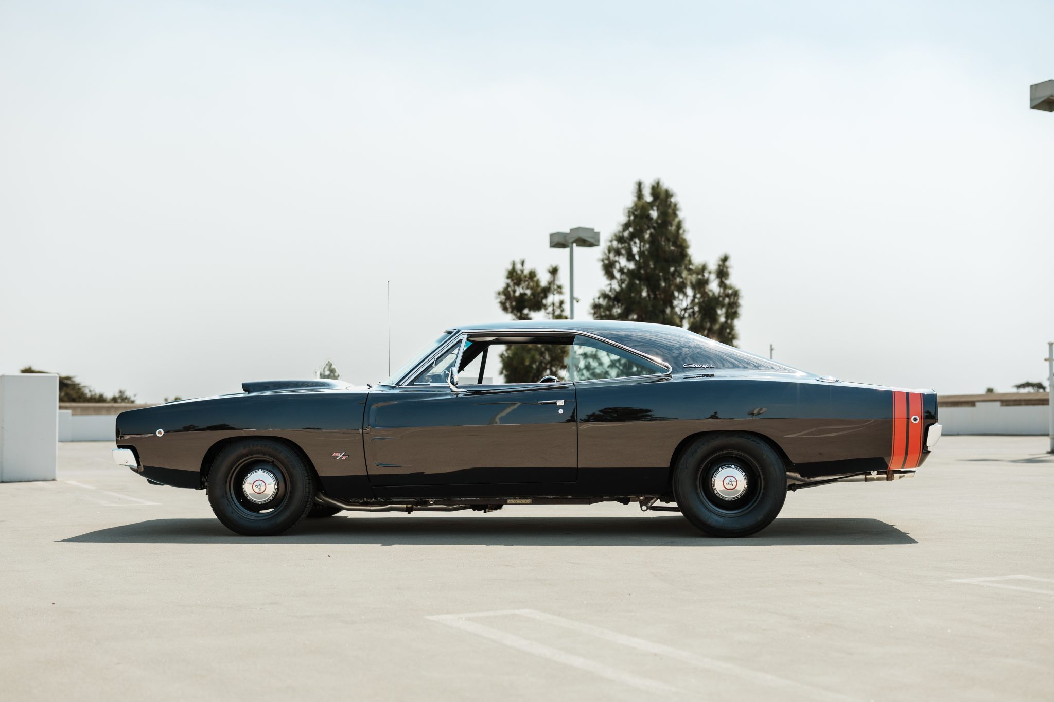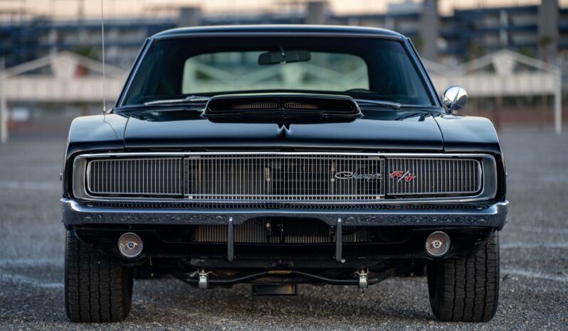 This 1968 Dodge Charger underwent a multi-year build in the style of an R/T example that included installing a 528ci Hemi V8 that utilizes a Callies iron block, a forged rotating assembly, a hydraulic roller camshaft, Edelbrock aluminum heads, and a 950-cfm carburetor. Power is routed through a high-performance TorqueFlite 727 three-speed automatic transmission and a Strange Engineering Dana 60 rear end, and the car rides on a Hotchkis TVS suspension kit. Traction is aided by subframe connectors, CalTracs traction bars, and Nitto drag radials out back, and Wilwood four-wheel discs handle stopping. The exterior features a Six Pack-style hood, LED lighting, and red transverse tail stripes over black paintwork, while the cabin is outfitted with a B&M shifter, Dakota Digital instrumentation, a Retrosound receiver, aftermarket audio components, and front bucket seats trimmed in black vinyl.