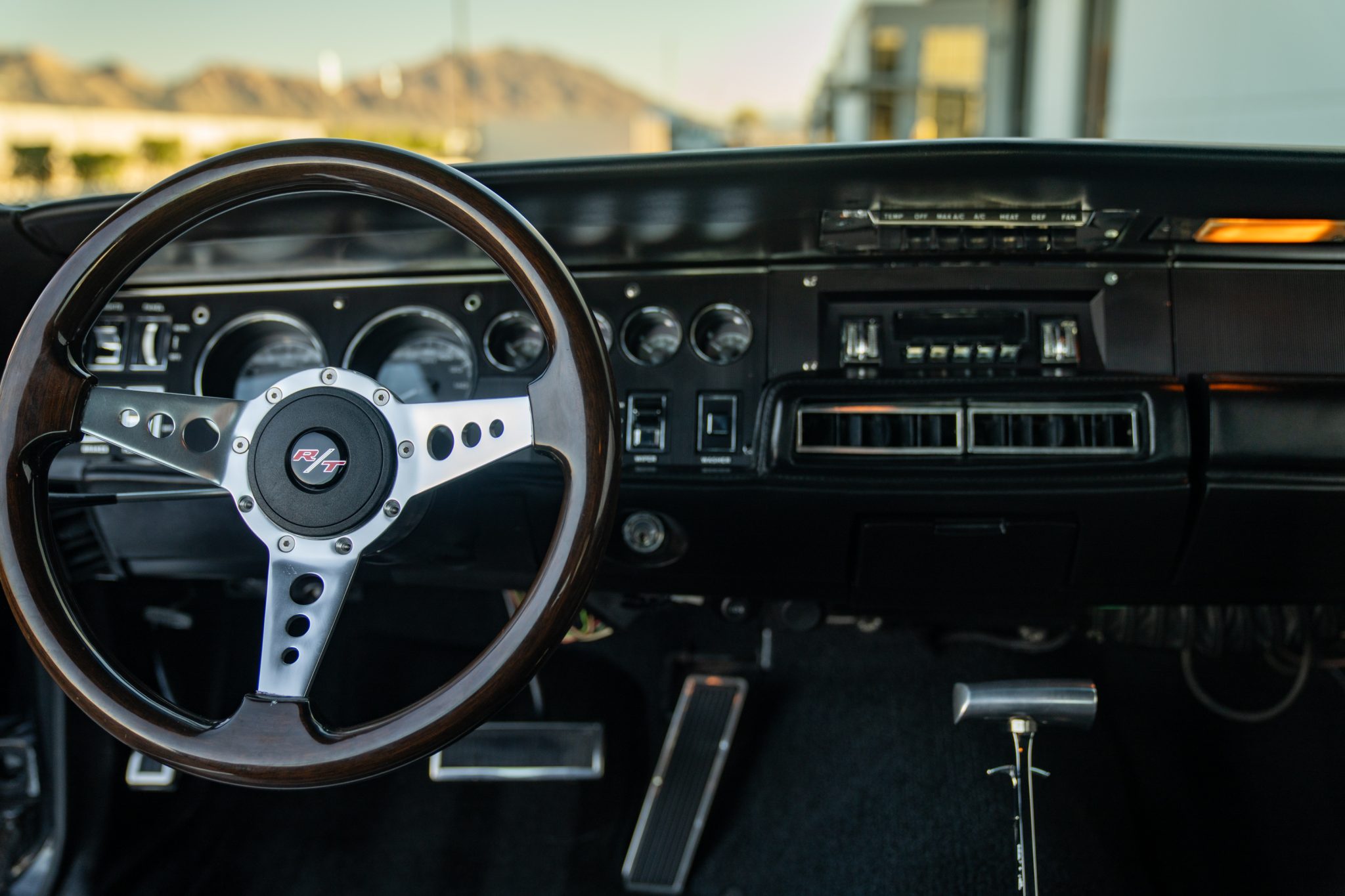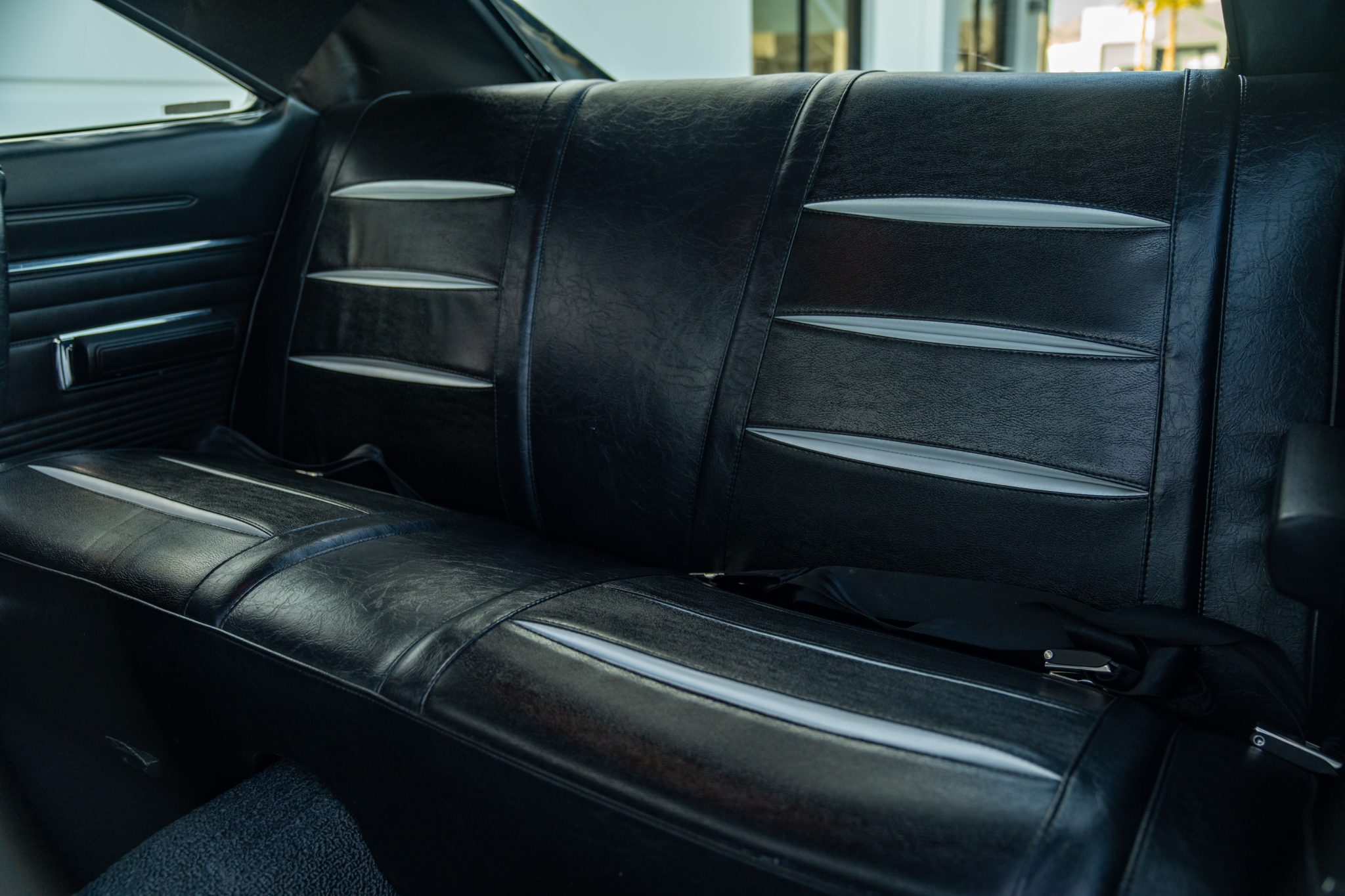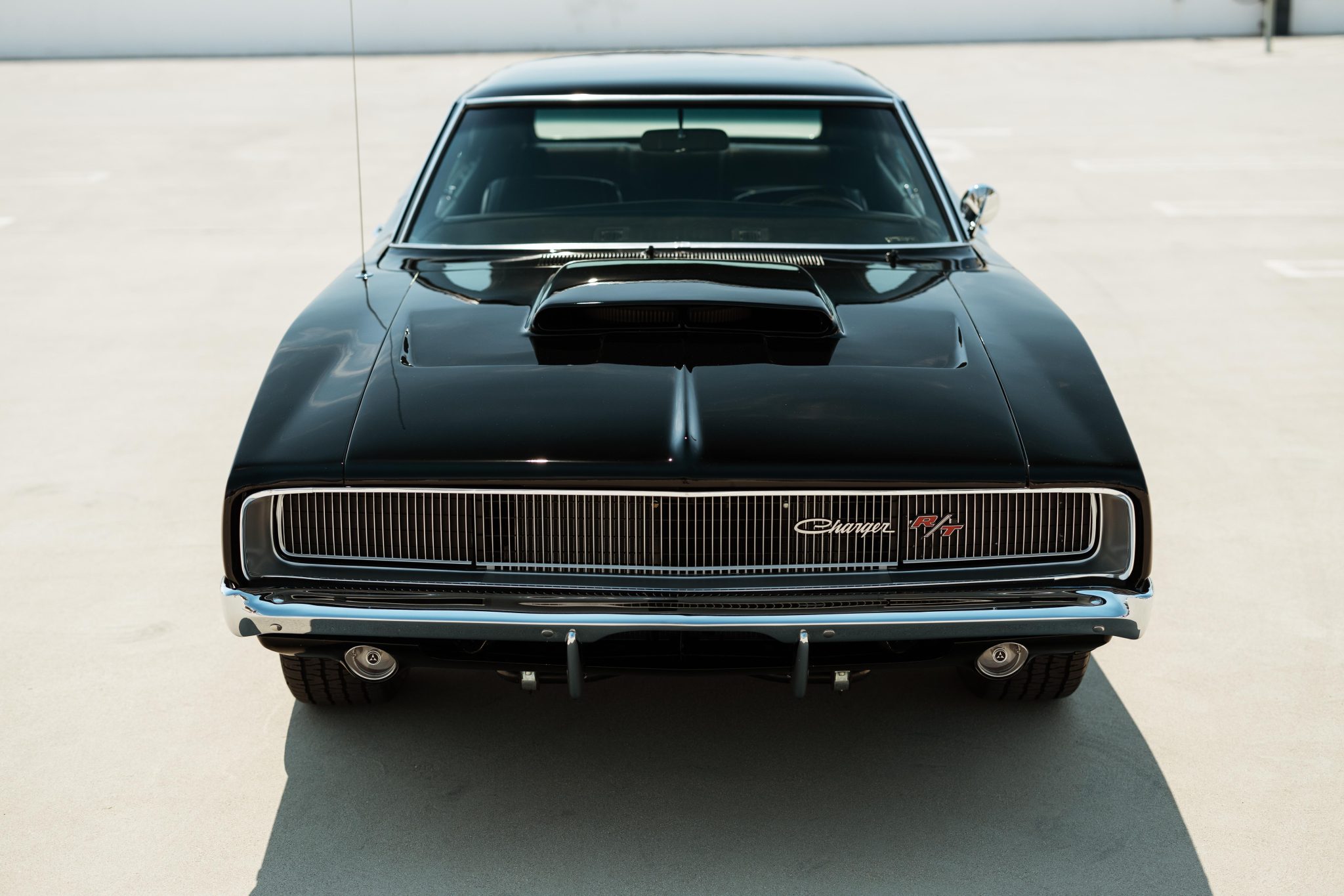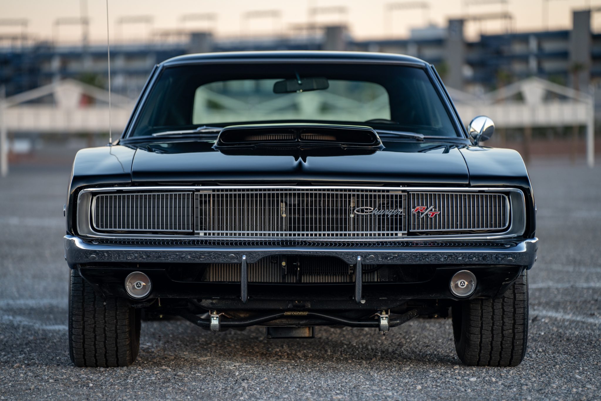 This 1968 Dodge Charger underwent a multi-year build in the style of an R/T example that included installing a 528ci Hemi V8 that utilizes a Callies iron block, a forged rotating assembly, a hydraulic roller camshaft, Edelbrock aluminum heads, and a 950-cfm carburetor. Power is routed through a high-performance TorqueFlite 727 three-speed automatic transmission and a Strange Engineering Dana 60 rear end, and the car rides on a Hotchkis TVS suspension kit. Traction is aided by subframe connectors, CalTracs traction bars, and Nitto drag radials out back, and Wilwood four-wheel discs handle stopping. The exterior features a Six Pack-style hood, LED lighting, and red transverse tail stripes over black paintwork, while the cabin is outfitted with a B&M shifter, Dakota Digital instrumentation, a Retrosound receiver, aftermarket audio components, and front bucket seats trimmed in black vinyl.