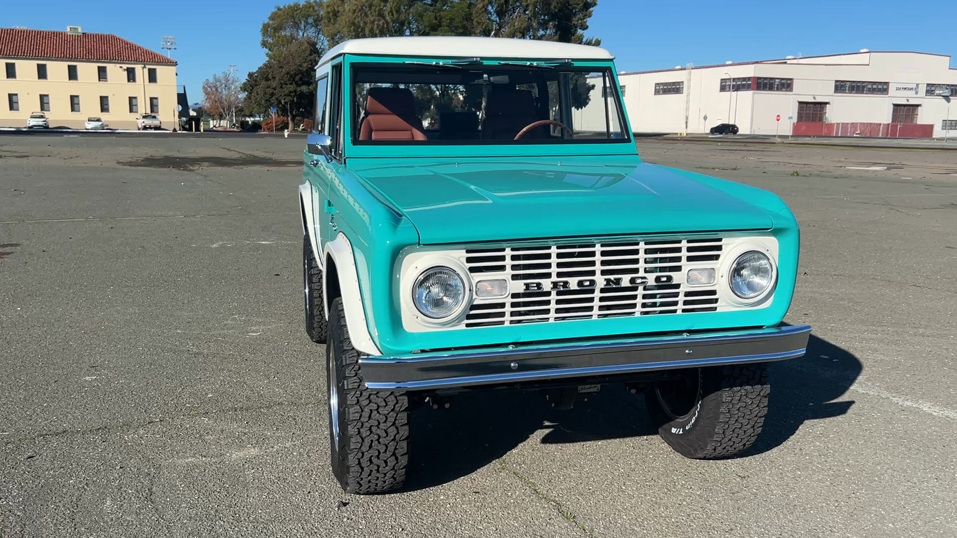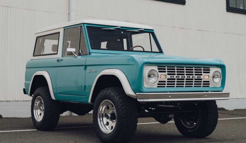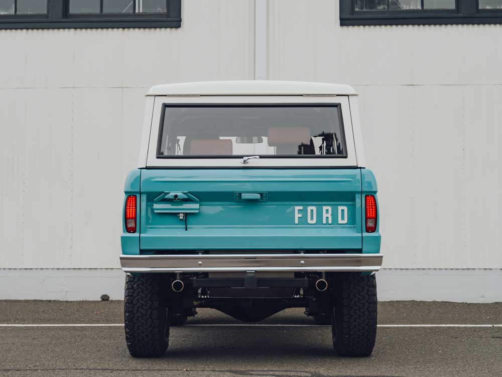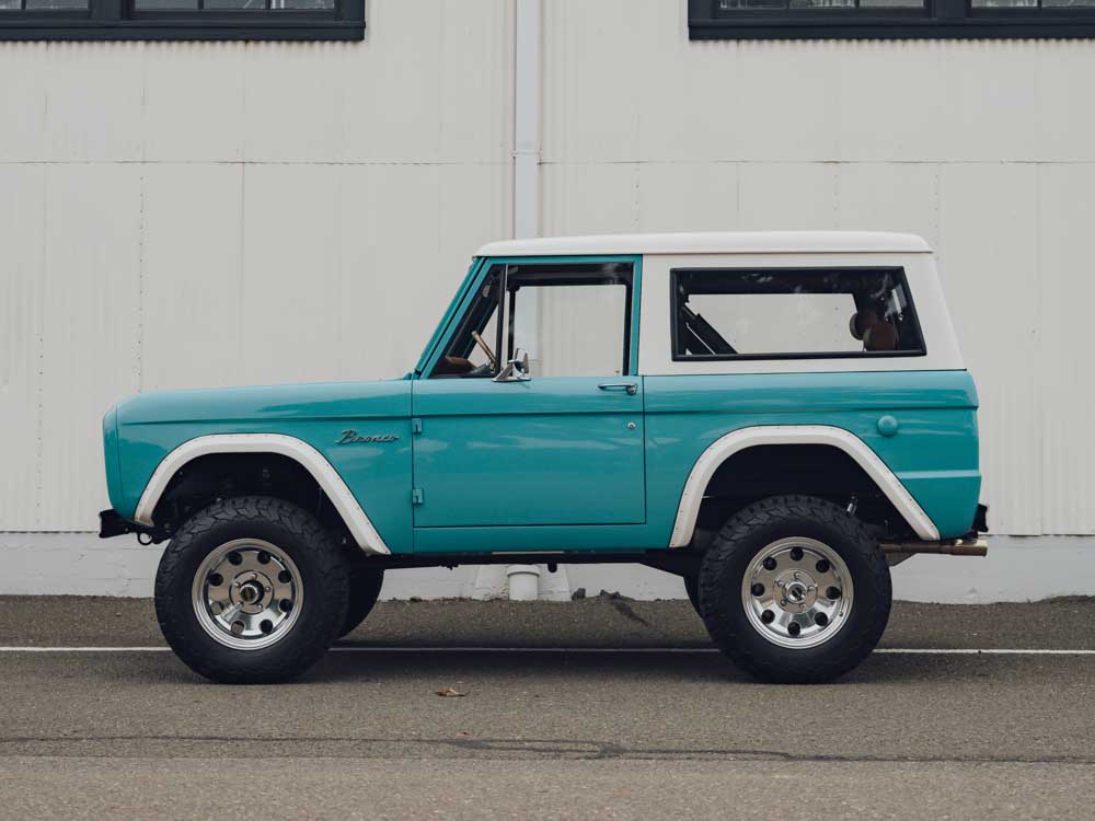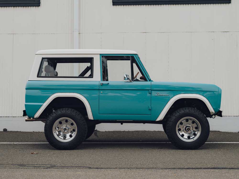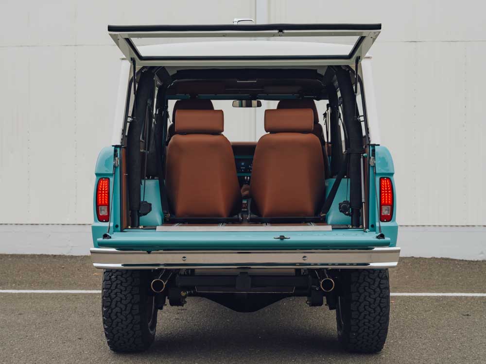 The build included the installation of a replacement body tub along with a 5.0-liter Gen 3 Coyote V8, a 10-speed automatic transmission, and an Atlas dual-range transfer case. Finished in Turquoise with a white hardtop and wheel arch extensions, the Bronco features Italian brown leather upholstery and rides on 18″ Method wheels. Additional highlights include four-wheel disc brakes, a custom three-link rear suspension, a roll bar, aftermarket front and rear bucket seats, air conditioning, power windows and door locks, a wireless charging dock, and a touchscreen stereo system.