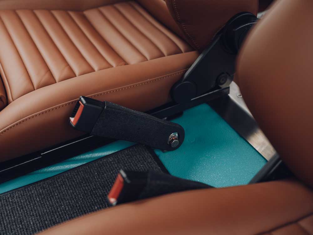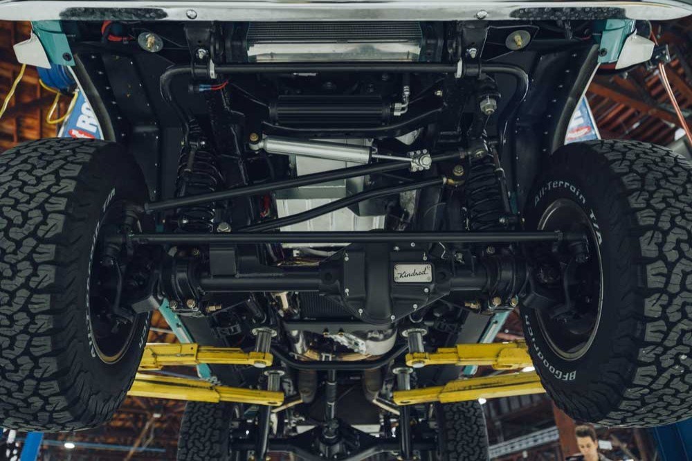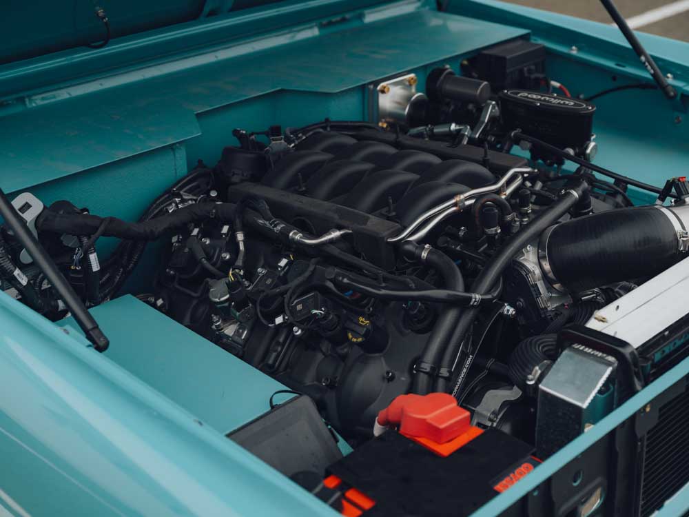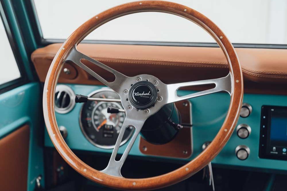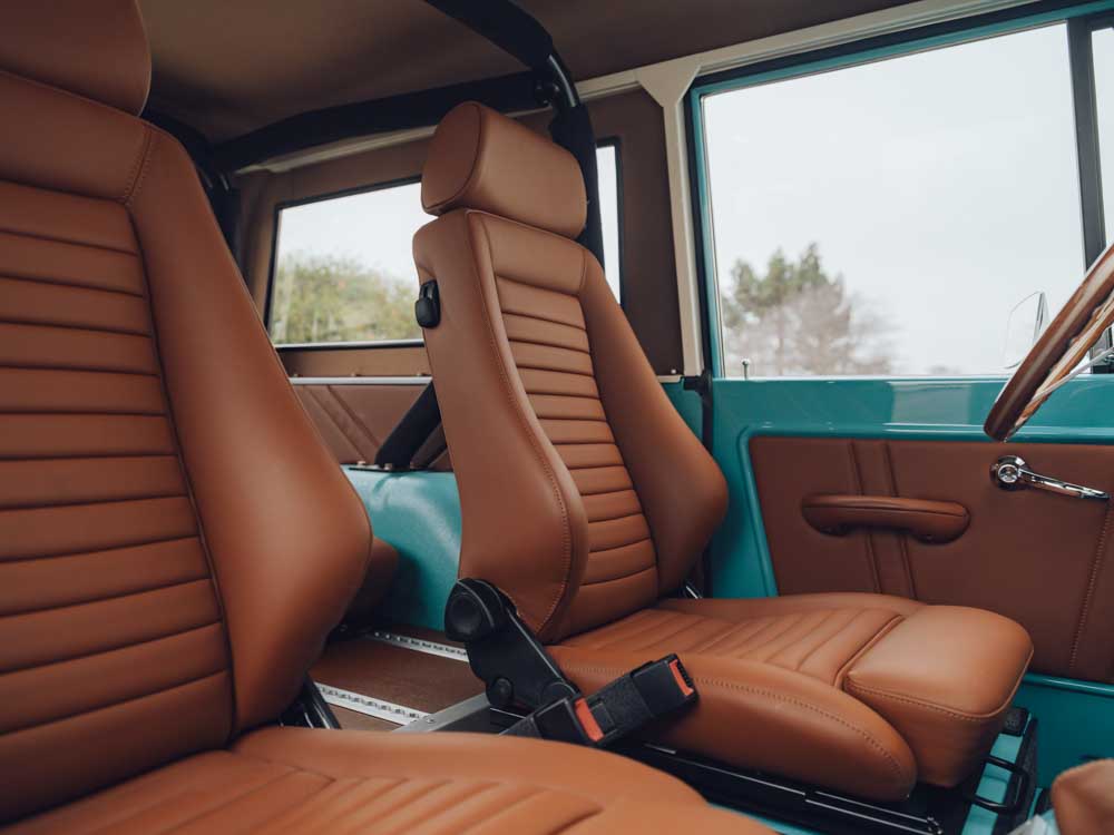 The build included the installation of a replacement body tub along with a 5.0-liter Gen 3 Coyote V8, a 10-speed automatic transmission, and an Atlas dual-range transfer case. Finished in Turquoise with a white hardtop and wheel arch extensions, the Bronco features Italian brown leather upholstery and rides on 18″ Method wheels. Additional highlights include four-wheel disc brakes, a custom three-link rear suspension, a roll bar, aftermarket front and rear bucket seats, air conditioning, power windows and door locks, a wireless charging dock, and a touchscreen stereo system.