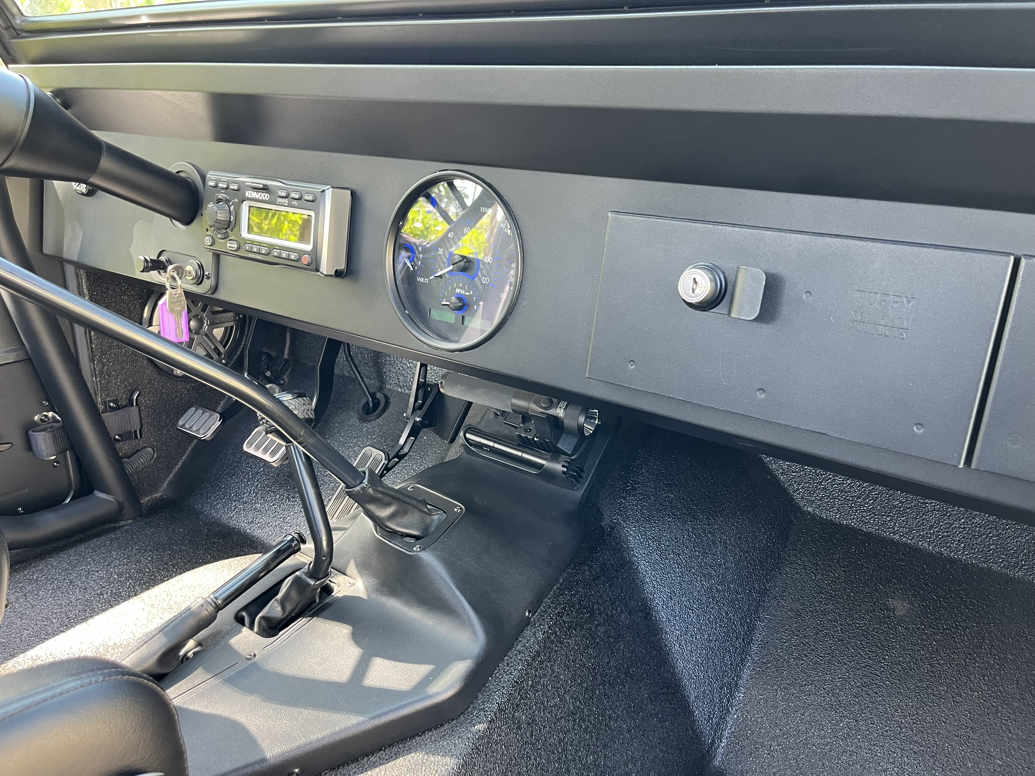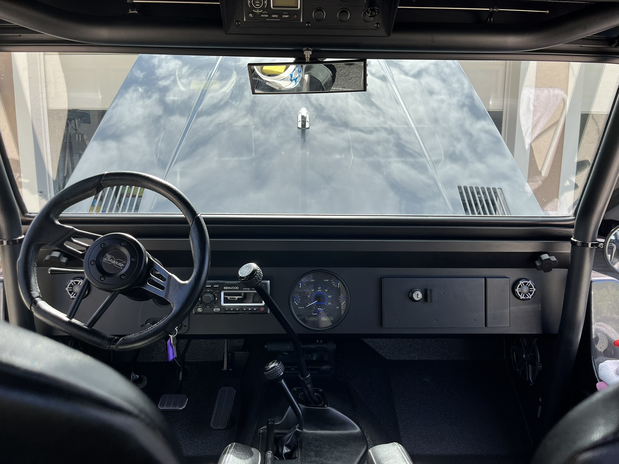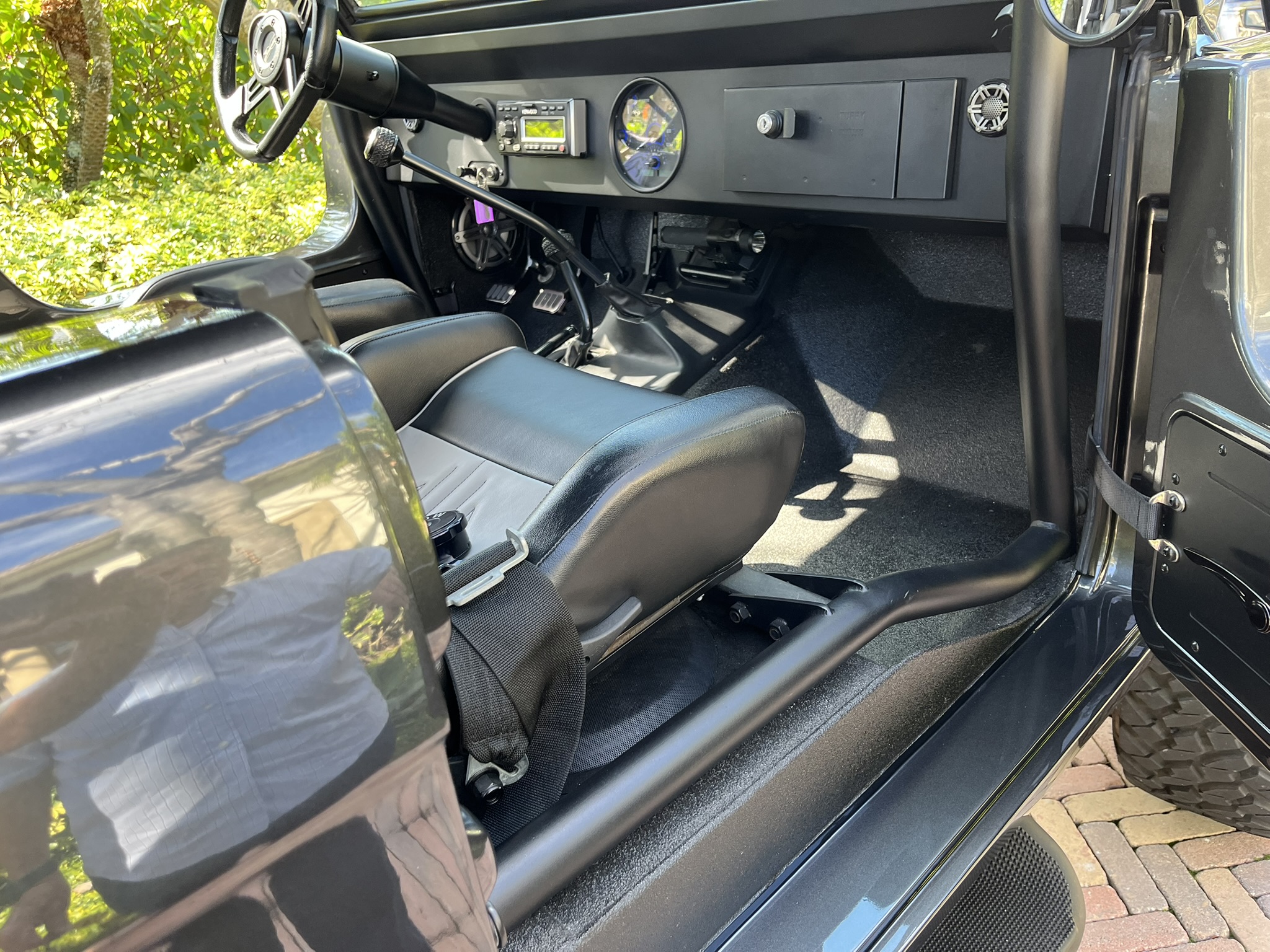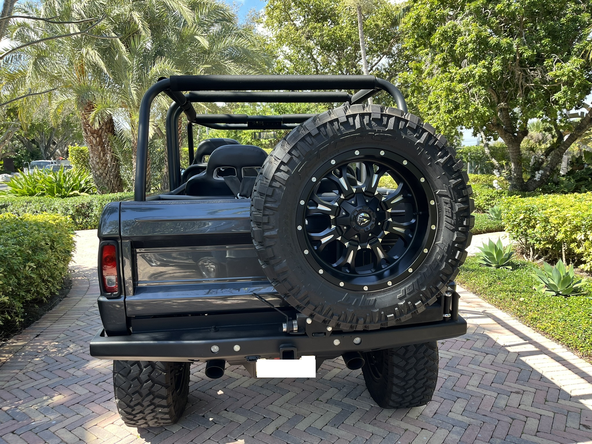 It is finished in Charcoal Metallic over black and white upholstery and is powered by a fuel-injected 351ci V8 linked to a New Venture 4500 five-speed manual transmission, a dual-range transfer case, a Dana 44 front axle, and a nine-inch rear axle. Modifications include a 5.5″ suspension lift, a body lift, a Warn front winch, a light bar, four-wheel disc brakes, LED headlights, side steps, and a family-style roll cage. The truck is also equipped with limited-slip front and rear differentials, 20″ Fuel wheels, manually locking front hubs, a bikini soft top, a custom audio system with a Kenwood media receiver.