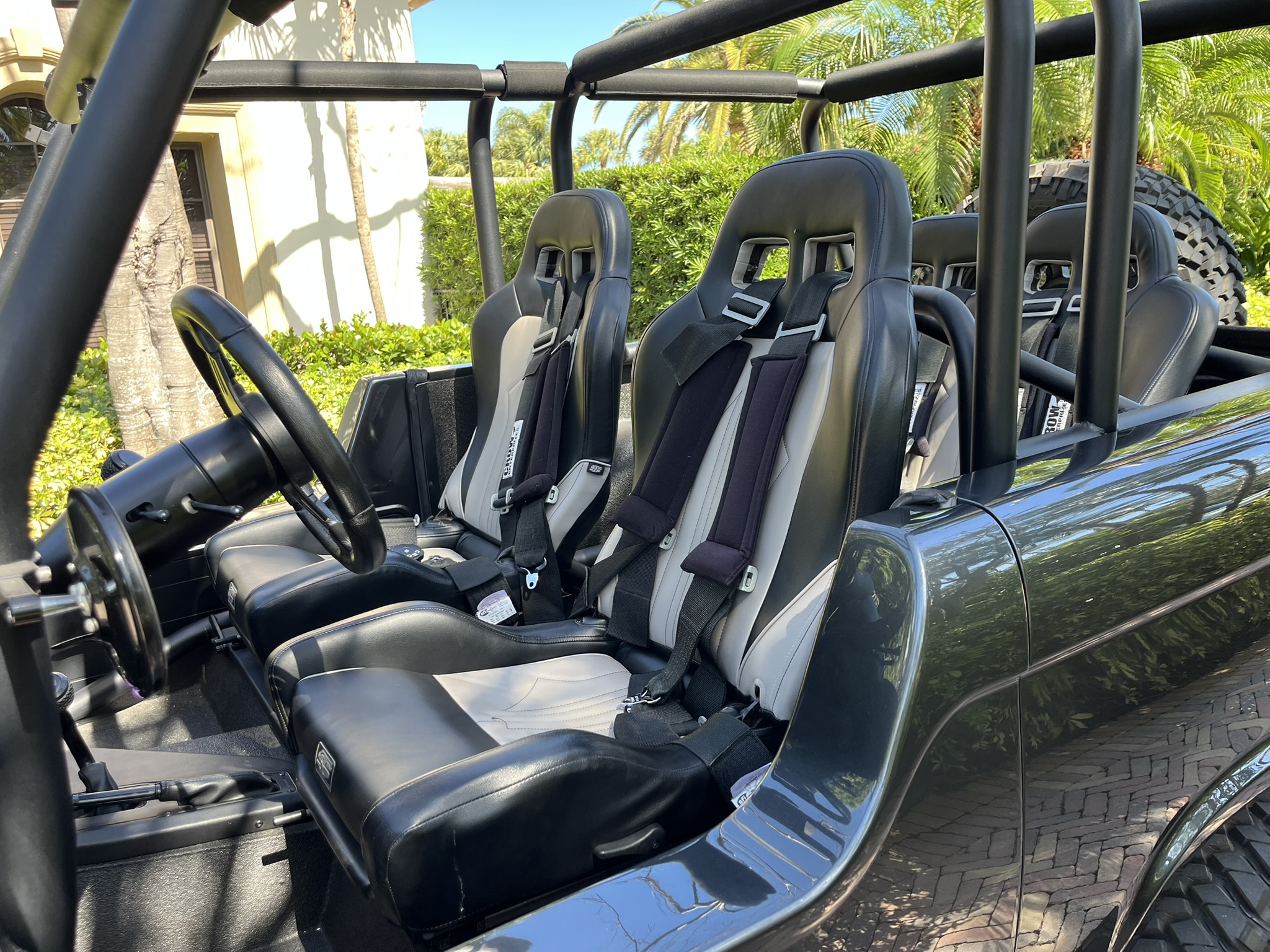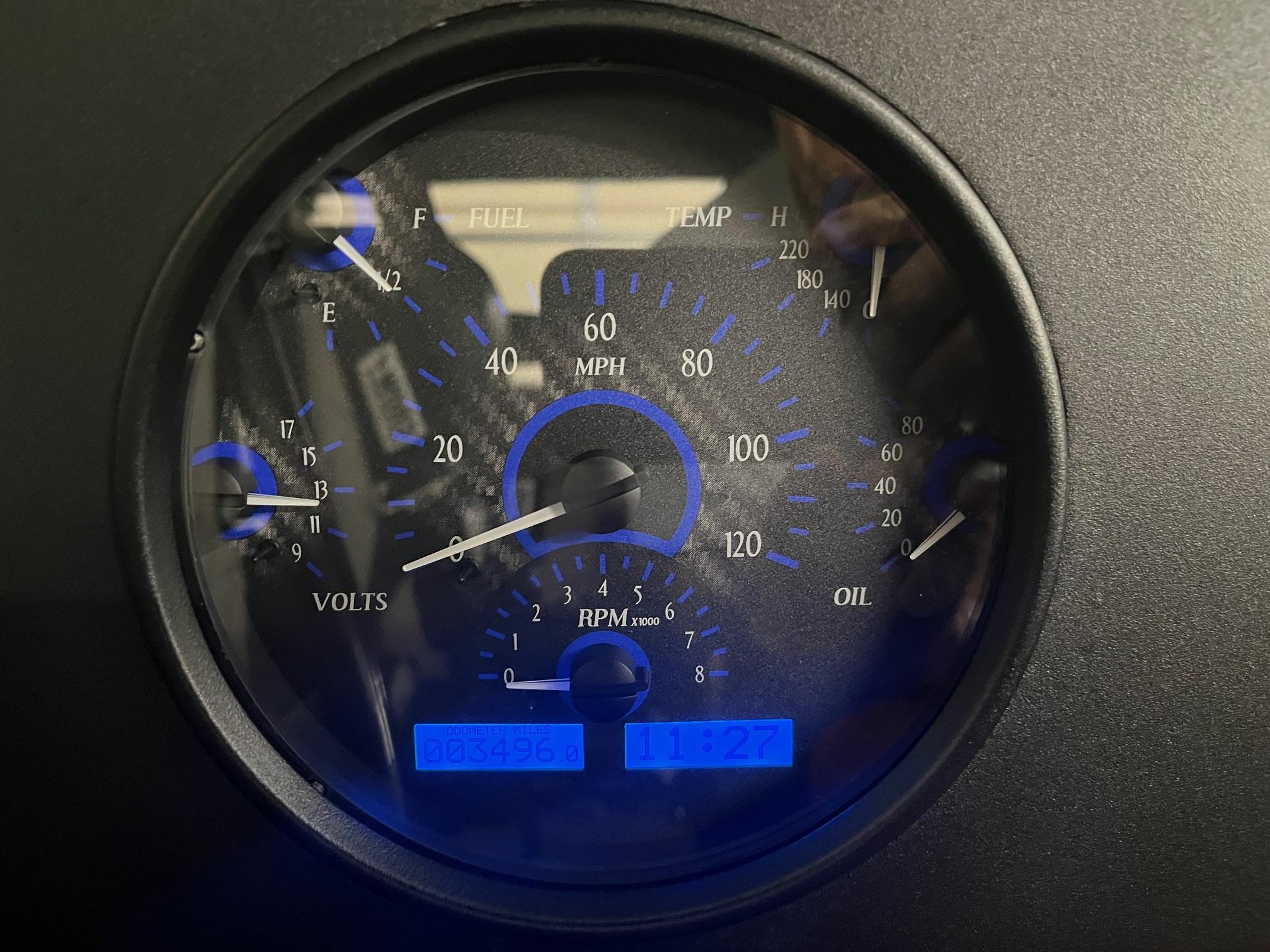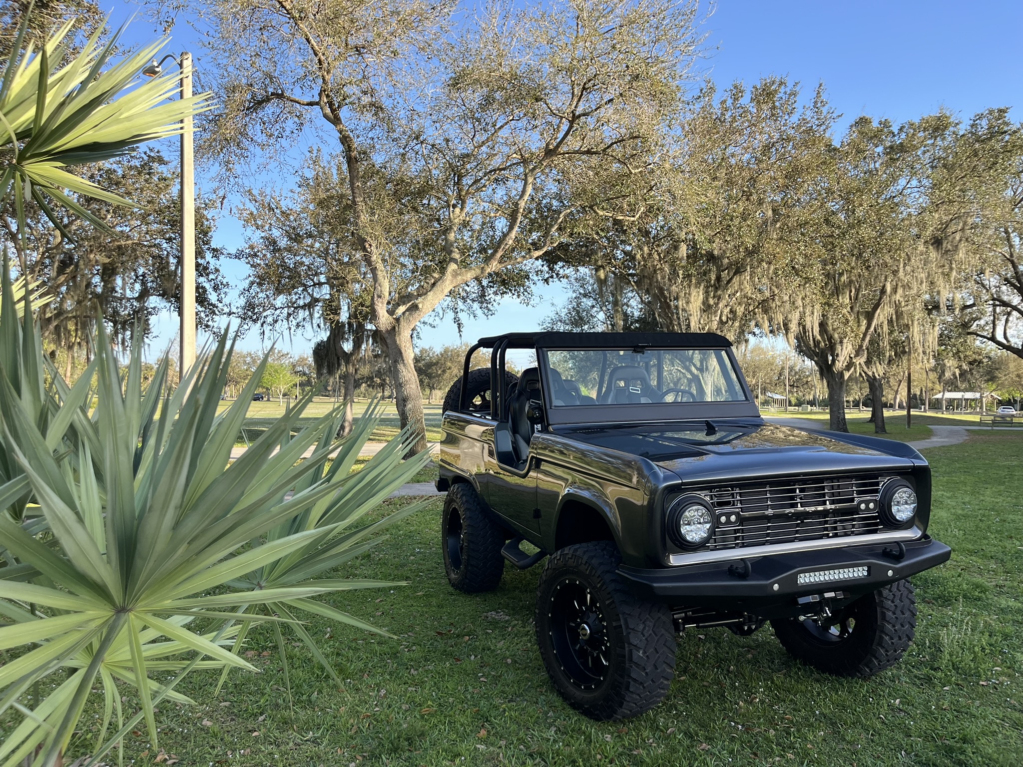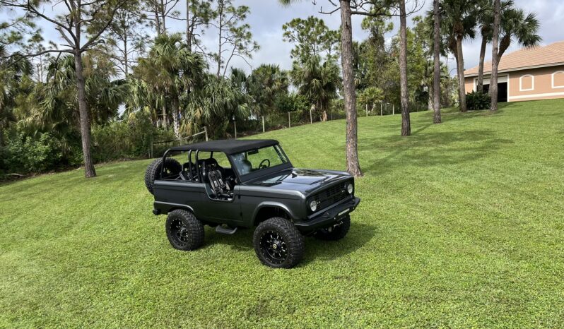 It is finished in Charcoal Metallic over black and white upholstery and is powered by a fuel-injected 351ci V8 linked to a New Venture 4500 five-speed manual transmission, a dual-range transfer case, a Dana 44 front axle, and a nine-inch rear axle. Modifications include a 5.5″ suspension lift, a body lift, a Warn front winch, a light bar, four-wheel disc brakes, LED headlights, side steps, and a family-style roll cage. The truck is also equipped with limited-slip front and rear differentials, 20″ Fuel wheels, manually locking front hubs, a bikini soft top, a custom audio system with a Kenwood media receiver.