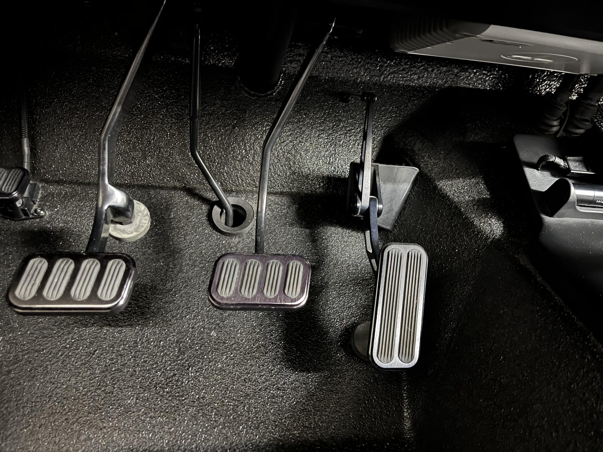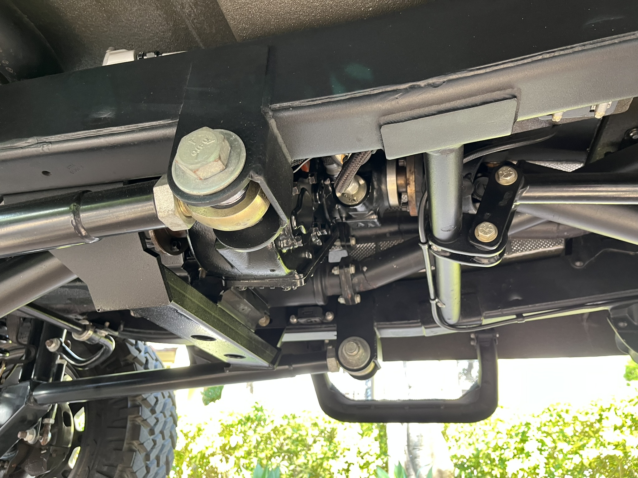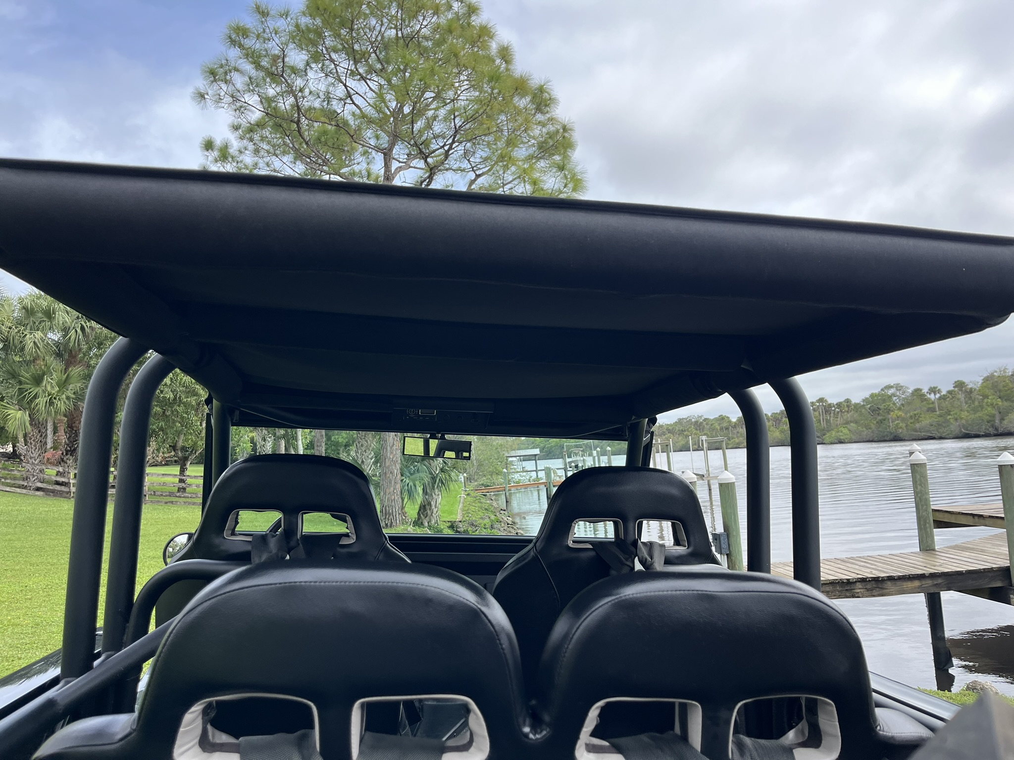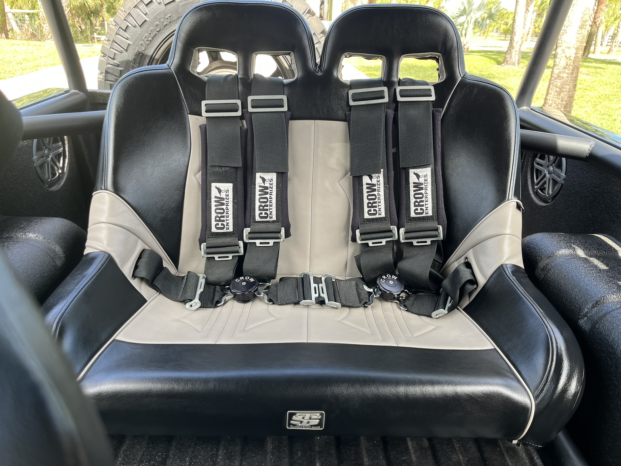 It is finished in Charcoal Metallic over black and white upholstery and is powered by a fuel-injected 351ci V8 linked to a New Venture 4500 five-speed manual transmission, a dual-range transfer case, a Dana 44 front axle, and a nine-inch rear axle. Modifications include a 5.5″ suspension lift, a body lift, a Warn front winch, a light bar, four-wheel disc brakes, LED headlights, side steps, and a family-style roll cage. The truck is also equipped with limited-slip front and rear differentials, 20″ Fuel wheels, manually locking front hubs, a bikini soft top, a custom audio system with a Kenwood media receiver.
