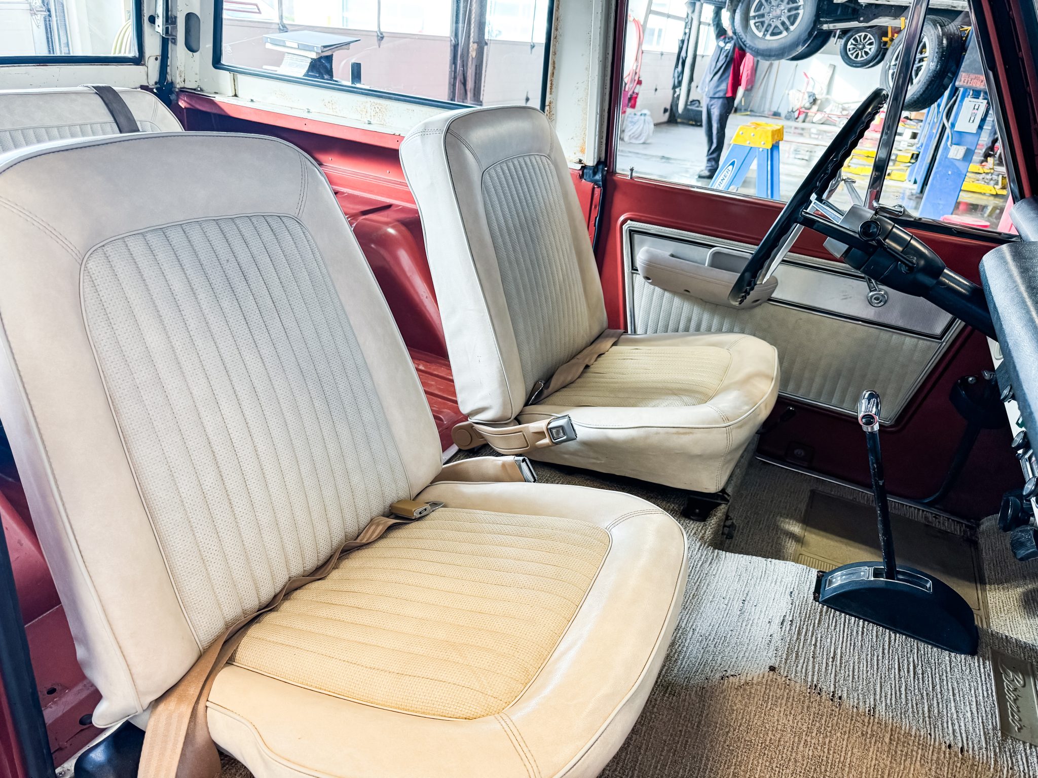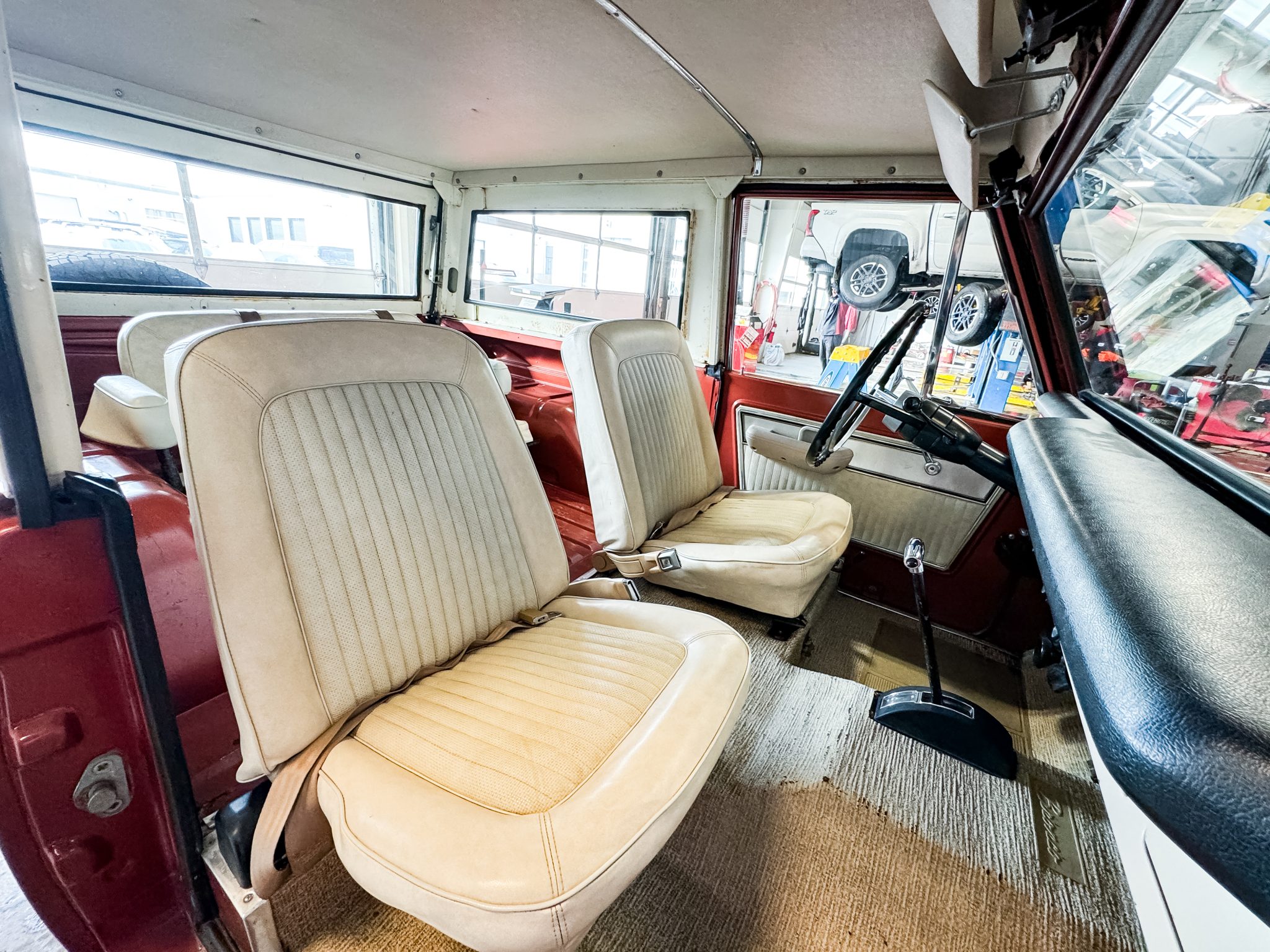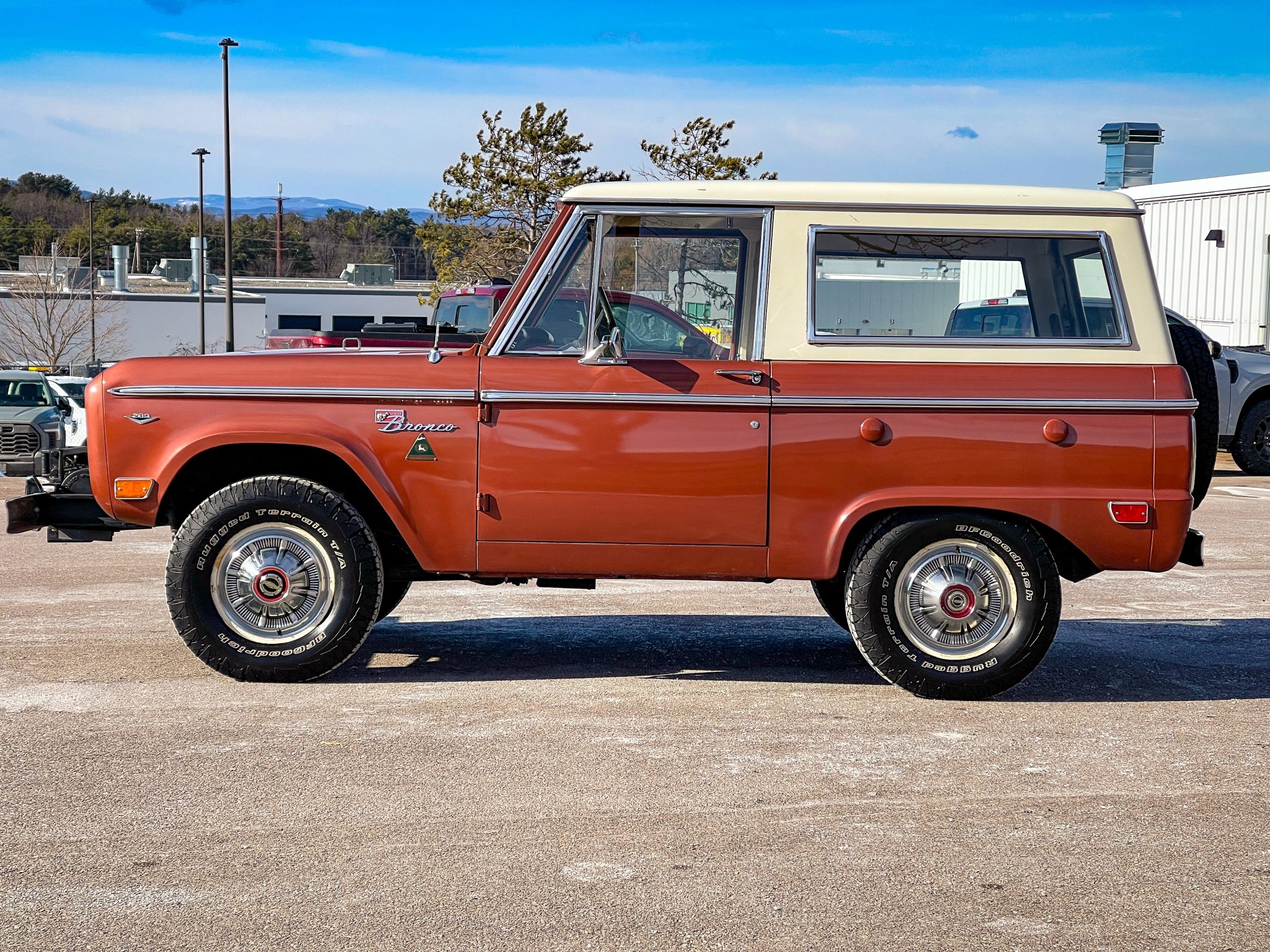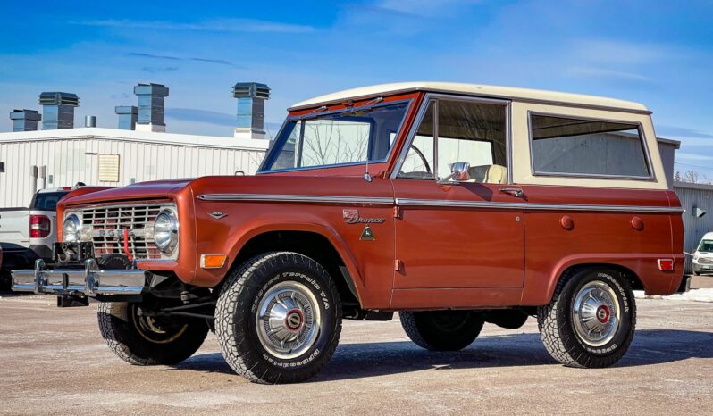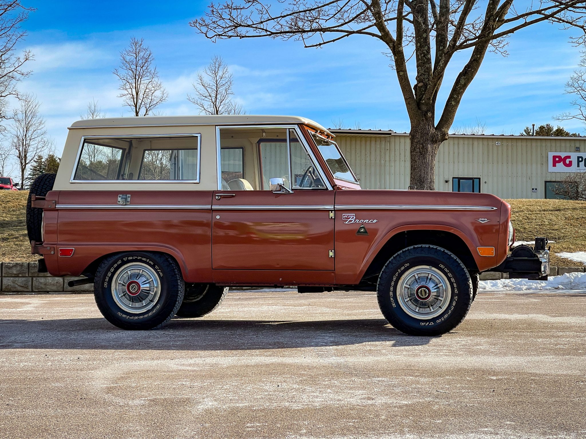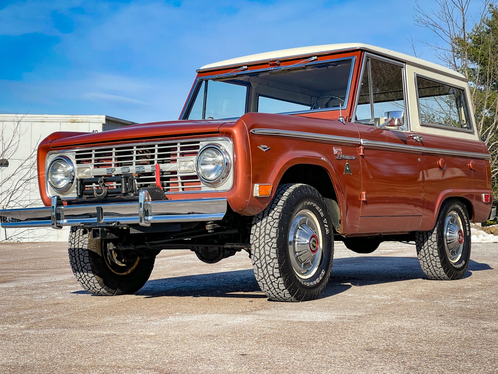 It is finished in Boulder Bronze over Parchment vinyl and powered by a 289ci V8 linked to a three-speed manual transmission, a dual-range transfer case, and a limited-slip rear differential. Equipment includes a white removable hardtop, a winch, white 15″ steel wheels, polished covers, an AM/FM radio, and a Holley carburetor