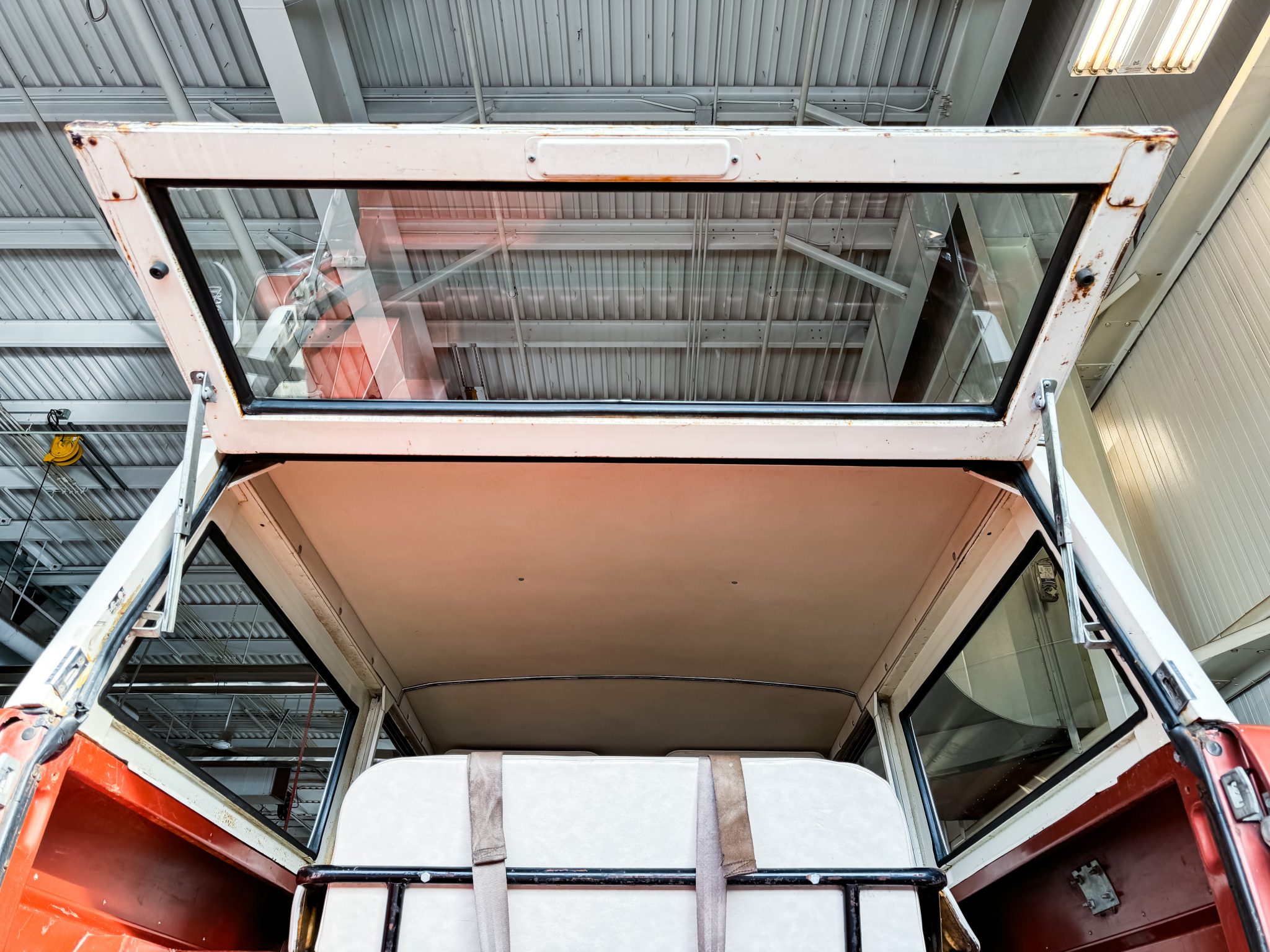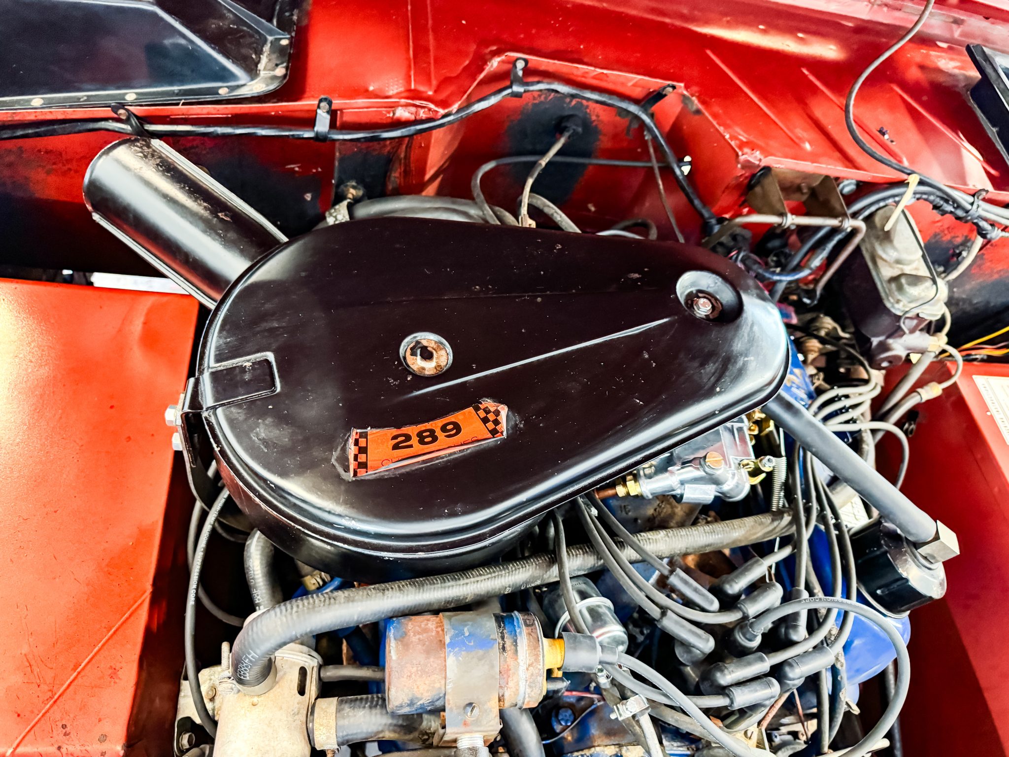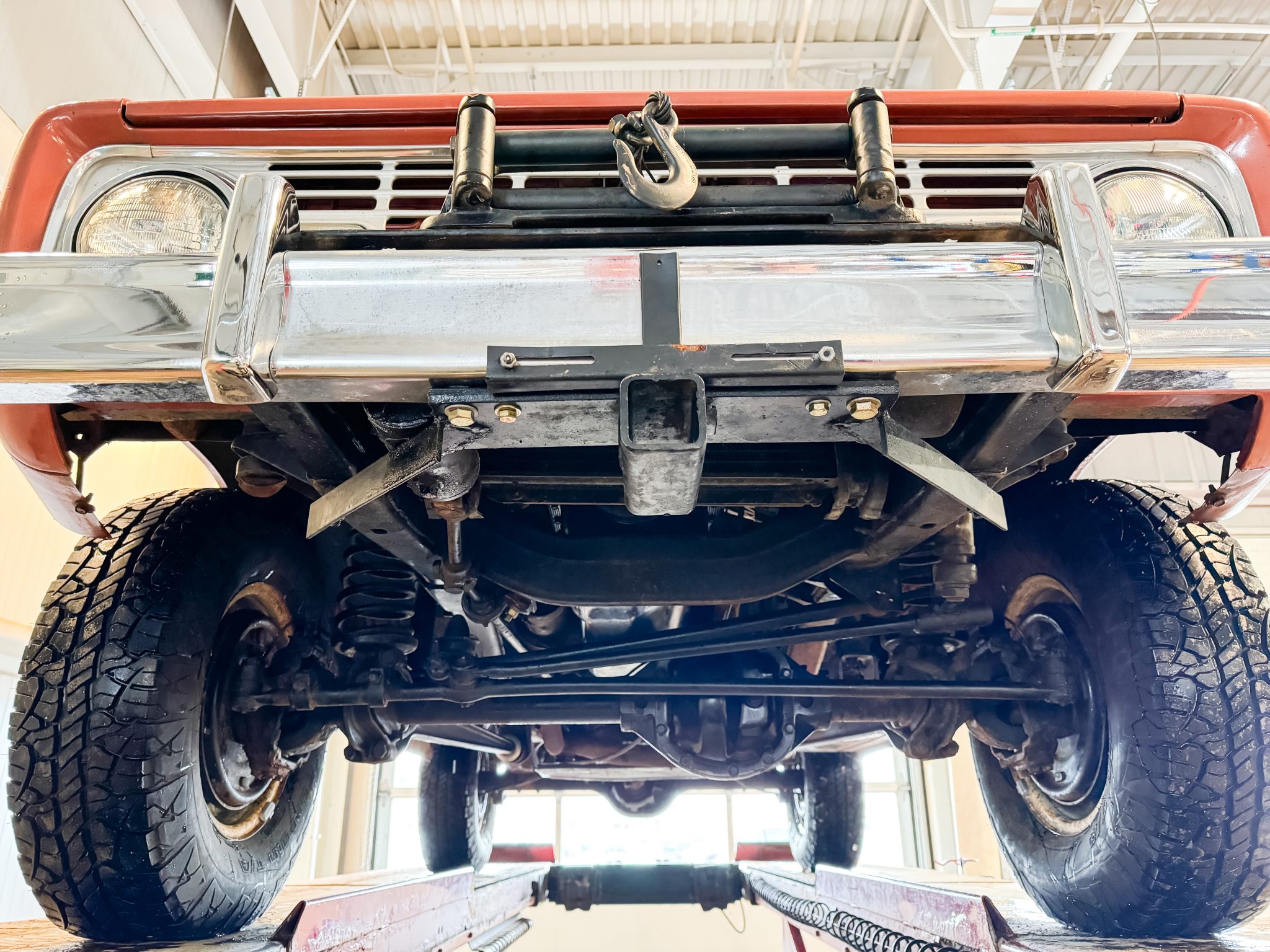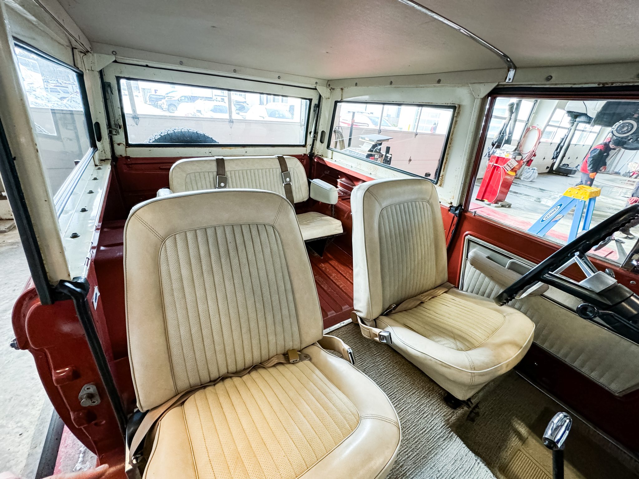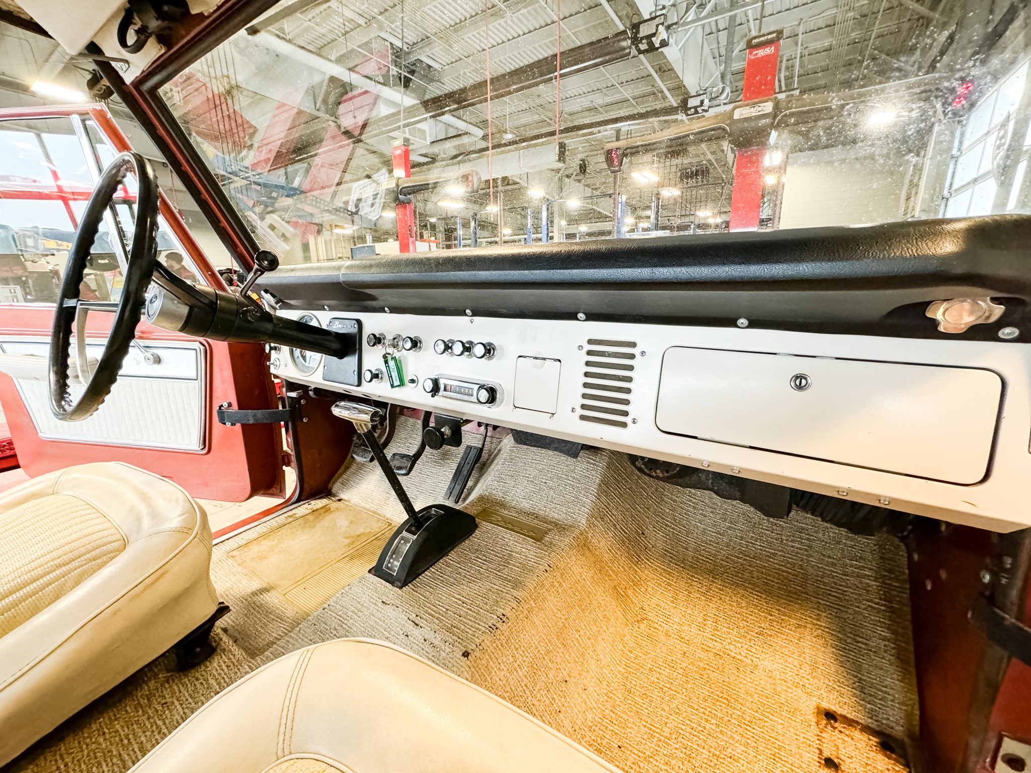 It is finished in Boulder Bronze over Parchment vinyl and powered by a 289ci V8 linked to a three-speed manual transmission, a dual-range transfer case, and a limited-slip rear differential. Equipment includes a white removable hardtop, a winch, white 15″ steel wheels, polished covers, an AM/FM radio, and a Holley carburetor