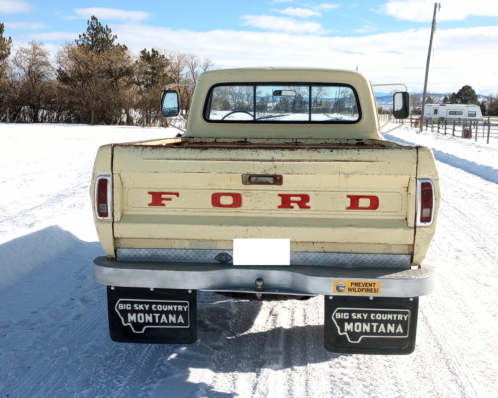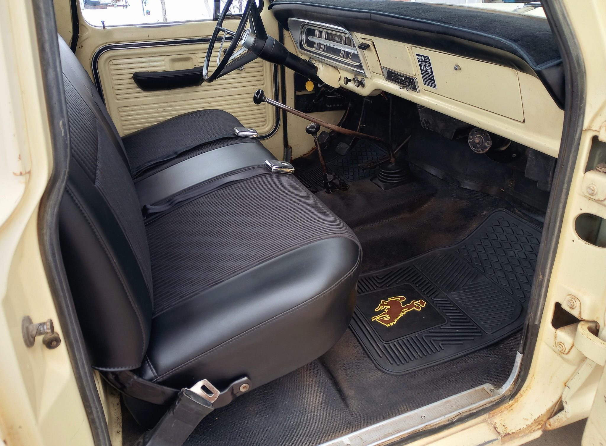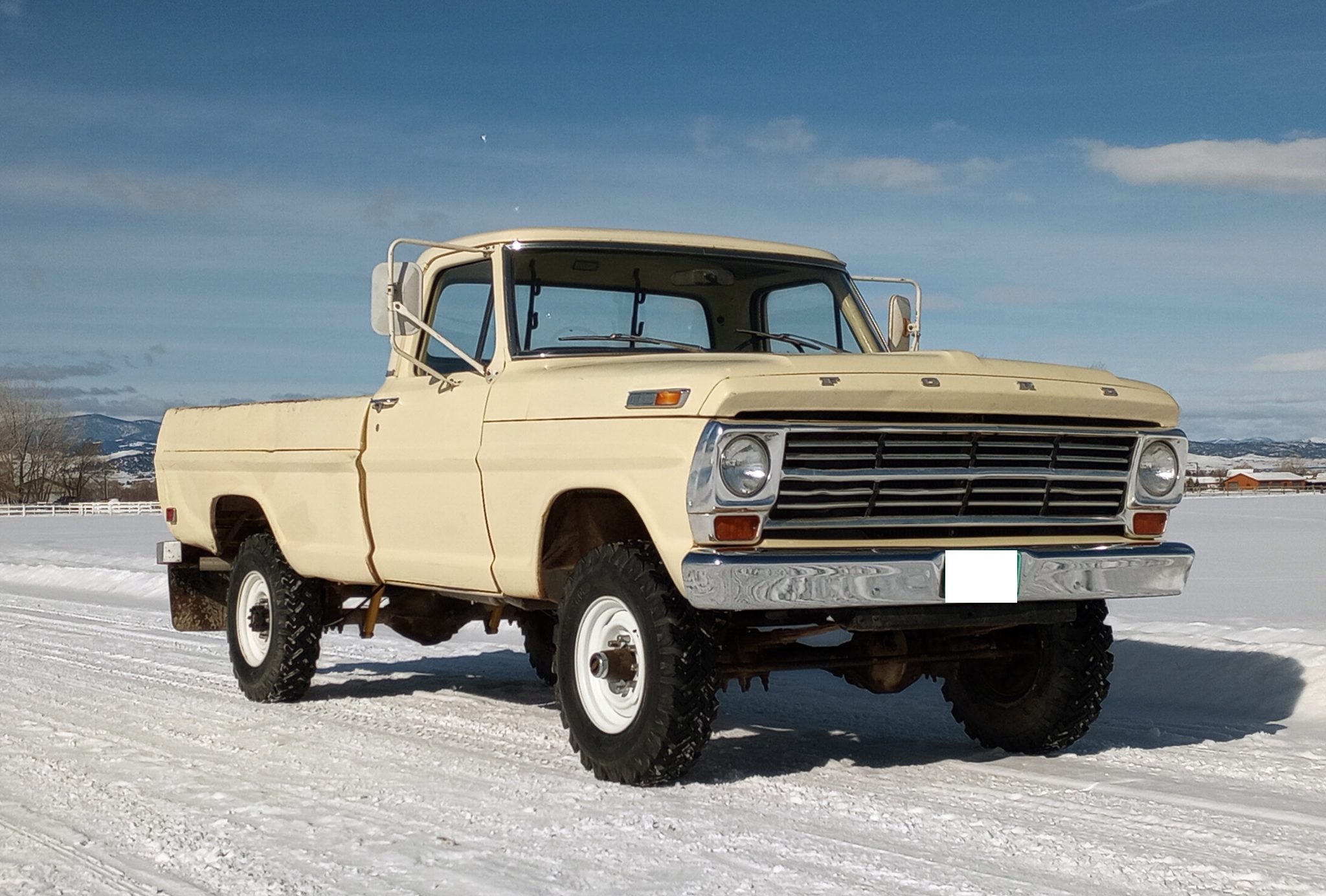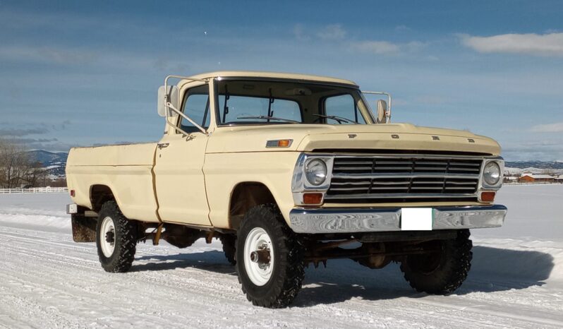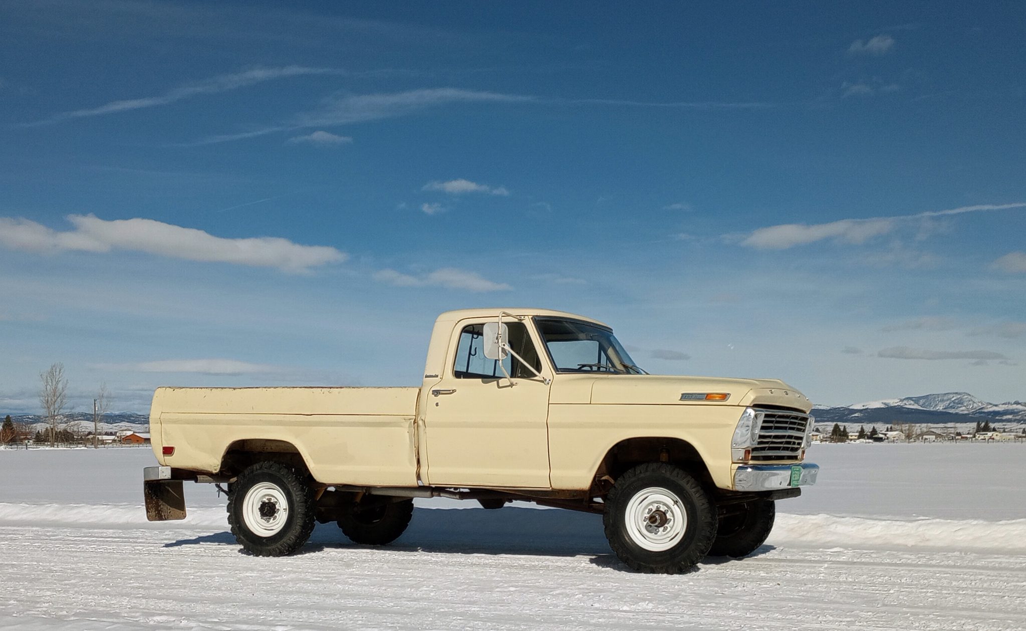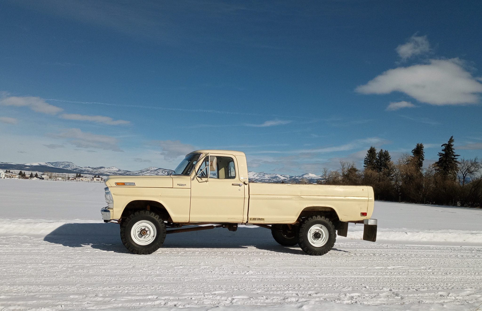 It is finished in Meadowlark Yellow over black vinyl and cloth and is powered by a 360ci V8 linked to a four-speed manual transmission and a dual-range transfer case. The truck features Western mirrors, white 16″ steel wheels, and Warn manually locking front hubs.