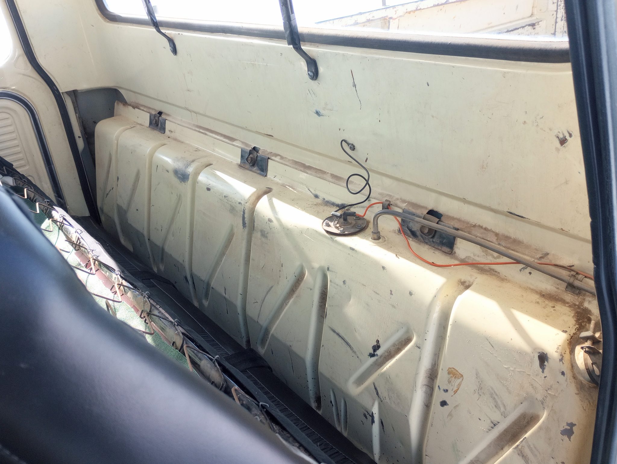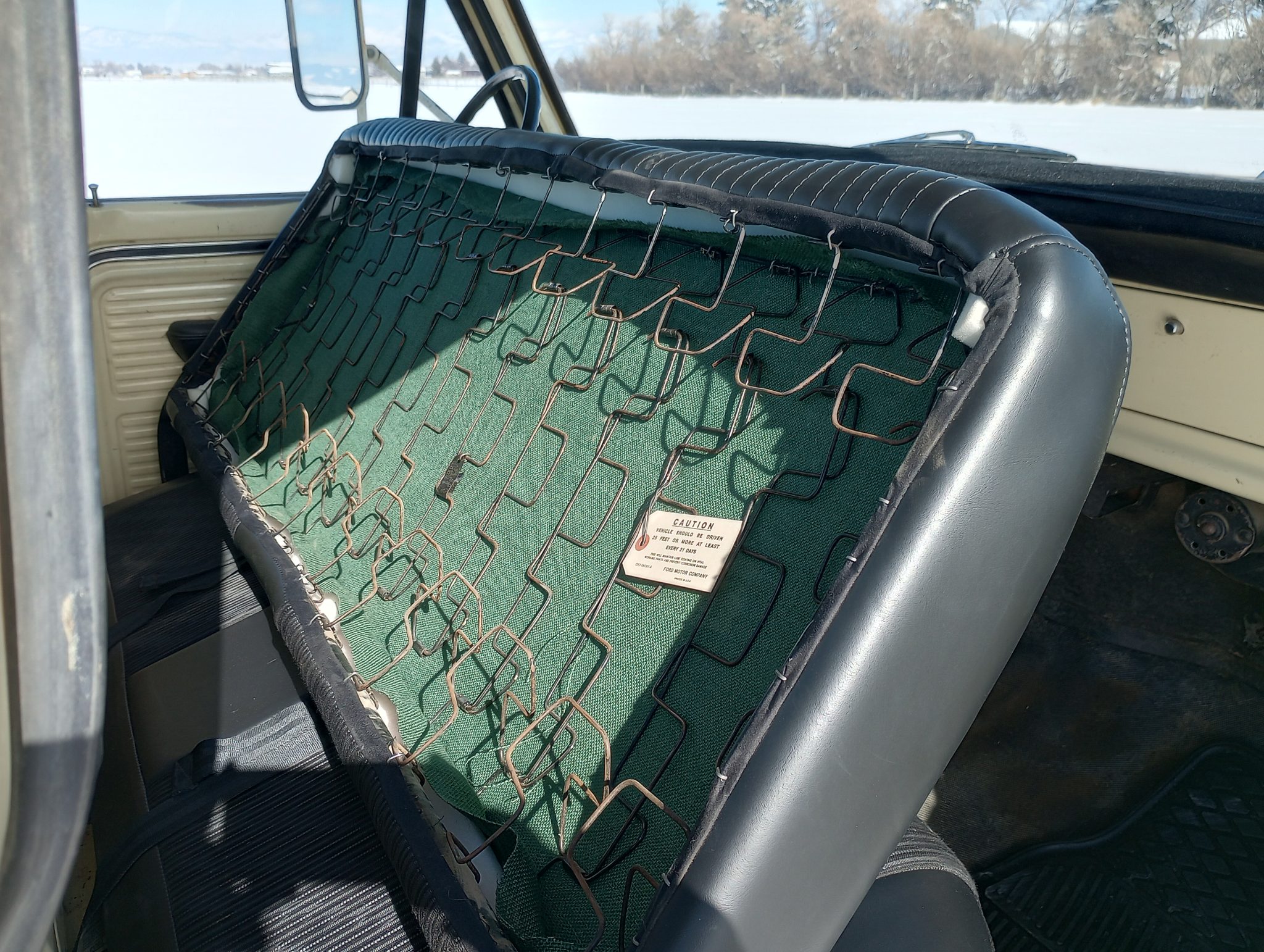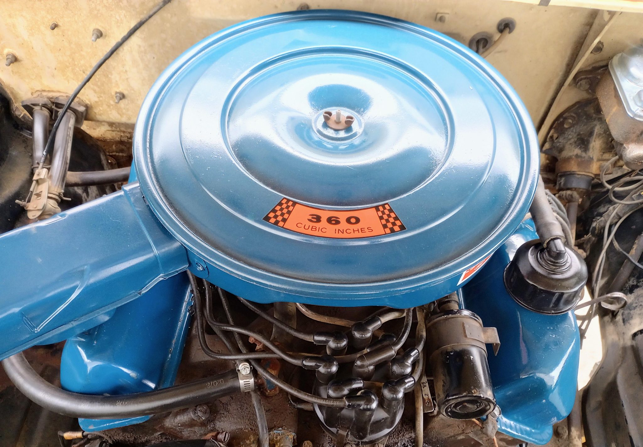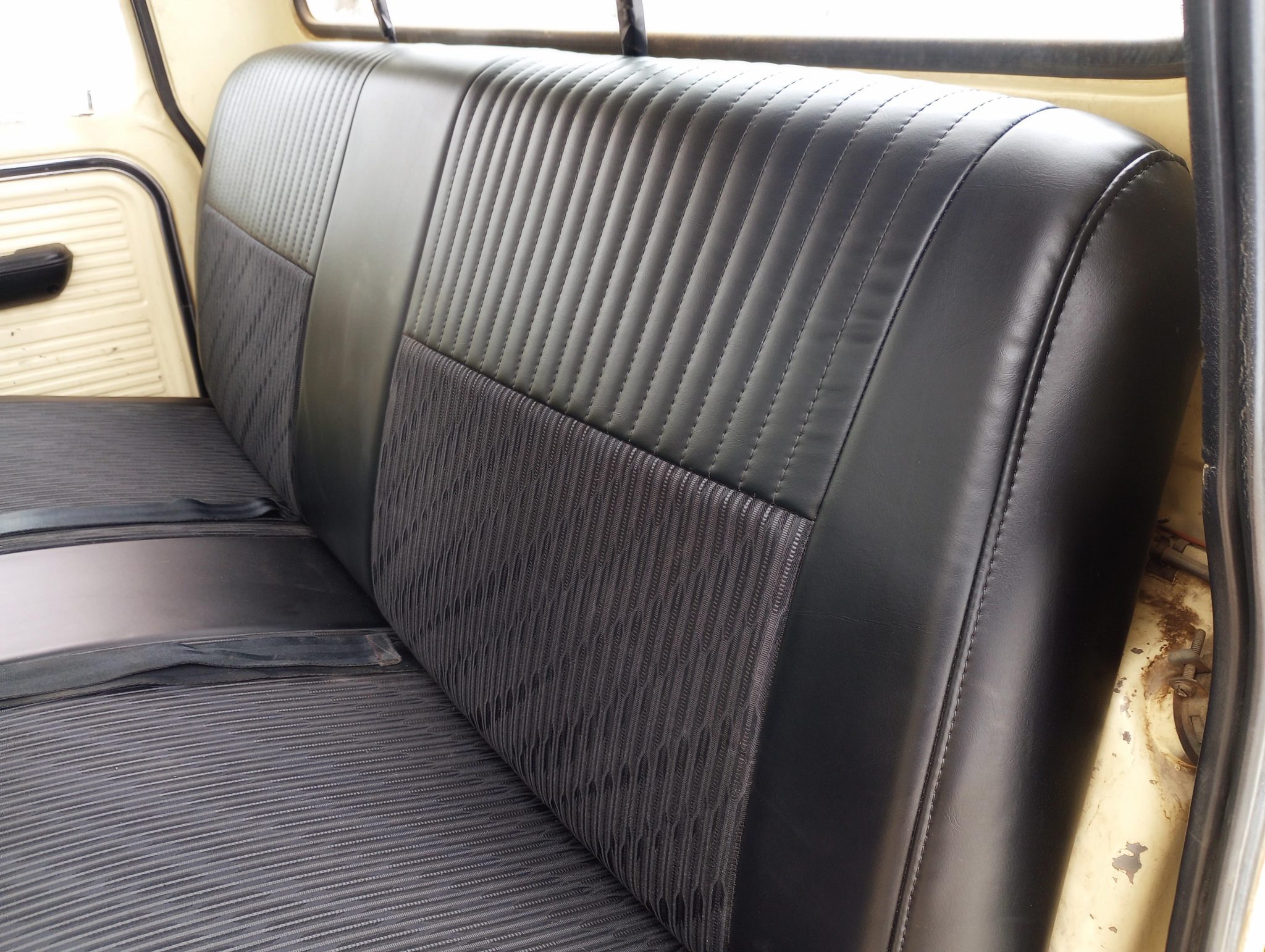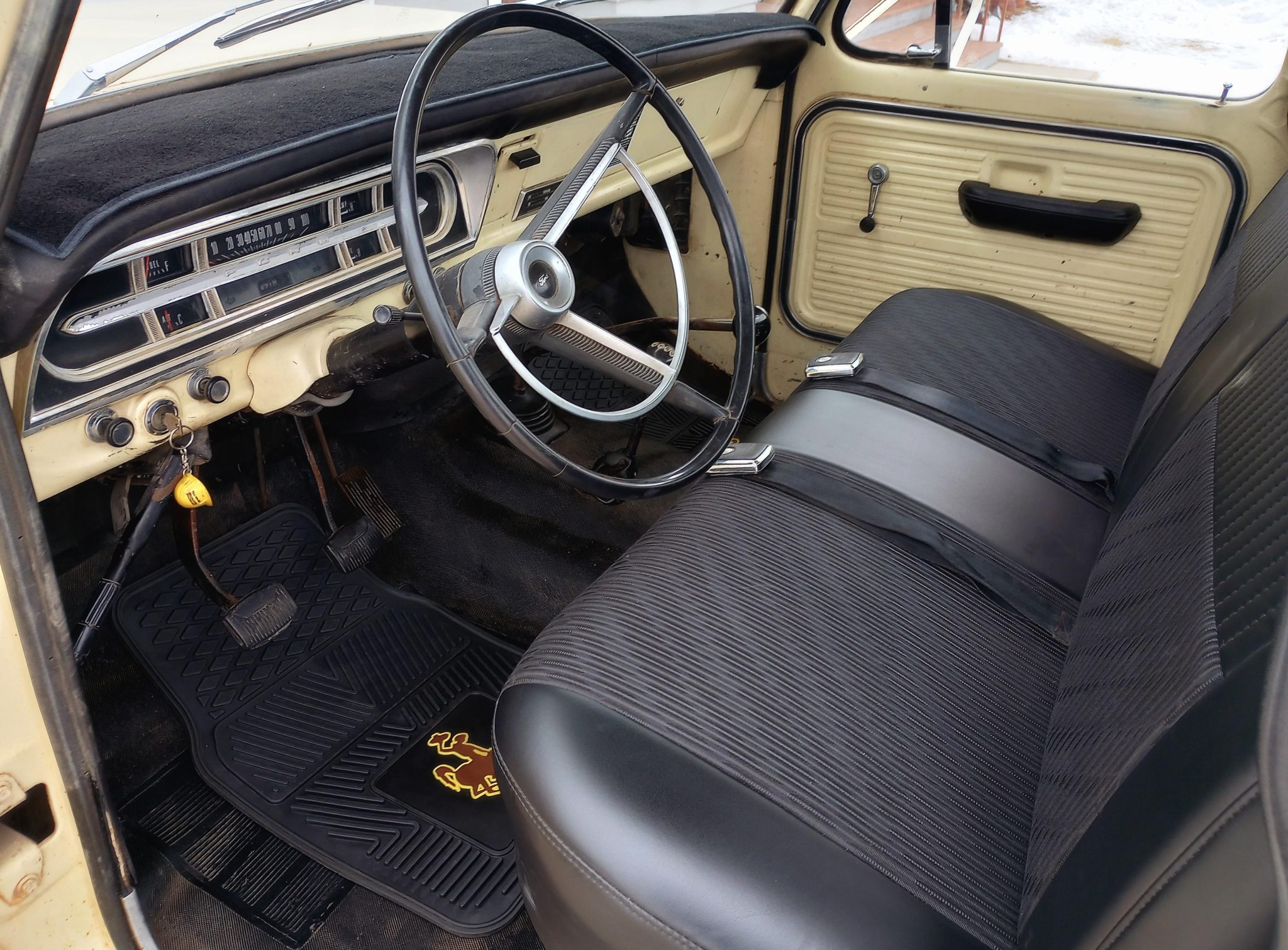 It is finished in Meadowlark Yellow over black vinyl and cloth and is powered by a 360ci V8 linked to a four-speed manual transmission and a dual-range transfer case. The truck features Western mirrors, white 16″ steel wheels, and Warn manually locking front hubs.