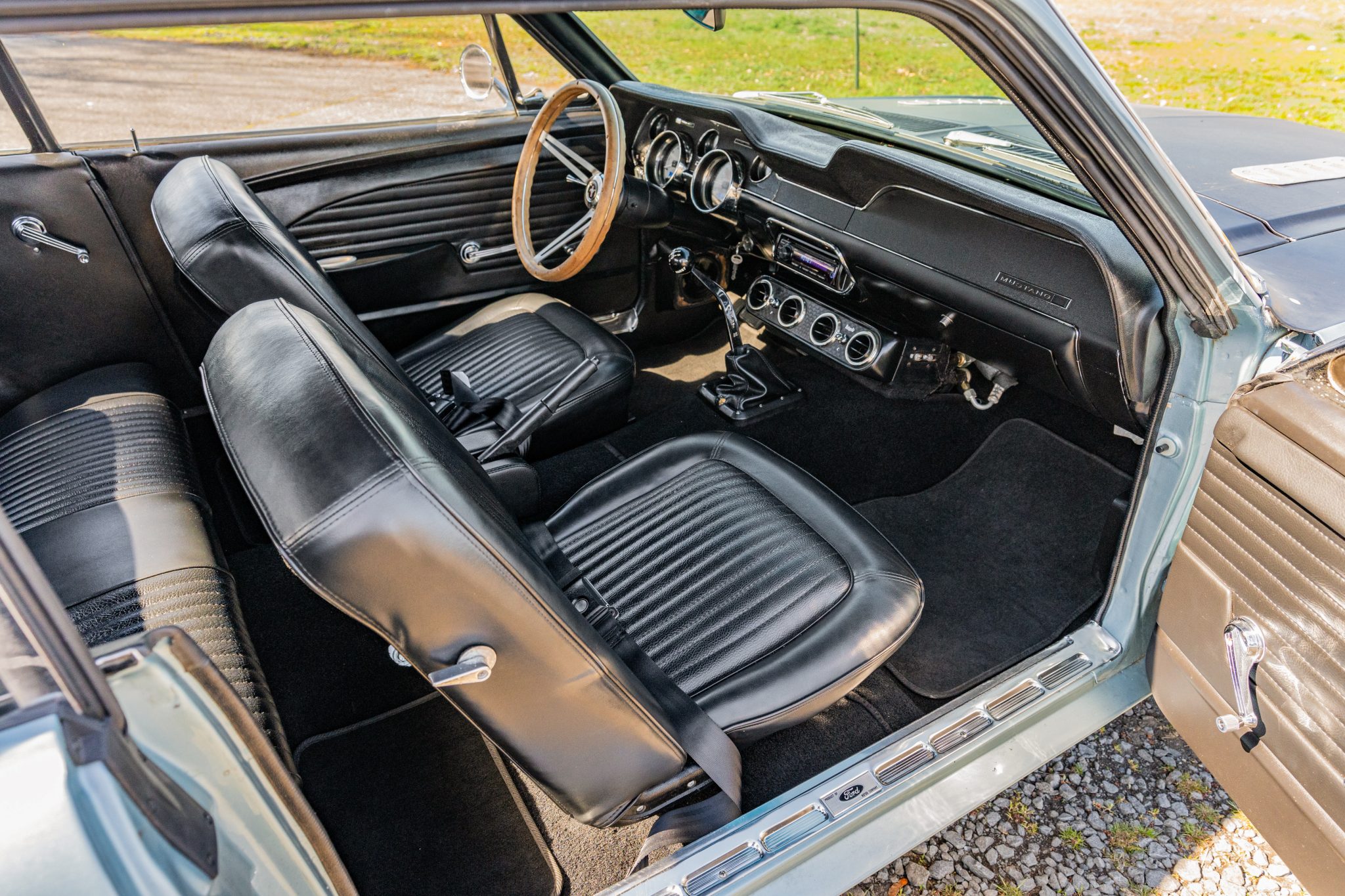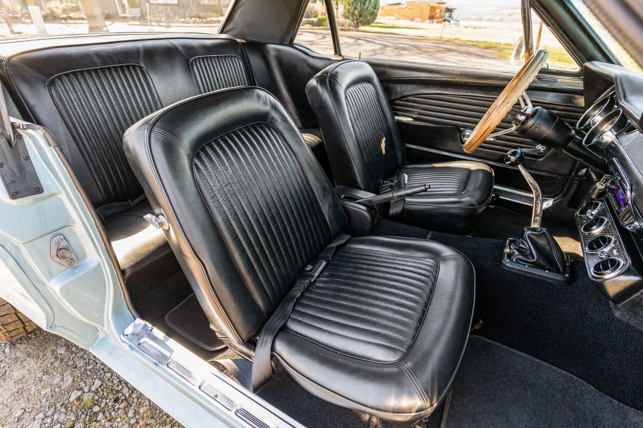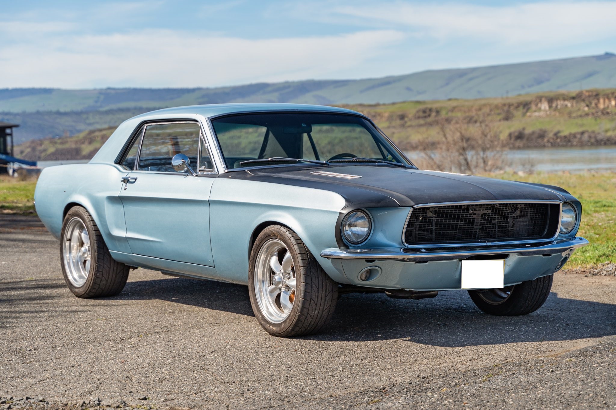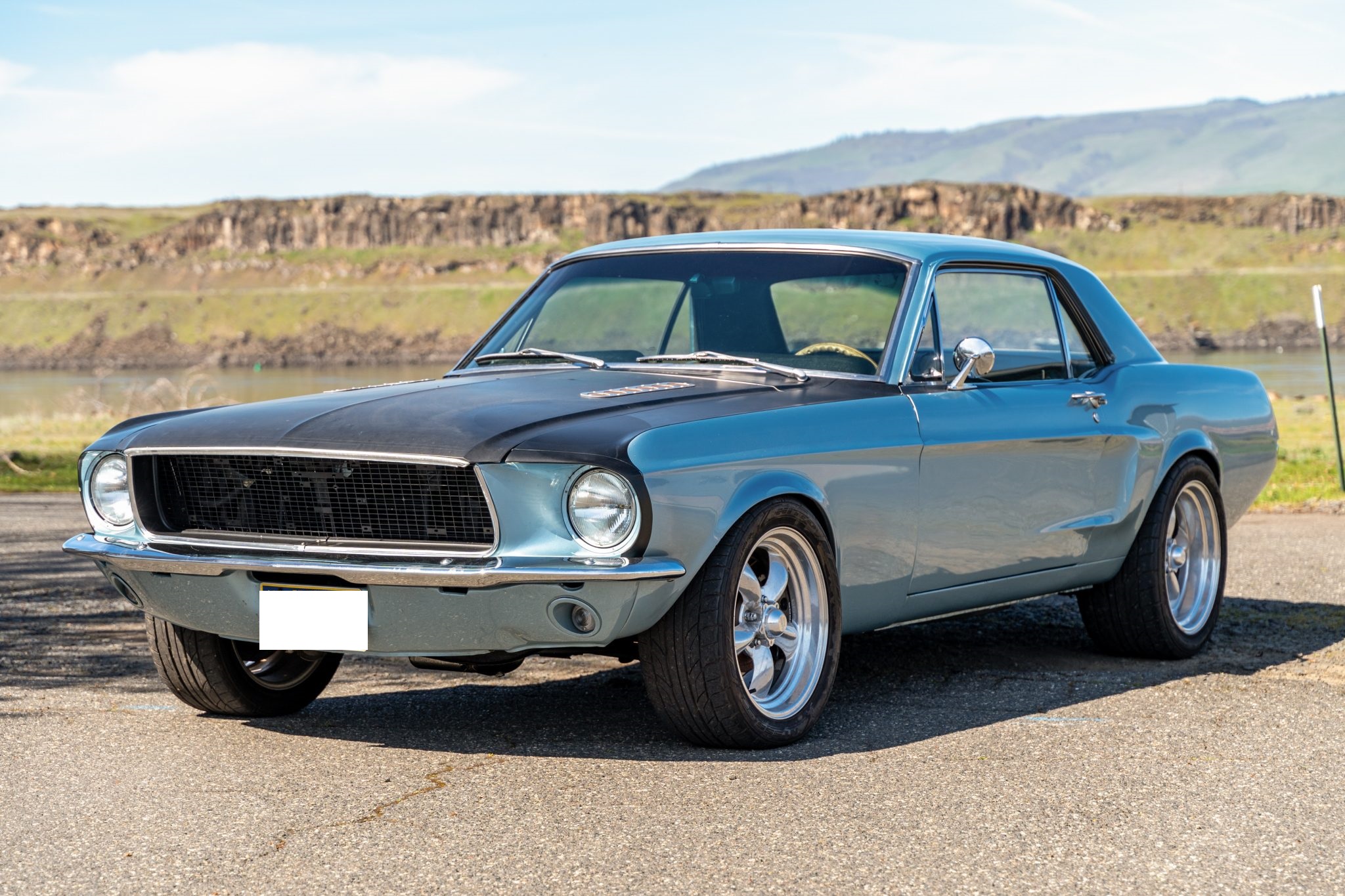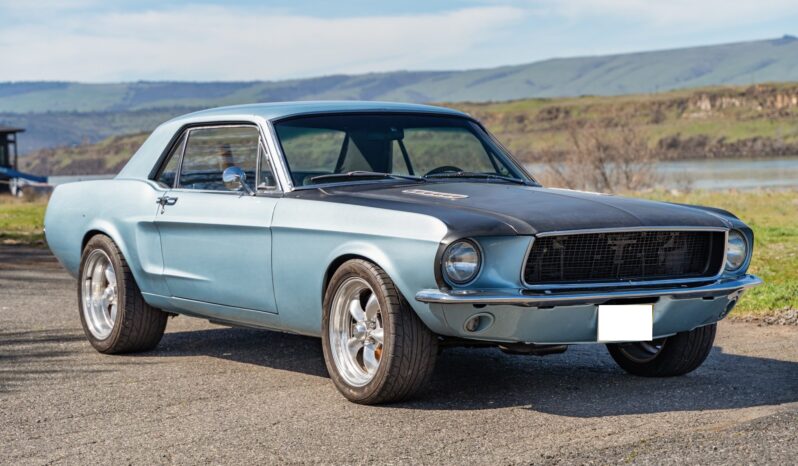 This 1968 Ford Mustang coupe underwent refurbishment and is powered by a 289ci V8 backed by a five-speed manual transmission. The car has been refinished in blue and has a black vented hood, staggered American Racing wheels, four-wheel disc brakes, power steering, MSD ignition, an Edelbrock intake manifold, and a dual exhaust system with long-tube headers. Inside, the cabin is outfitted with black vinyl upholstery, aftermarket instrumentation, a Hurst shifter, air conditioning, and a Kenwood CD player.