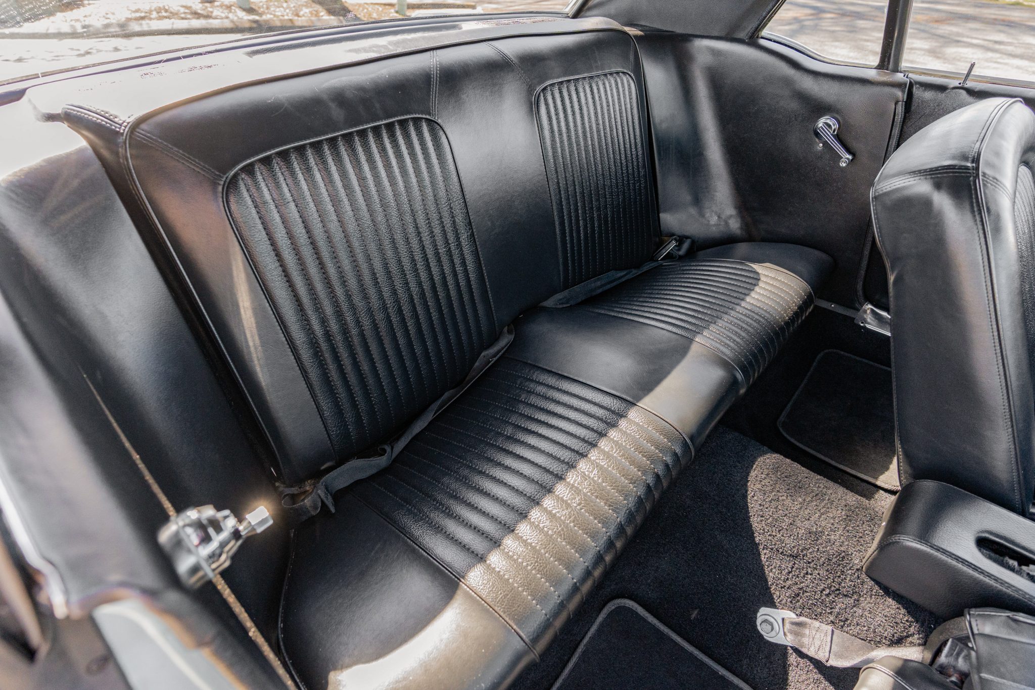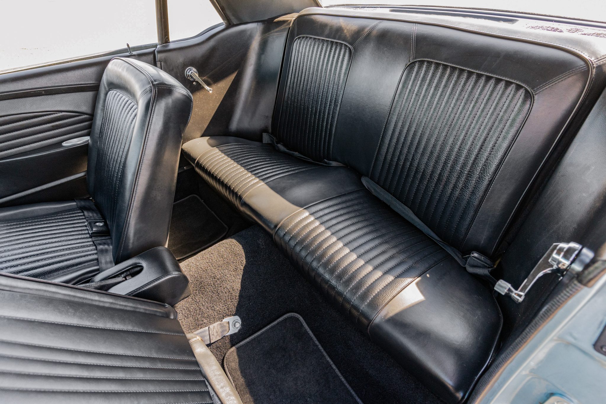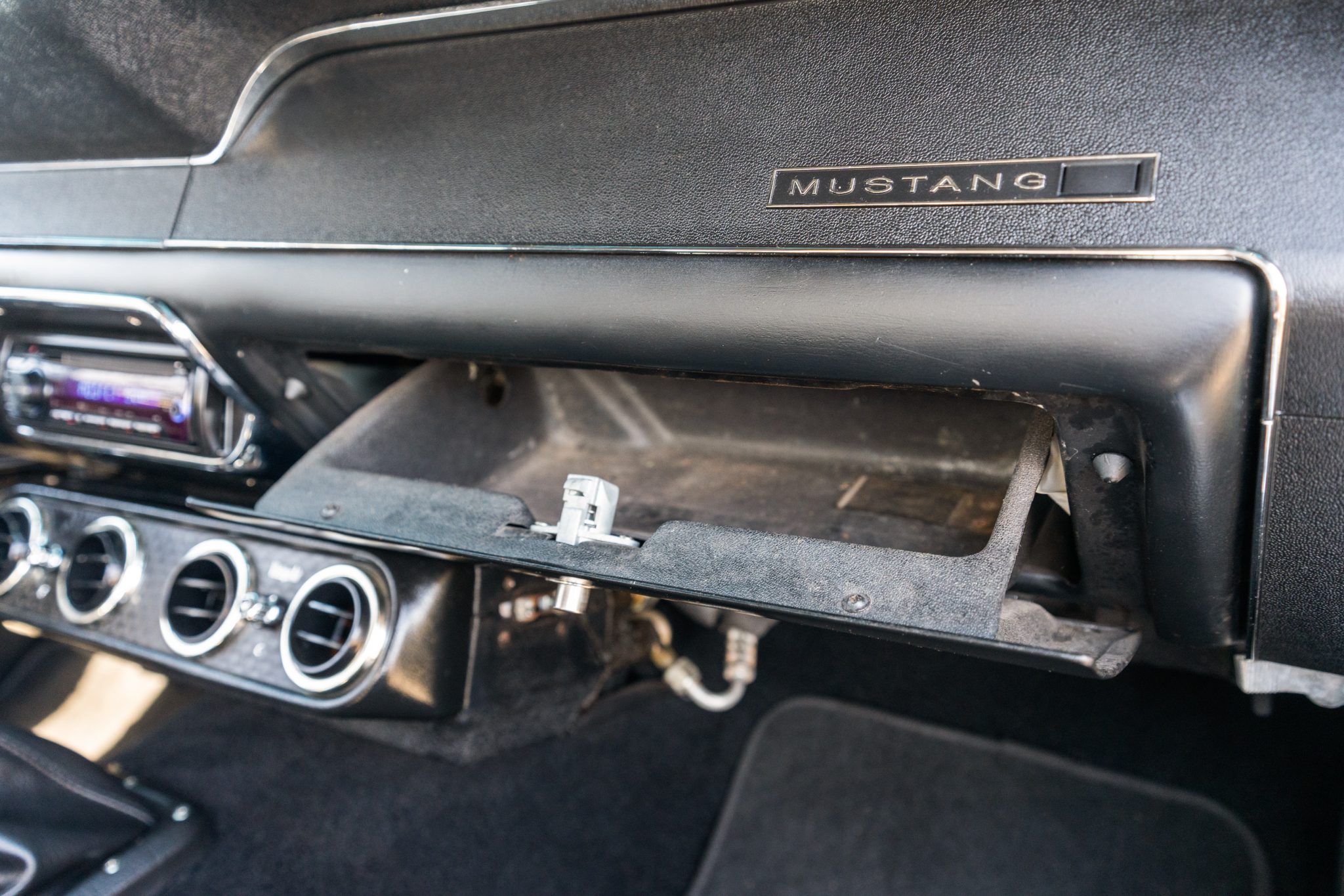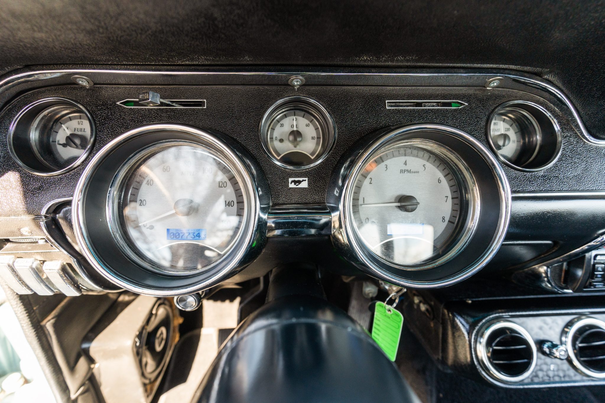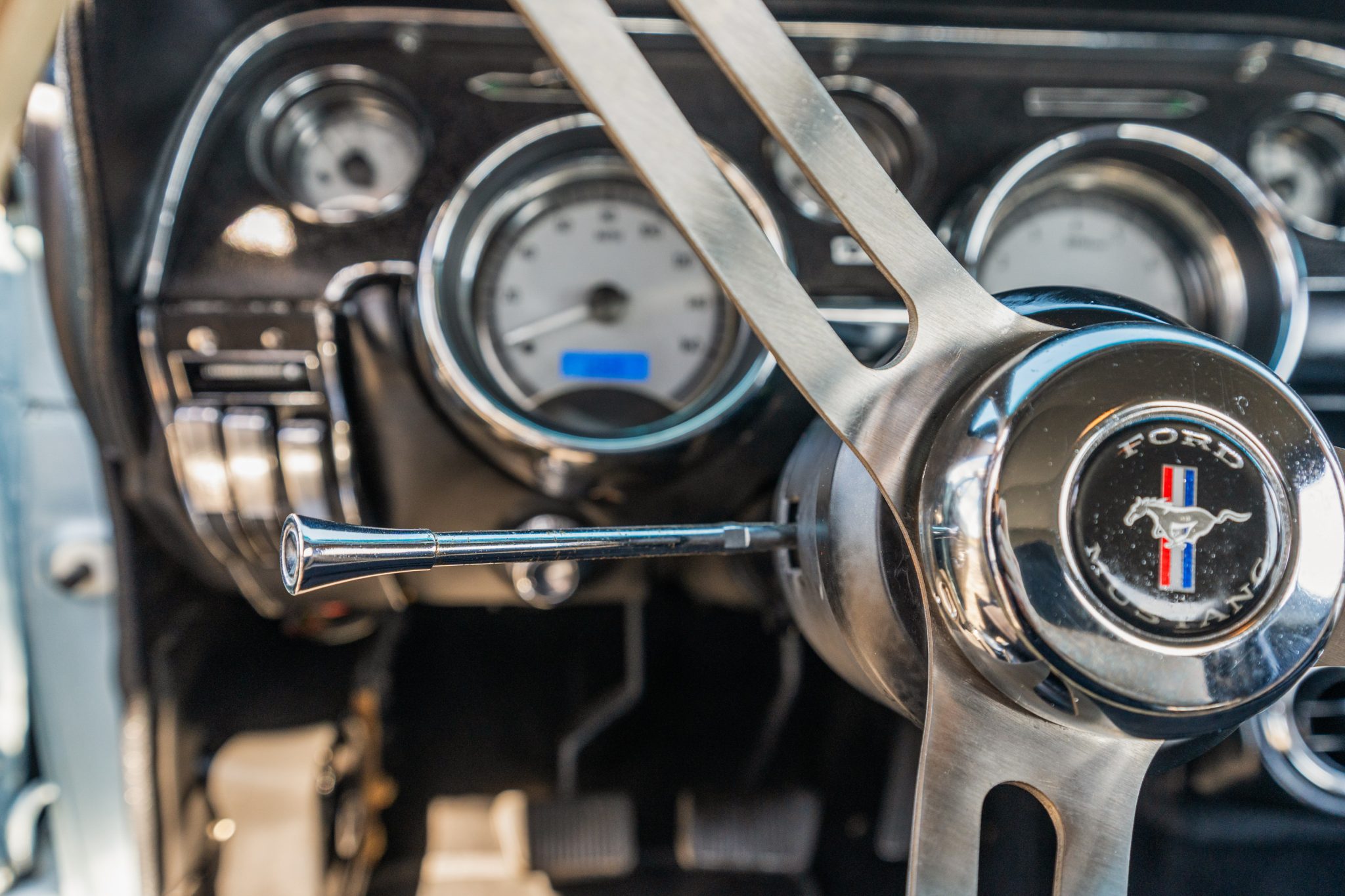 This 1968 Ford Mustang coupe underwent refurbishment and is powered by a 289ci V8 backed by a five-speed manual transmission. The car has been refinished in blue and has a black vented hood, staggered American Racing wheels, four-wheel disc brakes, power steering, MSD ignition, an Edelbrock intake manifold, and a dual exhaust system with long-tube headers. Inside, the cabin is outfitted with black vinyl upholstery, aftermarket instrumentation, a Hurst shifter, air conditioning, and a Kenwood CD player.