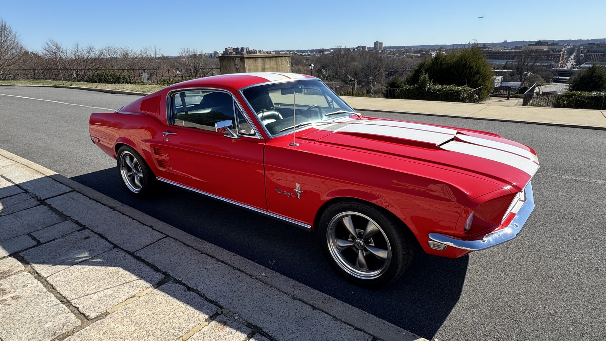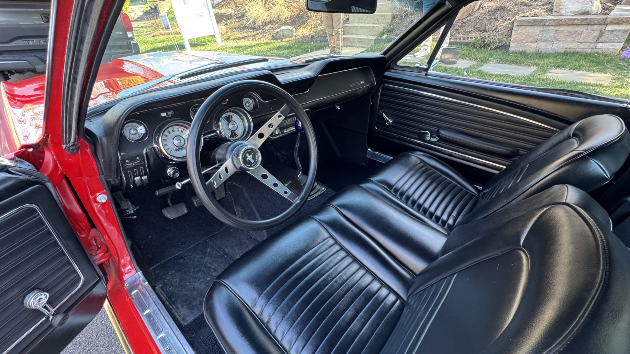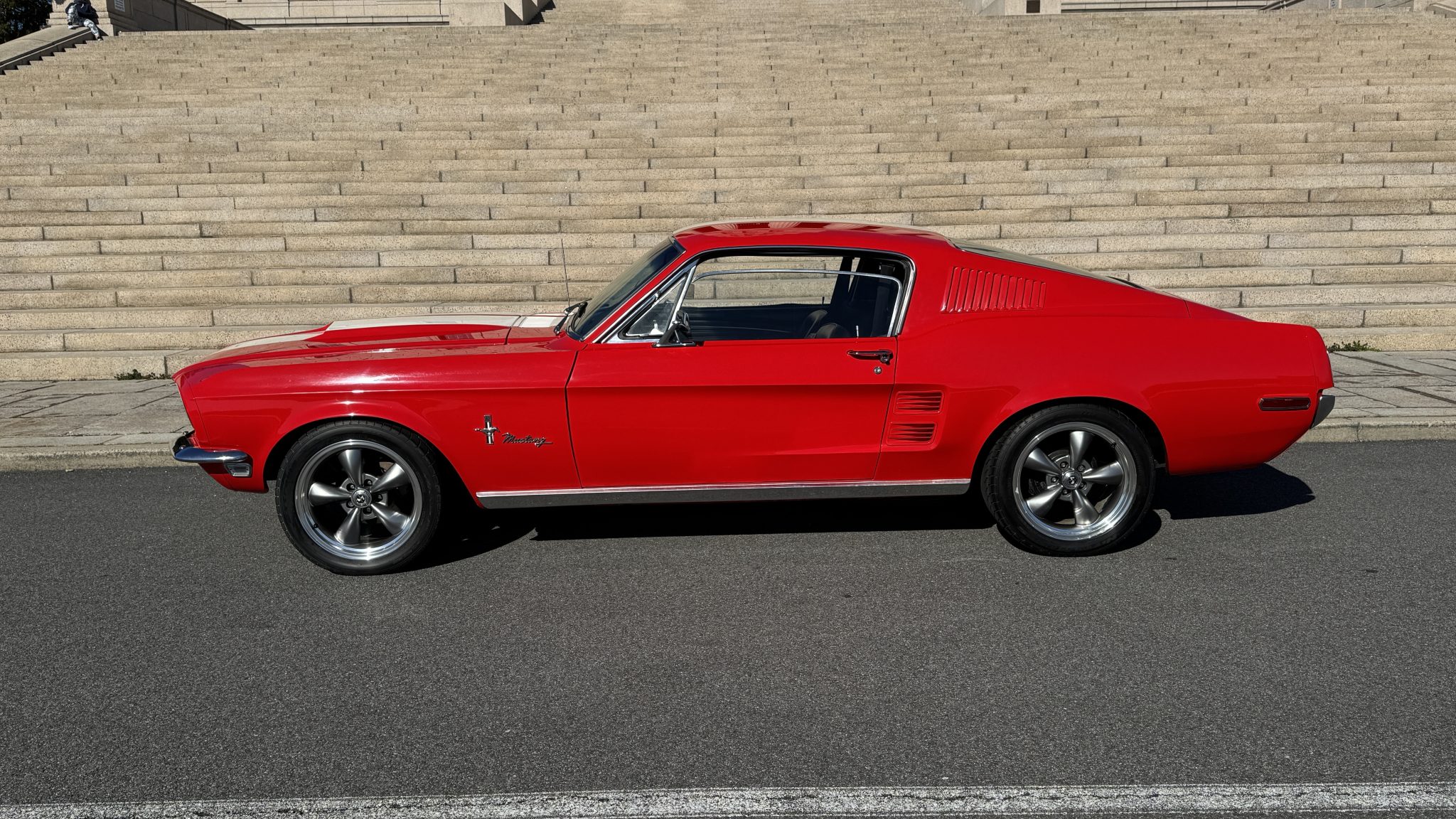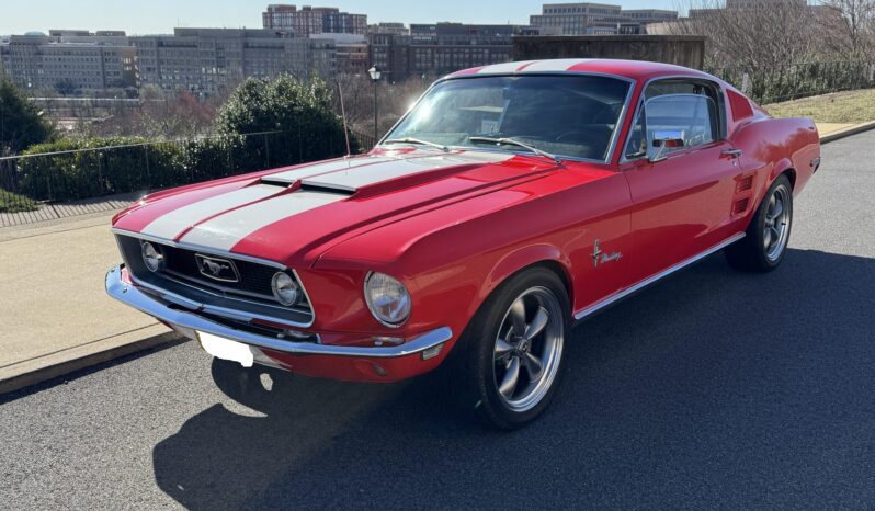 This 1968 Ford Mustang fastback was originally specified with Presidential Blue paintwork, a blue interior, and a 200ci inline-six mated to a three-speed manual.  The car was repainted red with white stripes, the interior was redone with black upholstery, and a rebuilt 302ci V8 with a Holley carburetor and five-speed manual transmission were installed. It also has a dual exhaust system, grille lights, 17″ Torq Thrust-style wheels, and a Hurst shifter.