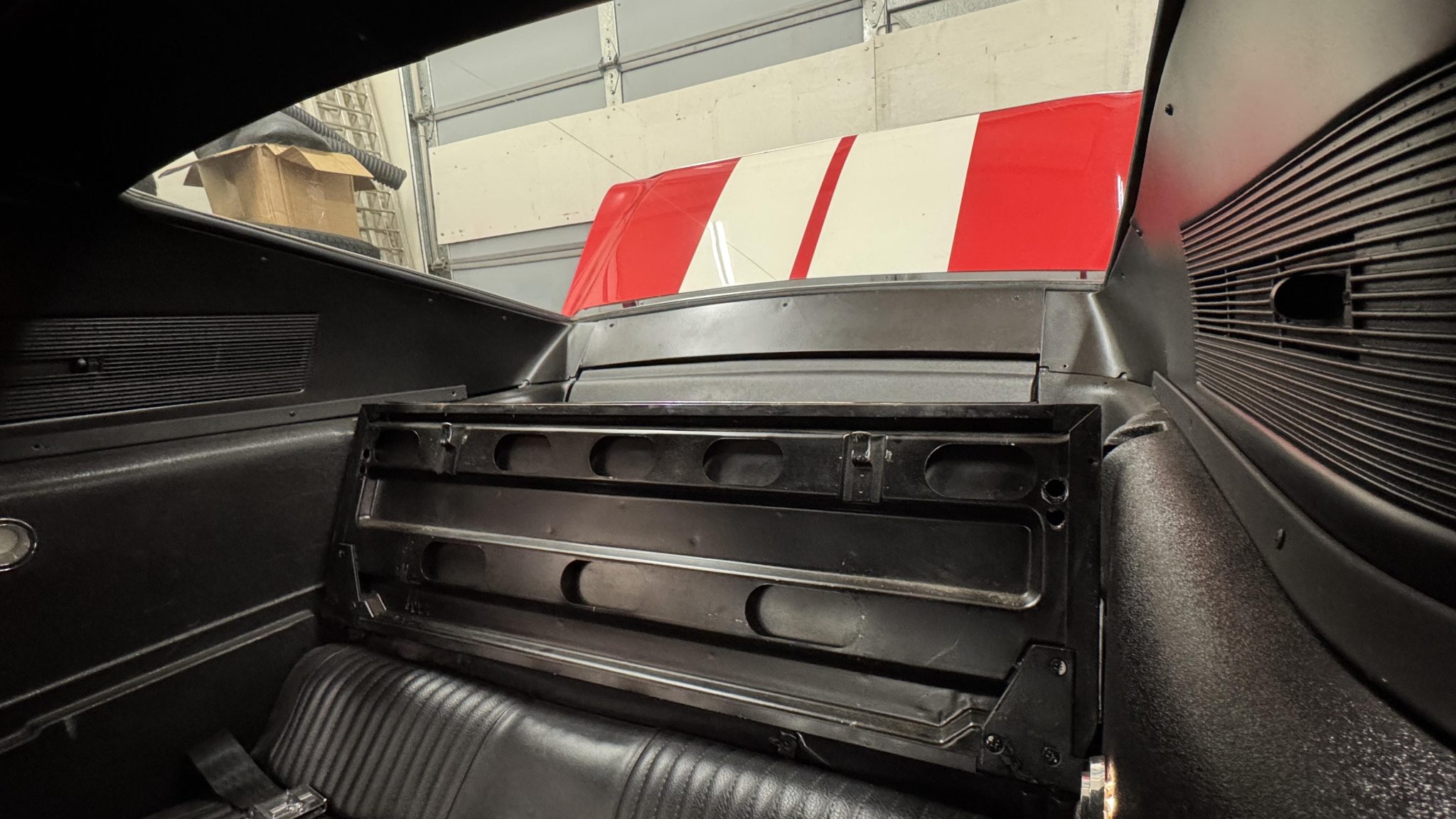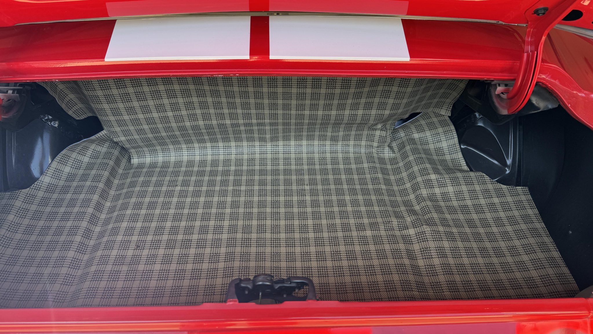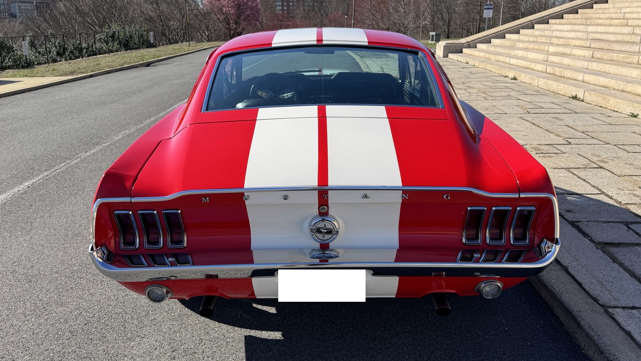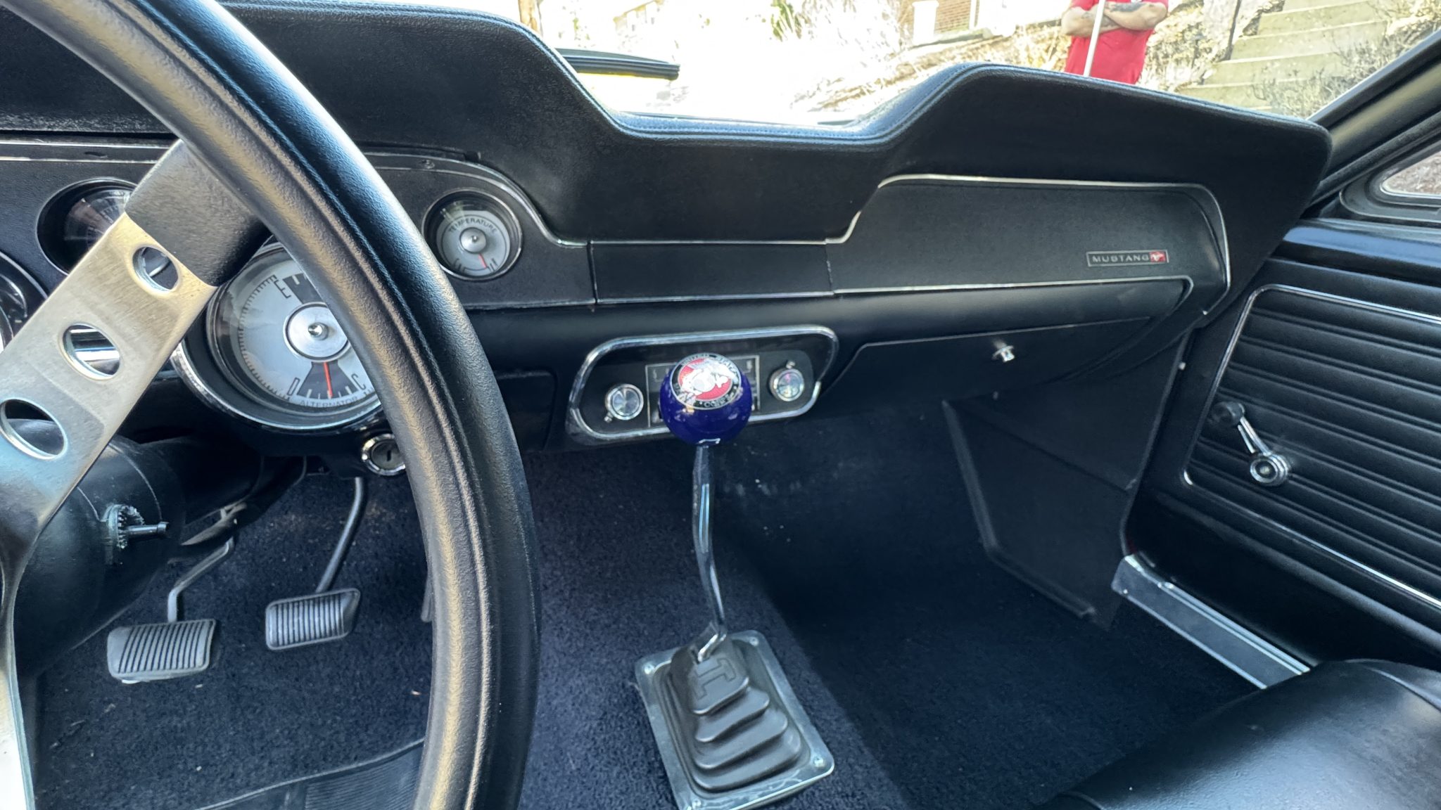 This 1968 Ford Mustang fastback was originally specified with Presidential Blue paintwork, a blue interior, and a 200ci inline-six mated to a three-speed manual.  The car was repainted red with white stripes, the interior was redone with black upholstery, and a rebuilt 302ci V8 with a Holley carburetor and five-speed manual transmission were installed. It also has a dual exhaust system, grille lights, 17″ Torq Thrust-style wheels, and a Hurst shifter.