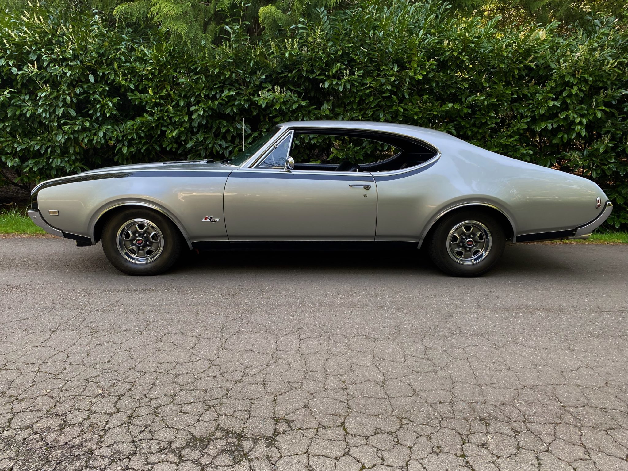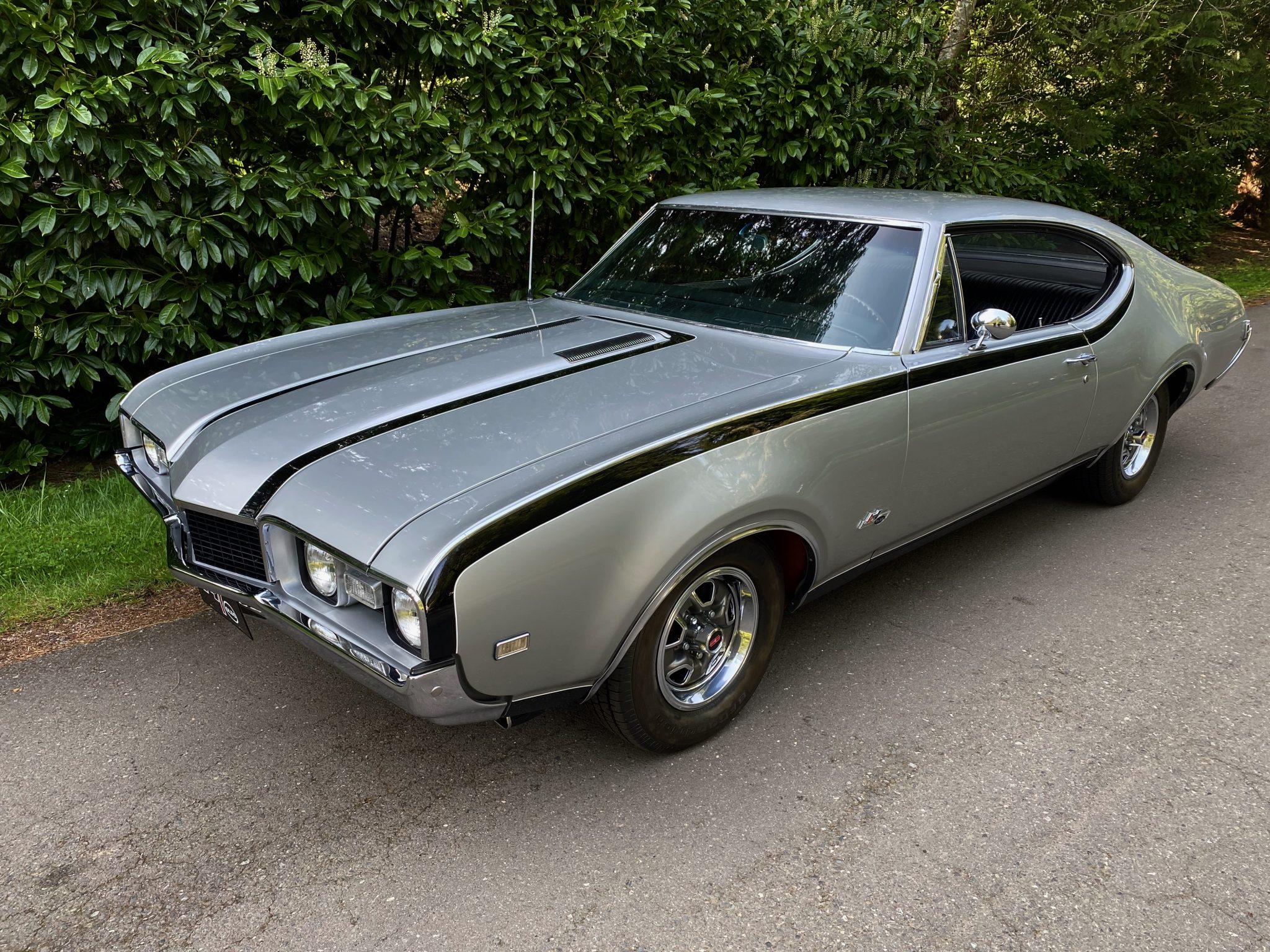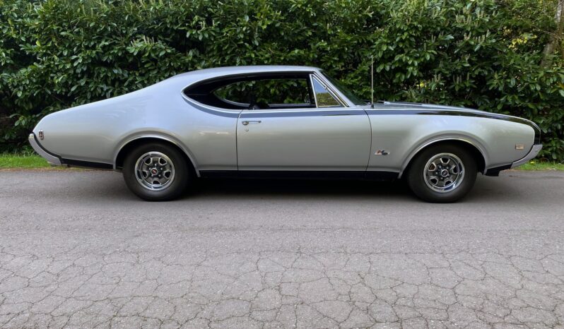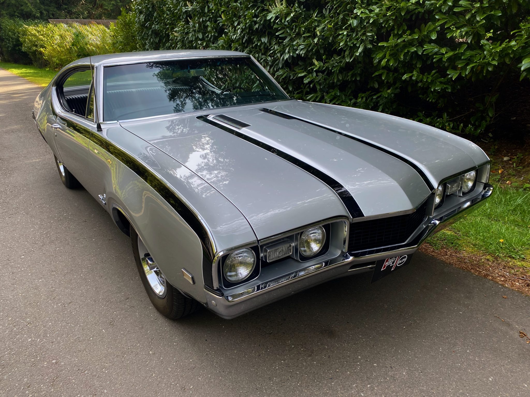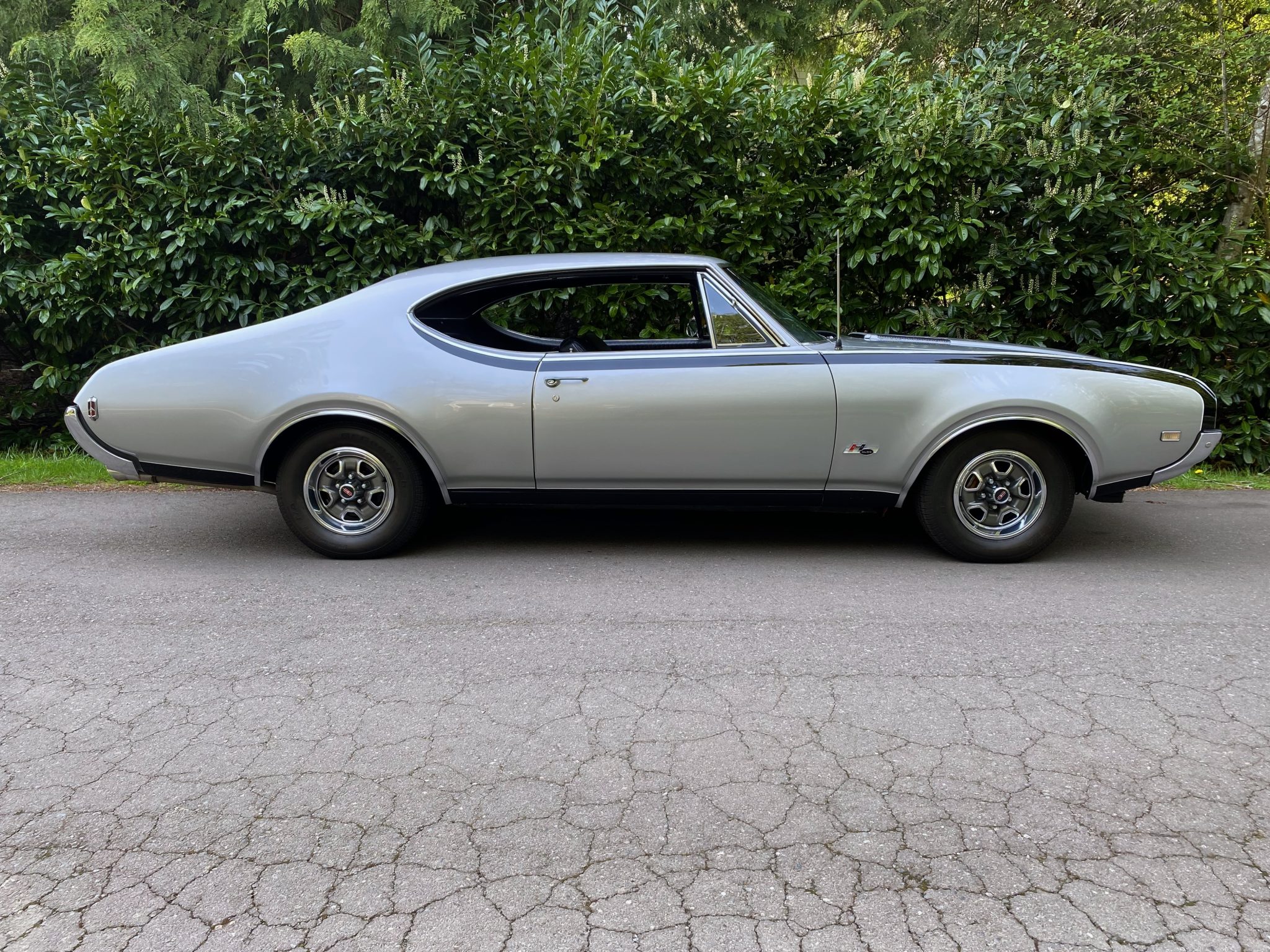 This 1968 Oldsmobile Hurst/Olds Holiday Coupe is one of 515 examples produced for the model year, and it is powered by a 455ci V8 linked with a TH400 three-speed automatic transmission and a limited-slip differential. The engine is equipped with D-specification heads, PerTronix ignition, and a rebuilt Rochester four-barrel carburetor, and the car rides on 14″ Super Stock II wheels that are mounted over power-assisted front disc and rear drum brakes. The exterior is finished in Peruvian Silver and black, while the cabin is outfitted with a Hurst dual-gate shifter, a Deluxe steering wheel, walnut wood trim, an AM/FM radio, and black vinyl upholstery on the front bucket and rear bench seats.